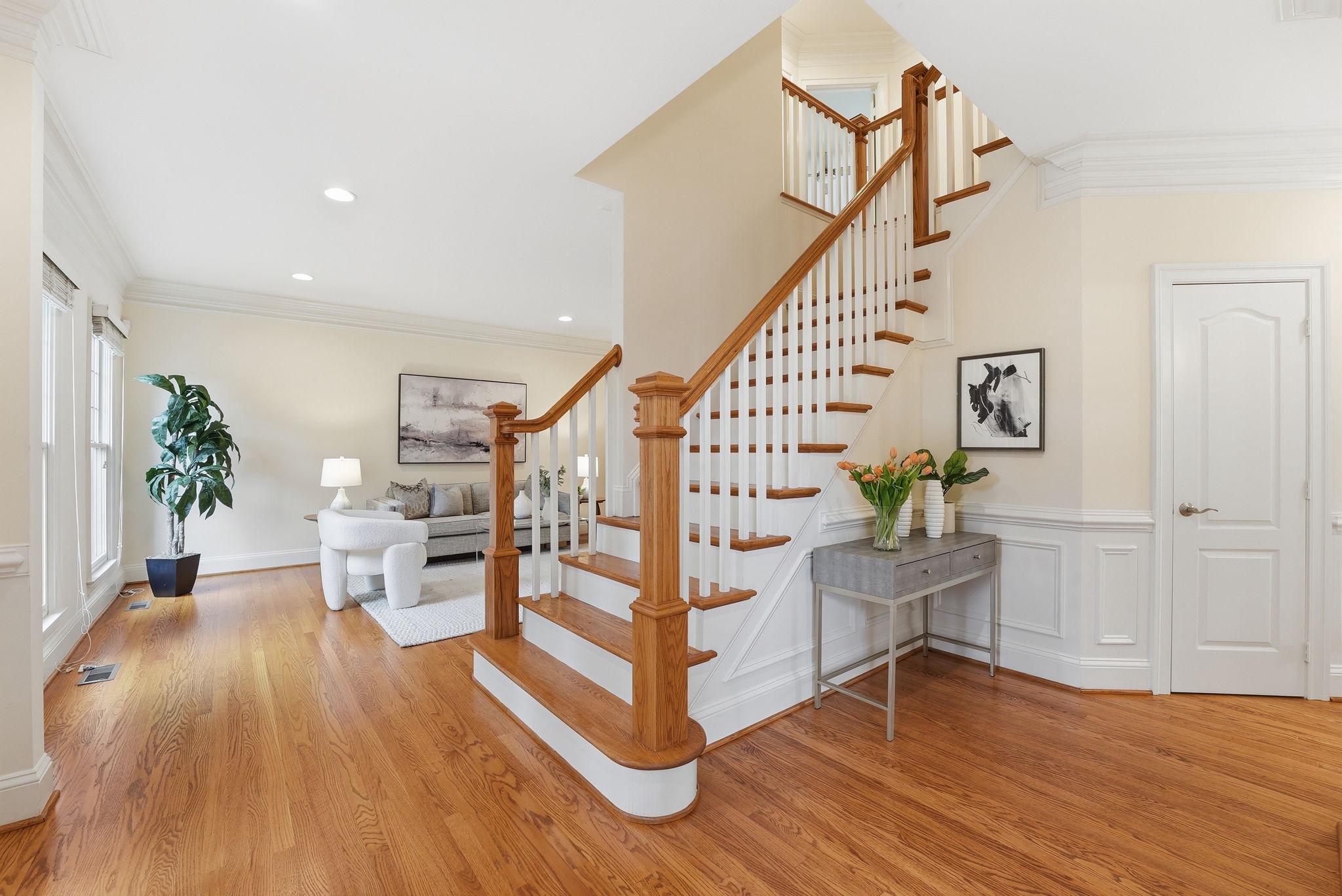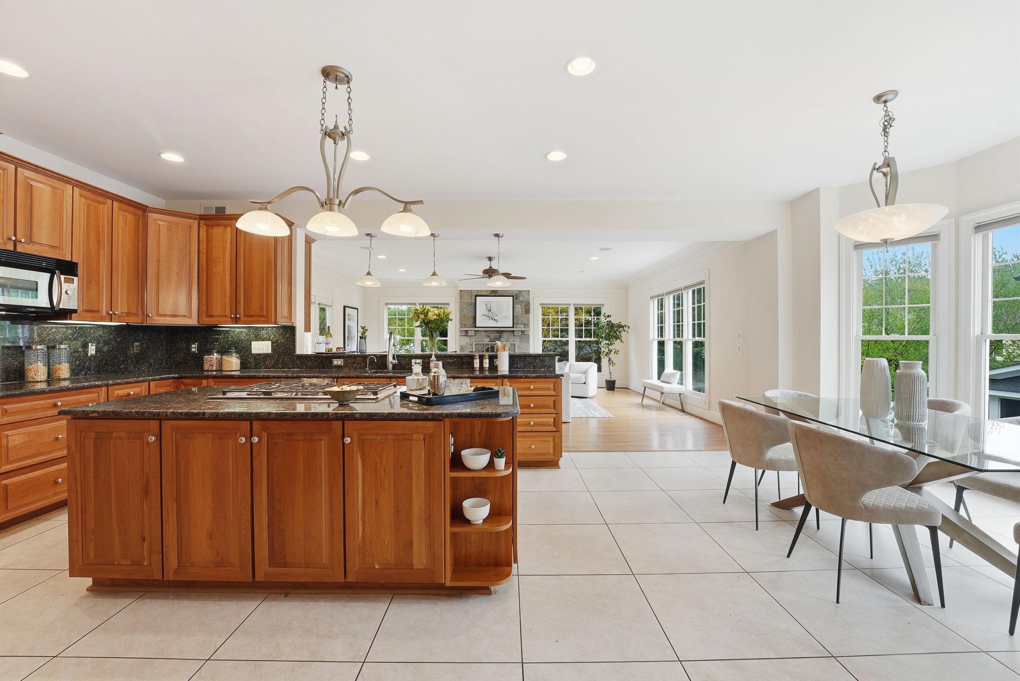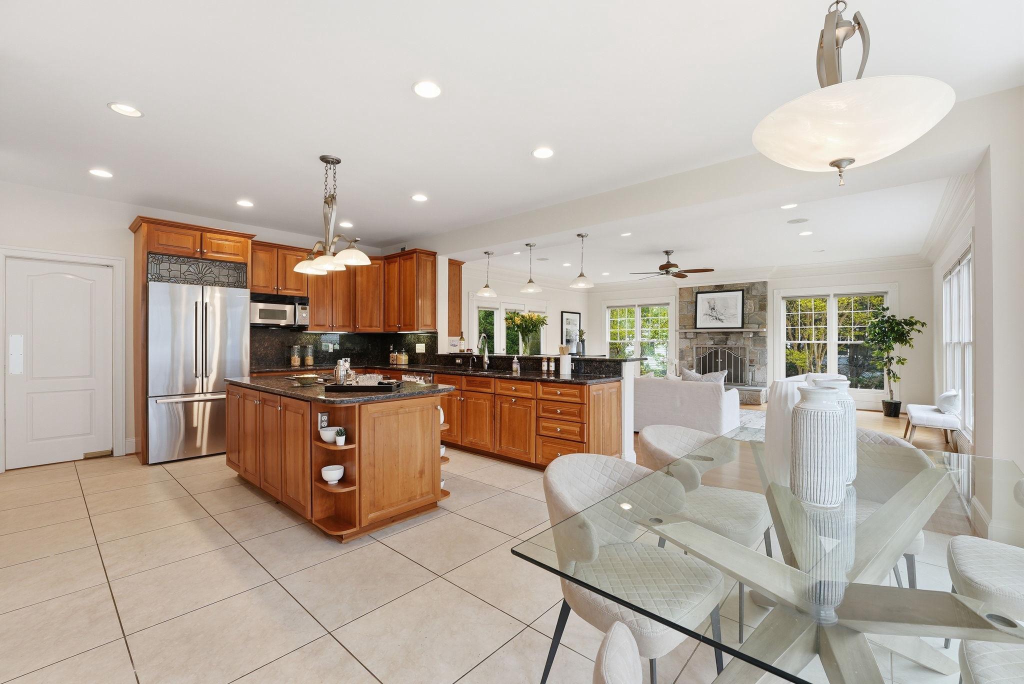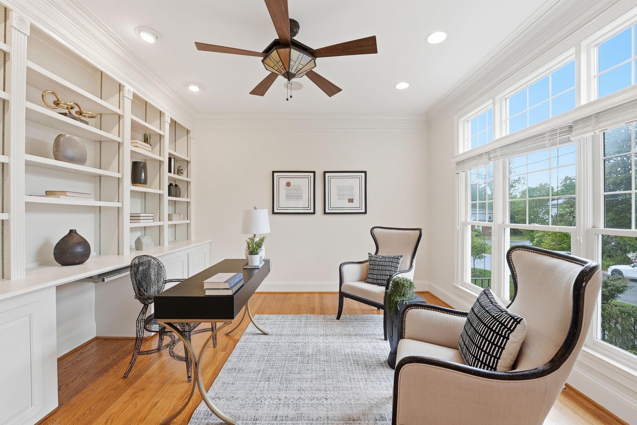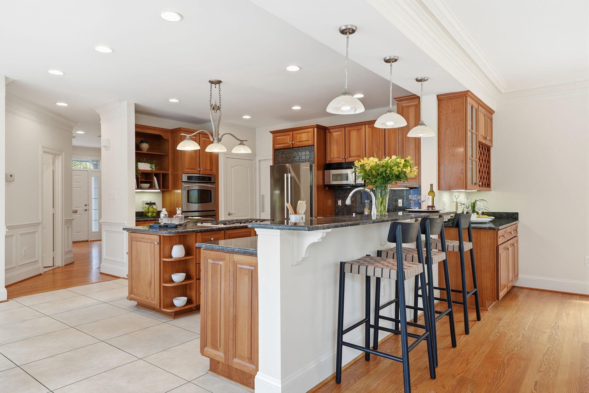 Welcome to this exquisite Craftsman-style residence, built in 2003, offering a harmonious blend of luxury and comfort, perfect for an elevated lifestyle. Spanning a total of more than 5100 square feet (per public record), this home features five spacious bedrooms and five and a half well appointed bathrooms, ensuring ample space for relaxation and privacy. Step inside to discover a warm and inviting interior adorned with rich hardwood floors, plush wall to wall carpet, 9' ceilings, elegant moldings, and practical and sophisticated custom built-ins. Off the gracious entry foyer, pass through elegant French doors to the dedicated executive home office perfectly outfitted with a wall of built-in bookshelves and flooded with light. The gourmet kitchen is a chef's delight, complete with a large island, breakfast bar, table space, stainless steel appliances, and a double oven. It seamlessly flows into the family room, ideal for entertaining with built-in bar, wrap around windows, one of three gas fireplaces and a distributed audio system. The expansive, elegant primary suite is a true retreat, boasting a tray ceiling with up lighting and a gas fireplace with built-in cabinet surround. En suite, enjoy a luxurious bath replete with dual vanities, soaking tub and separate shower. Two walk in closets complete this gorgeous bedroom. There are three additional generously sized bedrooms including a guest room with en suite bath and another hall bath on this floor. The convenience of a bedroom level laundry room cannot be overlooked. The bright fourth level is perfect for a nanny, teen, additional guests or a second home office. It includes a double wide closet and full bath. Thoughtful details like recessed lighting, ceiling fans, and wainscoting enhance the home's elegance. The day-lit lower level is ideal for a recreation area or home gym and features another gas fireplace. The huge storage area is a plus as well as a full bath, a second laundry room and two car garage. Outside, the meticulously landscaped lot features inviting front and rear yards complemented by stone retaining walls. Relax on the private flagstone terrace, perfect for outdoor dining, relaxing and entertaining. With proximity to NIH, two metro stations, bus transportation, the Ride-On bus, the Beltway, downtown Bethesda, abundant shopping and dining options, a neighborhood park, schools, and the YMCA, this location and home combine luxury living with ultimate convenience, making it a perfect sanctuary for those seeking an exclusive lifestyle. Experience the perfect blend of comfort and elegance in this stunning property. *Click video link for 3 D tour and click floor plan link for floor plans!