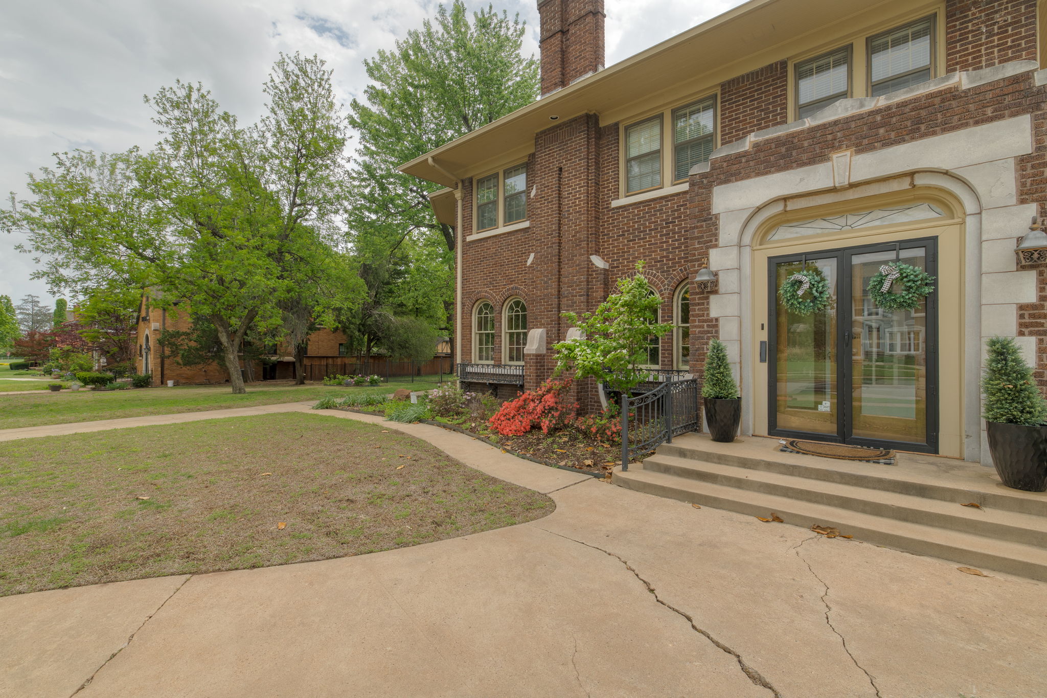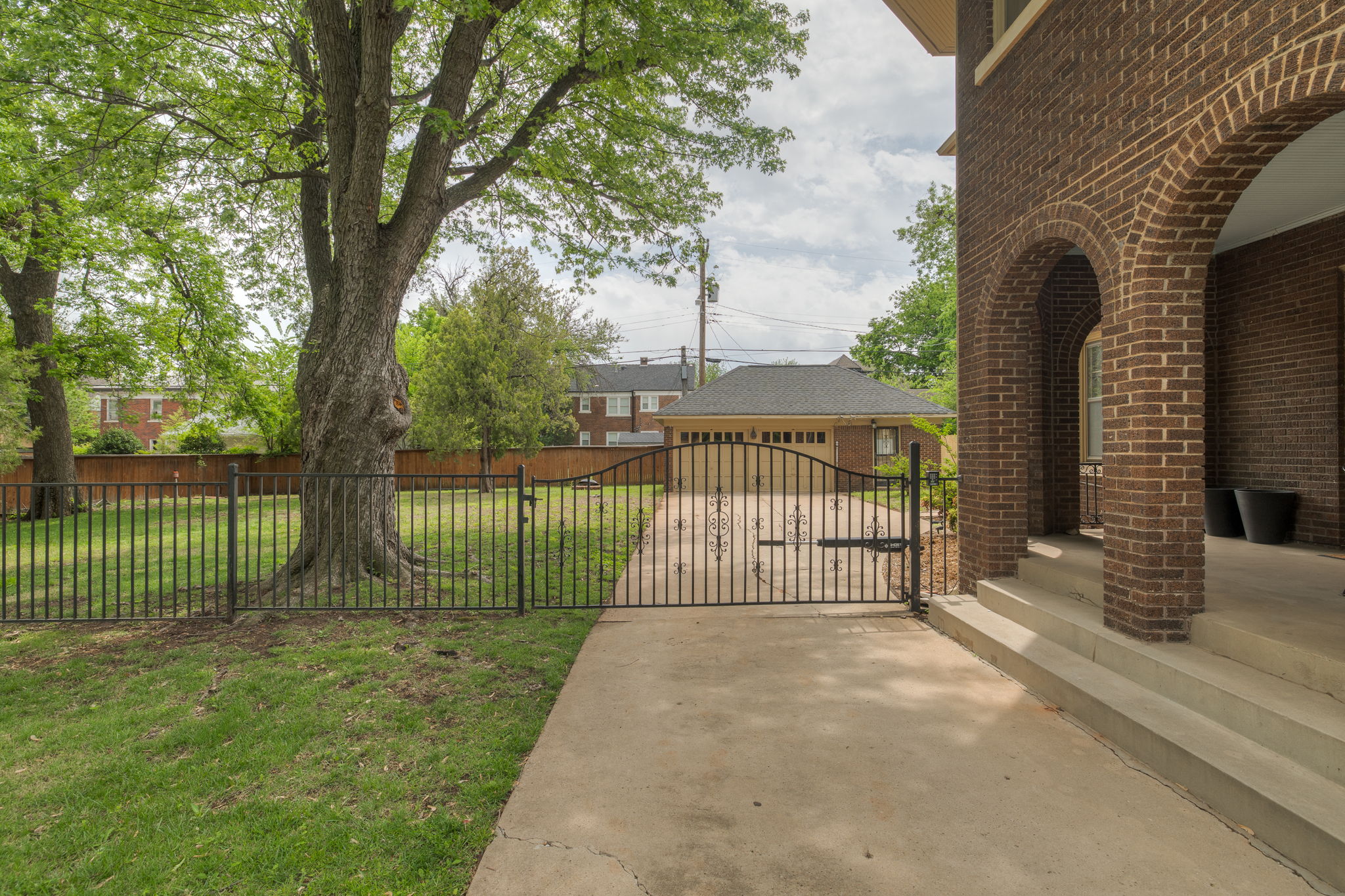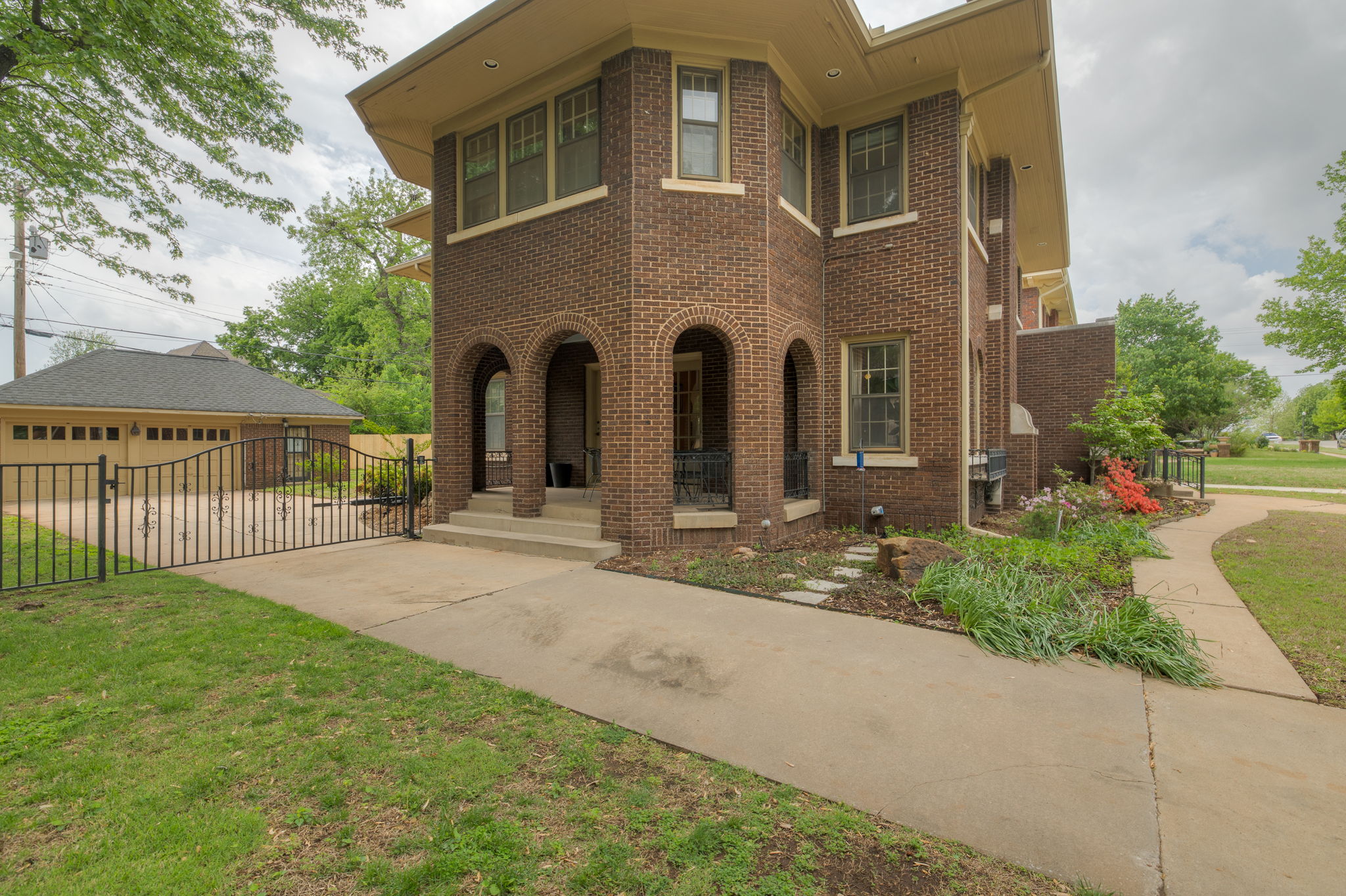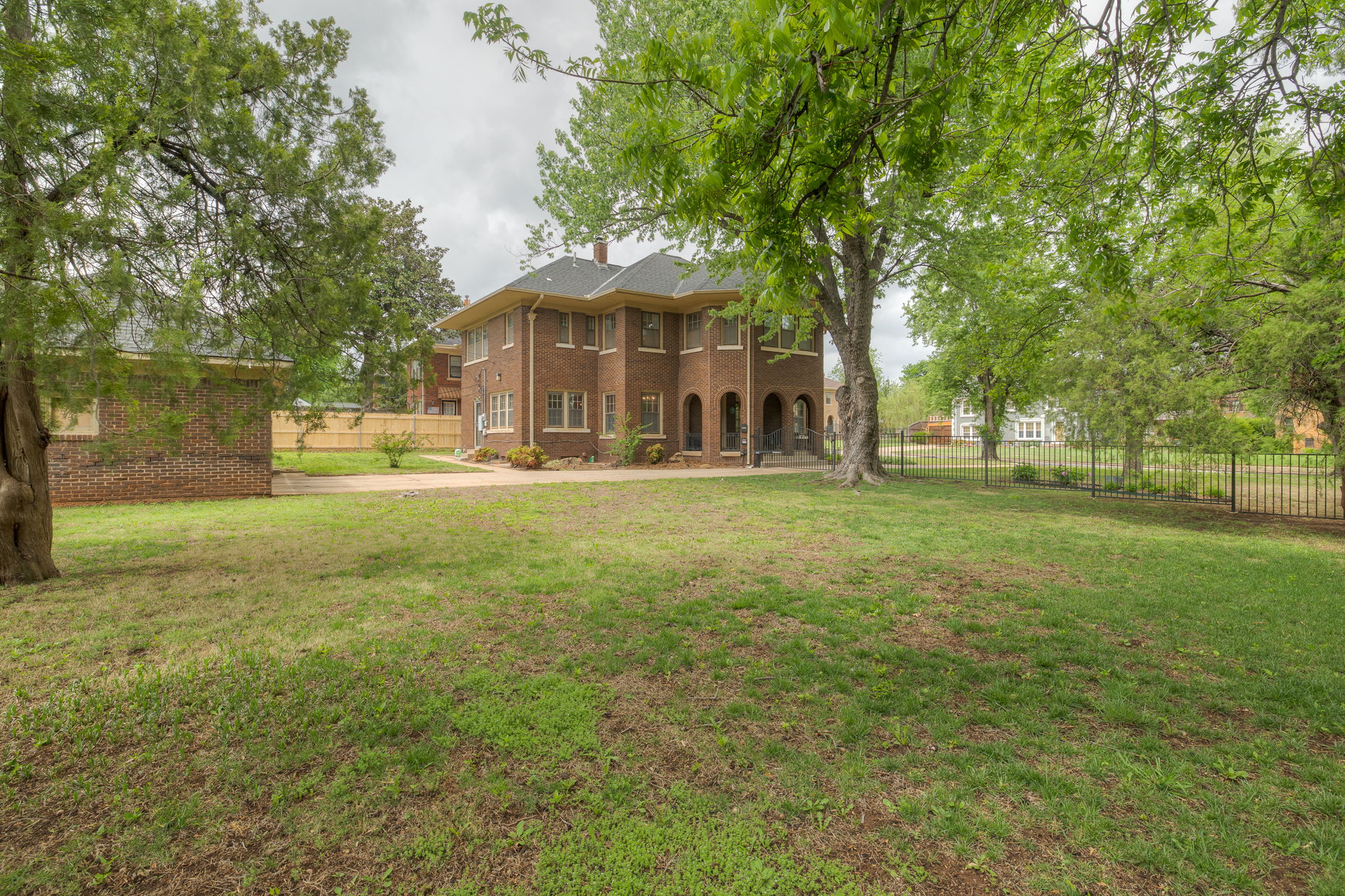 Lincoln Terrace jewel with incredible curb appeal and a true double lot! The home's striking grandeur is accentuated by magnificently detailed stone work and elegant archways. The sizable covered porch offers park-like views of the tree shaded yard located on one of the neighborhoods most idyllic streets! Sprawling, sunlit rooms evoke visions of the past, maintaining original stained woodwork, intricate entryway tile, art deco light fixtures, built in cabinetry, and a saddleback staircase. Upstairs you'll find three generously sized bedrooms, each with ample closet space and an abundance of natural light. The primary suite is a retreat in itself, combining three spacious rooms and a beautifully renovated bathroom. The impressive backyard is fully fenced and offers endless possibilities for outdoor living! A small, nicely finished garage quarters supplies an added bonus space ideal for a home office or guest room. Don't miss this incredible opportunity in one of Oklahoma City's most desirable historic neighborhoods!