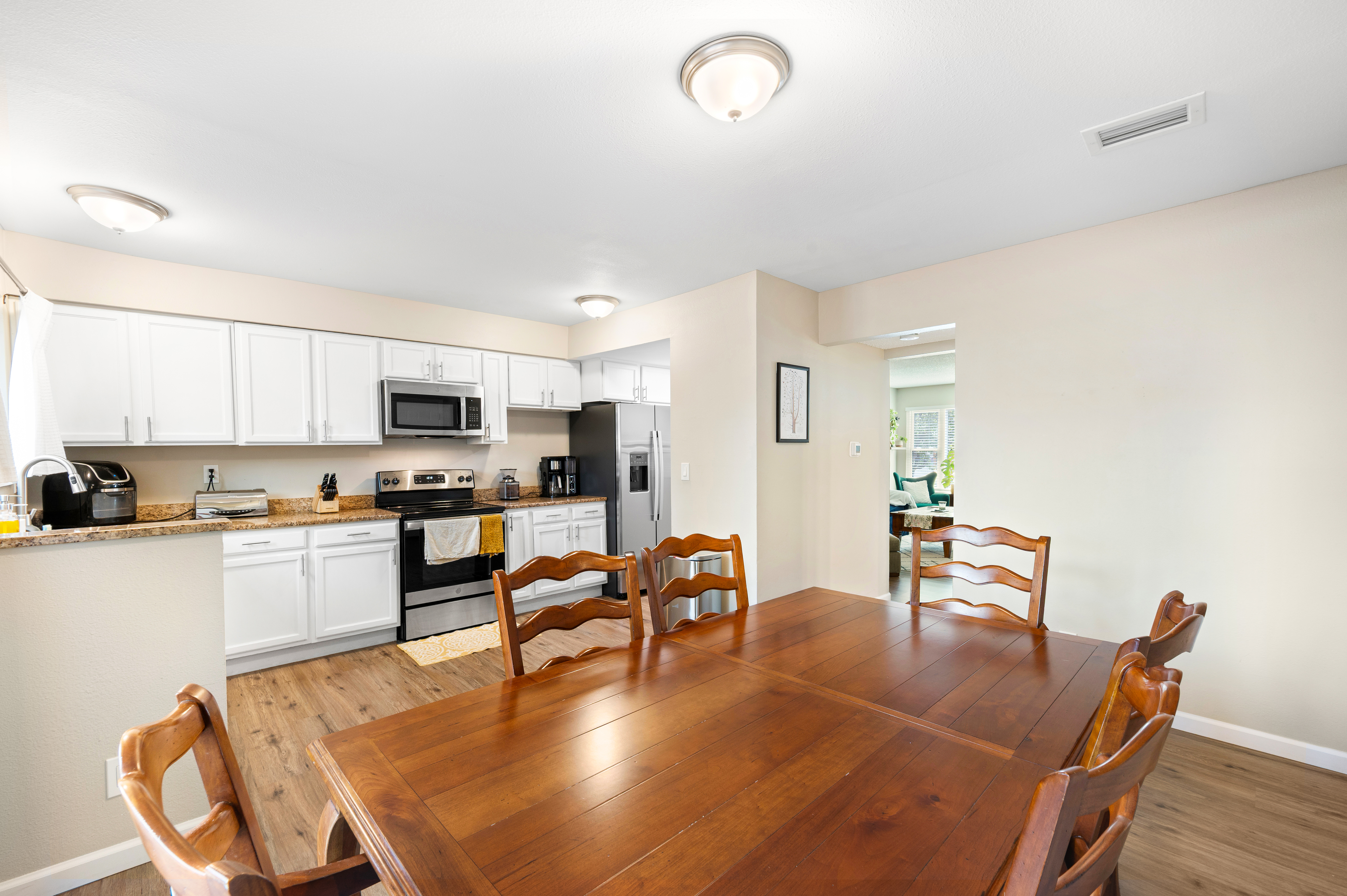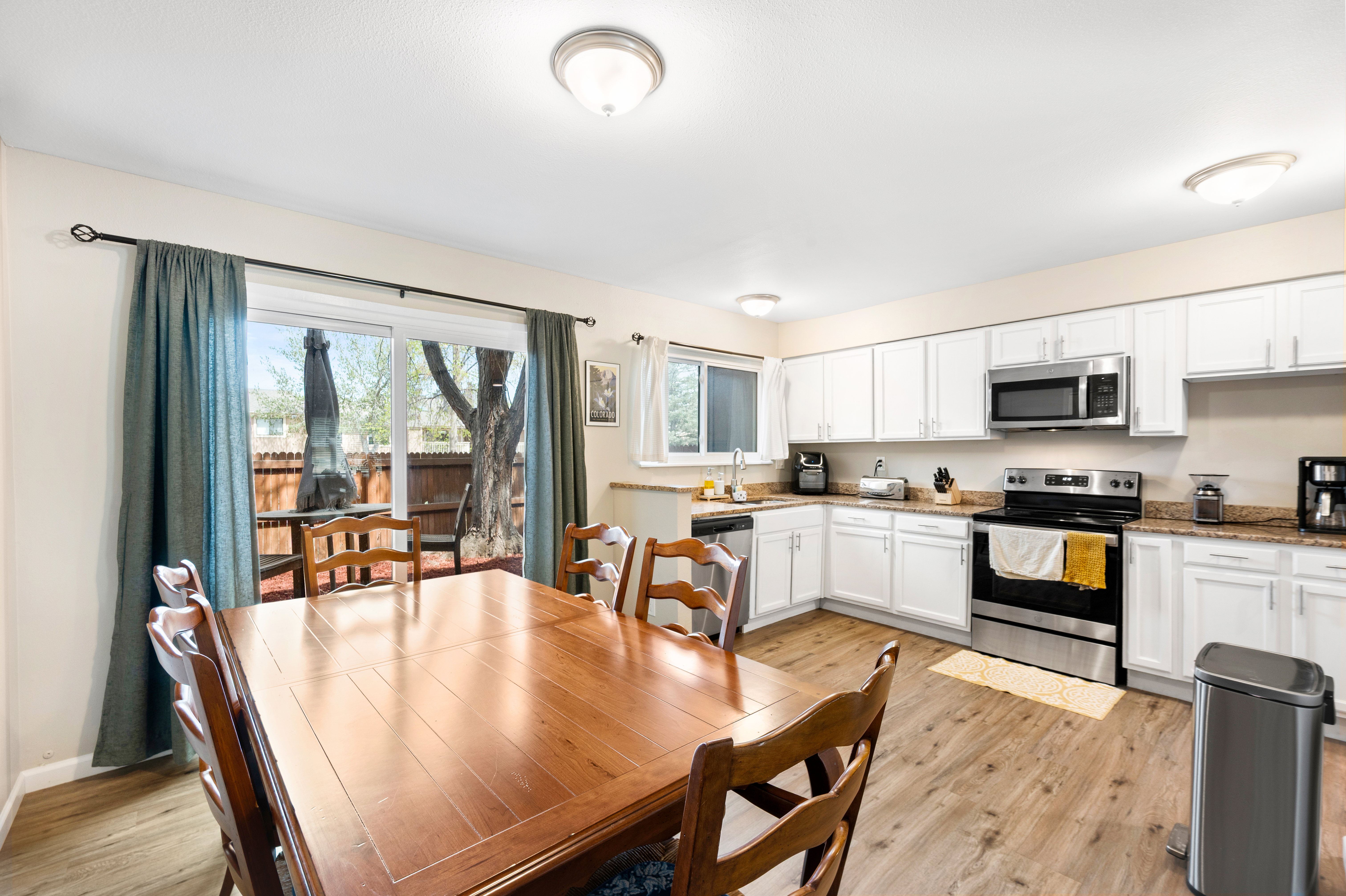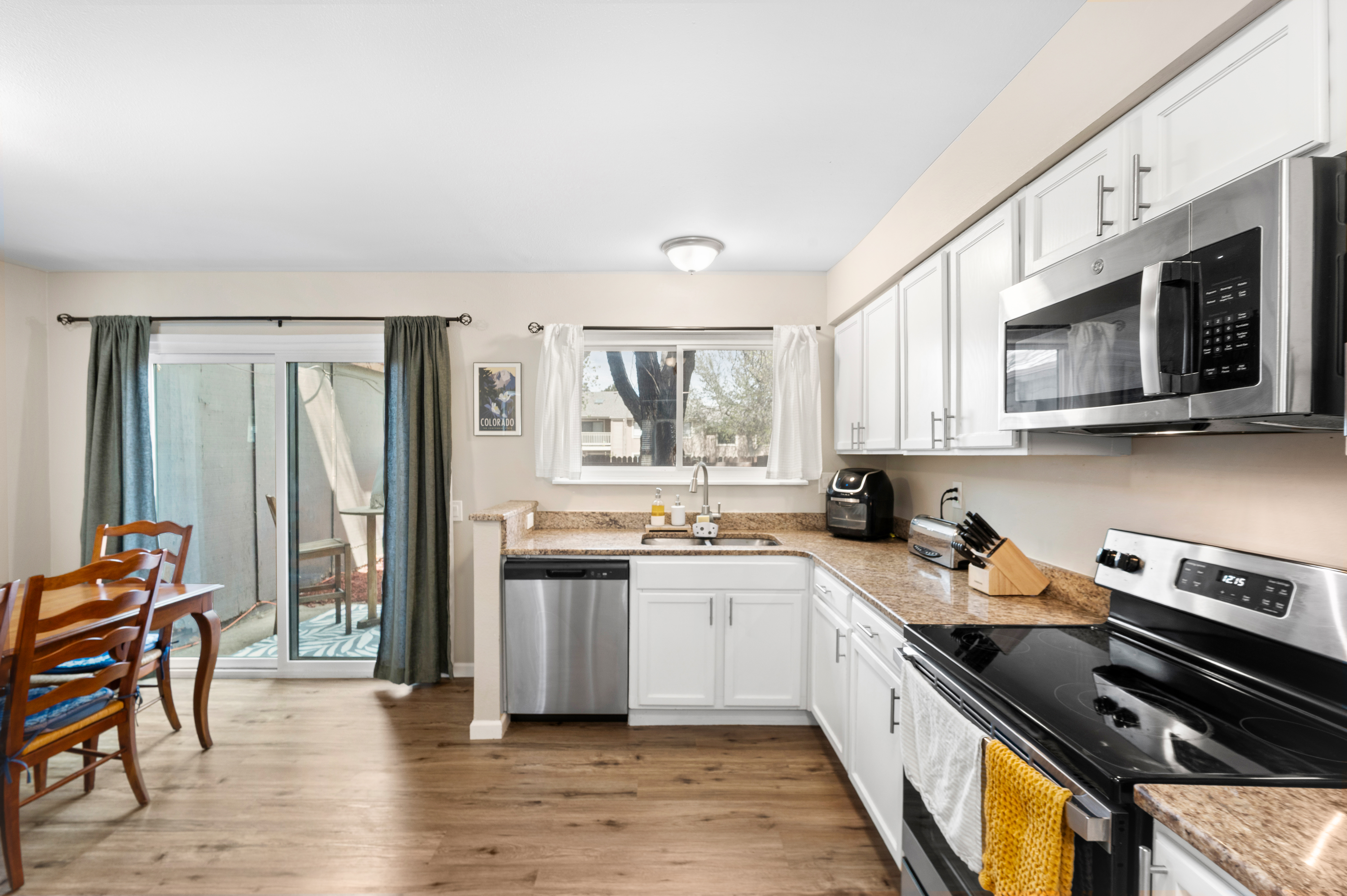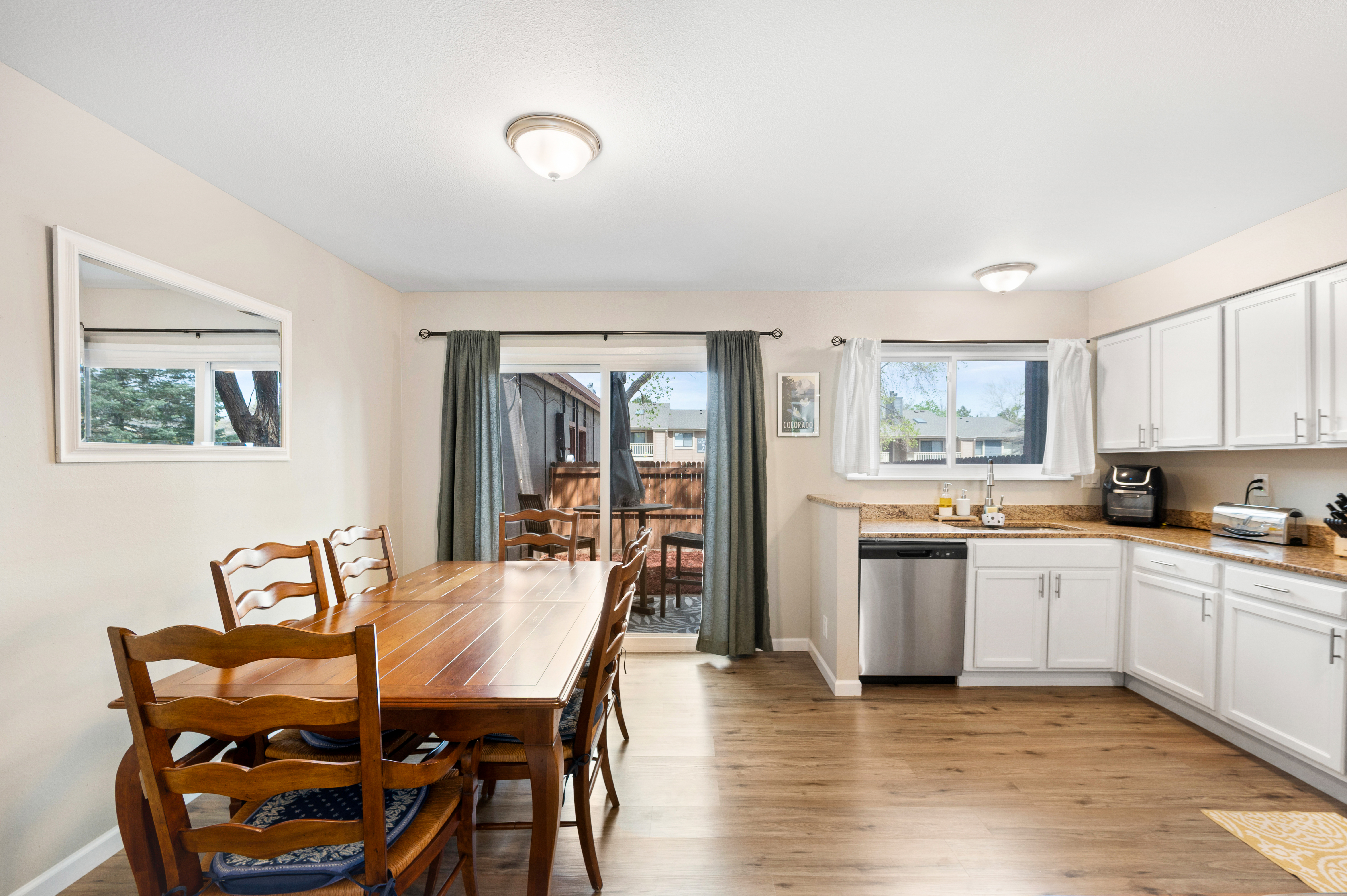 Welcome to this well-maintained 2-bedroom, 2-bath townhome in the Sable Ridge community. Offering 1,258 square feet of comfortable living space, this home features an open, functional layout with LVP flooring throughout the main level, a cozy fireplace, and abundant natural light from large windows.The updated kitchen includes granite countertops, stainless steel appliances, ample cabinetry, and generous counter space. It flows seamlessly into the dining and living areas, creating an ideal setup for everyday living and entertaining. Step outside to a private, fenced patio—perfect for outdoor dining.Upstairs, the primary bedroom offers a spacious layout with a large walk-in closet. The second bedroom is bright and well-sized. A convenient upstairs laundry area includes the washer and dryer. Highly desired attached 2-car garage, with a new garage door and motor (less than 2 years old) provides both storage and security.Conveniently located near parks, shopping, and dining, and approximately 10 miles southeast of Downtown Denver, this home offers excellent accessibility for commuters and strong overall value.