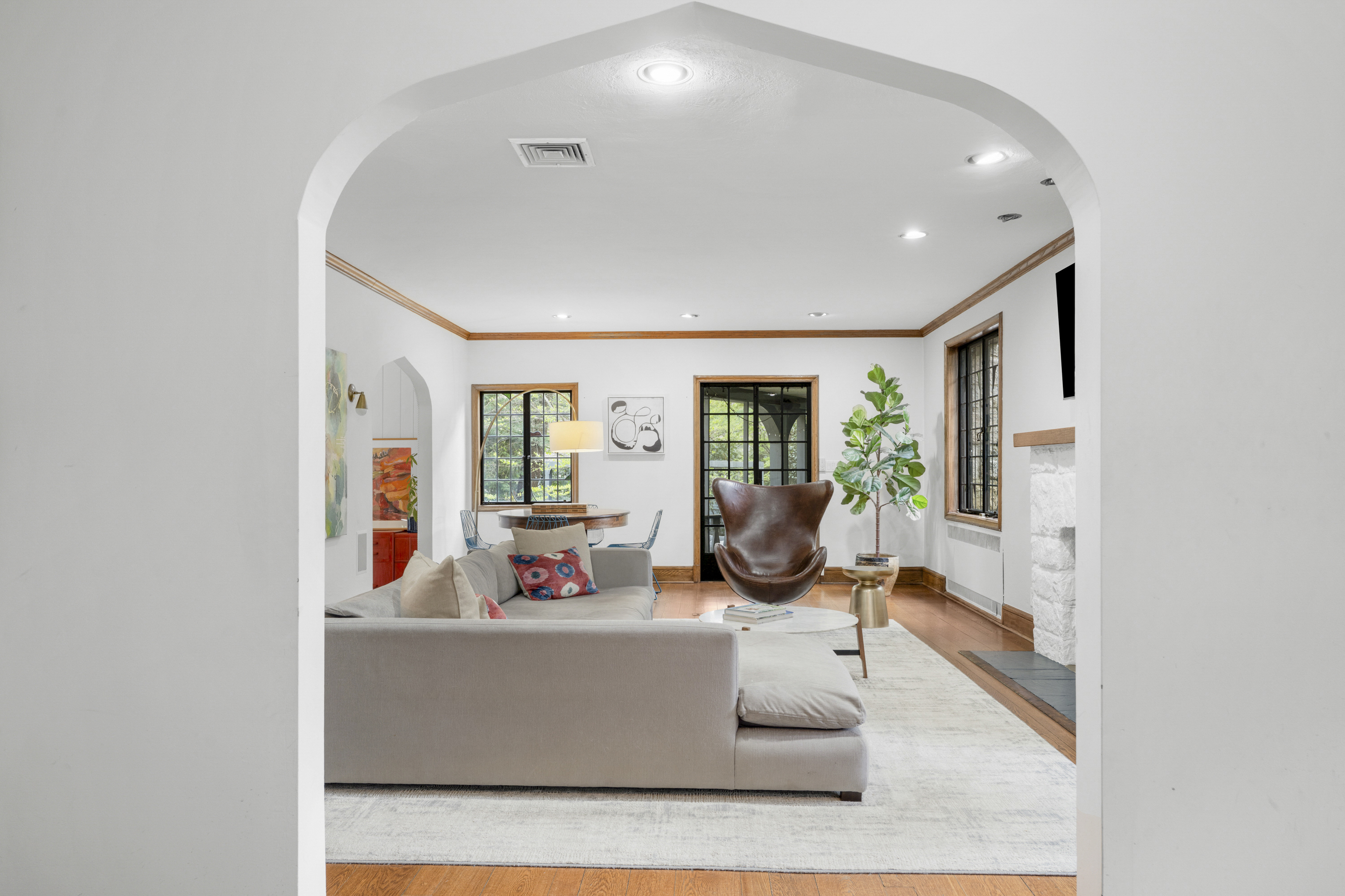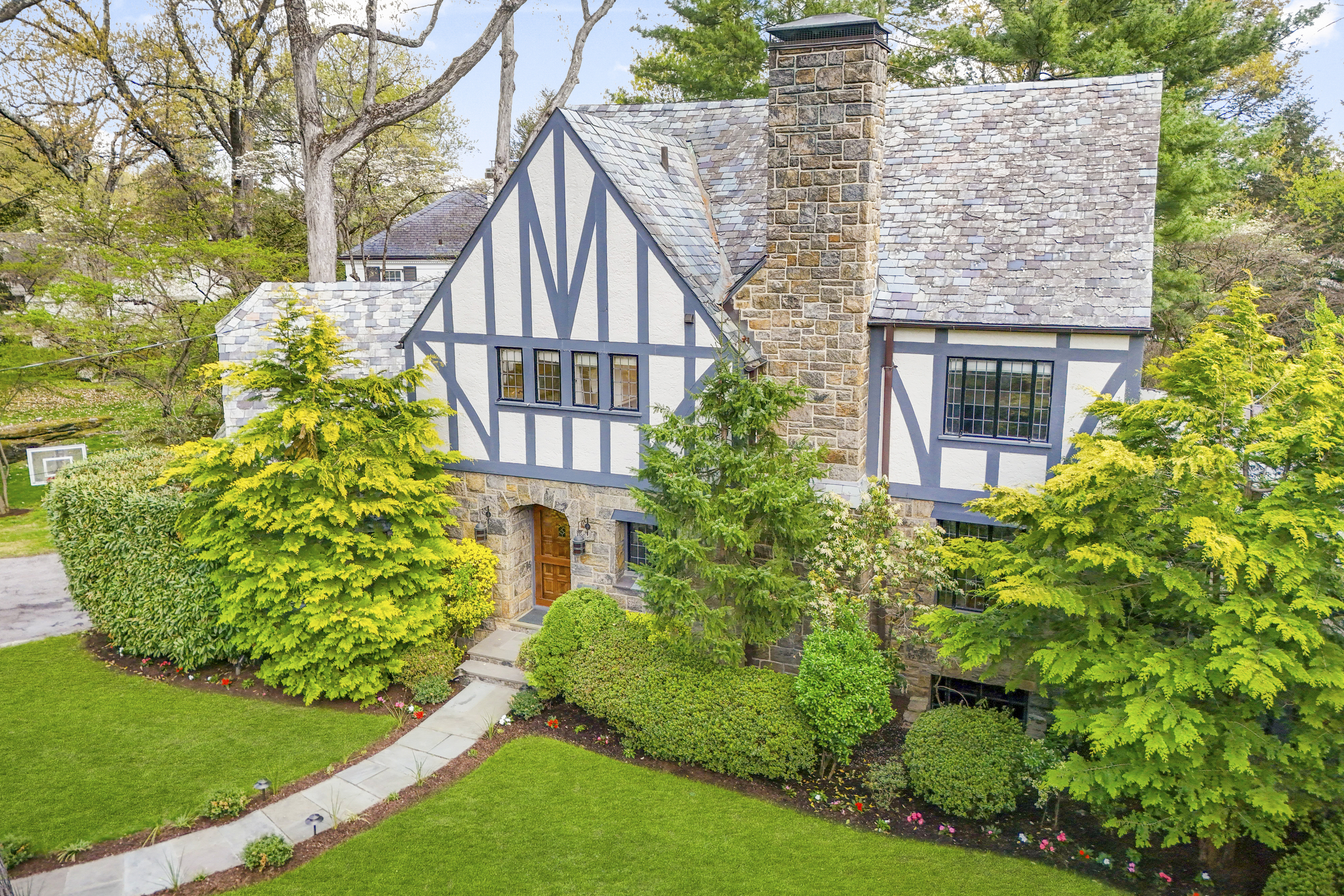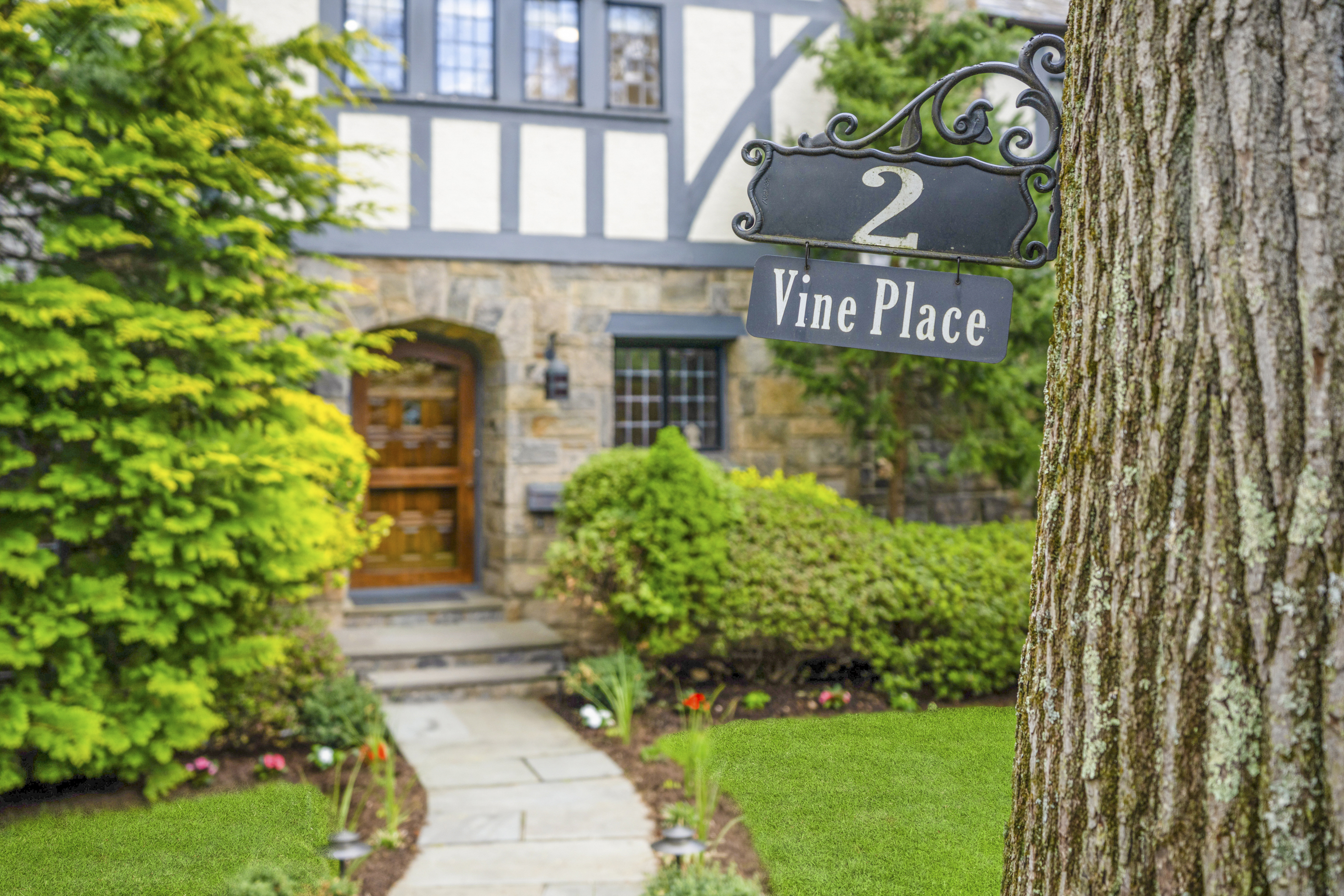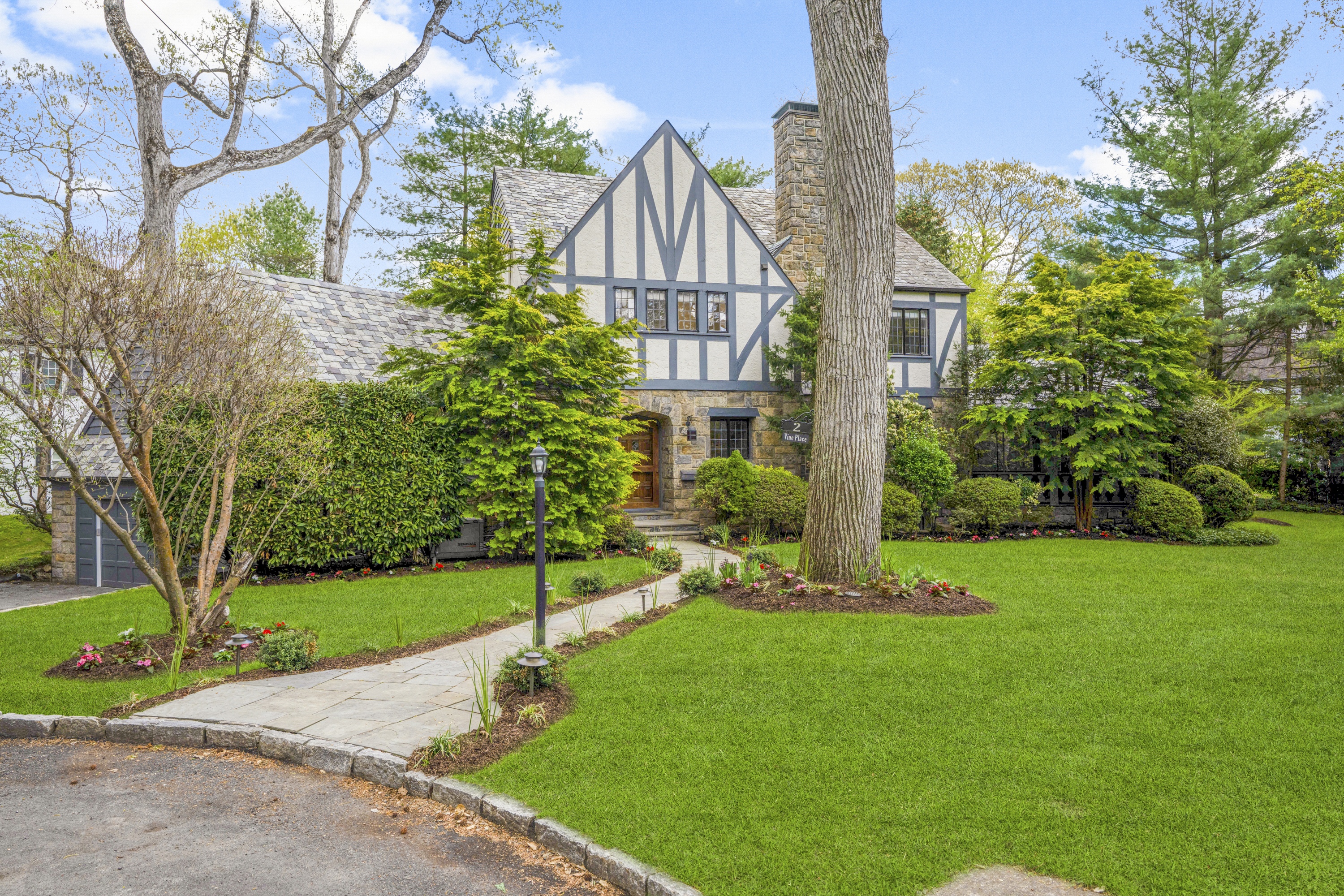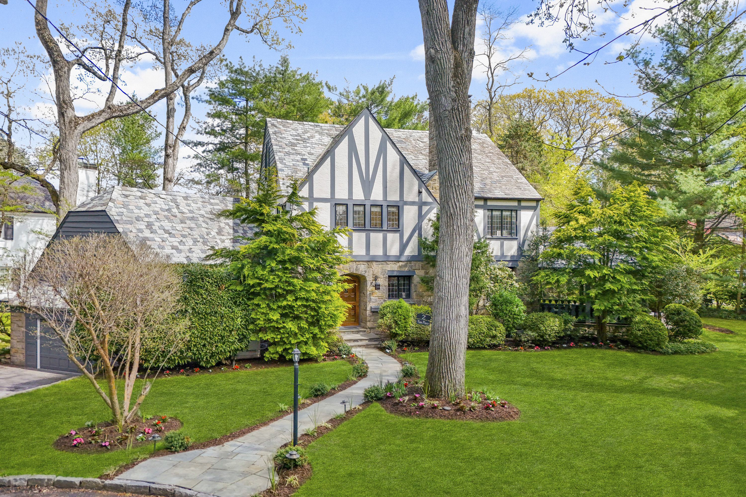 A 1930s Tudor, thoughtfully renovated with a modern, bright, and fresh aesthetic, this sophisticated home is tucked on a quiet cul-de-sac just moments from Murray Avenue Elementary, the village, and the train. Set on .36 acres of beautifully landscaped property, it offers a rare balance of convenience, tranquility and effortless everyday living. A gracious entry hall introduces interiors where classic architectural elements are paired with clean, modern updates. The living room, centered around a stone fireplace, opens to a screened-in porch overlooking the private backyard, creating an effortless extension of the home's living space. Arched doorways and a striking barrel vault ceiling in the dining room add character and dimension, while the paneled library serves as a quiet, refined space with French doors leading outdoors. The kitchen is both dramatic and inviting, with vaulted ceilings, exposed beams, top-of-the-line appliances, a central island, and a cozy breakfast nook. A nearby family room with custom built-ins and a full bath provides flexibility as a private office or additional living space. A powder room and coat closet complete the first floor. Upstairs, the primary suite is well-scaled, complete with a dressing room and a spacious, spa-like bath with a glass-enclosed shower, mosaic tile details, and a soaking tub. Two additional bedrooms and a hall bath complete this level. The third floor features two expansive bedrooms filled with natural light, with treetop views, vaulted ceilings, and an additional bath. The finished lower level (additional 360 square feet) includes an original recreation room with a fireplace, providing a comfortable and versatile space for gathering and recreation, along with generous storage. The private backyard is thoughtfully designed with multiple areas for entertaining and everyday enjoyment, extending the living experience beyond the home. A full-house generator, refinished hardwood floors, original Tudor details, zoned heating and cooling, a security system, sprinkler system, and professionally designed landscaping complete the home. 2 Vine Place offers a sense of serenity while remaining close to the bustle of everyday life, an ideal blend of lifestyle and location.
