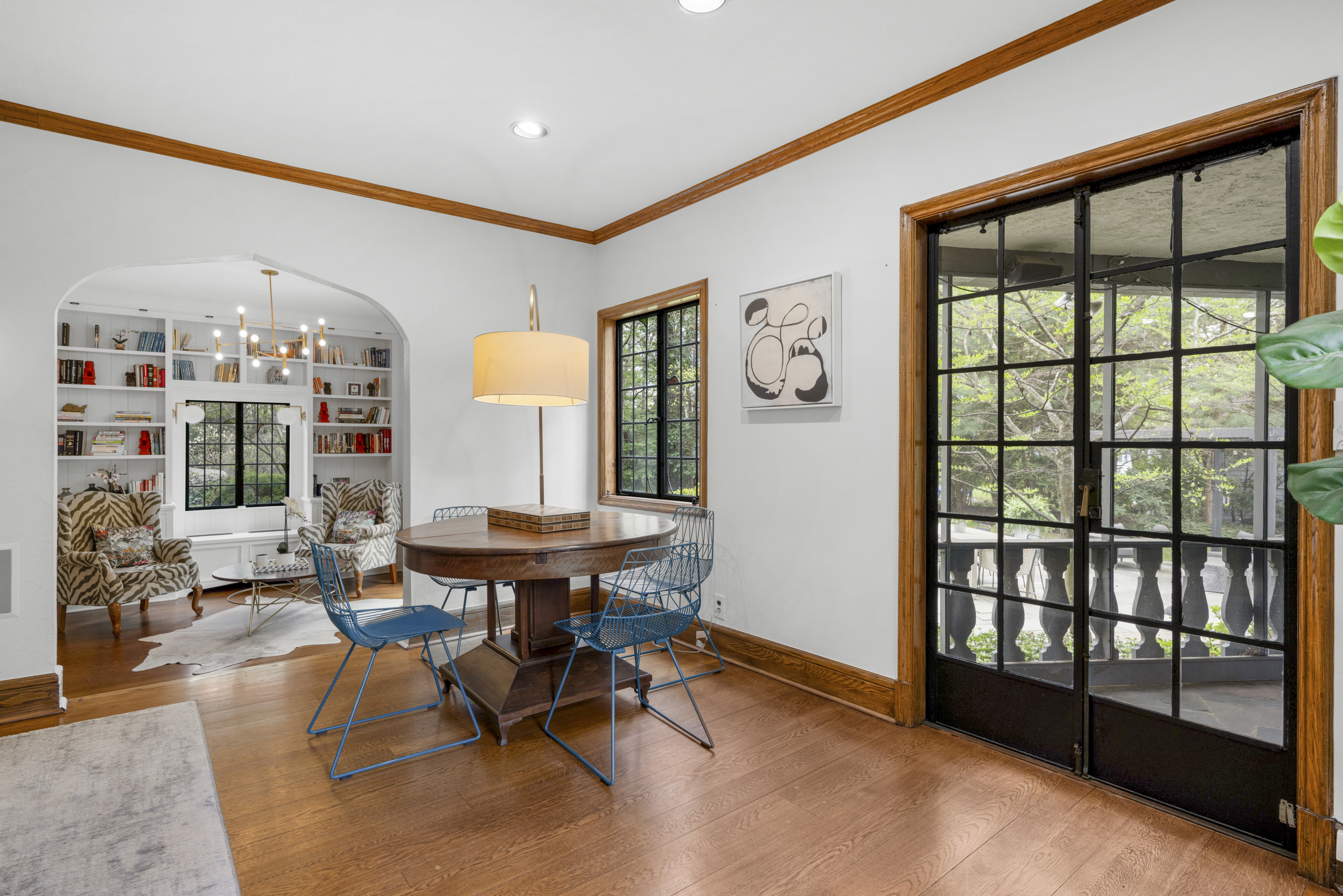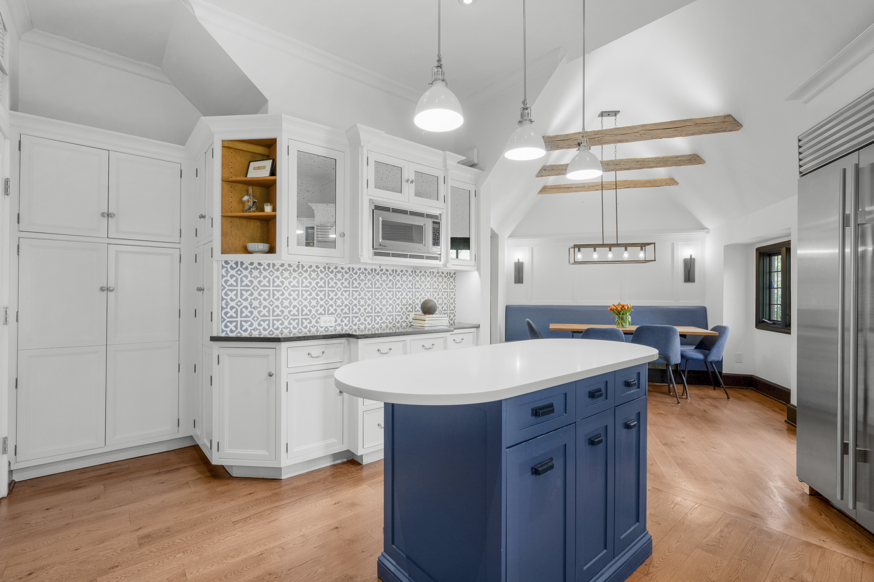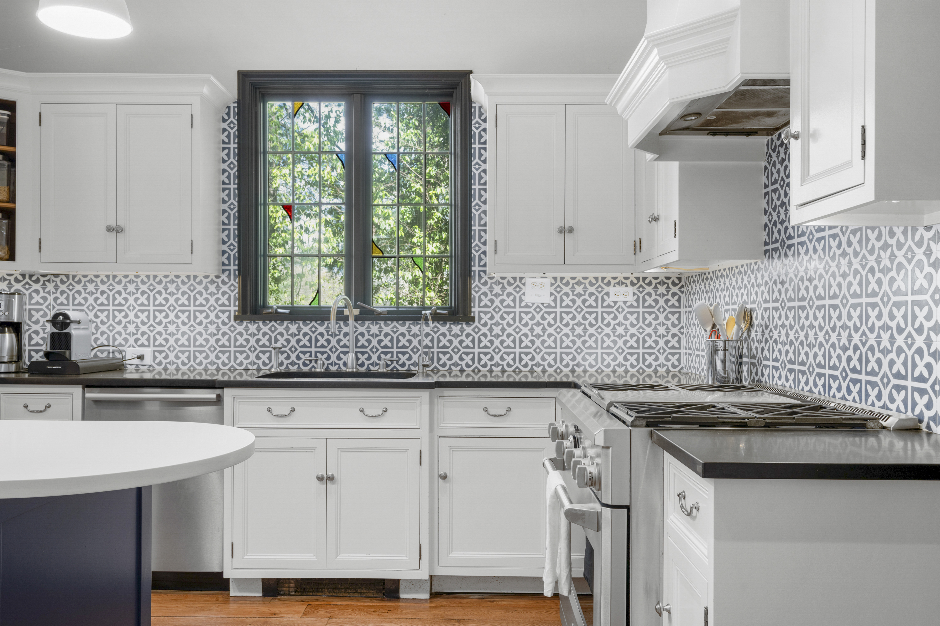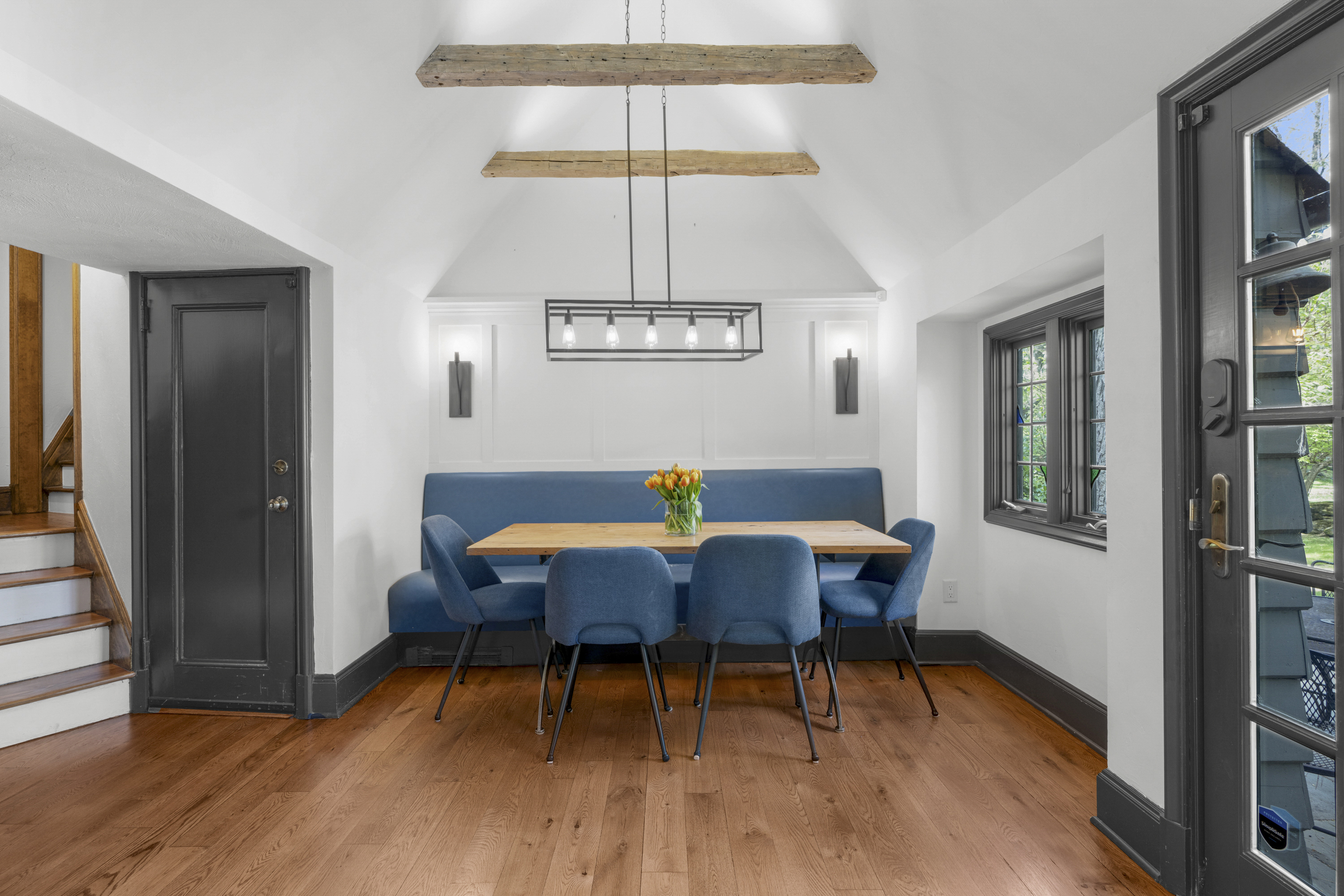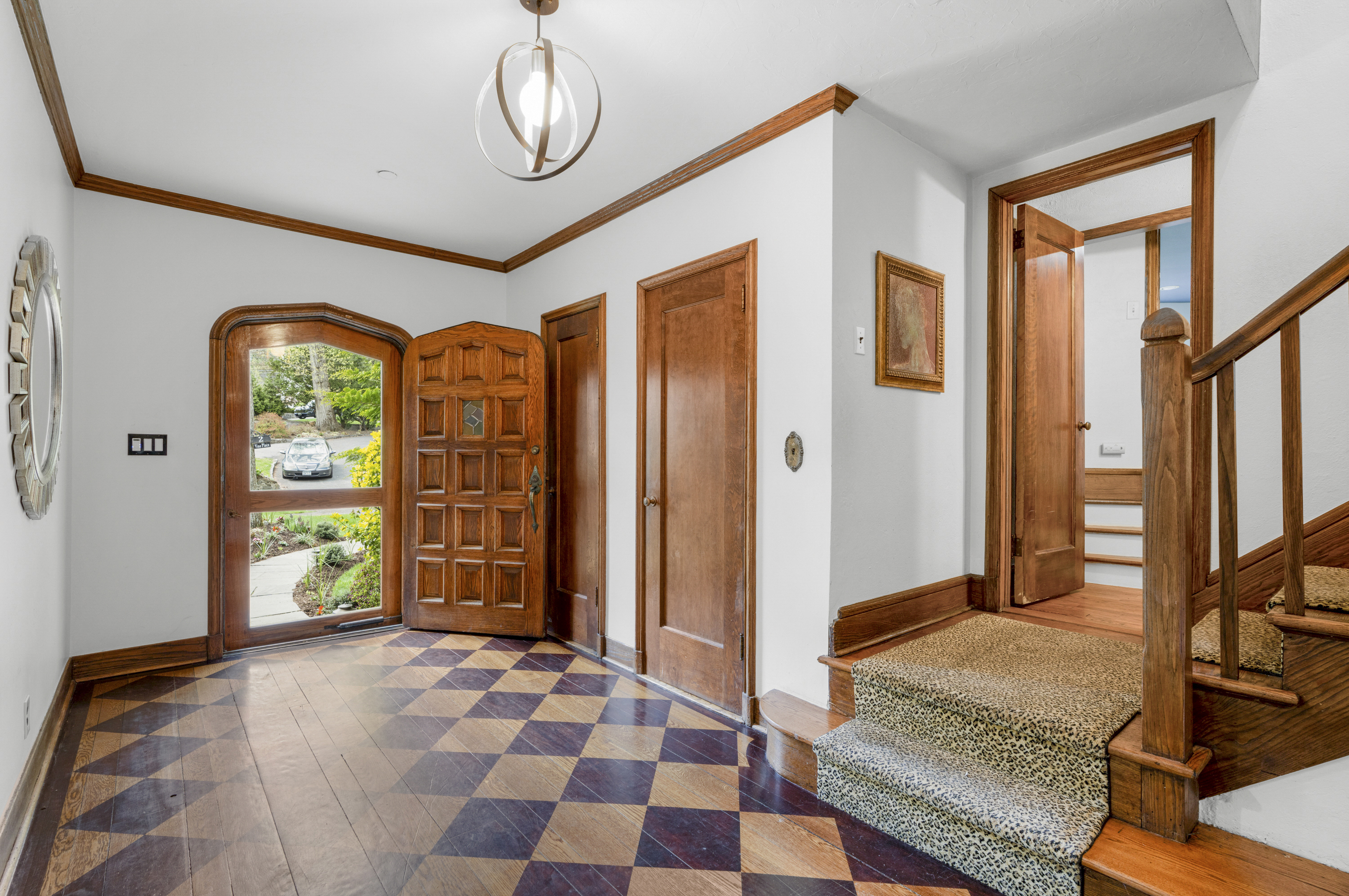 A 1930s Tudor, thoughtfully renovated with a modern, bright, and fresh aesthetic, this sophisticated home is tucked on a quiet cul-de-sac just moments from Murray Avenue Elementary, the village, and the train. Set on .36 acres of beautifully landscaped property, it offers a rare balance of convenience, tranquility and effortless everyday living. A gracious entry hall introduces interiors where classic architectural elements are paired with clean, modern updates. The living room, centered around a stone fireplace, opens to a screened-in porch overlooking the private backyard, creating an effortless extension of the home's living space. Arched doorways and a striking barrel vault ceiling in the dining room add character and dimension, while the paneled library serves as a quiet, refined space with French doors leading outdoors. The kitchen is both dramatic and inviting, with vaulted ceilings, exposed beams, top-of-the-line appliances, a central island, and a cozy breakfast nook. A nearby family room with custom built-ins and a full bath provides flexibility as a private office or additional living space. A powder room and coat closet complete the first floor. Upstairs, the primary suite is well-scaled, complete with a dressing room and a spacious, spa-like bath with a glass-enclosed shower, mosaic tile details, and a soaking tub. Two additional bedrooms and a hall bath complete this level. The third floor features two expansive bedrooms filled with natural light, with treetop views, vaulted ceilings, and an additional bath. The finished lower level (additional 360 square feet) includes an original recreation room with a fireplace, providing a comfortable and versatile space for gathering and recreation, along with generous storage. The private backyard is thoughtfully designed with multiple areas for entertaining and everyday enjoyment, extending the living experience beyond the home. A full-house generator, refinished hardwood floors, original Tudor details, zoned heating and cooling, a security system, sprinkler system, and professionally designed landscaping complete the home. 2 Vine Place offers a sense of serenity while remaining close to the bustle of everyday life, an ideal blend of lifestyle and location.