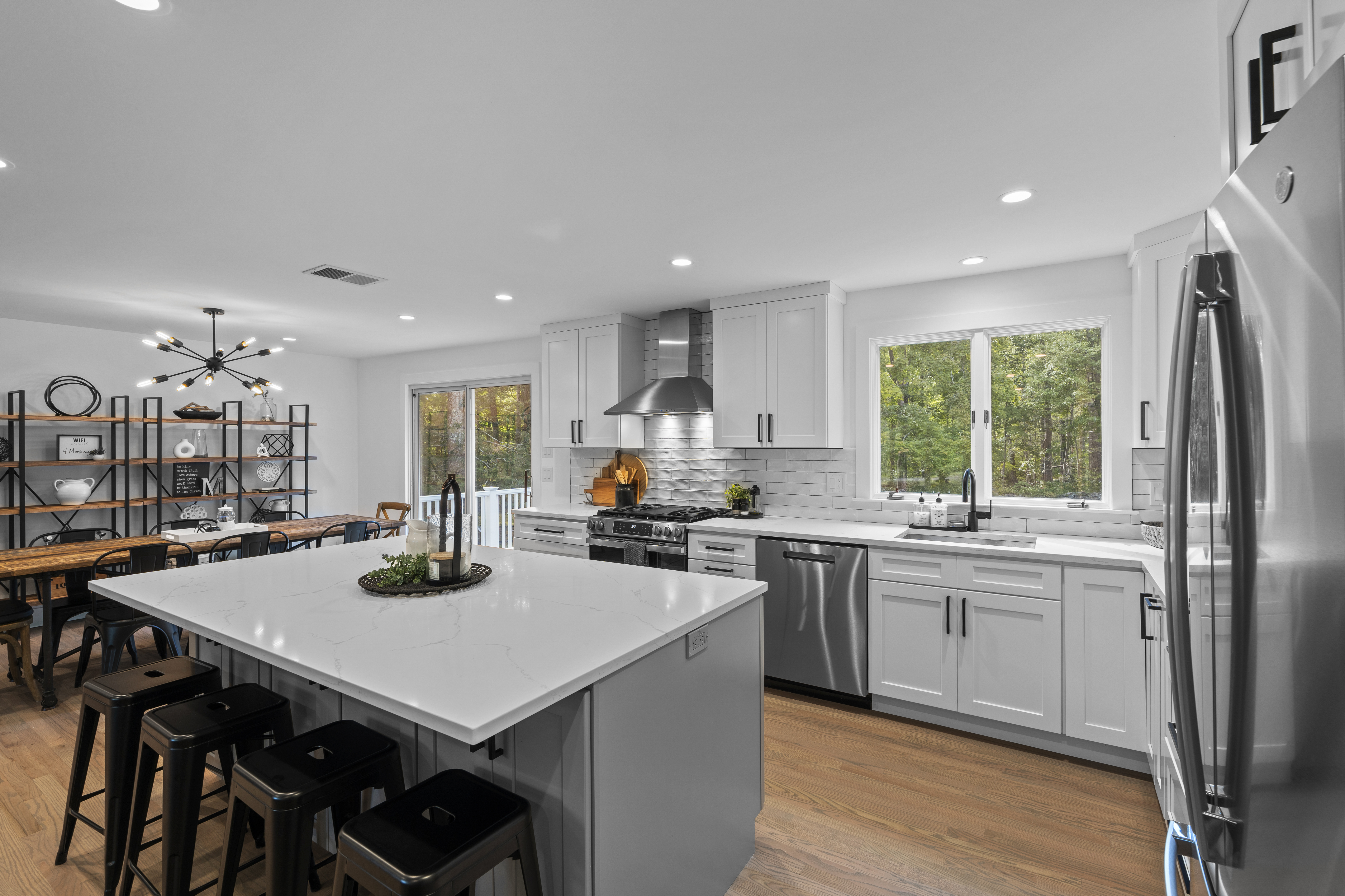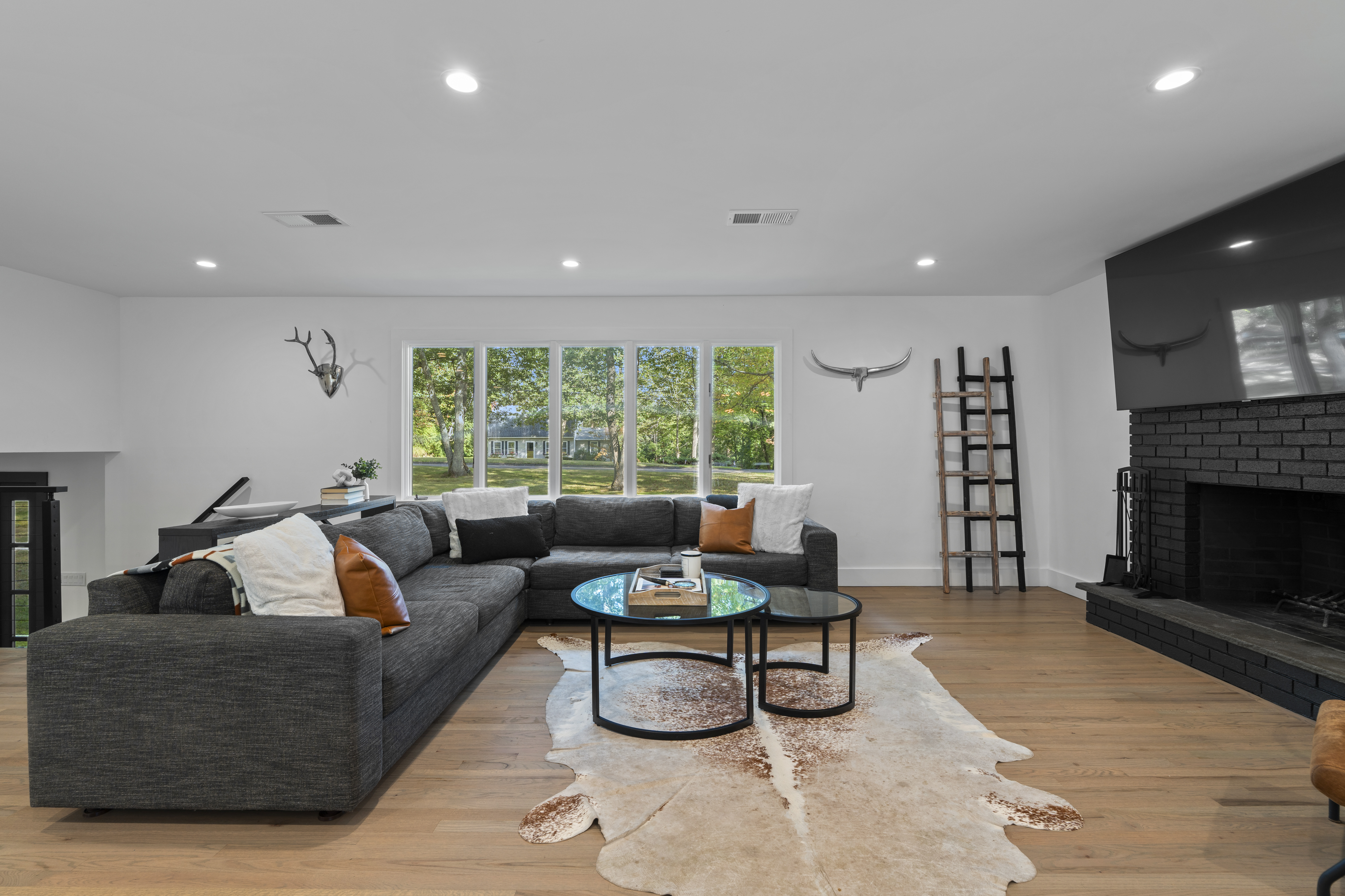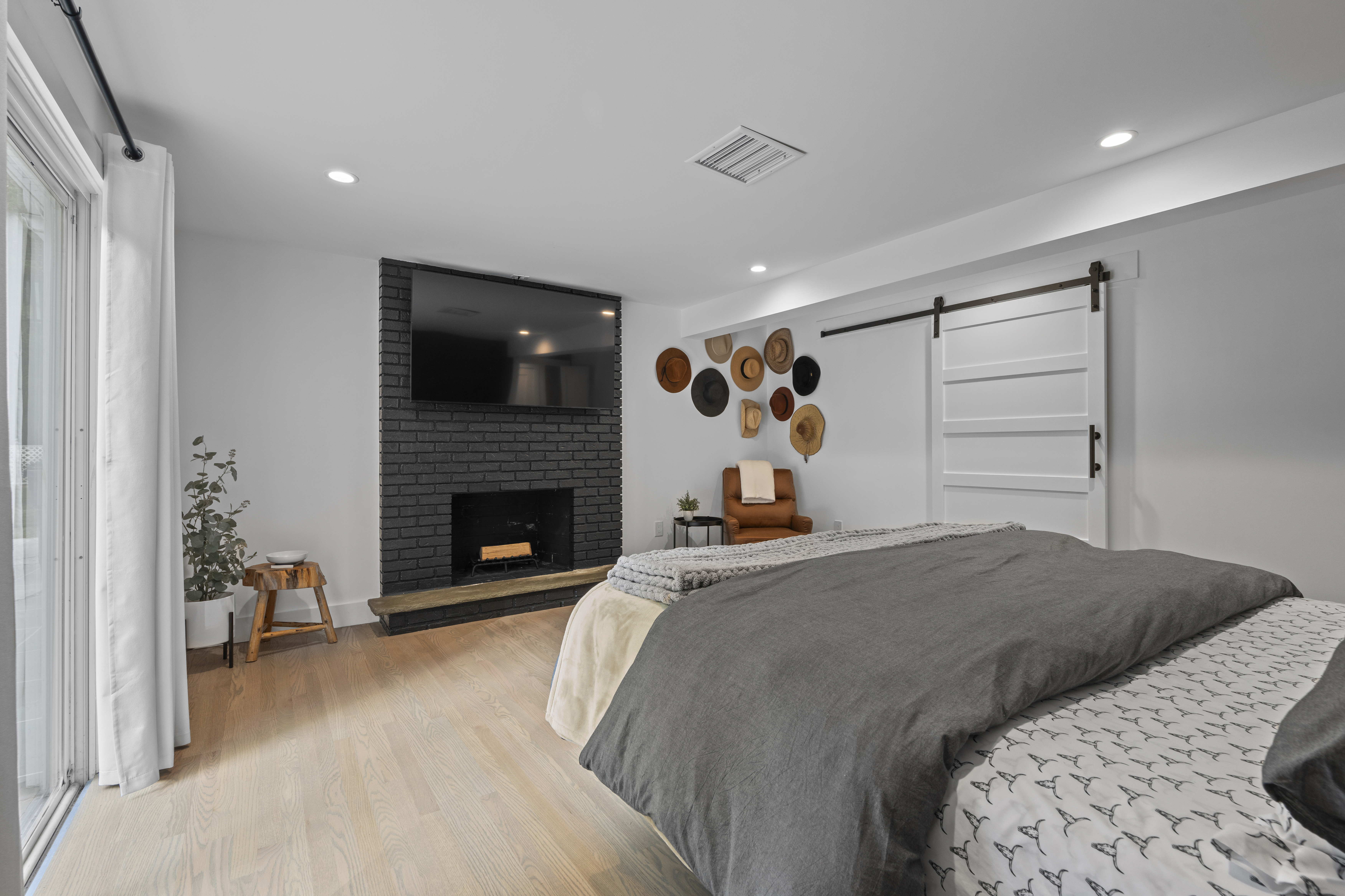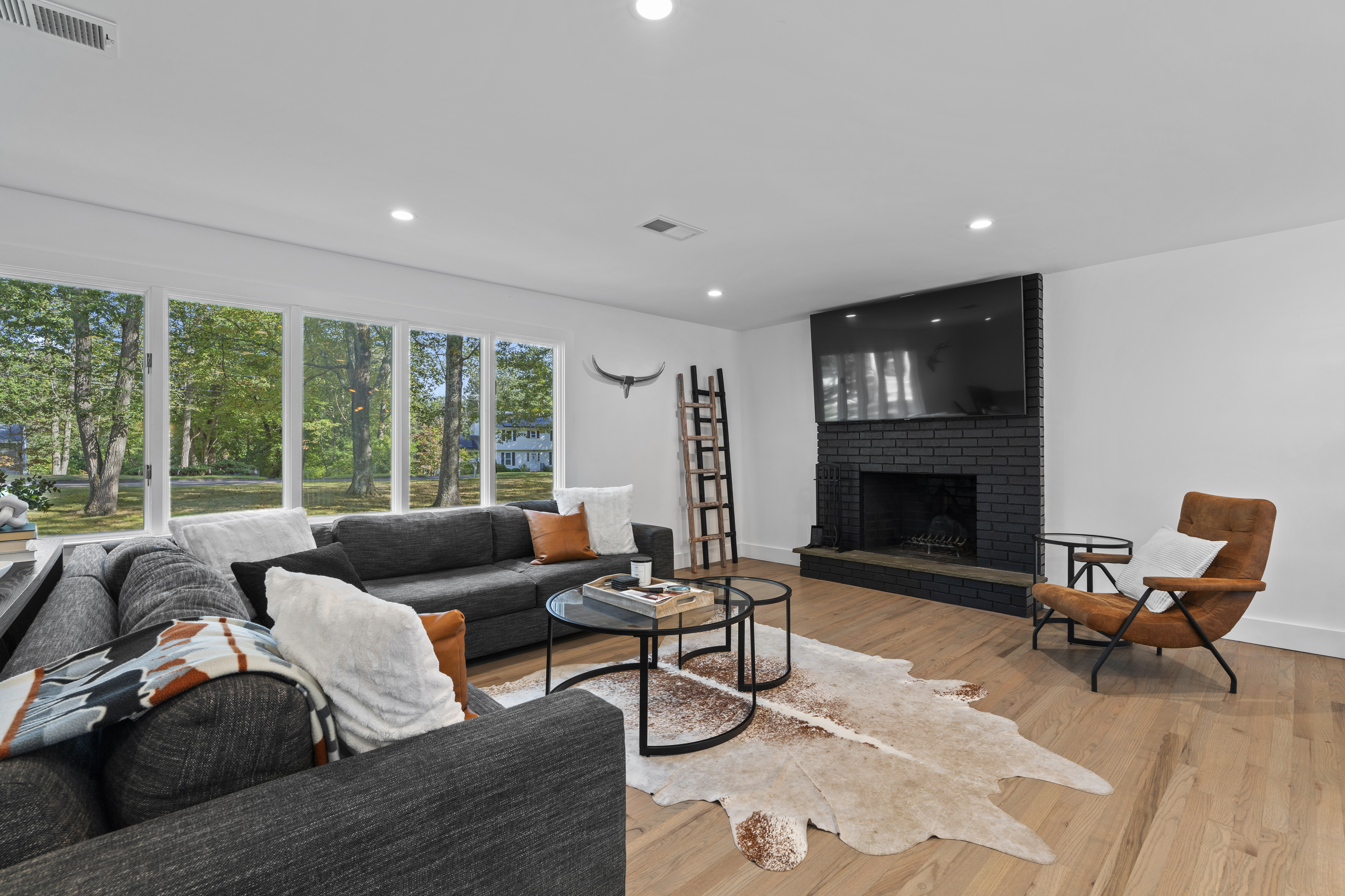 Meticulously reimagined from top to bottom, this stunning contemporary home delivers 2,025 sq ft of turnkey luxury on over an acre of level land. Tucked on a peaceful street, the residence boasts 3 bedrooms and 3 full baths, highlighted by a main-level primary suite with its own fireplace, patio access, and spa-inspired bath. There is a versatile 2nd-floor suite with full bath: perfect for an office, den, or guest room. Light-filled and inviting, the open layout showcases gleaming hardwood floors, designer recessed lighting, and crisp new trim, railings, doors, and hardware throughout. The chef-inspired kitchen is a true centerpiece-outfitted with custom cabinetry, striking quartzite countertops, an expansive island, and premium GE appliances including a beverage fridge. It flows effortlessly into the dining and living spaces. All three baths have been transformed with modern tile, sleek vanities, and Moen fixtures. Thoughtful details include two cozy fireplaces, new windows in every bathroom, smooth ceilings, and fresh neutral paint. Behind the walls, everything is new: 200-amp electrical, complete plumbing overhaul, tankless water heater, high-efficiency heat pump, and central air. Step outside to a low-maintenance Trex deck, fire pit area, and landscaped grounds-ideal for entertaining or quiet evenings. Situated in a sought-after neighborhood, this exceptional home offers the perfect blend of modern elegance and effortless, worry-free living.H&B due 4/25 @6PM