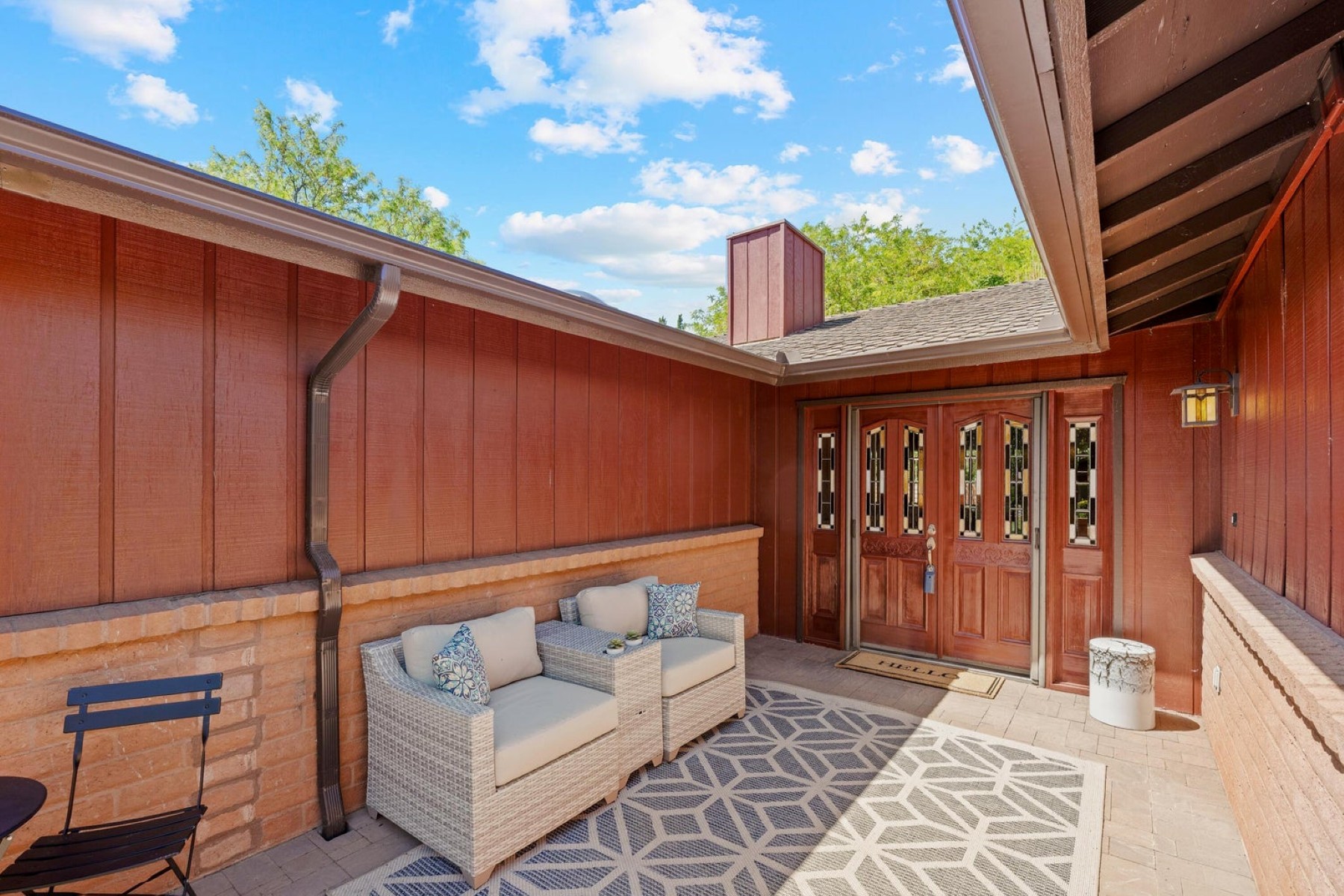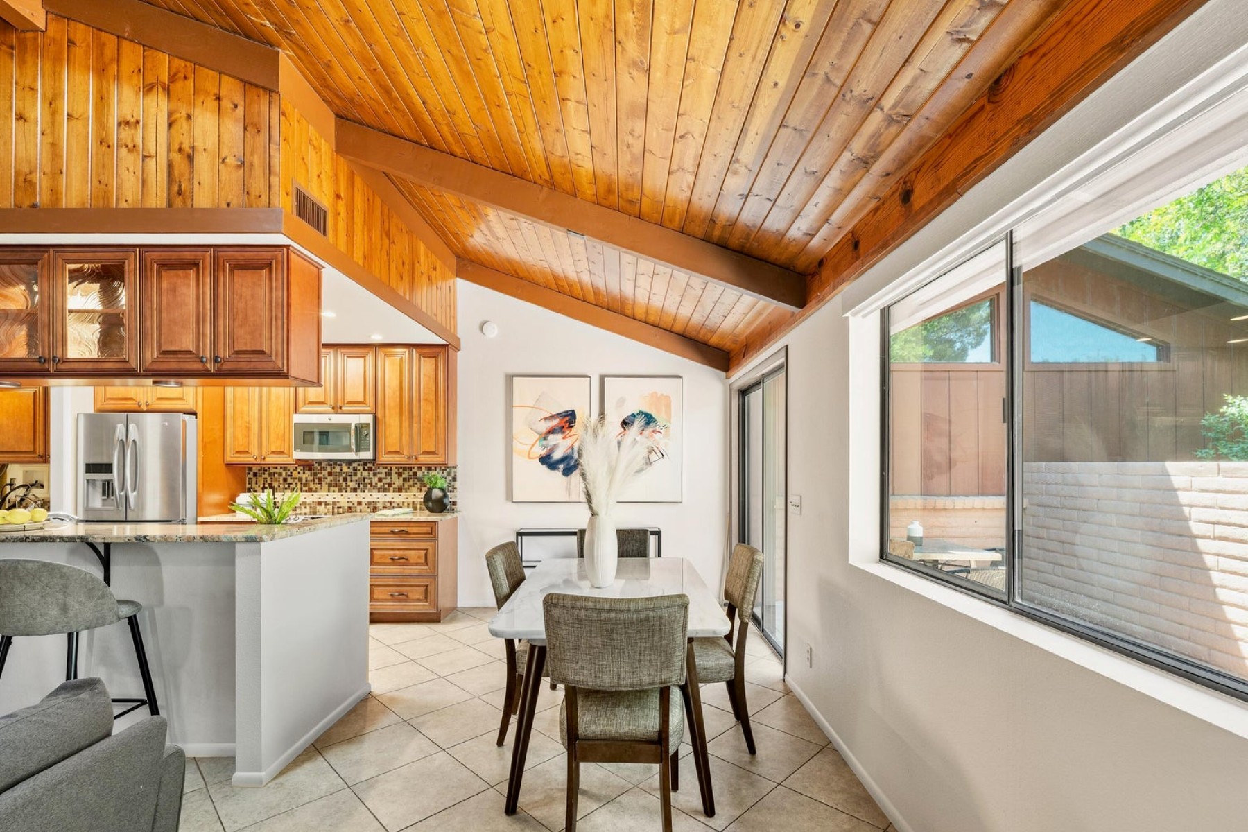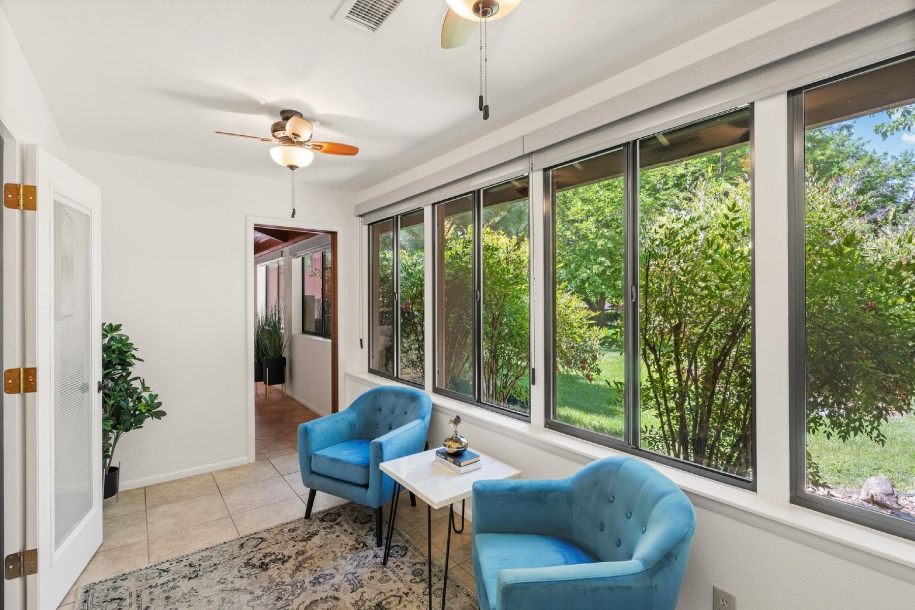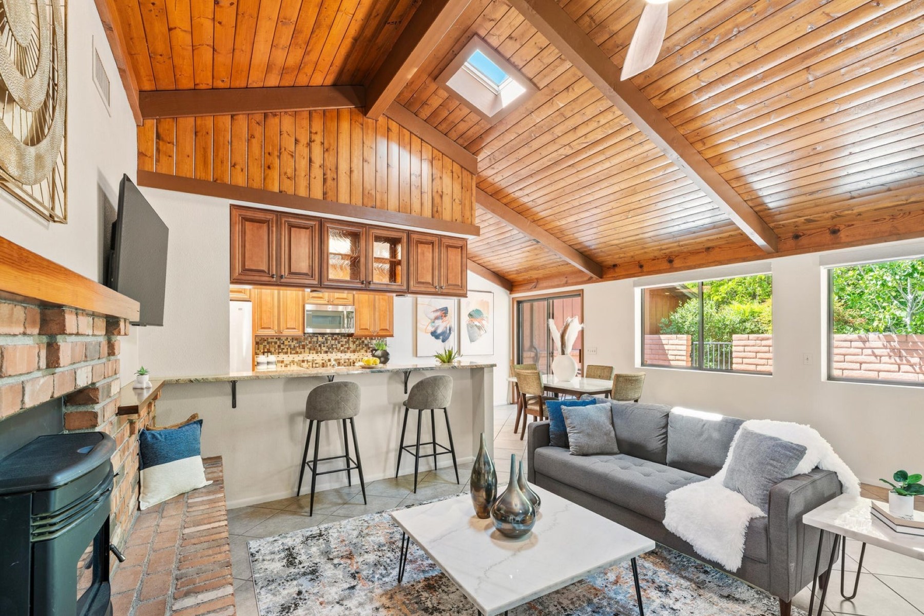 Set within the lush, tree-filled grounds of Sundance Townhomes, this single-level residence feels more like a private nature park than a townhome community--surrounded by greenery and bordering the manicured fairways of Oak Creek Country Club. It's a setting that offers a welcome reprieve in the warmer months, where shade + serenity take center stage. Spanning 1,761 SF, the 2 BD, 2 BA layout is open, comfortable and filled with character. A great room is anchored by soaring tongue-and-groove ceilings and a pellet stove, blending warmth with a subtle retro-modern edge. The primary suite offers generous proportions, including a walk-in closet, a sitting area, and peaceful greenbelt views. A charming back patio with peek-a-boo Castle Rock views extends the living experience outdoors. See it