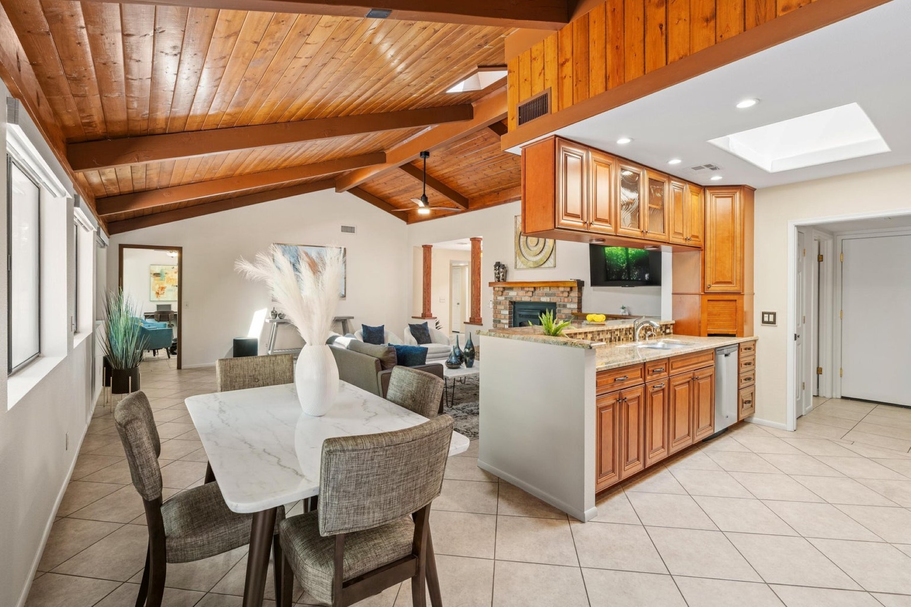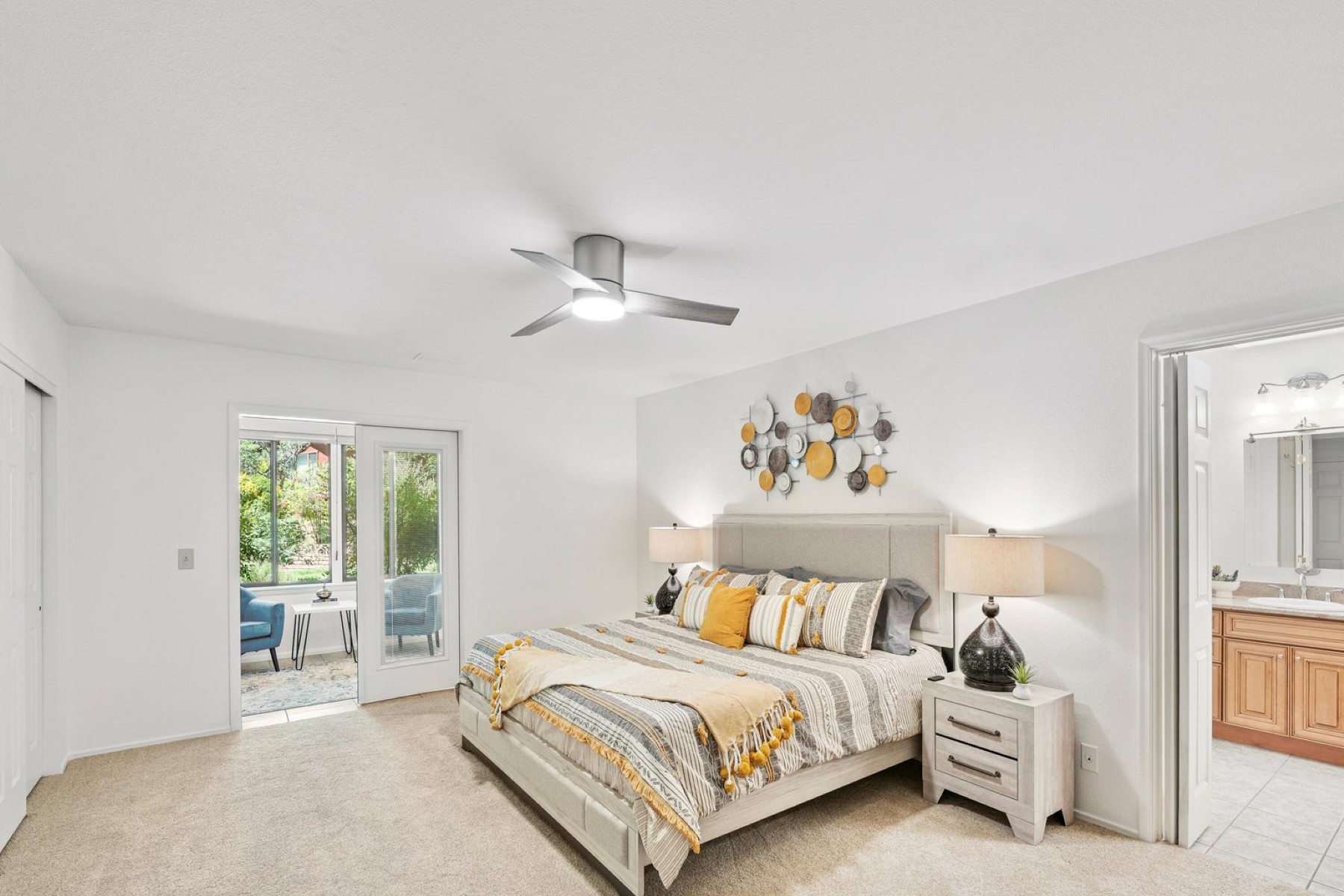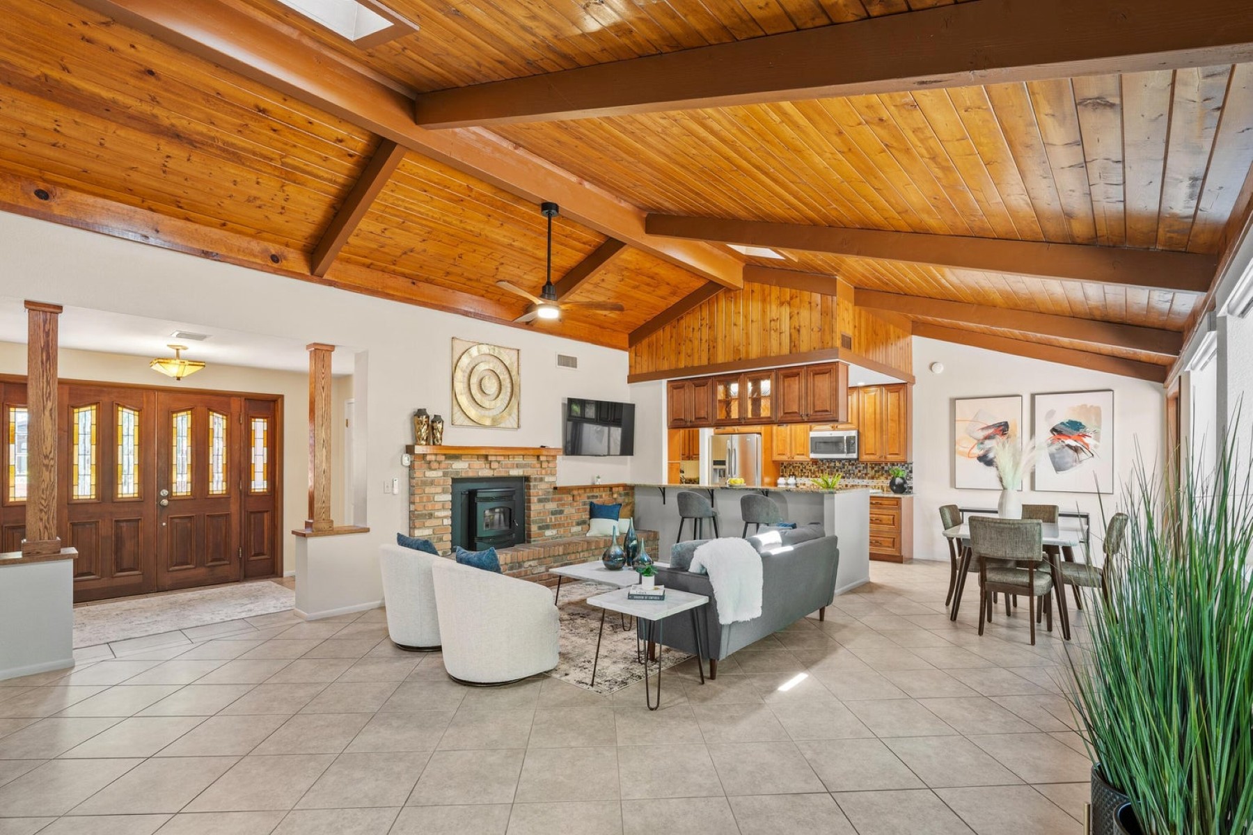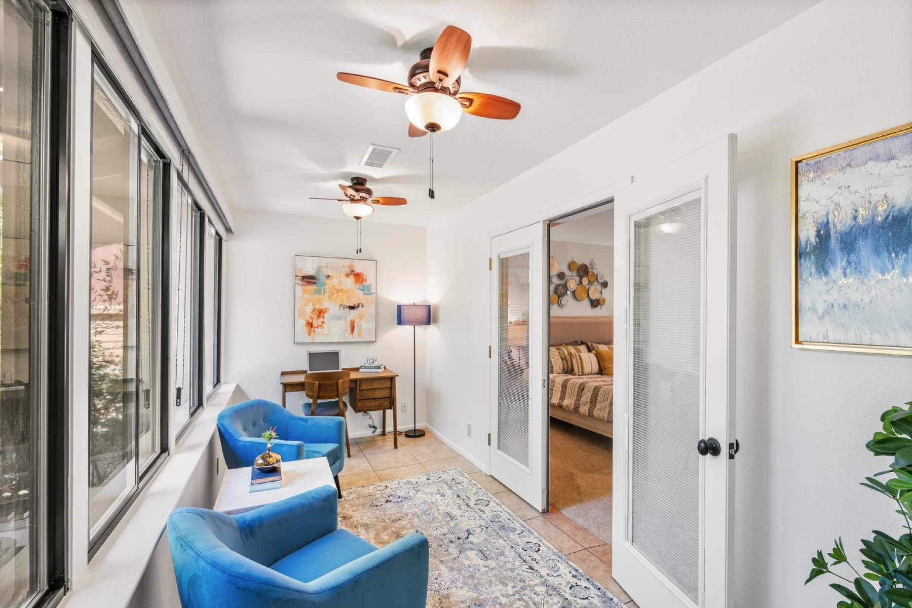 Set within the lush, tree-filled grounds of Sundance Townhomes, this single-level residence feels more like a private nature park than a townhome community--surrounded by greenery and bordering the manicured fairways of Oak Creek Country Club. It's a setting that offers a welcome reprieve in the warmer months, where shade + serenity take center stage. Spanning 1,761 SF, the 2 BD, 2 BA layout is open, comfortable and filled with character. A great room is anchored by soaring tongue-and-groove ceilings and a pellet stove, blending warmth with a subtle retro-modern edge. The primary suite offers generous proportions, including a walk-in closet, a sitting area, and peaceful greenbelt views. A charming back patio with peek-a-boo Castle Rock views extends the living experience outdoors. See it