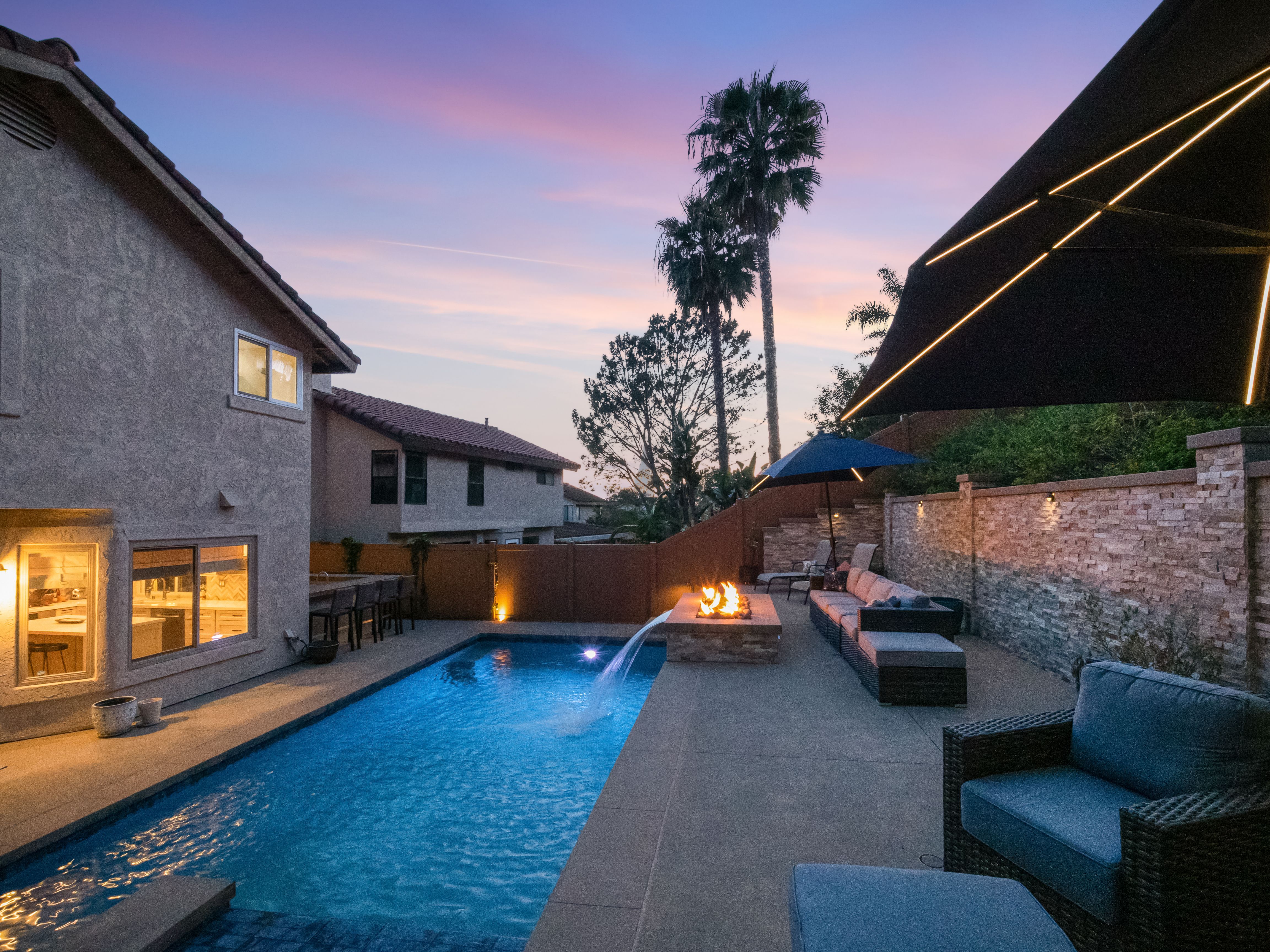 Nestled at the end of a quiet cul-de-sac in the highly desirable San Remo community of Carmel Valley, this beautifully remodeled home offers a rare blend of privacy, luxury, and natural beauty. Backing onto a serene greenbelt with access to scenic hiking trails, the property provides a peaceful retreat while still being close to everything San Diego has to offer. The setting is ideal for those who value both tranquility and convenience, creating a true sense of escape without sacrificing accessibility. Inside, the home features thoughtful upgrades and elegant finishes throughout. A modern chef’s kitchen is equipped with sleek stainless steel appliances, while stylish laminate flooring adds warmth and durability to the open, light-filled living spaces. Designed with both comfort and entertaining in mind, the layout seamlessly connects indoor and outdoor living, making it perfect for everyday living as well as hosting guests. The backyard transforms the home into a private resort-style oasis. A stunning state-of-the-art pool with a cascading waterfall serves as the centerpiece, complemented by lush landscaping that enhances both beauty and privacy. The outdoor living experience is elevated with a fully equipped cooking area featuring premium LYNX appliances, including a high-performance gas grill with infrared capabilities—perfect for entertaining and al fresco dining. As the sun sets, the custom fire pit creates the perfect ambiance for relaxing evenings or gathering with friends, capturing the essence of Southern California living at its finest. Located within walking distance to Carmel Creek Elementary School, Carmel Valley Middle School, and just minutes from Torrey Pines High School, the home is positioned within one of the area’s top-rated school districts. Residents also enjoy close proximity to One Paseo, a vibrant destination for dining, shopping, and entertainment, along with easy freeway access and a short drive to San Diego’s renowned beaches. Carmel Valley is known for its exceptional quality of life, offering a family-friendly atmosphere, beautiful parks and trails, and a strong sense of community. With its prime location, luxurious upgrades, and stunning indoor-outdoor living spaces, this home represents the perfect opportunity to experience the very best of coastal San Diego living.