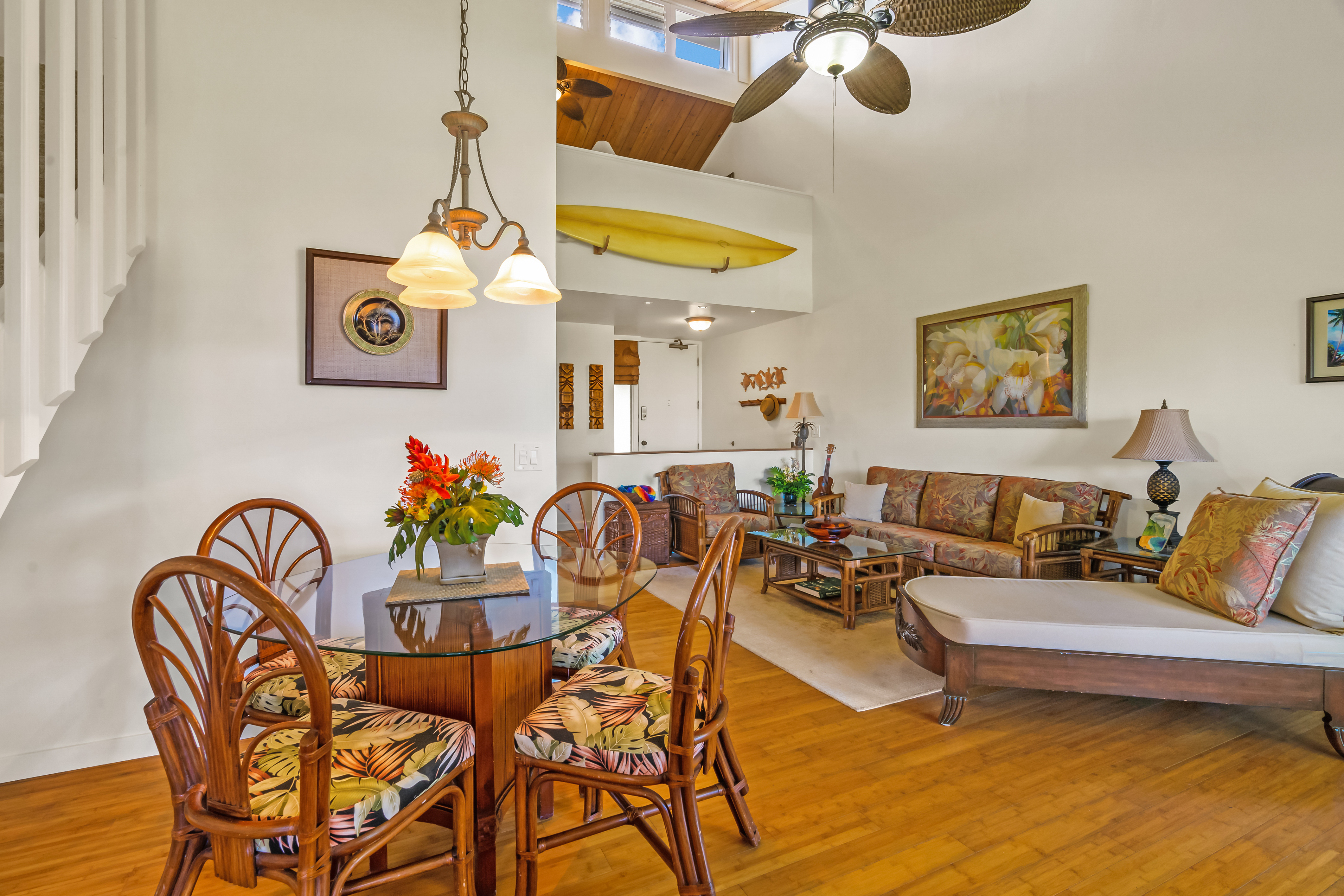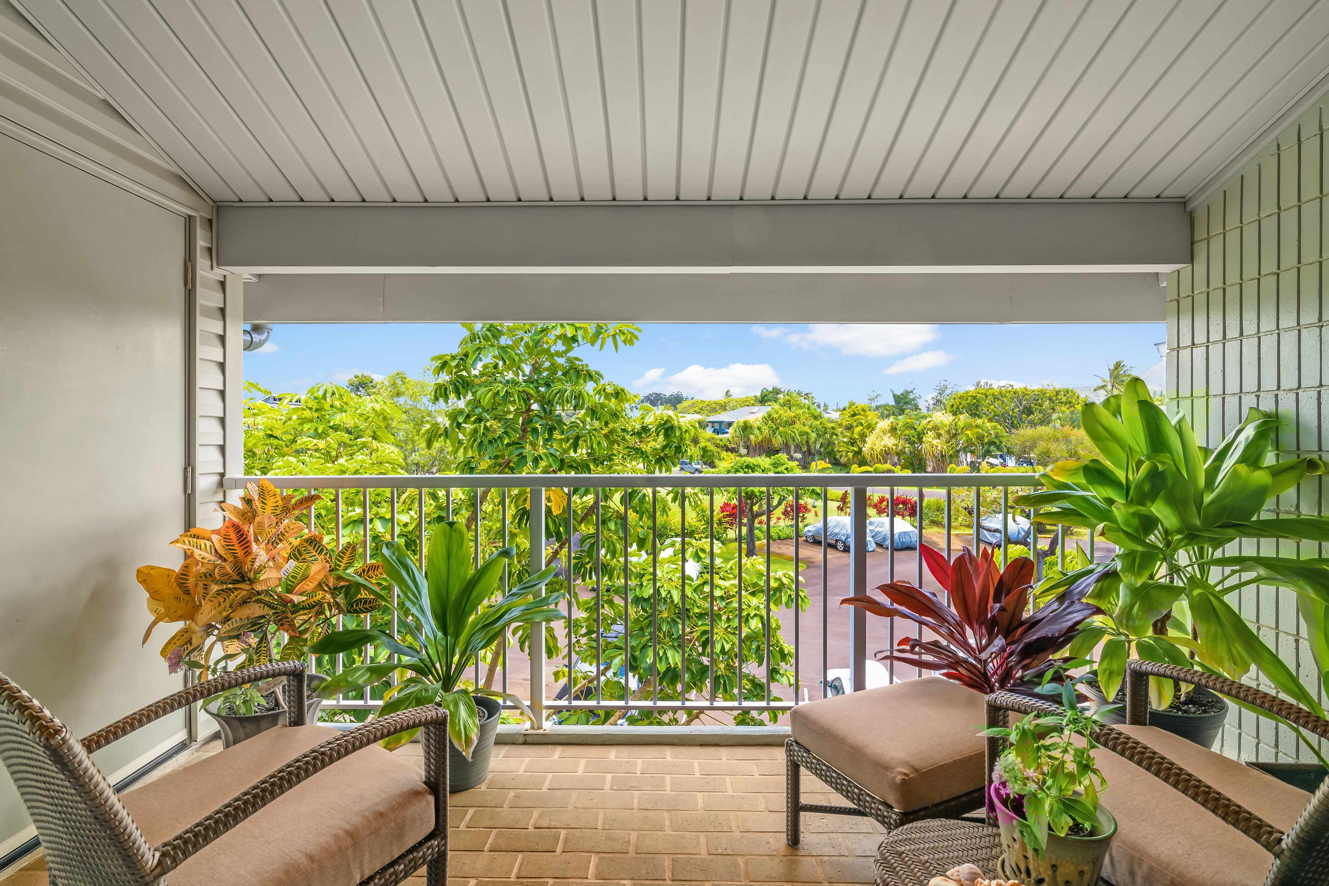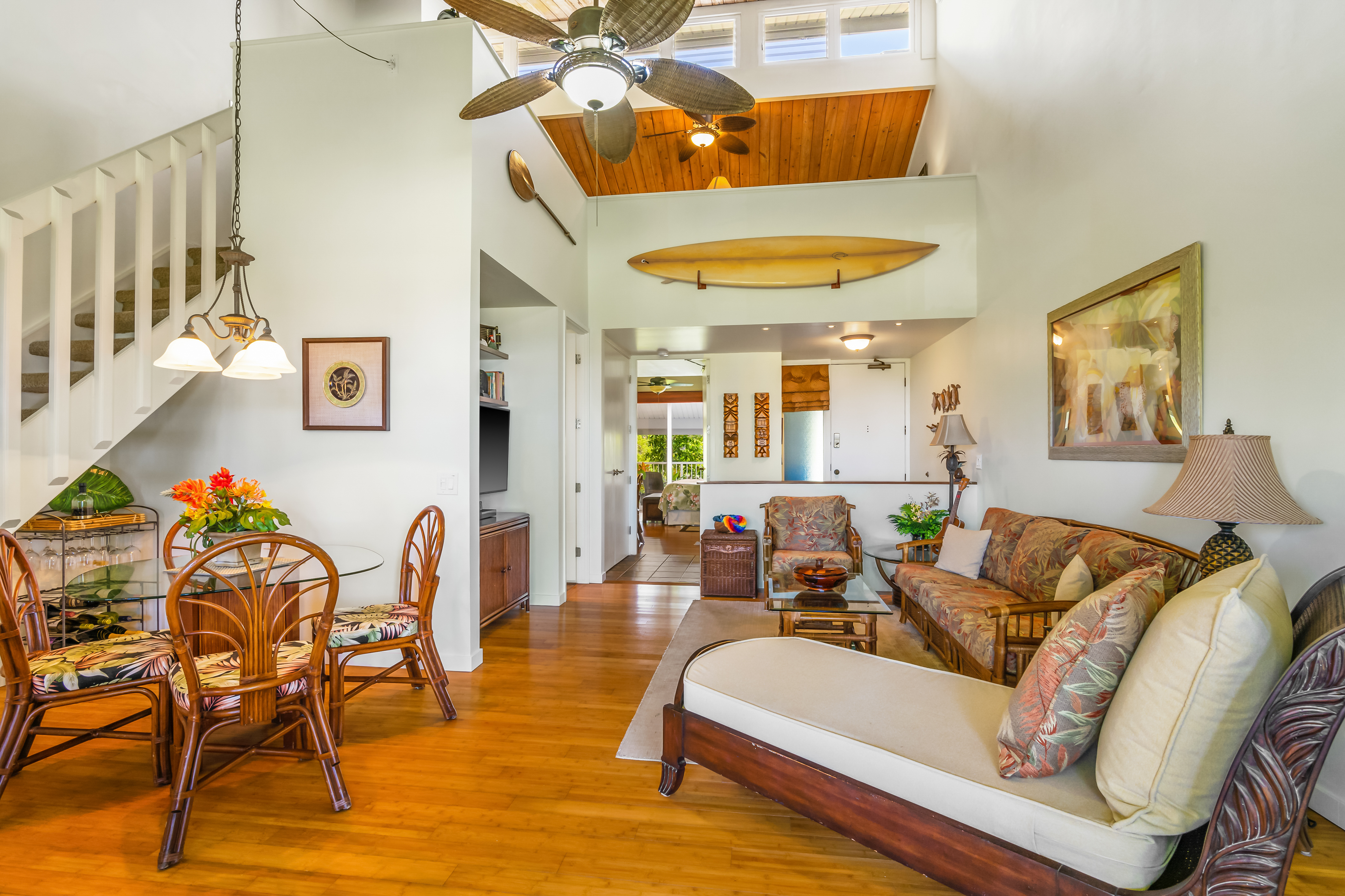Top-floor unit at The Cliffs at Princeville, with vaulted ceilings and two private lanais positioned to capture views and privacy. This well-cared-for 1-bedroom + loft lives comfortably as a two-bedroom, offering space and flexibility for both personal use and vacation rental. Tastefully updated and sold fully furnished, it’s ready for you or your guests to settle in and start enjoying right away.The interior features warm bamboo and tile flooring, a nicely updated kitchen with granite counters, newer appliances, and refreshed bathrooms with a walk-in shower. Soft, dimmable lighting throughout creates a relaxing ambiance in the evenings, while thoughtful touches—like custom-built storage areas—add everyday functionality.Positioned in a quieter section of the community, this unit offers a more private and peaceful setting.Active Vacation rental with a great history! At The Cliffs, you’ll enjoy a full range of resort-style amenities including a pool, fitness center, tennis courts, concierge services, and fun weekly offerings that make every stay feel like a getaway.