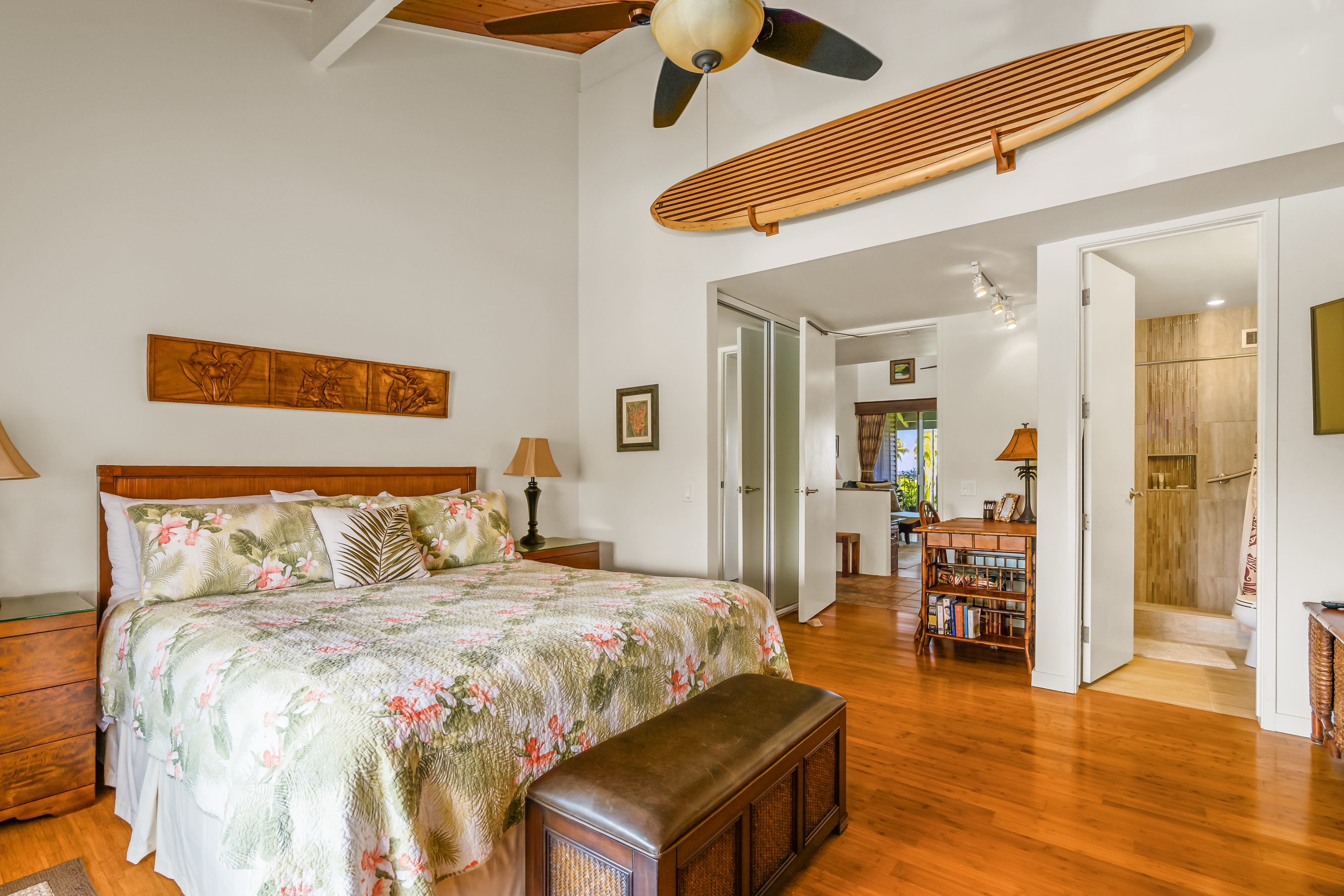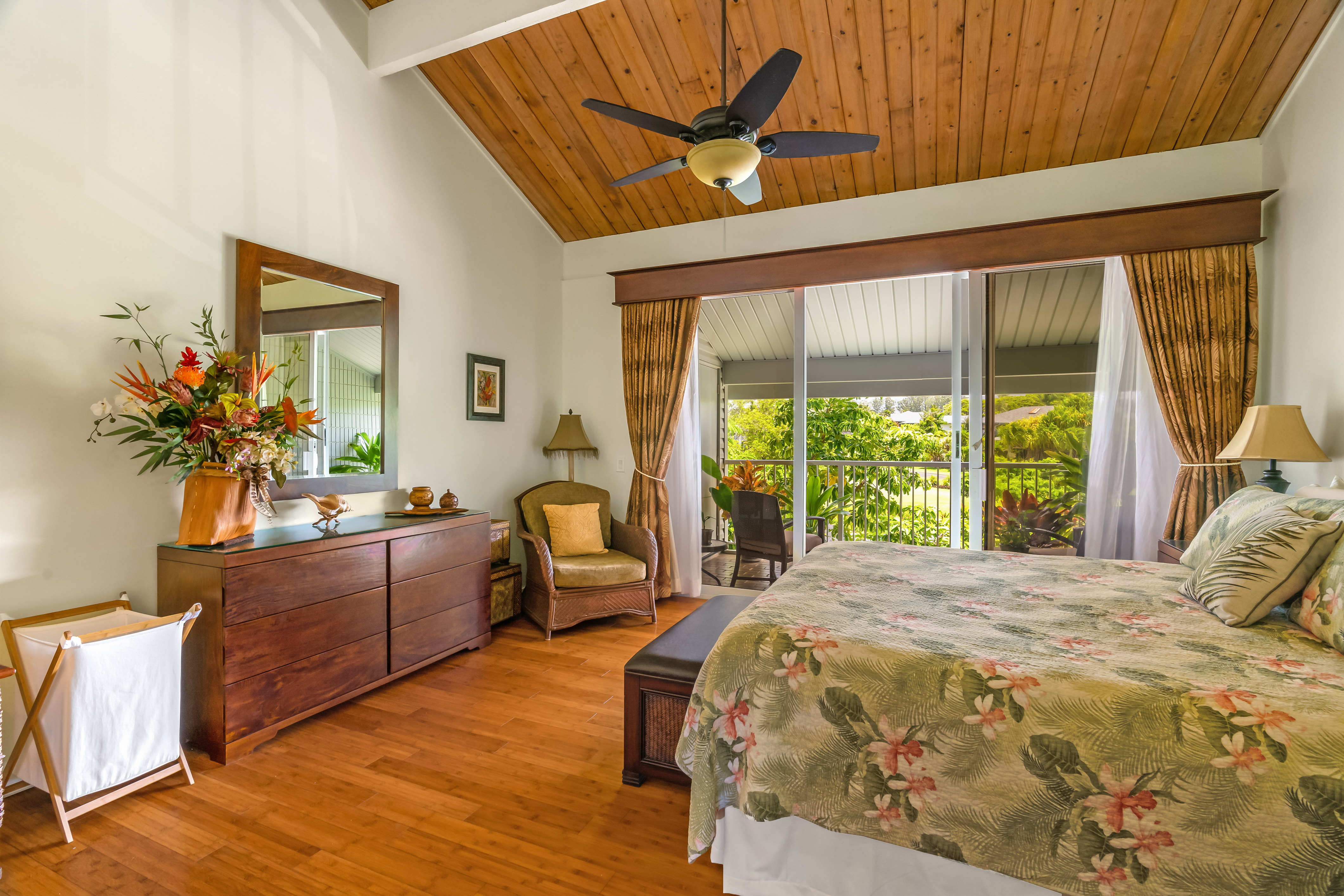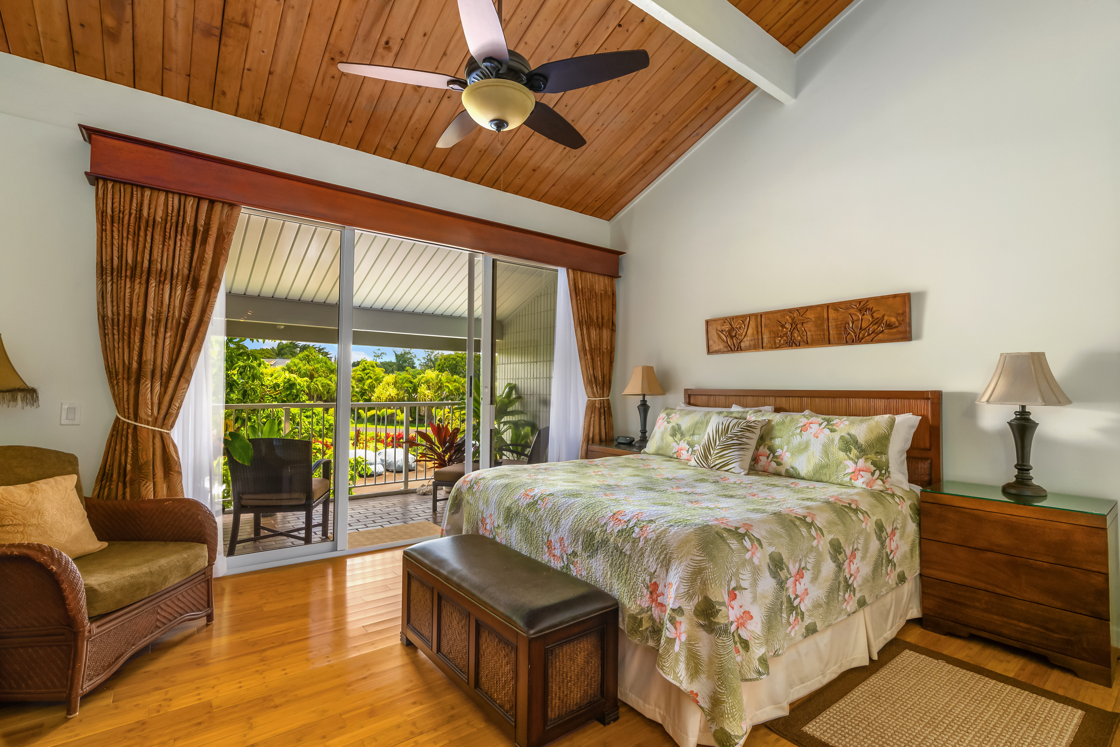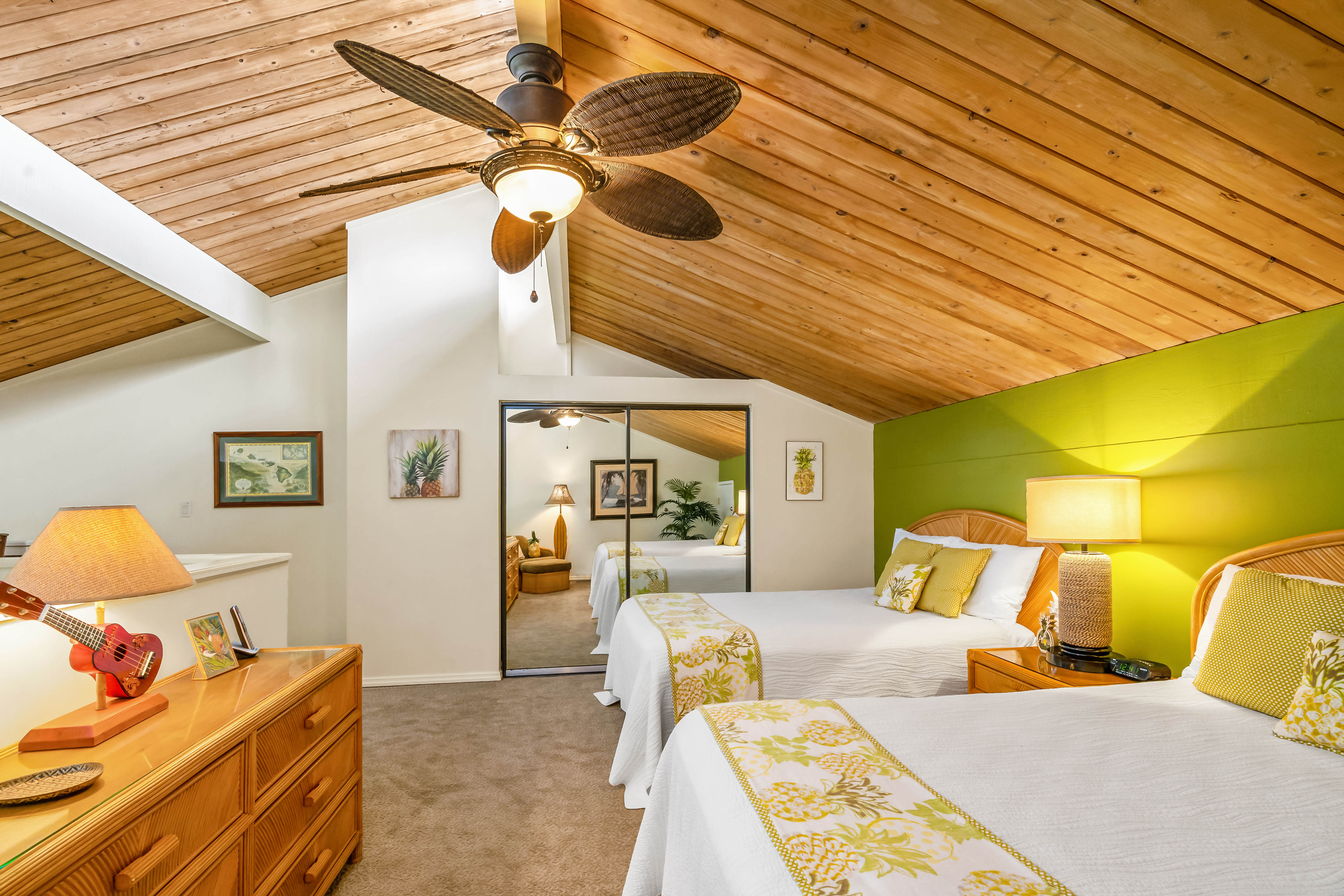 Top-floor unit at The Cliffs at Princeville, with vaulted ceilings and two private lanais positioned to capture views and privacy. This well-cared-for 1-bedroom + loft lives comfortably as a two-bedroom, offering space and flexibility for both personal use and vacation rental. Tastefully updated and sold fully furnished, it’s ready for you or your guests to settle in and start enjoying right away.The interior features warm bamboo and tile flooring, a nicely updated kitchen with granite counters, newer appliances, and refreshed bathrooms with a walk-in shower. Soft, dimmable lighting throughout creates a relaxing ambiance in the evenings, while thoughtful touches—like custom-built storage areas—add everyday functionality.Positioned in a quieter section of the community, this unit offers a more private and peaceful setting.Active Vacation rental with a great history! At The Cliffs, you’ll enjoy a full range of resort-style amenities including a pool, fitness center, tennis courts, concierge services, and fun weekly offerings that make every stay feel like a getaway.