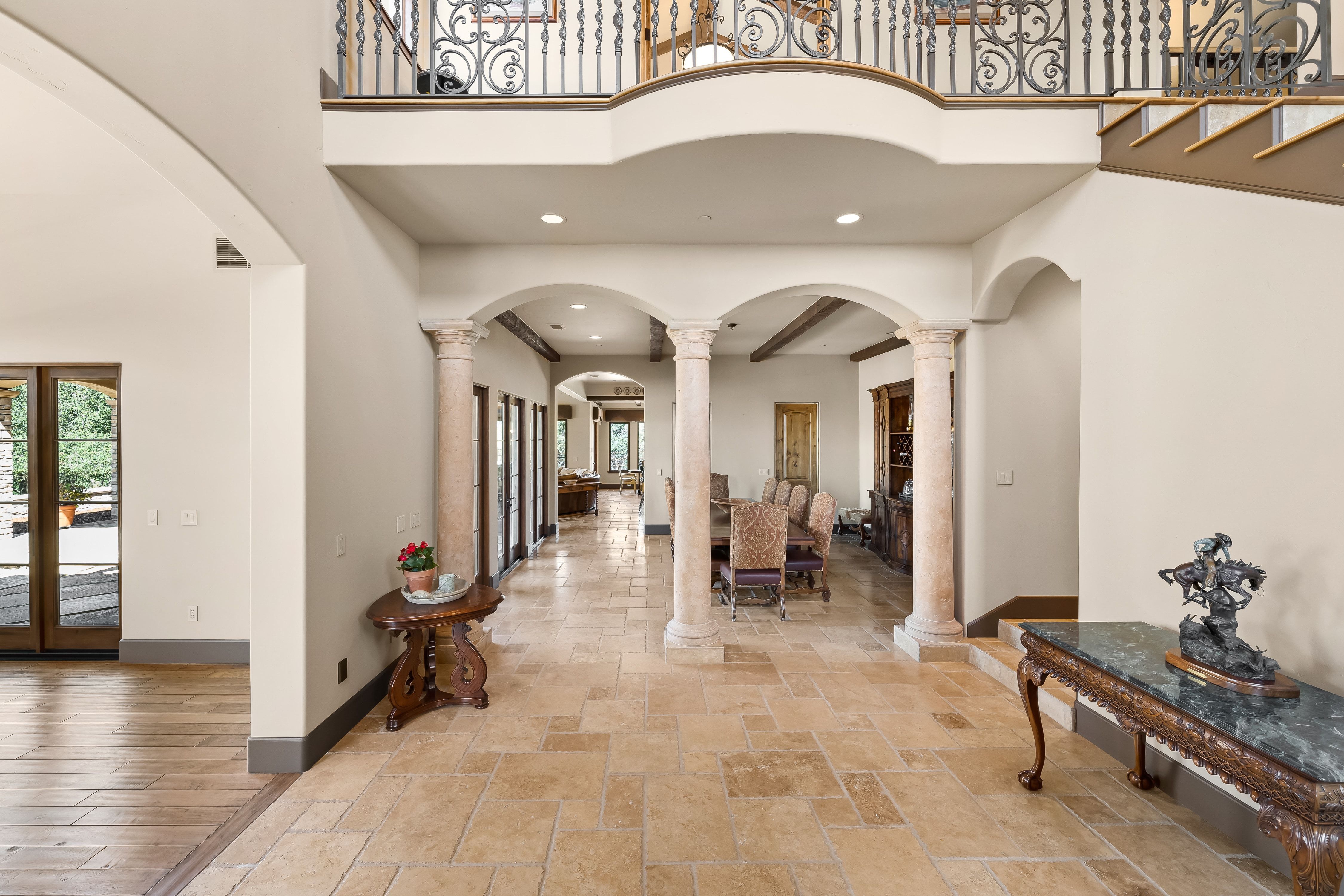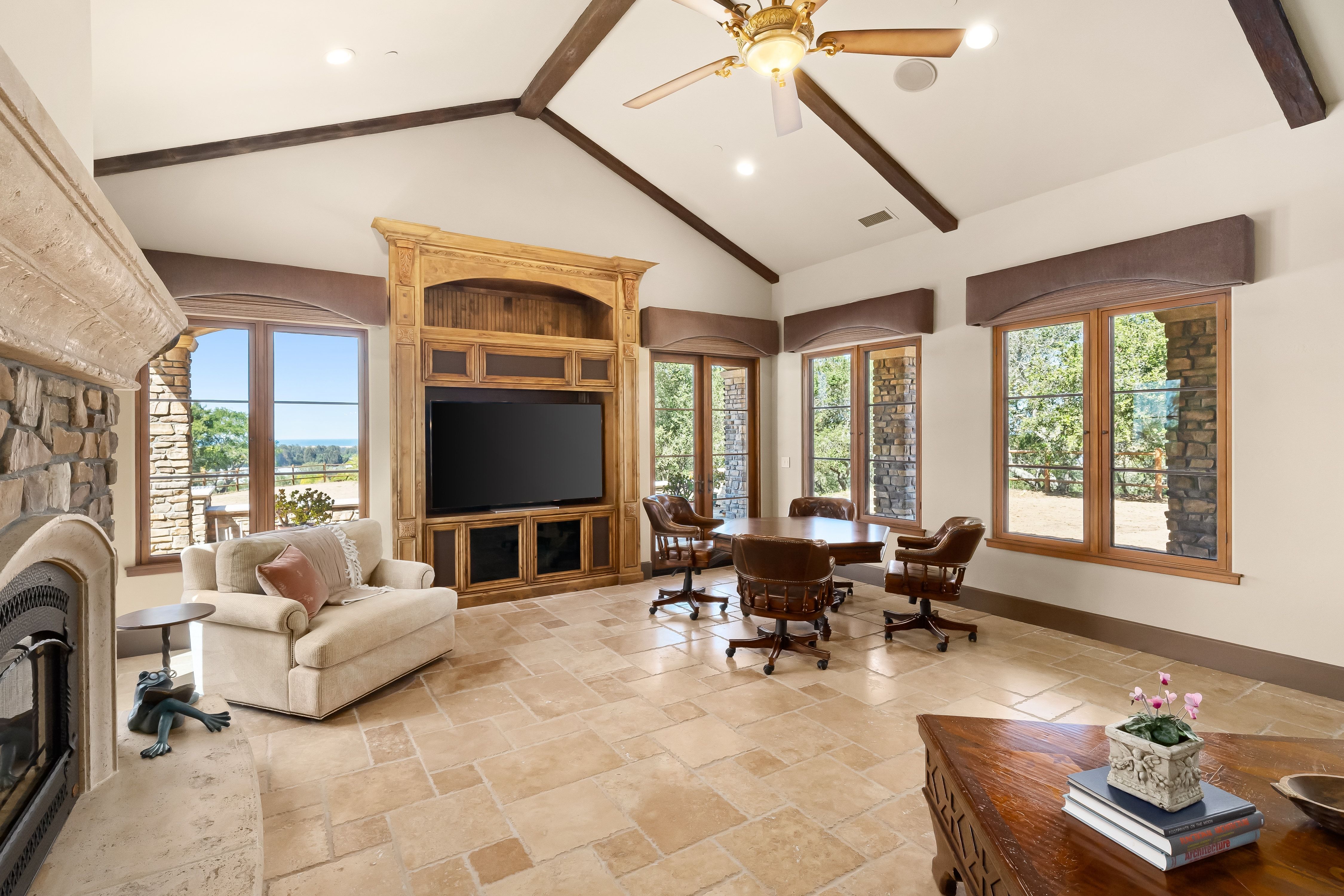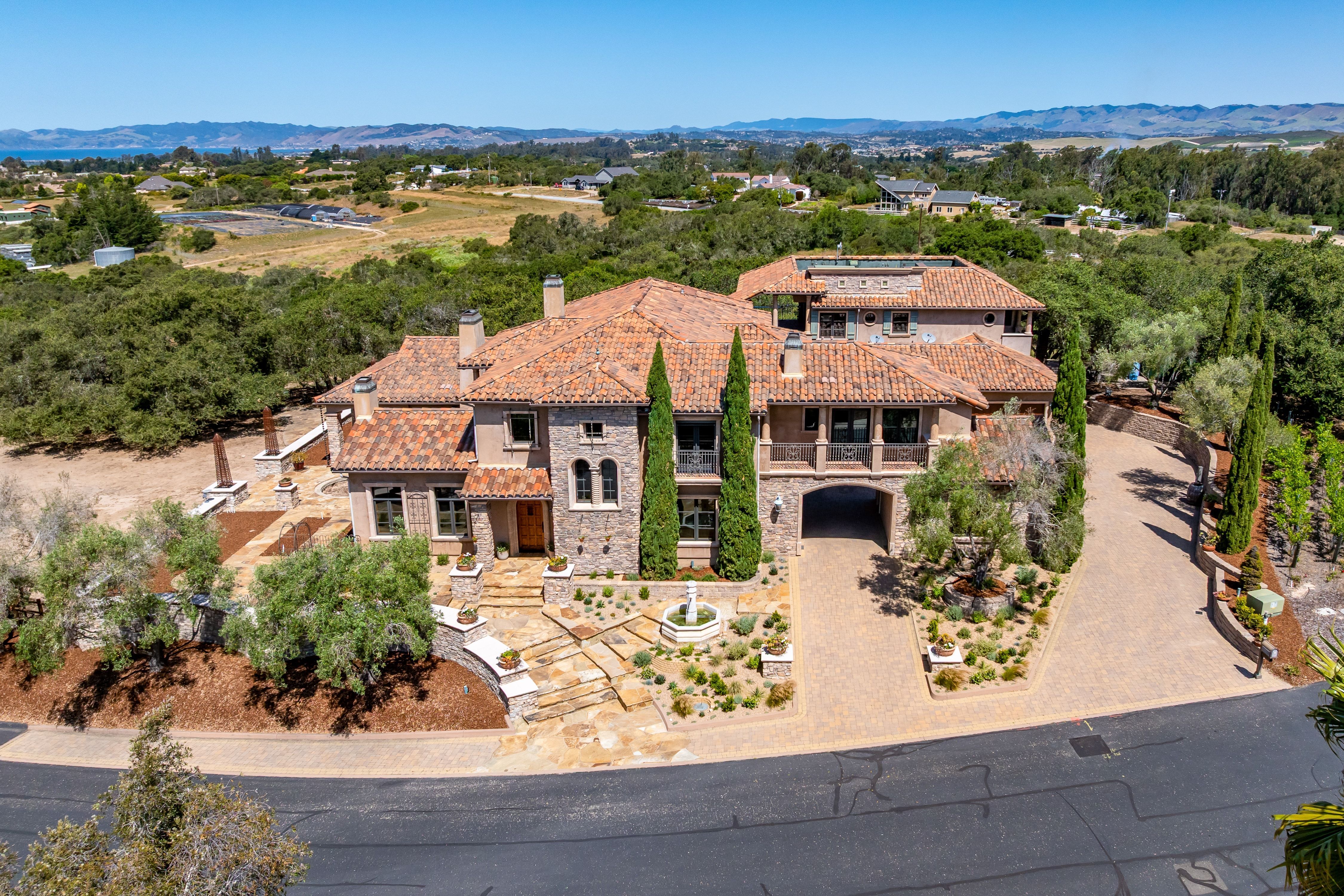 This extraordinary Tuscan-inspired estate offers a blend of refined craftsmanship, privacy, and sweeping ocean vistas. The main residence spans 6,218 sq ft with timeless architectural detail paired with modern luxury. The living room has elevated beamed ceilings, a stone fireplace, and walls of windows that bring in natural light while framing the ocean and coastal oaks. Mediterranean limestone flooring flows throughout the lower level, leading to a thoughtfully designed floor plan with a formal dining room, breakfast nook, and a gourmet kitchen. Outfitted with top-tier appliances—a Miele oven, built-in espresso machine, steam oven, and dishware warmer, along with a Sub-Zero refrigerator, dual freezers, and a Wolf cooktop—the kitchen is both elegant and highly functional. The main home offers four bedrooms, and in addition, there is a 371 sq ft casita with a studio bedroom, kitchenette, and bathroom, ideal for guests or extended family. The owner’s suite is a true retreat, complete with an ocean-view deck, spa-like en-suite bath with soaking tub, step-in shower, and access to an additional view deck. Adjacent to the suite is a dedicated exercise room featuring a built-in sauna, creating a serene wellness space. Designed for both relaxation and entertainment, the estate also includes a billiard room with a wet bar, a home theater, a refined library/study, and the convenience of an elevator connecting levels. In addition to the main home and casita, there is an attached yet fully private guest quarters offering 1,440 sq ft of living space with a granite fireplace with an iron mantle, a spacious bonus room, and a direct patio deck with more ocean views. A unique floor lift platform leads to a rooftop retreat, where panoramic views and stargazing opportunities await. Car enthusiasts and hobbyists will appreciate the expansive garage, complete with abundant storage and workshop area. An additional finished bay features polished floors and panoramic doors that open seamlessly to the outdoor living areas, blending indoor and outdoor entertaining. The grounds offer open spaces ready for a future pool. Follow the path through the oaks to a separate graded area at the back of the property with its own driveway access that provides an additional guest house, shop, or ADU. Located not far from the Village of Arroyo Grande, beaches, shopping, and all that the Central Coast has to offer. This one-of-a-kind estate delivers an unparalleled lifestyle of luxury, comfort, and multi-generational living.