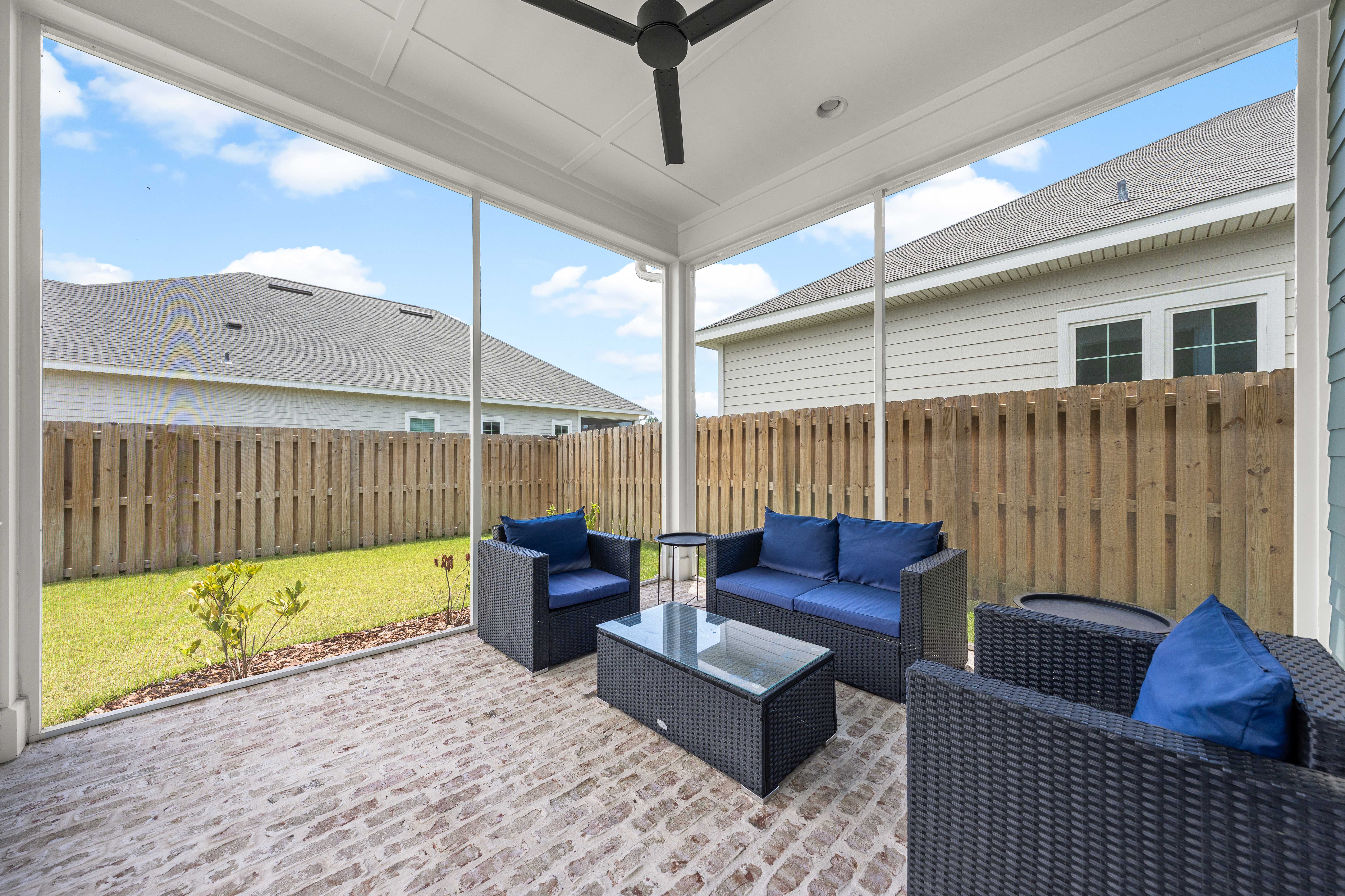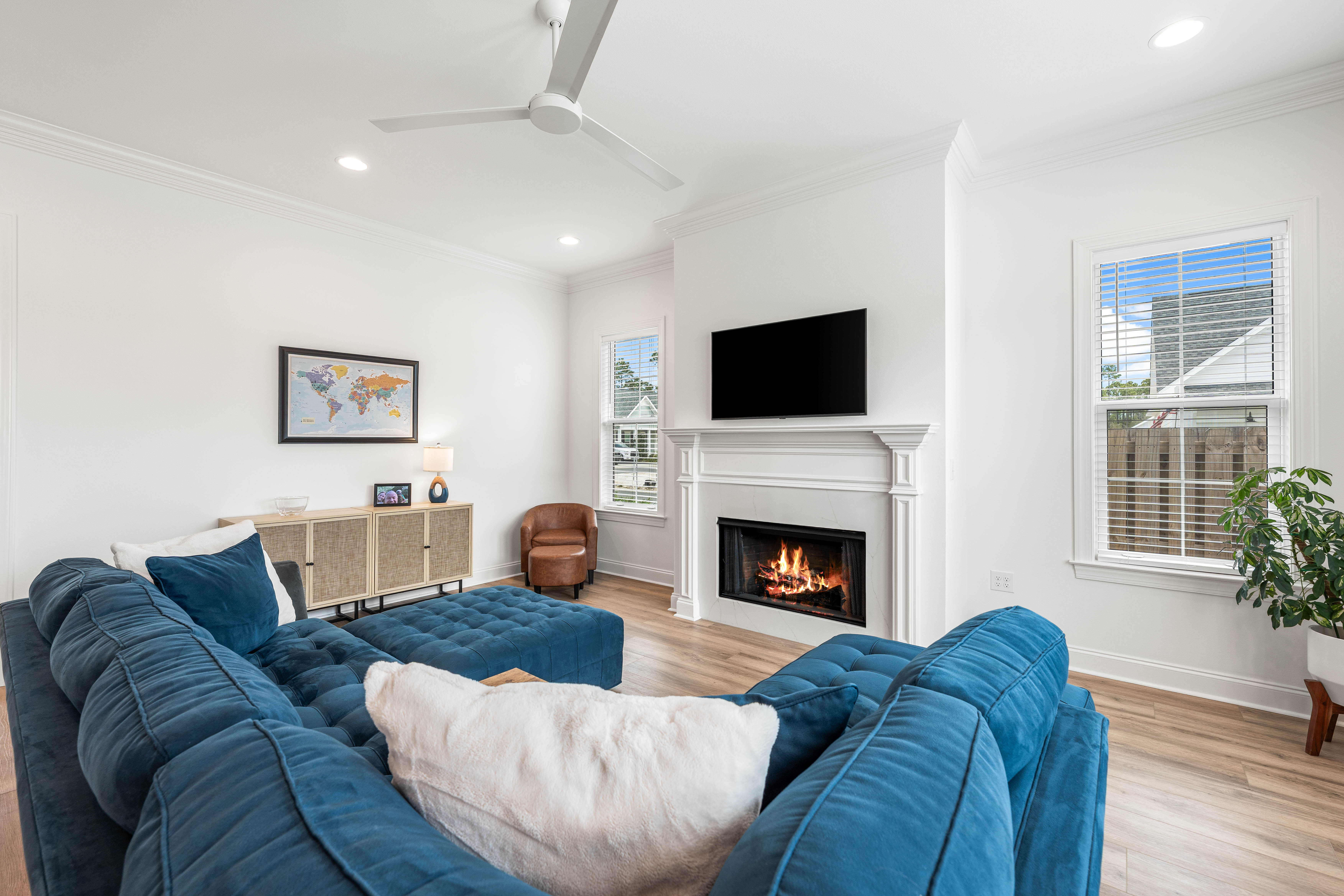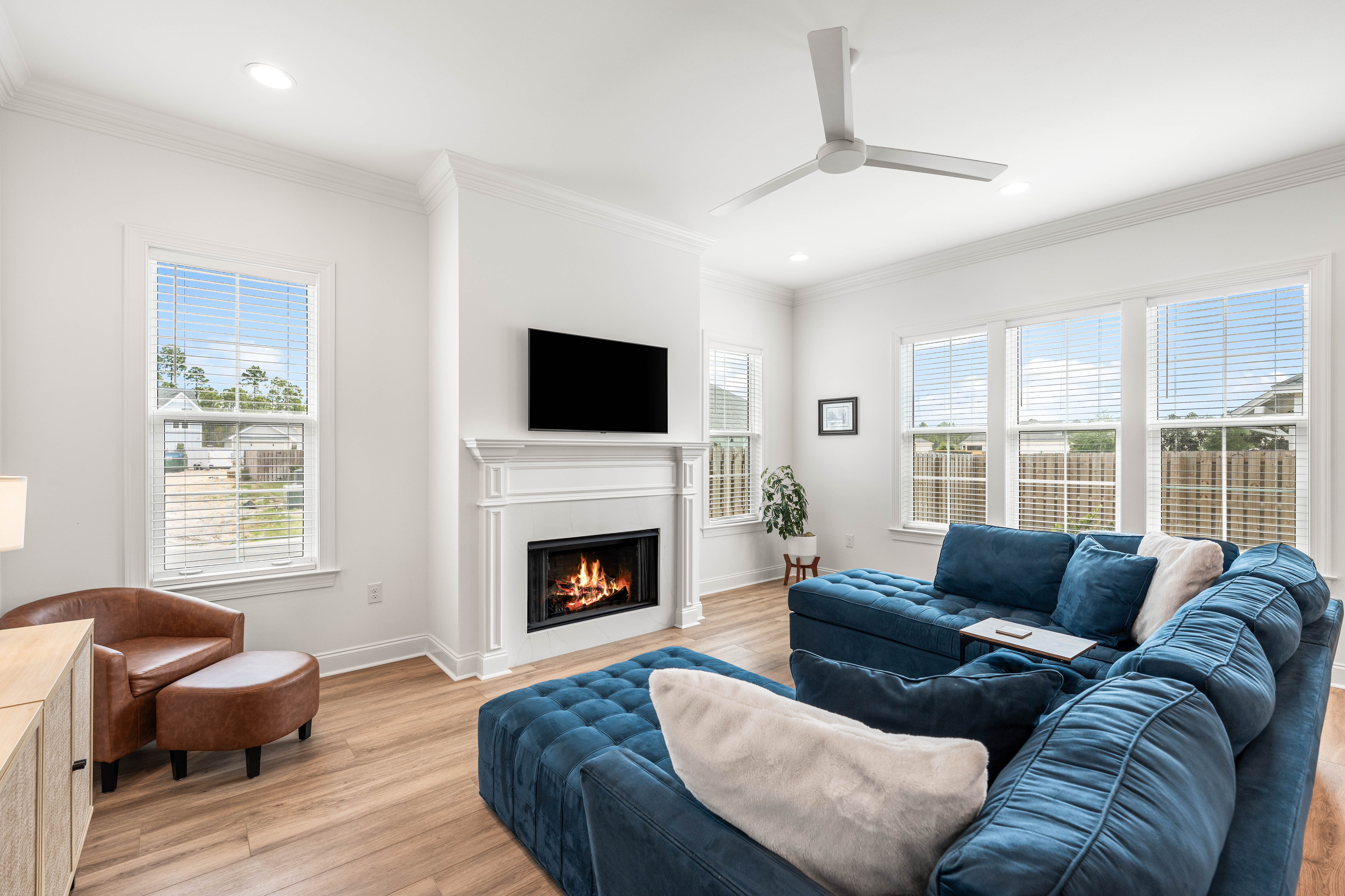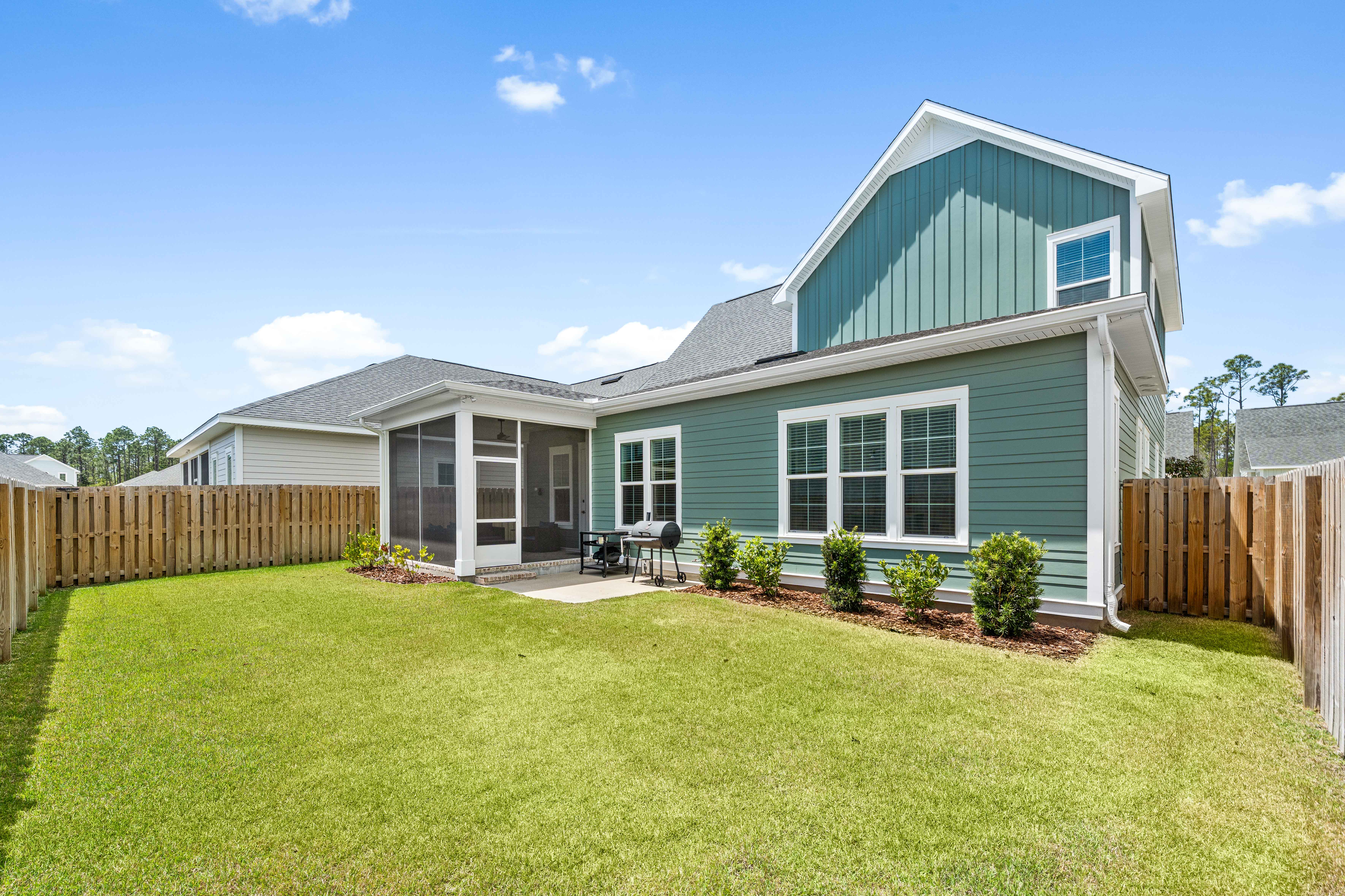 Positioned on a corner homesite, this newly constructed home includes four bedrooms, three full baths and one powder bath in the popular Watersound Origins community. This residence seamlessly blends traditional elements with contemporary features. The thoughtfully designed living space is centered around the custom fireplace and offers a harmonious blend of modern luxury and tranquil charm. The expansive open-concept layout is surrounded in natural light, thanks to ample windows throughout. The interconnected living, dining, and kitchen areas create an inviting space ideal for everyday living. The kitchen is equipped with stainless appliances including a 6-burner range, quartz countertops, and a spacious walk-in pantry. The screened porch is the perfect spot to read a book that overlooks the fenced backyard.The home’s design includes a primary suite on the first floor, featuring its own ensuite bathroom. There is also a powder bath, laundry, and custom-built locker area. Upstairs, there is a versatile flex space, perfect for a home office, media room, or play area. A junior primary suite with ensuite, two guest bedrooms, and a full bath are also on the second floor. Situated on a quiet street, this home provides peaceful living in a desirable area. This like new home perfectly balances elegance and convenience, making it a must-see for those interested in the Watersound Origins neighborhood.Watersound Origins offers residents the perfect blend of natural beauty and modern amenities. Surrounded by towering pines and Lake Powell, the community is only two miles from the vibrant beaches of Scenic Highway 30A. The Village Commons serves as the neighborhood hub, featuring a resort-style pool, fitness center, pickleball and tennis courts, and an event lawn. Residents enjoy access to the highly rated Origins Golf Course, scenic walking and biking trails, Lake Powell, and an upcoming Art Park. Additionally, the Watersound Town Center at the entrance to the community offers dining, shopping, a Publix grocery store, medical facilities, and more.