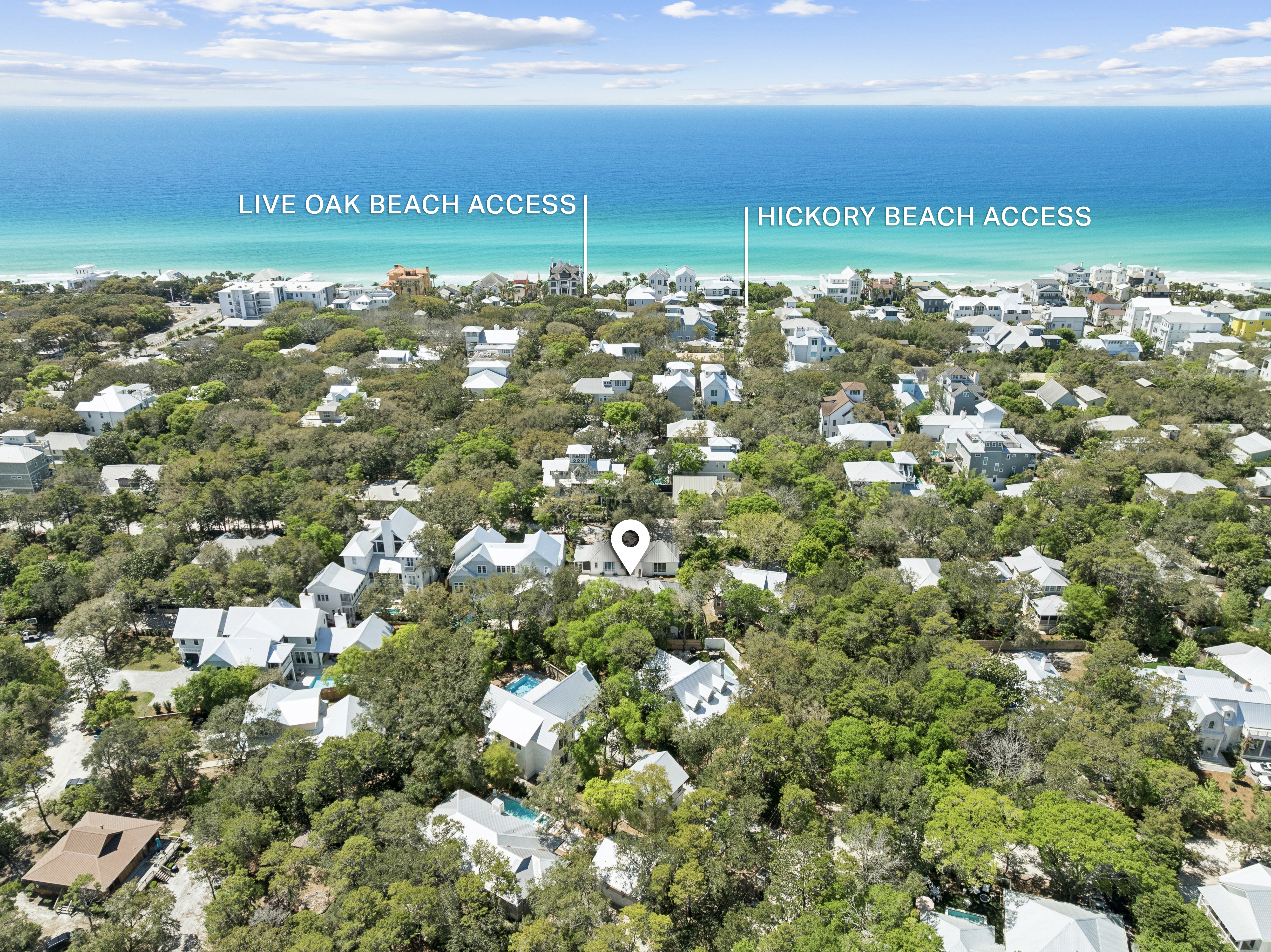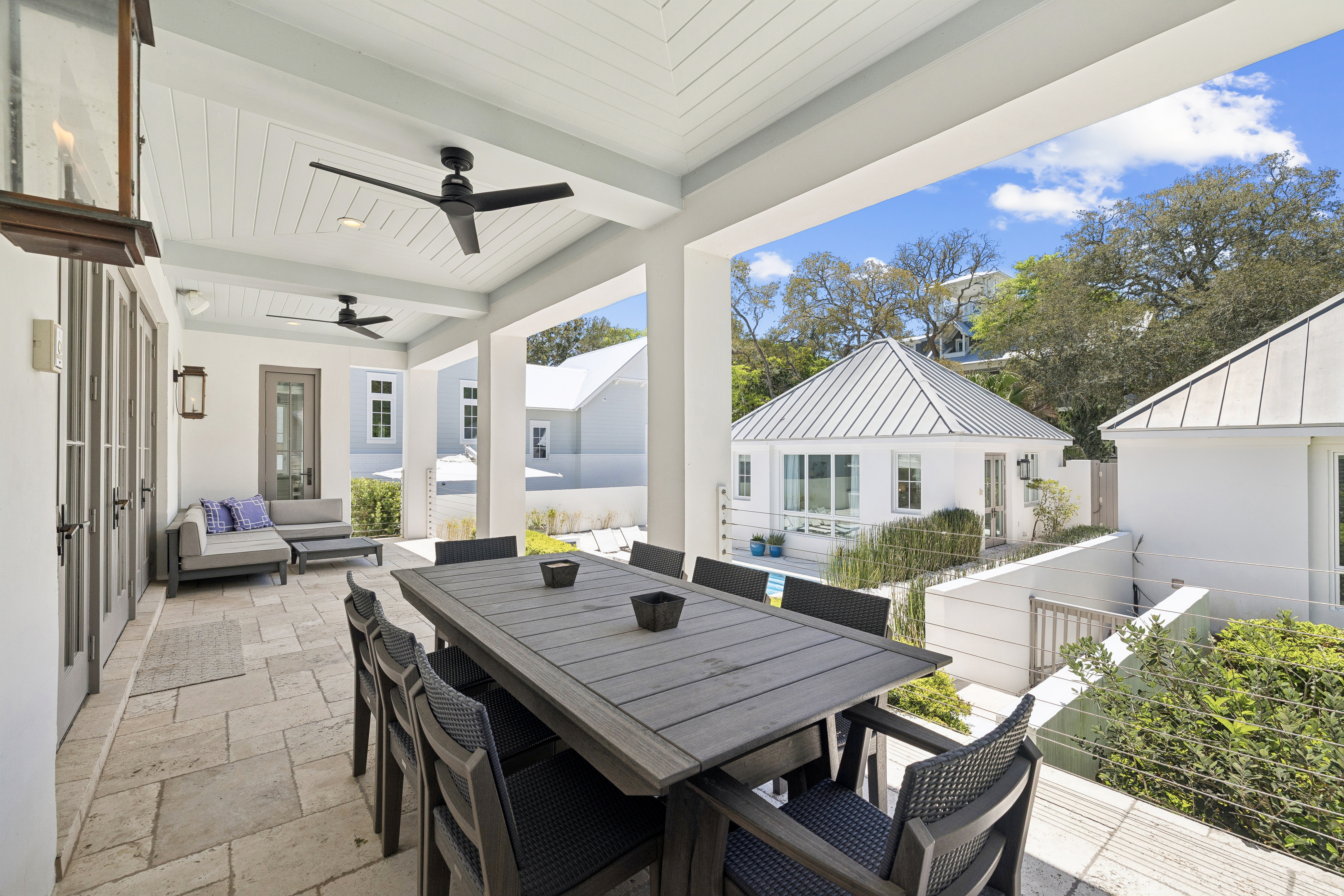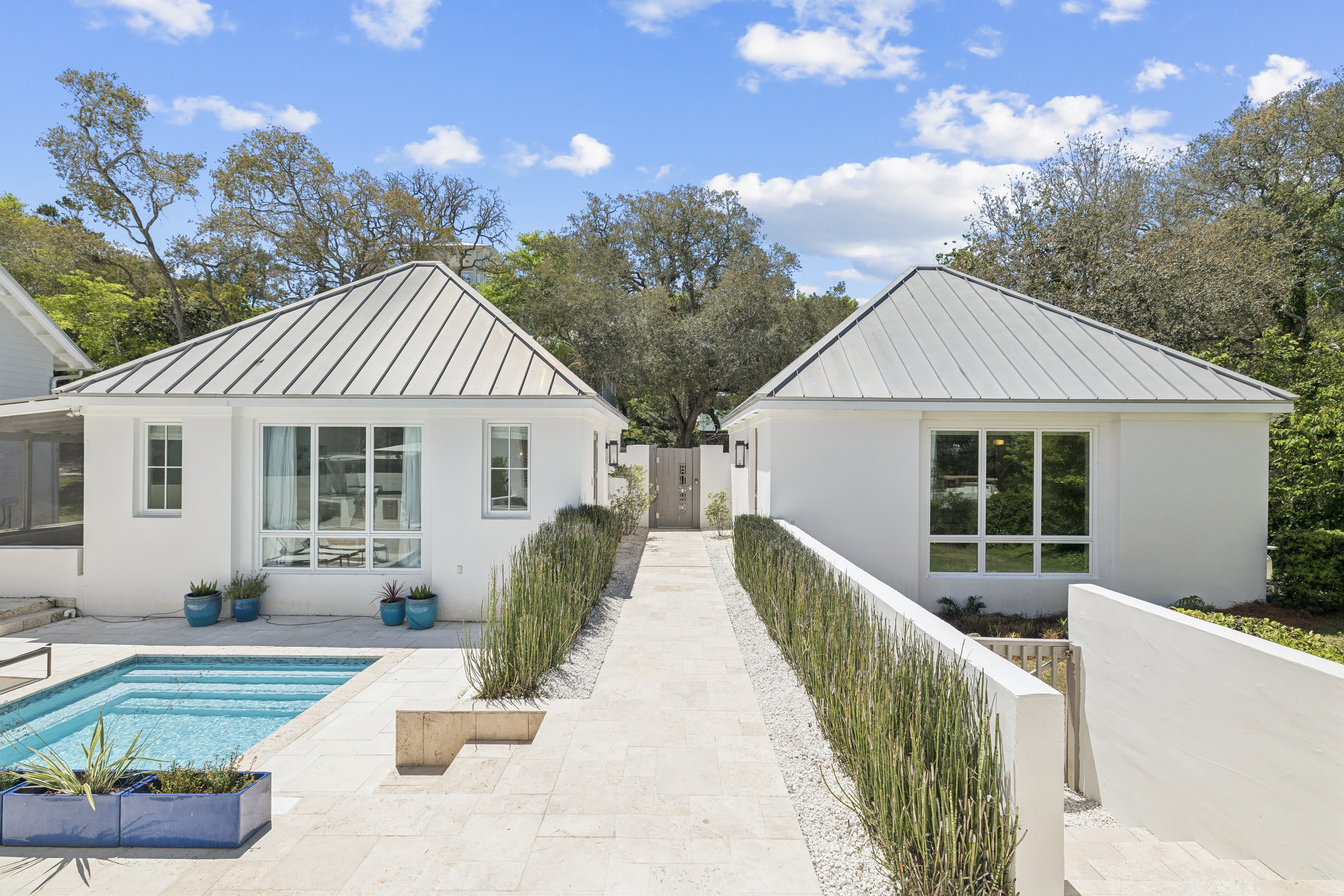Located in the heart of Old Seagrove, this private beachside compound offers upscale coastal living just steps from the sand and from Seaside and Watercolor. This thoughtfully designed and gated property features a main residence, carriage house, and a beautiful courtyard with a resort-style pool. The interior living space is anchored by a finely appointed chef's kitchen complete with custom cabinetry, waterfall countertop, and stainless steel Thermador appliances, including a 48-inch gas range. Wide-plank oak wood flooring, custom millwork, and designer lighting extend throughout the home, while the open living area centers on a gas fireplace and is filled with natural light, creating a warm and inviting atmosphere. The main level includes three spacious king suites, each with a spa-inspired bathroom featuring marble flooring and a glass walk-in shower. The lower level offers a second living and game area, a bunk room with queen-over-queen beds, and two additional bedrooms for added flexibility. Overlooking the pool, the ground level carriage house includes a rare full kitchen, bright living space, dining area, and king suite, ideal for guests seeking a more secluded retreat. With six bedrooms, six bathrooms, no HOA, and an unbeatable private location near dining, shopping, and beach access, this property is an exceptional opportunity to own a luxury home along 30A.