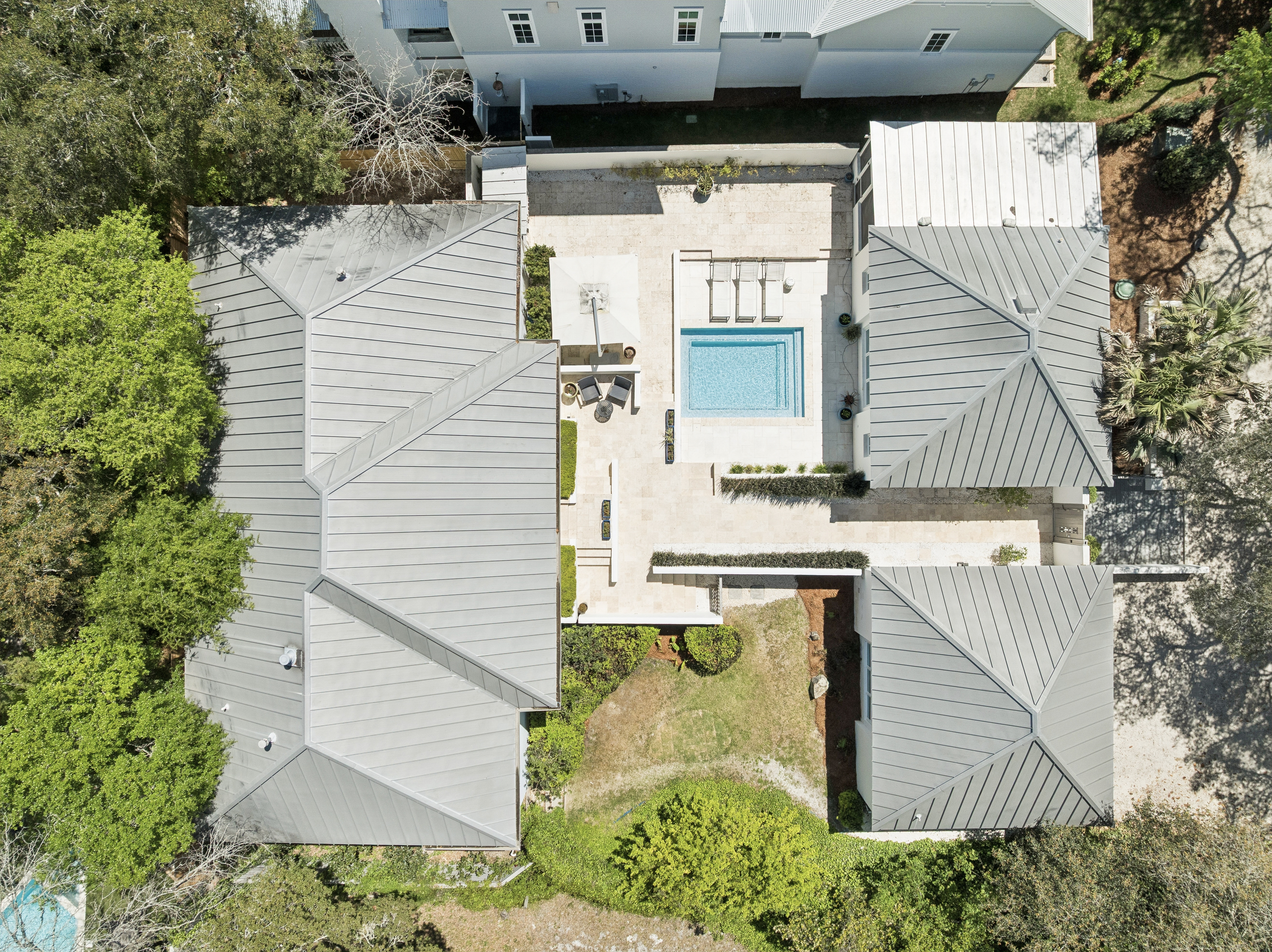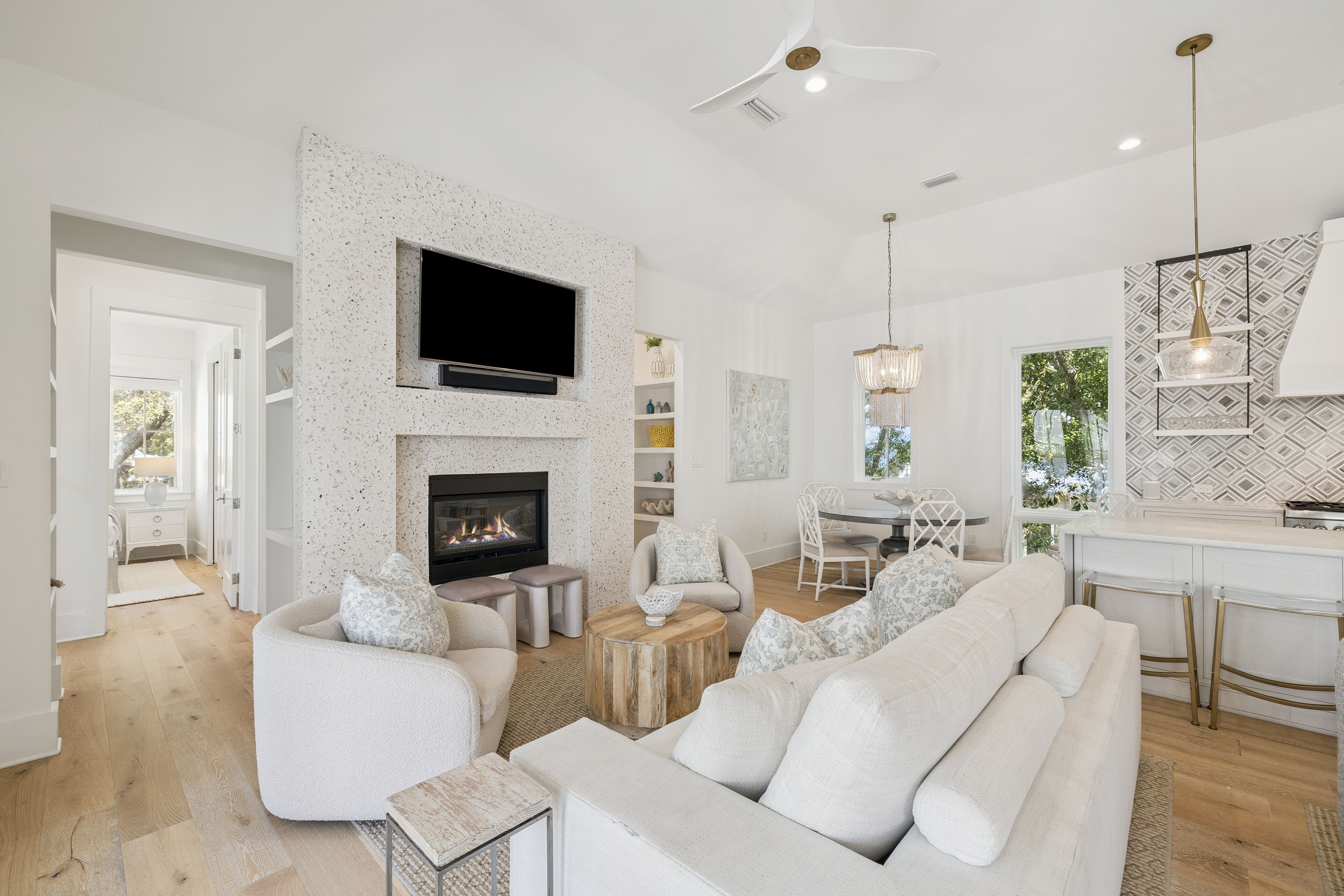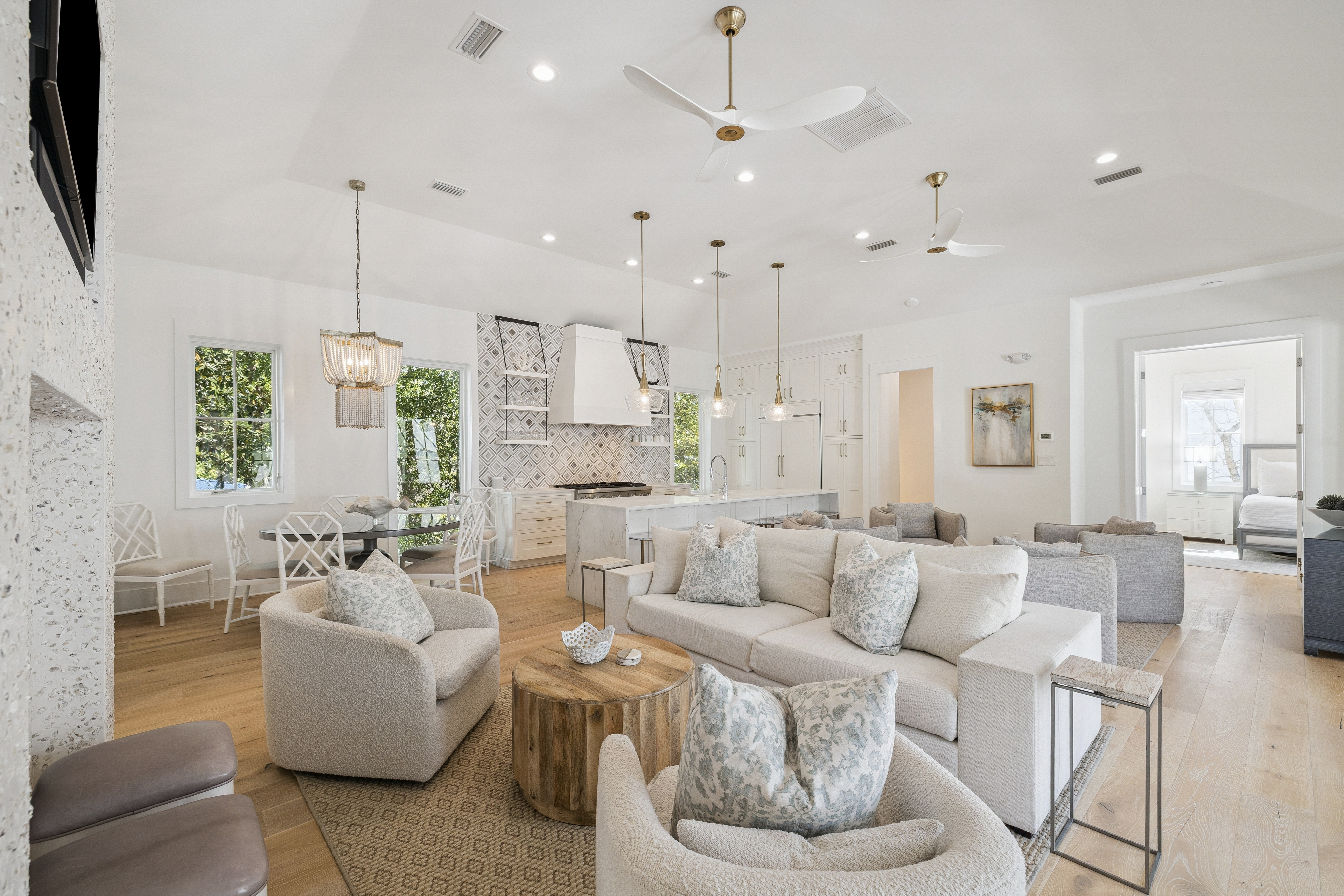 Located in the heart of Old Seagrove, this private beachside compound offers upscale coastal living just steps from the sand and from Seaside and Watercolor. This thoughtfully designed and gated property features a main residence, carriage house, and a beautiful courtyard with a resort-style pool. The interior living space is anchored by a finely appointed chef's kitchen complete with custom cabinetry, waterfall countertop, and stainless steel Thermador appliances, including a 48-inch gas range. Wide-plank oak wood flooring, custom millwork, and designer lighting extend throughout the home, while the open living area centers on a gas fireplace and is filled with natural light, creating a warm and inviting atmosphere. The main level includes three spacious king suites, each with a spa-inspired bathroom featuring marble flooring and a glass walk-in shower. The lower level offers a second living and game area, a bunk room with queen-over-queen beds, and two additional bedrooms for added flexibility. Overlooking the pool, the ground level carriage house includes a rare full kitchen, bright living space, dining area, and king suite, ideal for guests seeking a more secluded retreat. With six bedrooms, six bathrooms, no HOA, and an unbeatable private location near dining, shopping, and beach access, this property is an exceptional opportunity to own a luxury home along 30A.