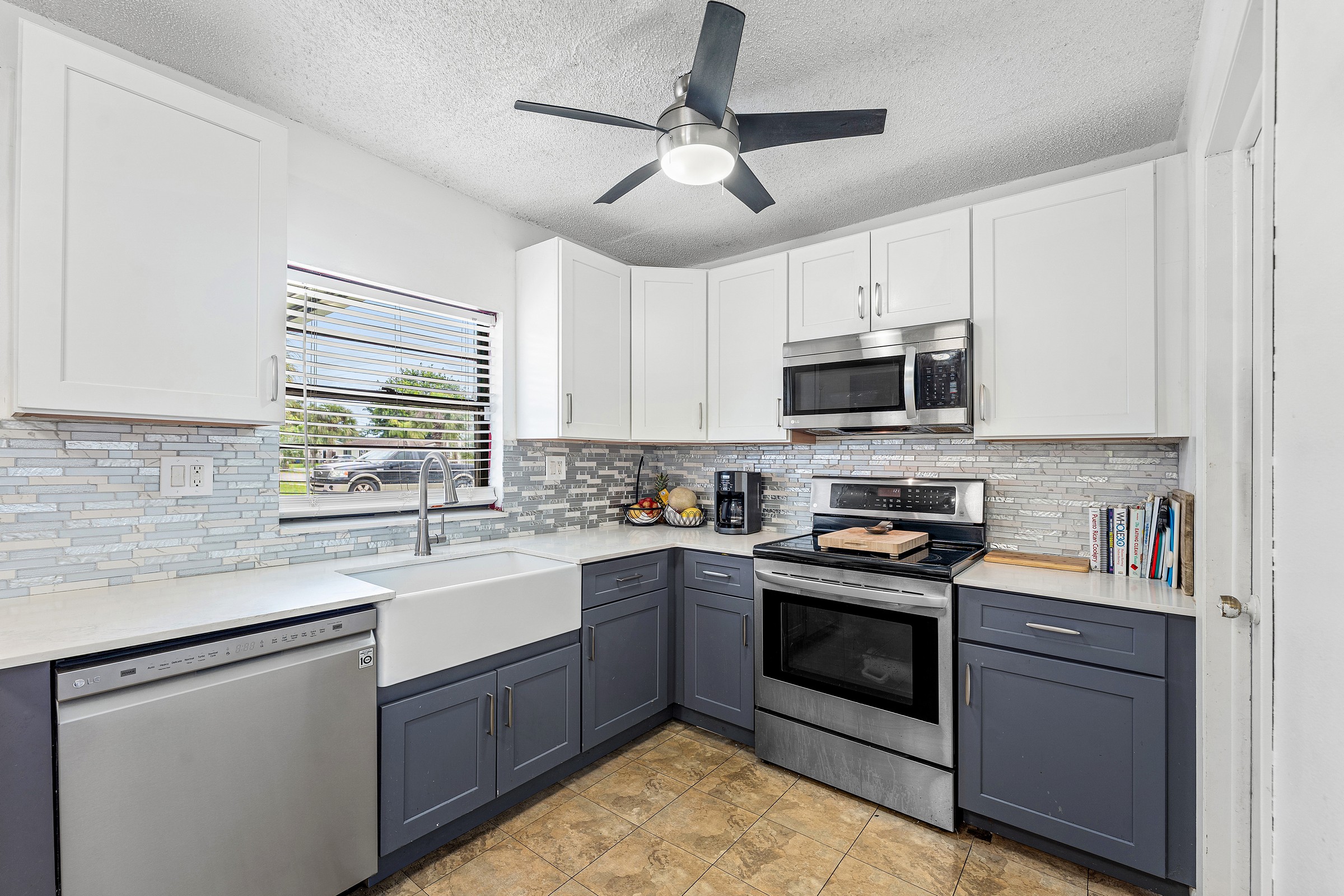 From the moment you pull into the oversized paver driveway, this 4-bedroom, 2-bathroom North Lauderdale pool home just feels right. Whether you're a first-time buyer ready to stop renting or a growing family looking for room to breathe, this one checks all the boxes. The kitchen has been thoughtfully updated with two-tone navy and white shaker cabinetry, a farmhouse sink, mosaic tile backsplash, quartz countertops, and stainless steel appliances ..the kind of kitchen that makes cooking feel like a pleasure. Natural light flows through the window over the sink and a ceiling fan keeps things comfortable year-round. The backyard is where this home truly shines. A sparkling kidney-shaped pool is framed by swaying palms and a generous patio — your own private South Florida retreat.