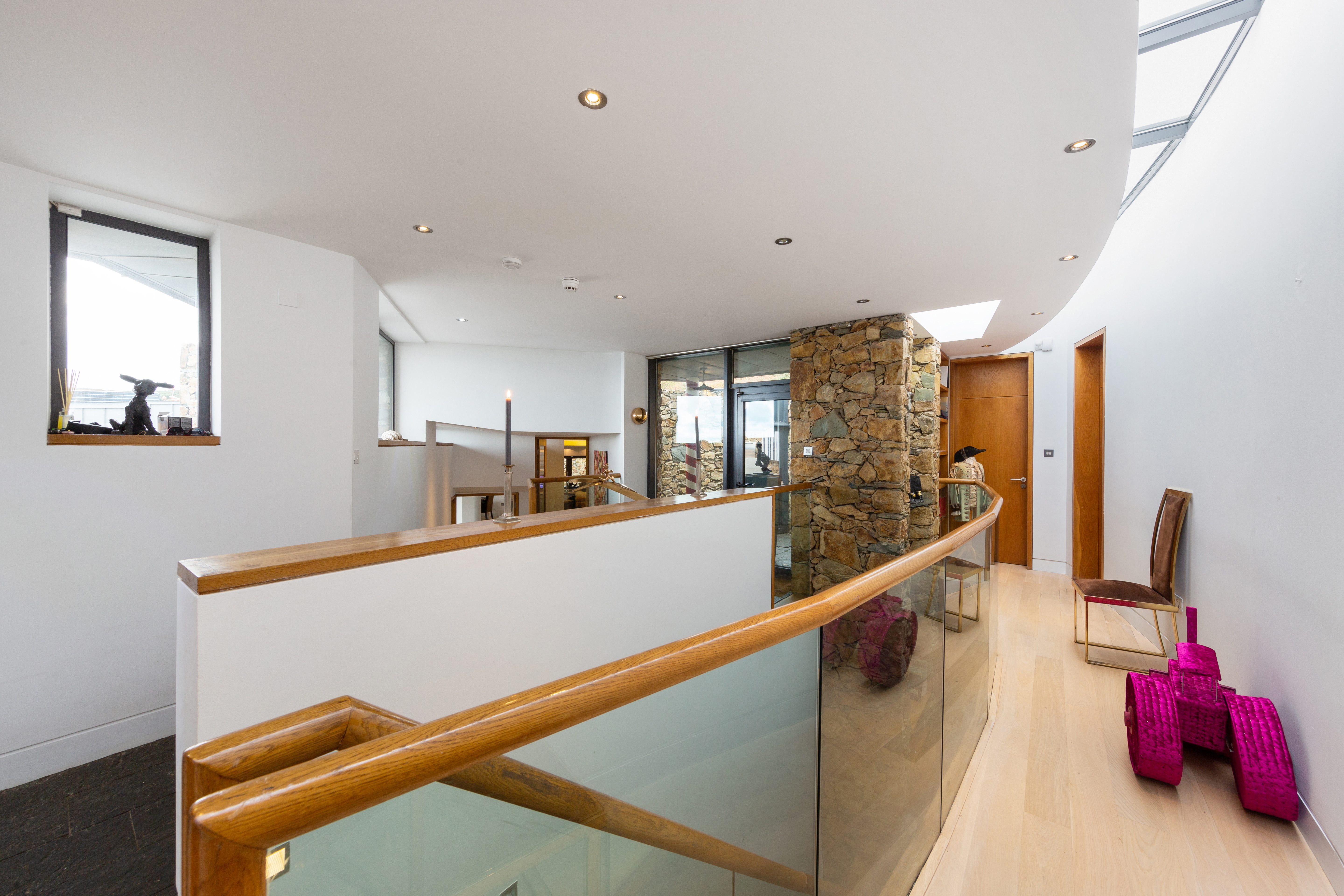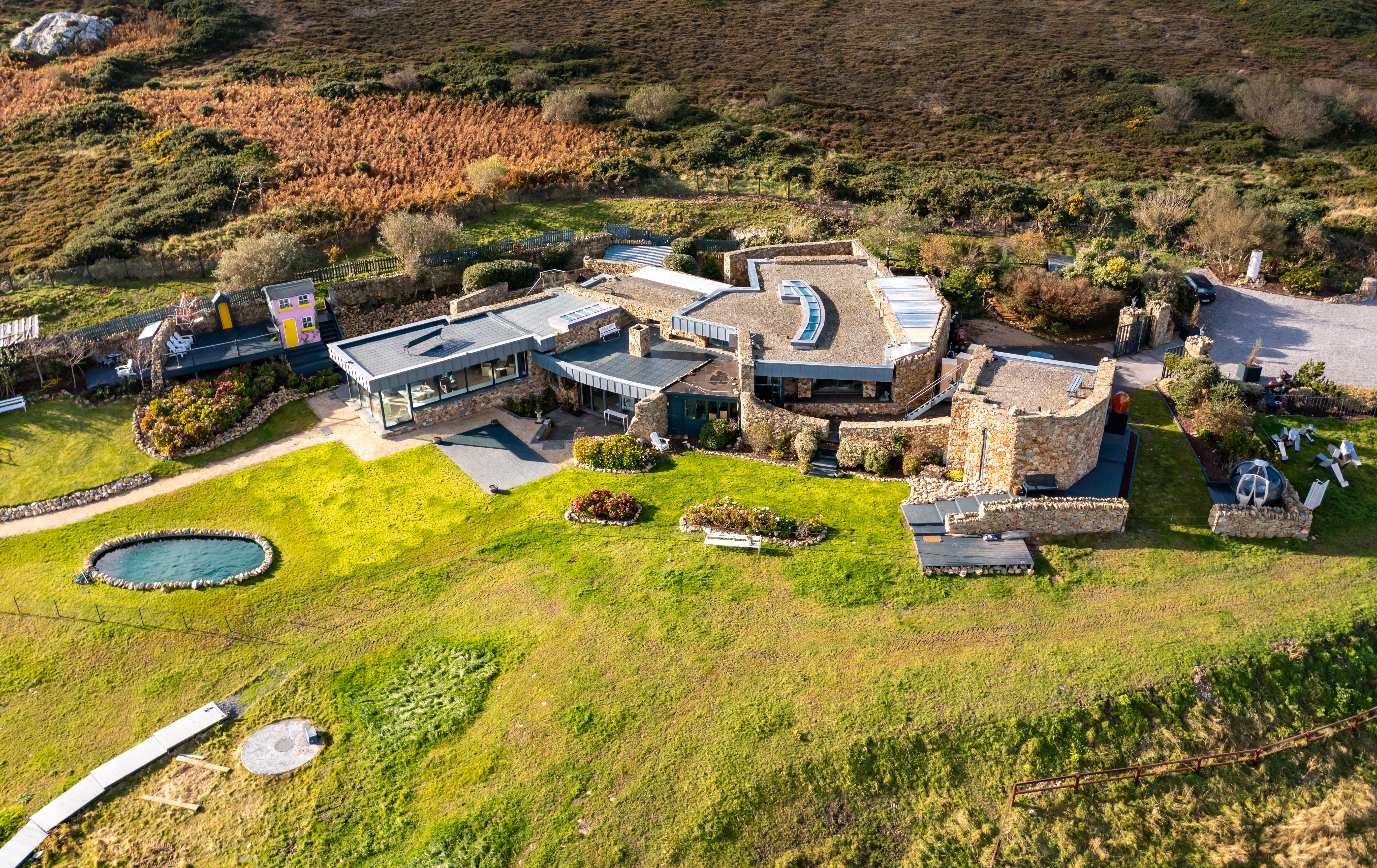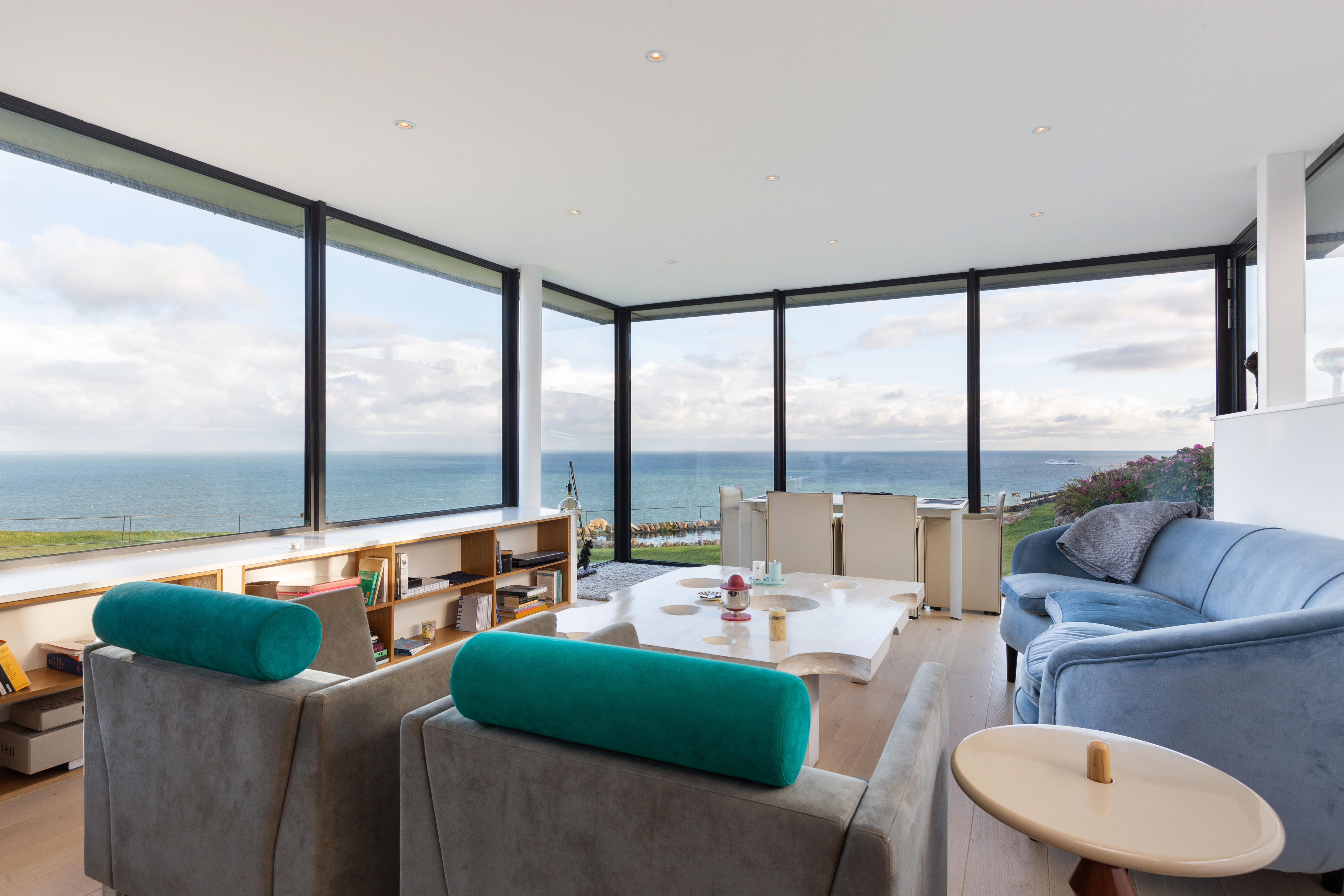 Heather Cottage is the last word in discretion. The property was imbued with a sense of place by its creator, the internationally renowned architect Andrzej Wejchert of AD Wejchert and Partners. Heather Cottage is located 30 minutes to Dublin city centre and 20 minutes to the airport. The restaurants and facilities of Howth village are just a short walk away. At one with its private setting on the Hill of Howth, Heather Cottage offers an unrivalled, front-row view of Ireland’s Eye, Lambay Island, and the Irish Sea beyond. The structure itself pays homage to its surroundings through the use of local materials. Clad in Howth Stone, an indigenous ochre-colored sandstone, the exterior walls blend seamlessly into the landscape. The roof is covered in sustainable, corrosion-resistant zinc, and offers two roof terraces from which to take in the breath-taking coastal panorama.