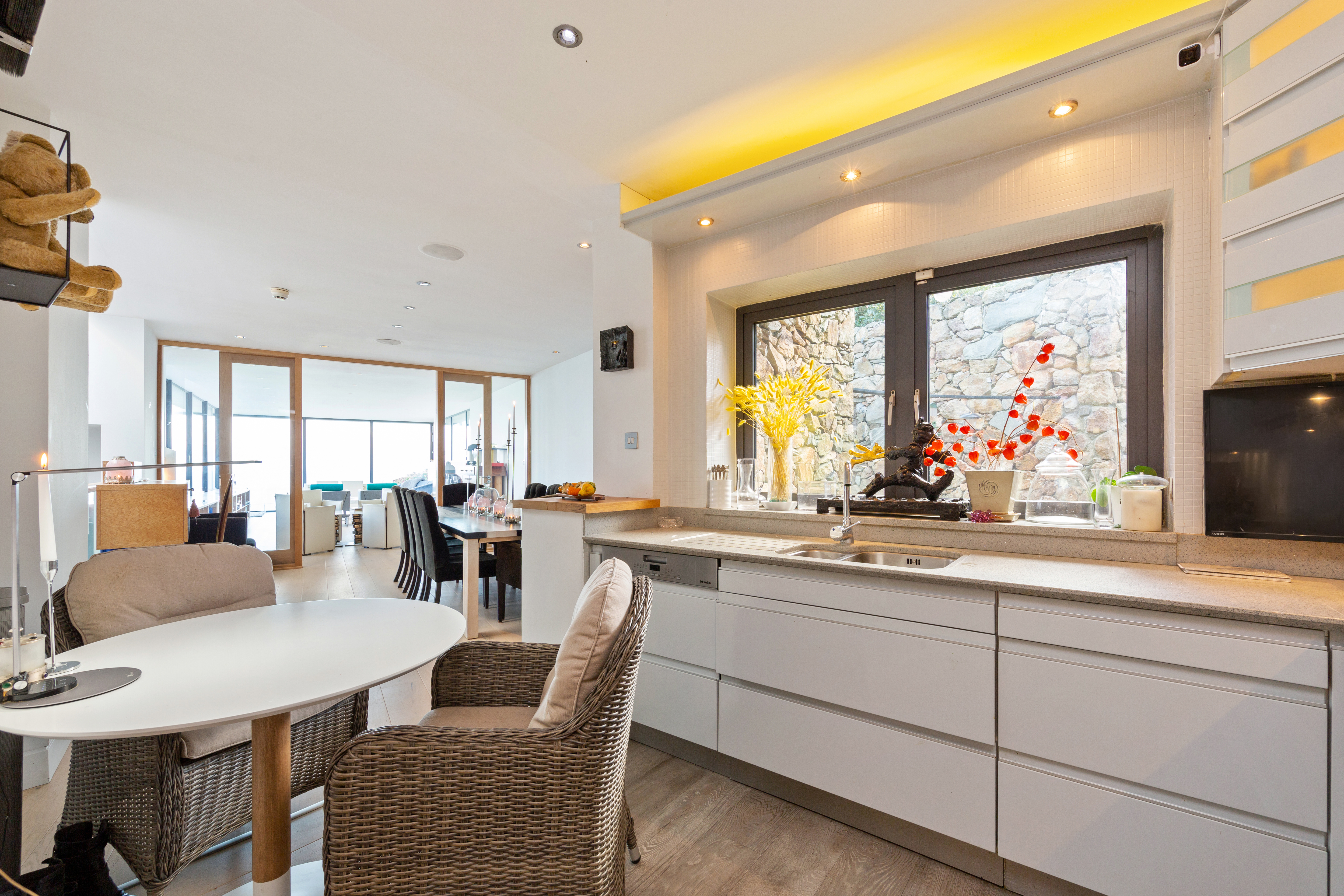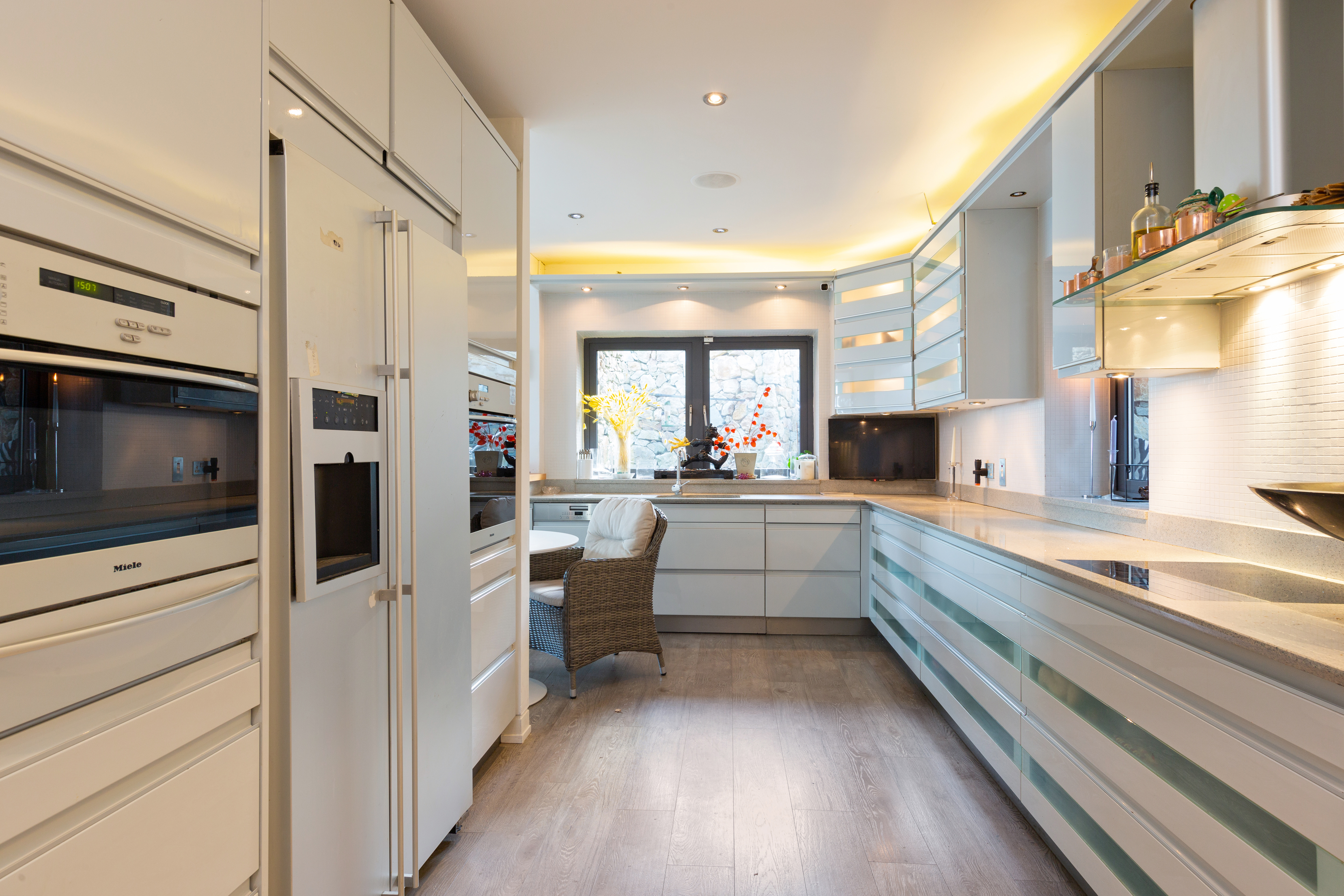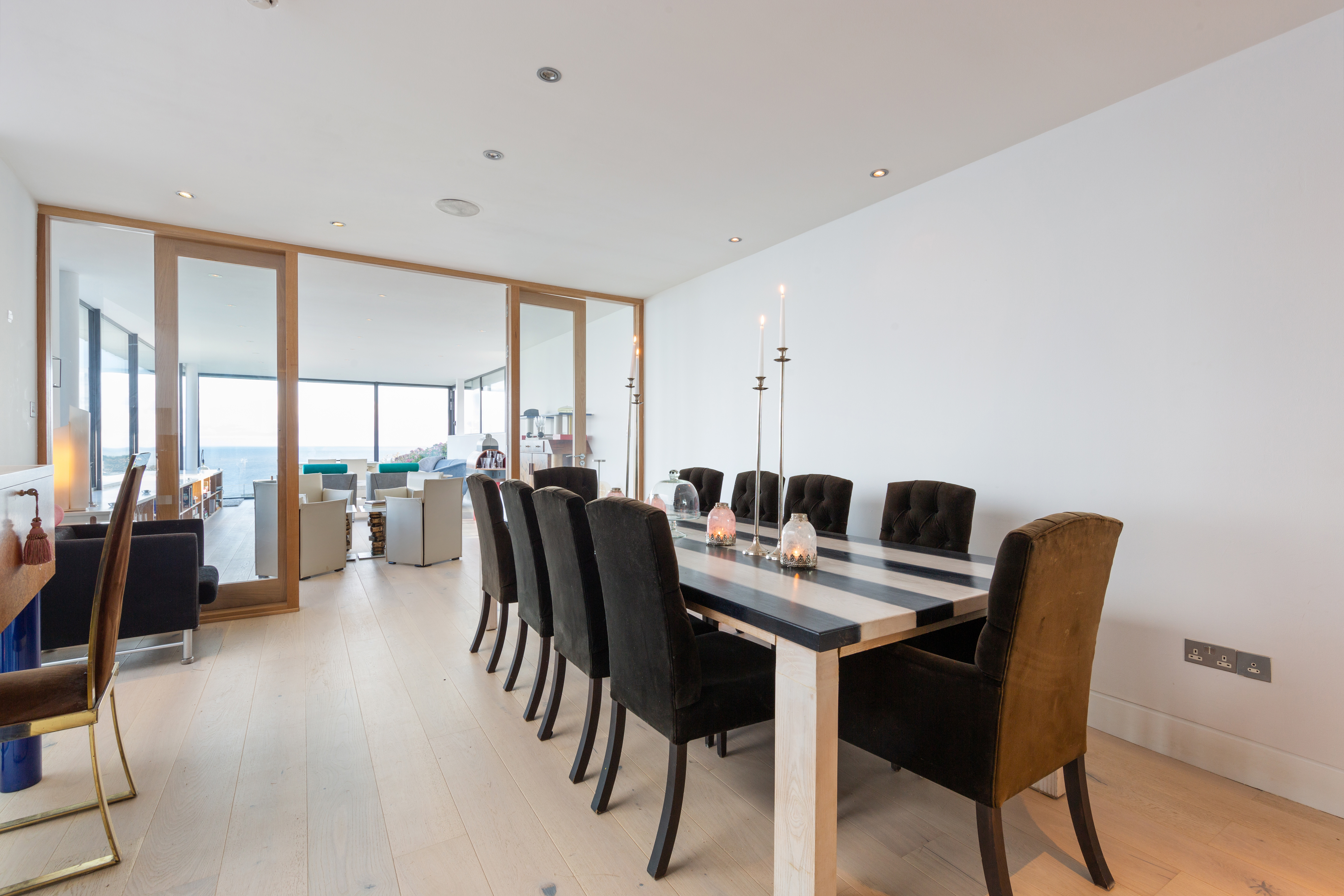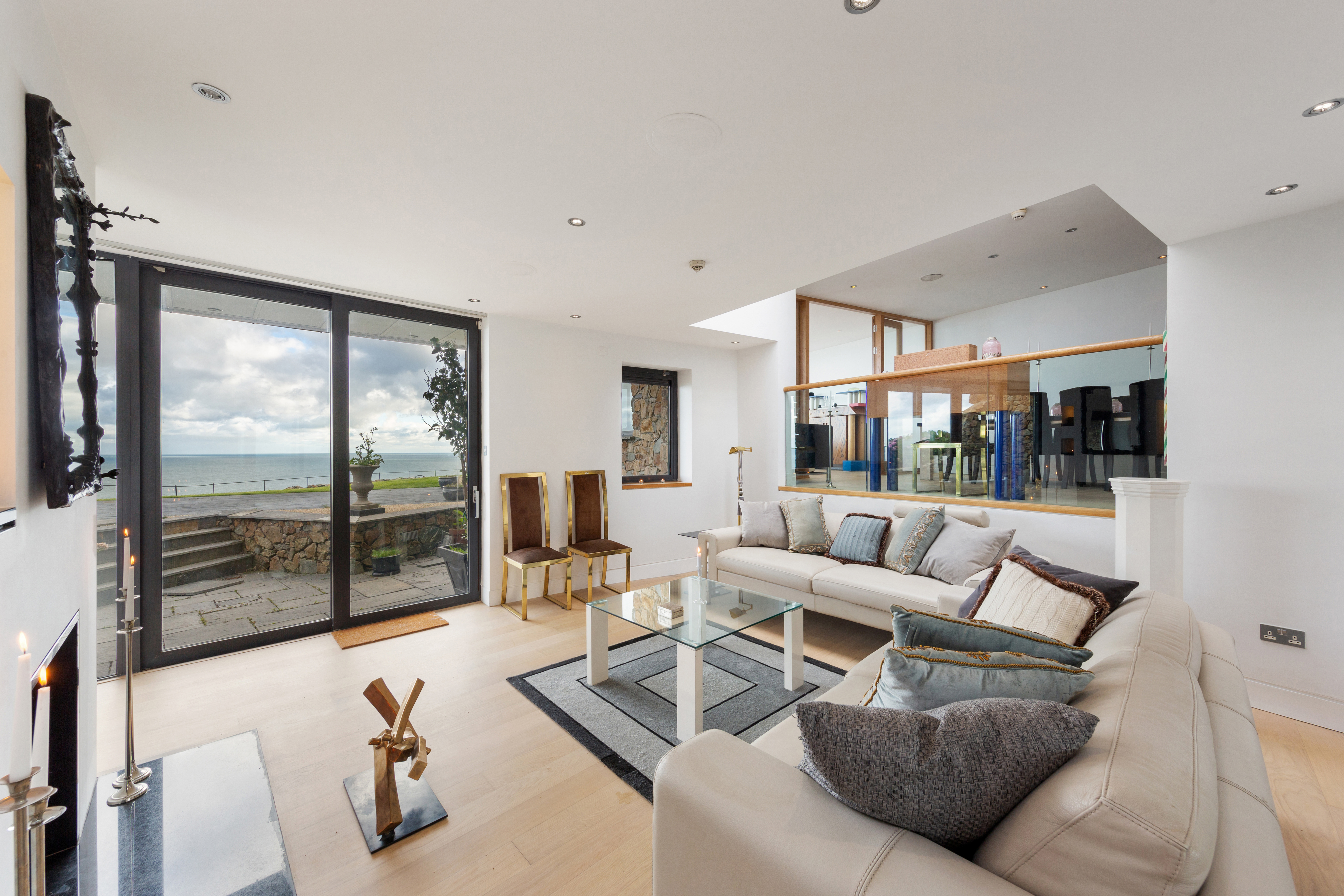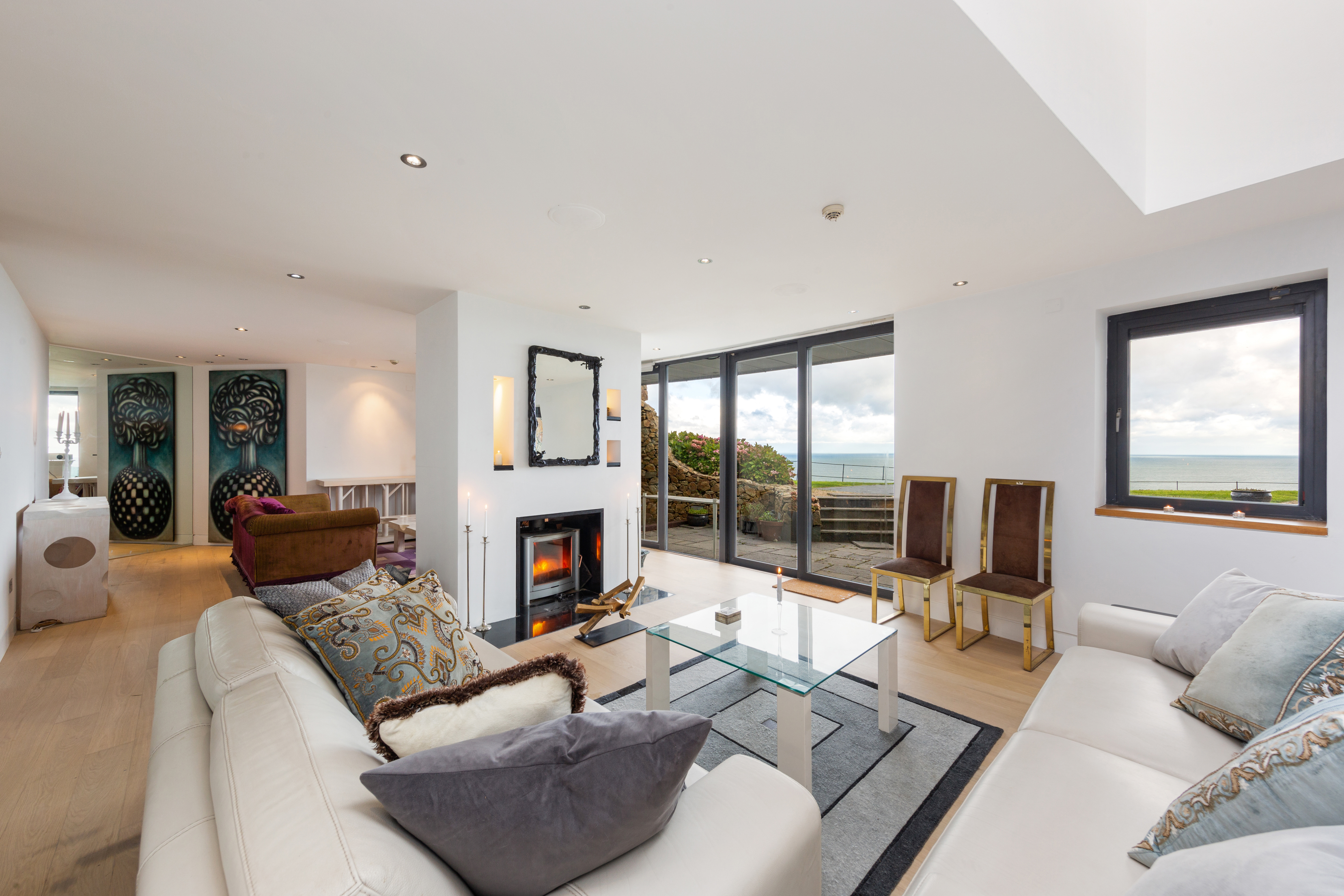 The residence is composed of a split-level, single-story living and entertaining wing and a two-story bedroom wing, offering a total 3,390 square feet of airy, light-filled interior space. Heather Cottage affords splendid isolation but with every modern luxury. Designed to an exacting standard, the finishes throughout are meticulous. Double-glazed and thermally broken windows bring in the light and the views yet also provide protection from the elements. White-oiled oak and Liscannor-tile floors throughout are equipped with an underfloor gas-fired heating system. The sleek contemporary kitchen, situated on the entrance level to connect to the main living spaces, features white siltstone countertops. An open doorway leads into a large dining room overlooking the living room, itself divided into two distinct areas by a dual-fronted fireplace. Vast walls of glass frame the dramatic vistas of the Howth coastline and the Irish Sea.