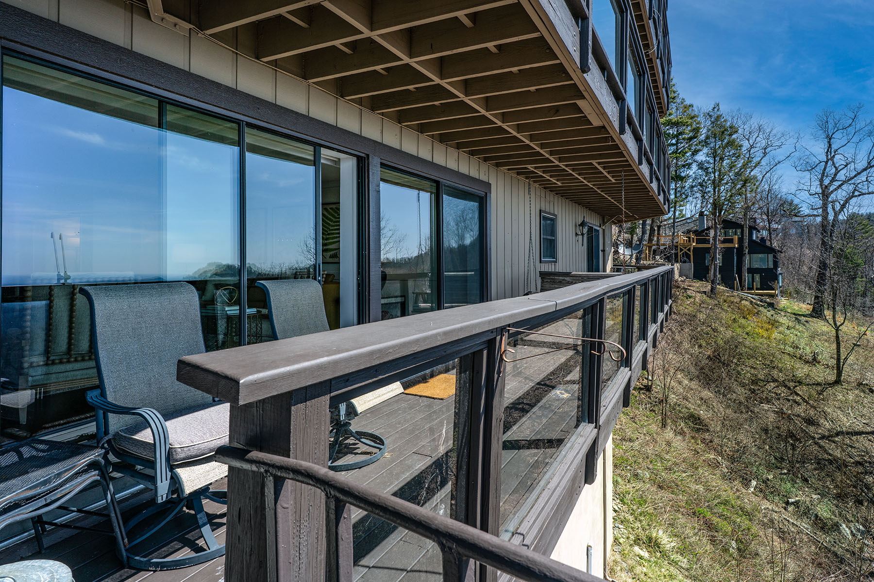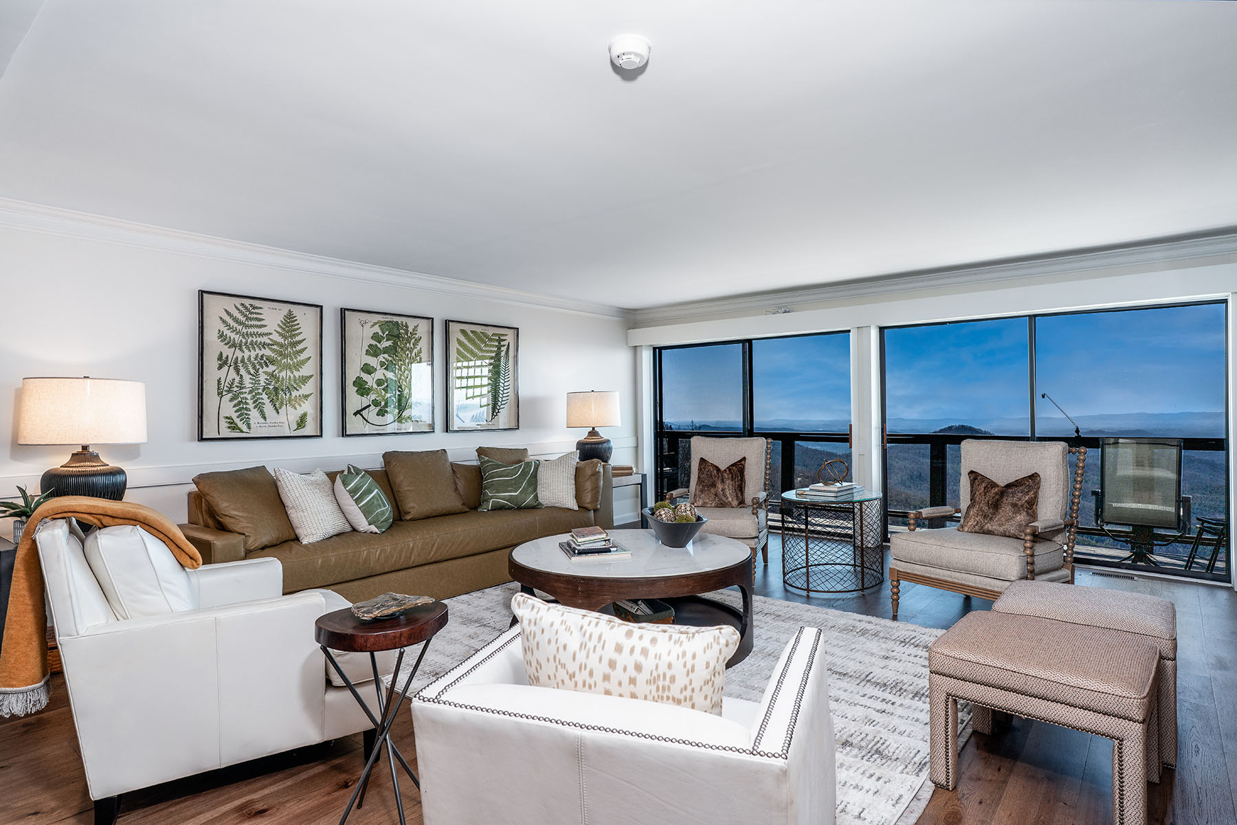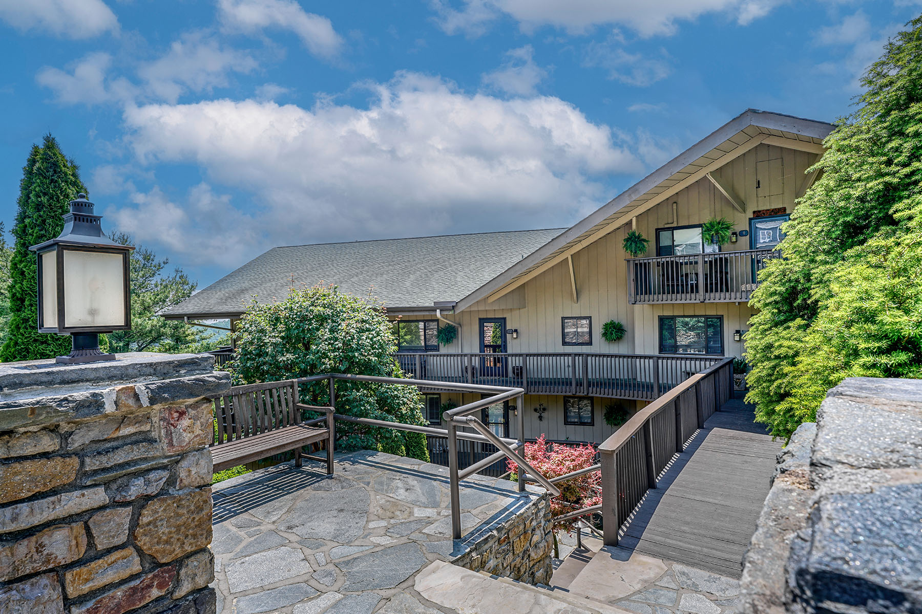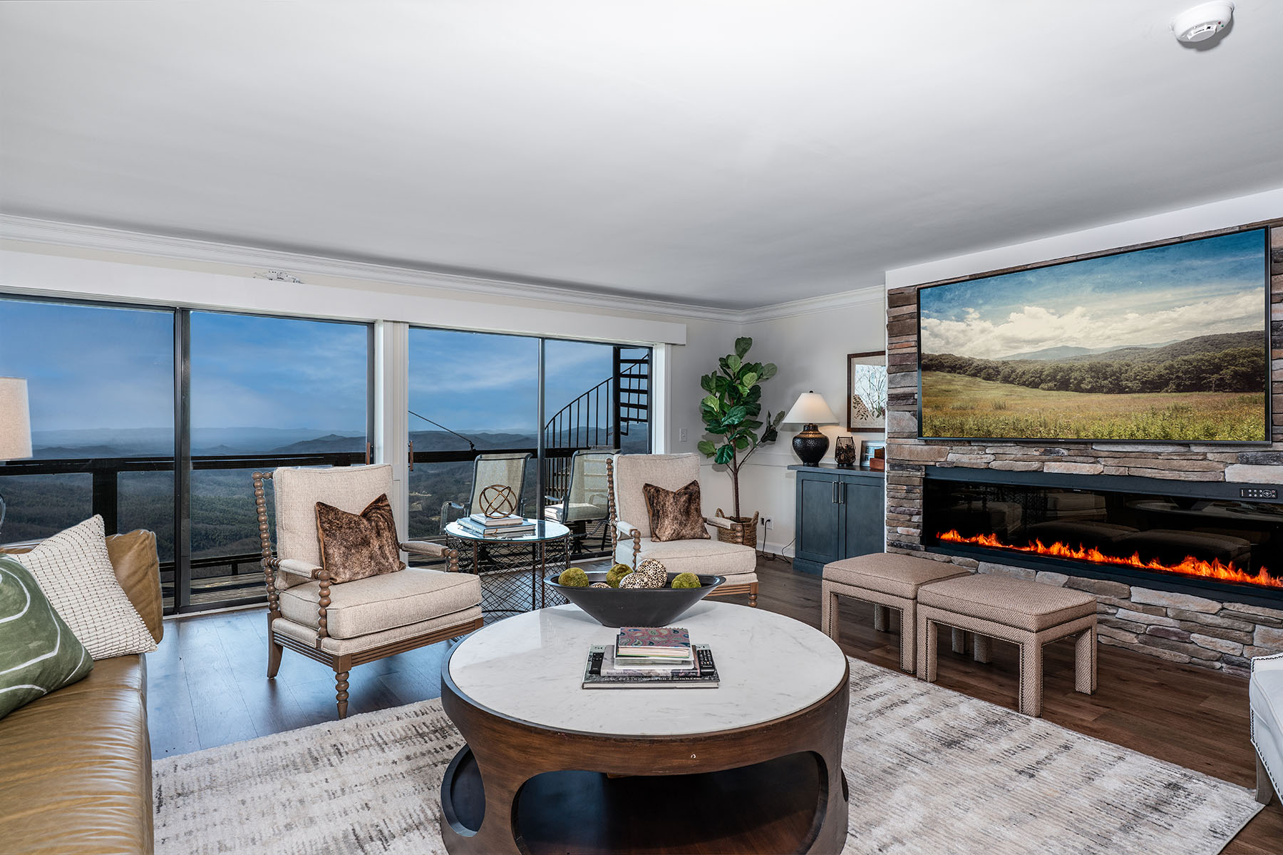 JUST REDUCED!!! BEST VIEW IN BLOWING ROCK-JUST BLOCKs FROM THE HEART OF THE VILLAGE. Be eyeball-to-eyeball with hawks and hummingbirds through the glass wall of your great room, while viewing 150-mile vistas of the Blue Ridge and Pisgah National Forest beyond. On a historic landmark site, you will be uplifted by the ever-changing scenery. Imagine being on your deck above the tree line amongst the clouds? This light-filled three-bedroom, 3 ½-bath condominium has been beautifully updated with all new wooden floors, carpet, kitchen and bath cabinets, granite counters, plantation shutters, appliances, ready to begin living. Entering the foyer, you can see through the great room's glass wall to the mountains beyond. You pass the galley kitchen on your right and the stone-walled bar to your left, you are awed by the luxurious space. There is a new stone contemporary electric fireplace with a giant flat screen TV above. A handsome leather sofa forms the sitting area with twin leather and twin fabric chairs making a great conversation area. At opposite end is a dining area that is adjacent to a granite-topped bar with stools facing the kitchen. Lots of areas for entertaining. The new wooden floors of the great room run down the hall to the primary bedroom on the right. That room has a window wall where you can lie in bed and enjoy the changing views. There is a small electric fireplace for chilly times and a cozy sitting area. A dressing room with double sink and walk-in closet adjoins a bath with tub/shower. A second walk-in closet has a washer and dryer. Across the hall is another bedroom with twin queen beds and a large flat-screen TV and large closet. It opens into a bath with new sink and toilet. Separated by a sliding door is a tile shower. That opens into another half bath. A third guest bedroom is down the hall which has luxuriously upholstered headboards for the queen and twin beds. There is a sitting area. Plantation shutters cover windows. Furnished, exception list attached. Living up close to nature with panoramic views is breathtaking!