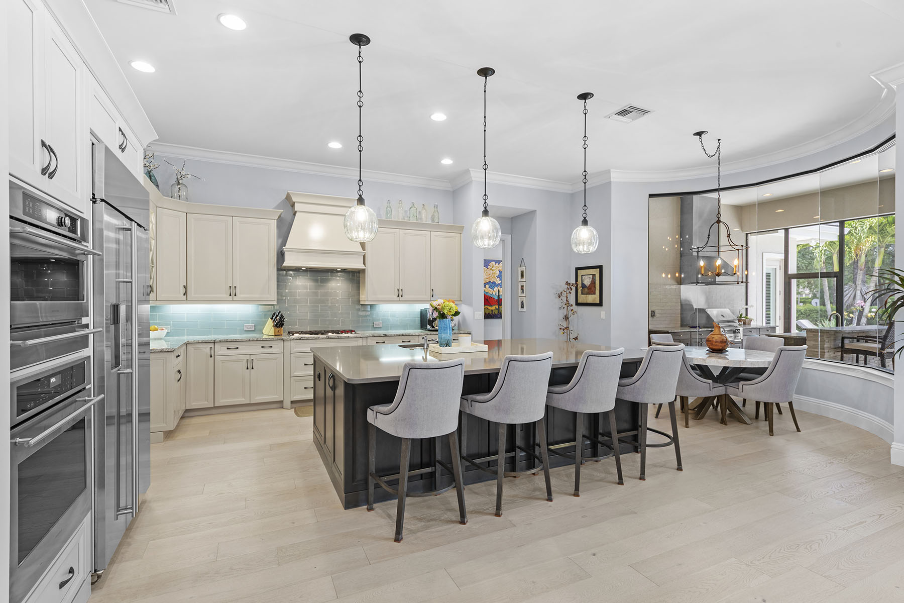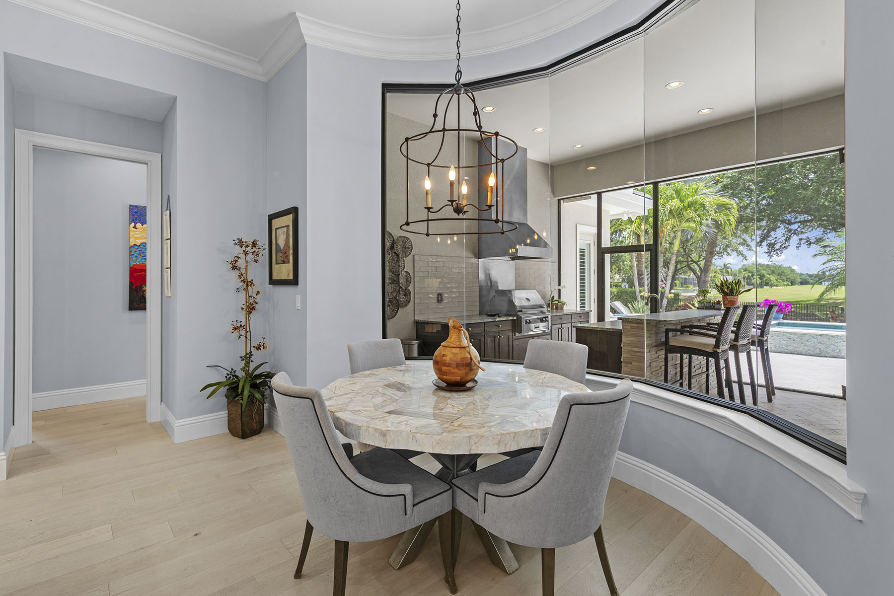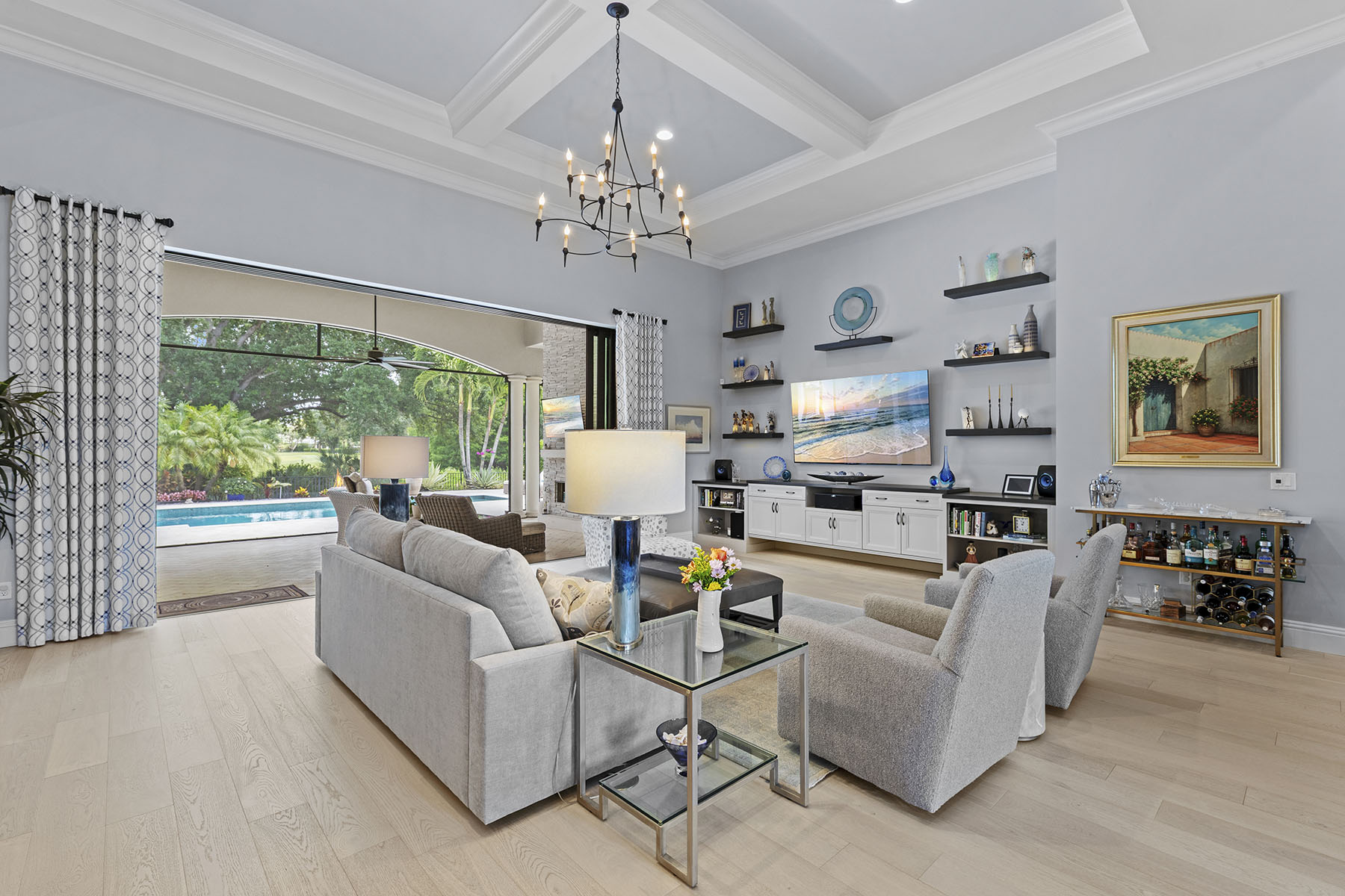 Immediate golf available. In Quail West Country Club, this exceptional single-family residence, built in 2017, offers 3,504 square feet of thoughtfully designed living space, featuring four bedrooms, four full baths and one half bath. Ideally along the golf course, the home showcases impact-resistant glass construction and a tile roof. The primary suite is a private retreat, complete with a sitting area, dual walk-in closets and a spa-inspired bath. The gourmet kitchen features a center island and gas cooking, seamlessly opening to the expansive living area. The living room is enhanced by custom built-ins, volume ceilings and sliding glass doors that lead to the outdoor living space. A formal dining room provides an elegant setting for entertaining, while hardwood flooring flows throughout the main living areas. Designed for year-round enjoyment, the outdoor space includes a pool and a fireplace, creating a resort-style setting. An air-conditioned garage adds comfort and functionality. Residents of Quail West Country Club enjoy access to an impressive 70,000-square-foot clubhouse, featuring a state-of-the-art fitness center, bocce courts, racquet center, full-service spa and salon, and multiple dining venues. Conveniently about 20 minutes from Southwest Florida International Airport, the pristine Gulf beaches, and the renowned shopping and dining districts of Fifth Avenue South and Third Street South.