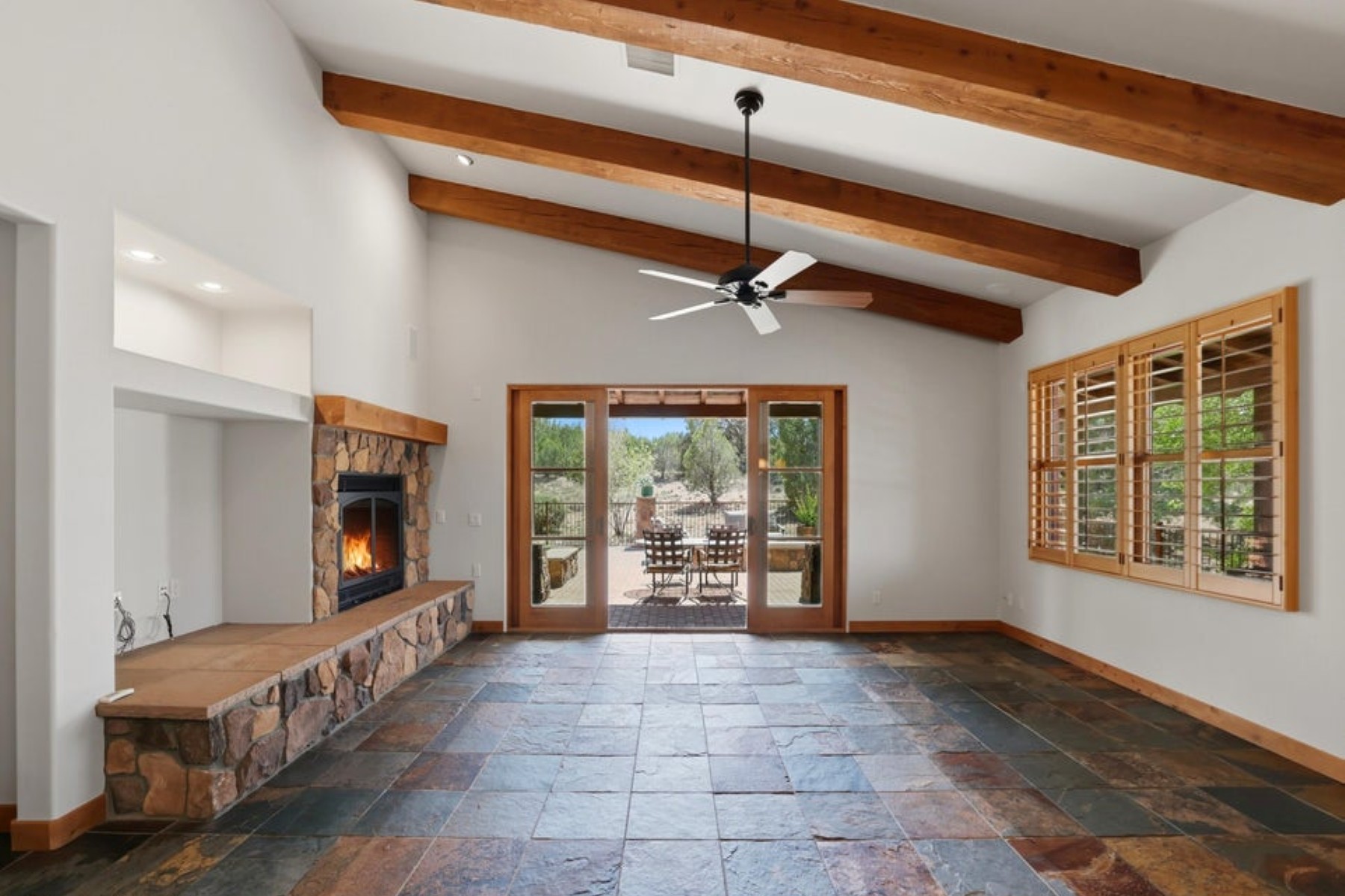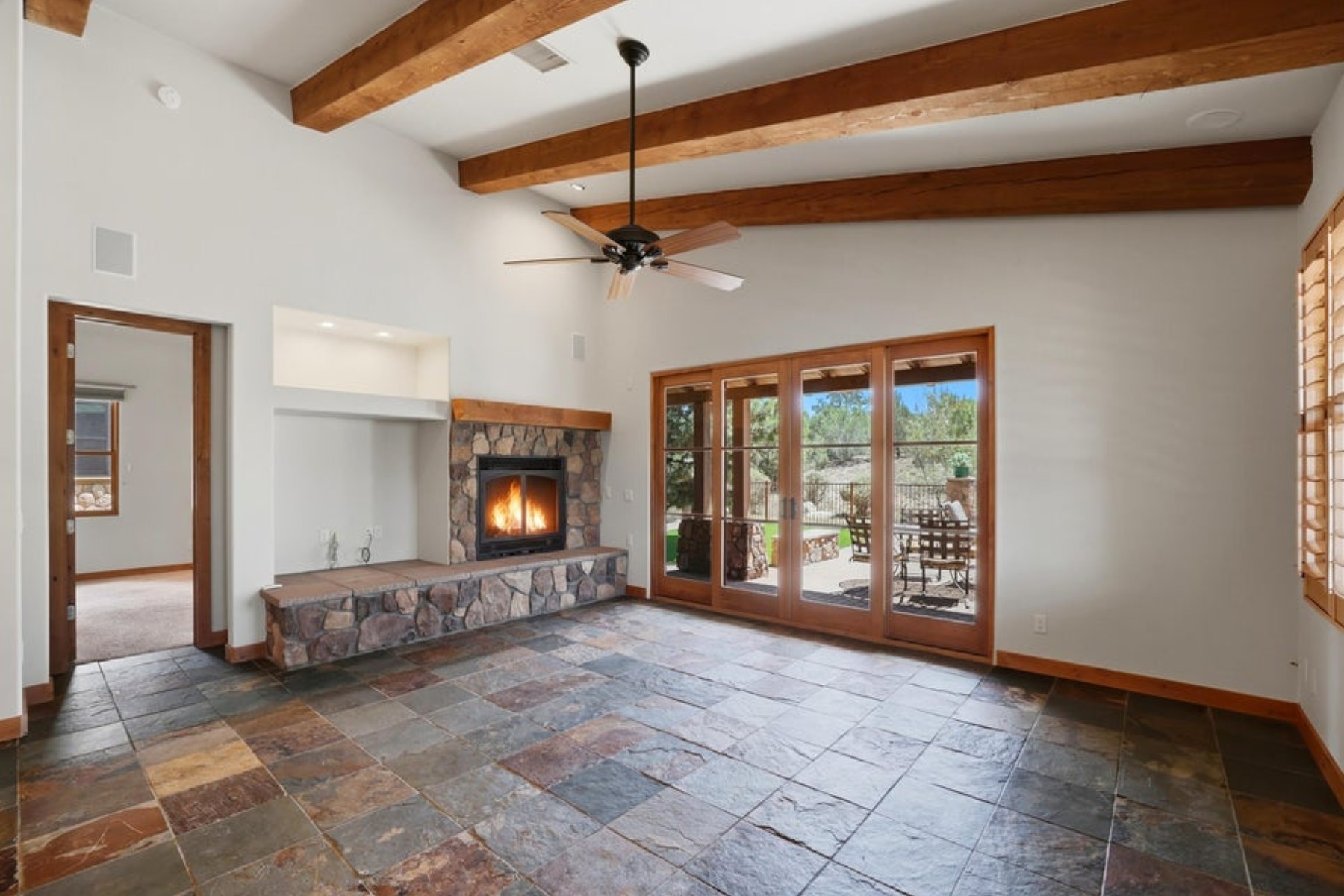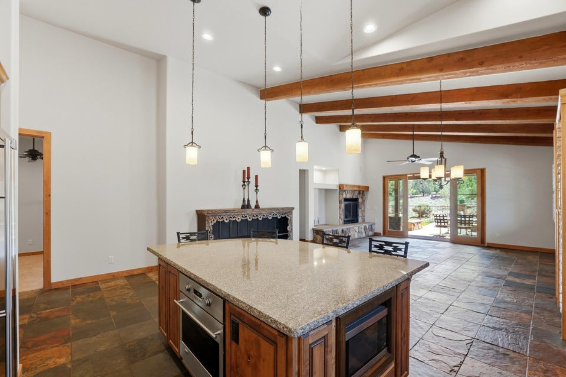 Refined ranch cottage with soaring wood-beamed ceilings, a dramatic stone fireplace, and an expansive great room designed for elevated living and entertaining. Light-filled, freshly painted interiors feature slate tile flooring and rich knotty alder cabinetry.The extended rear patio offers a private outdoor retreat--fenced yard, firepit, built-in BBQ, and low-maintenance turf--backing to HOA common area for added seclusion. Granite countertops and built-in garage cabinetry complete this beautifully appointed home.Located in the exclusive Talking Rock golf community, where members and guests enjoy exceptional hospitality and premier amenities, including an award-winning Jay Morrish-designed course, fitness center, dining, coffee house, racquet courts, dog park, community garden, and 14+ miles of scenic trails.