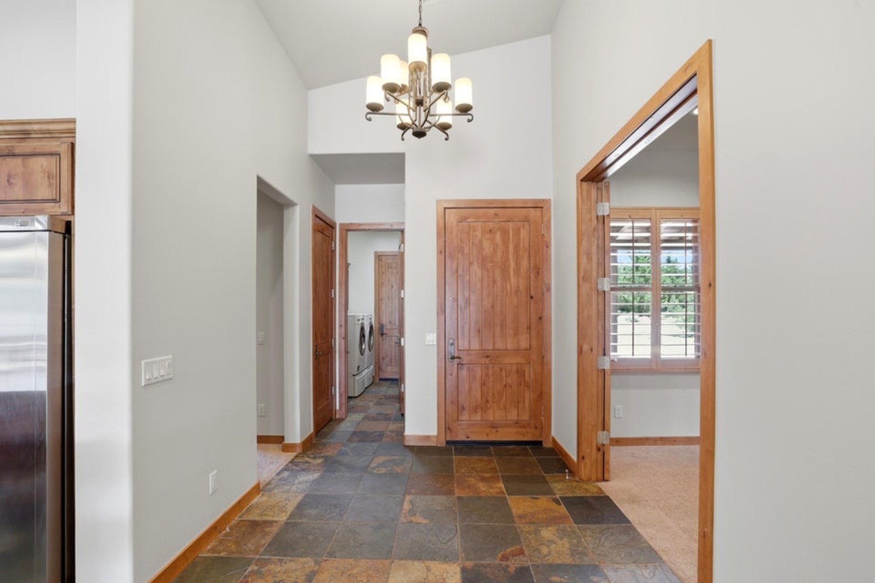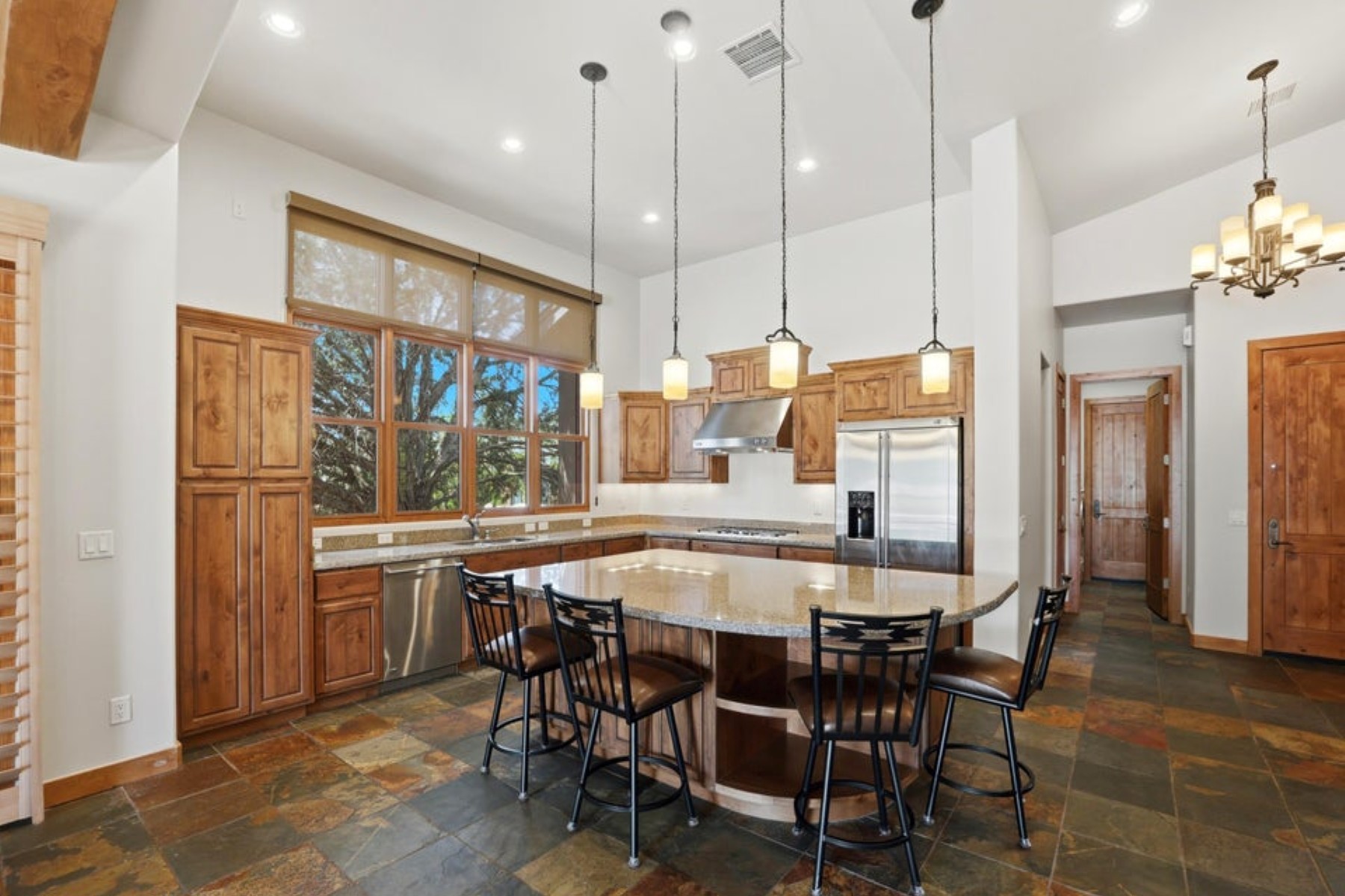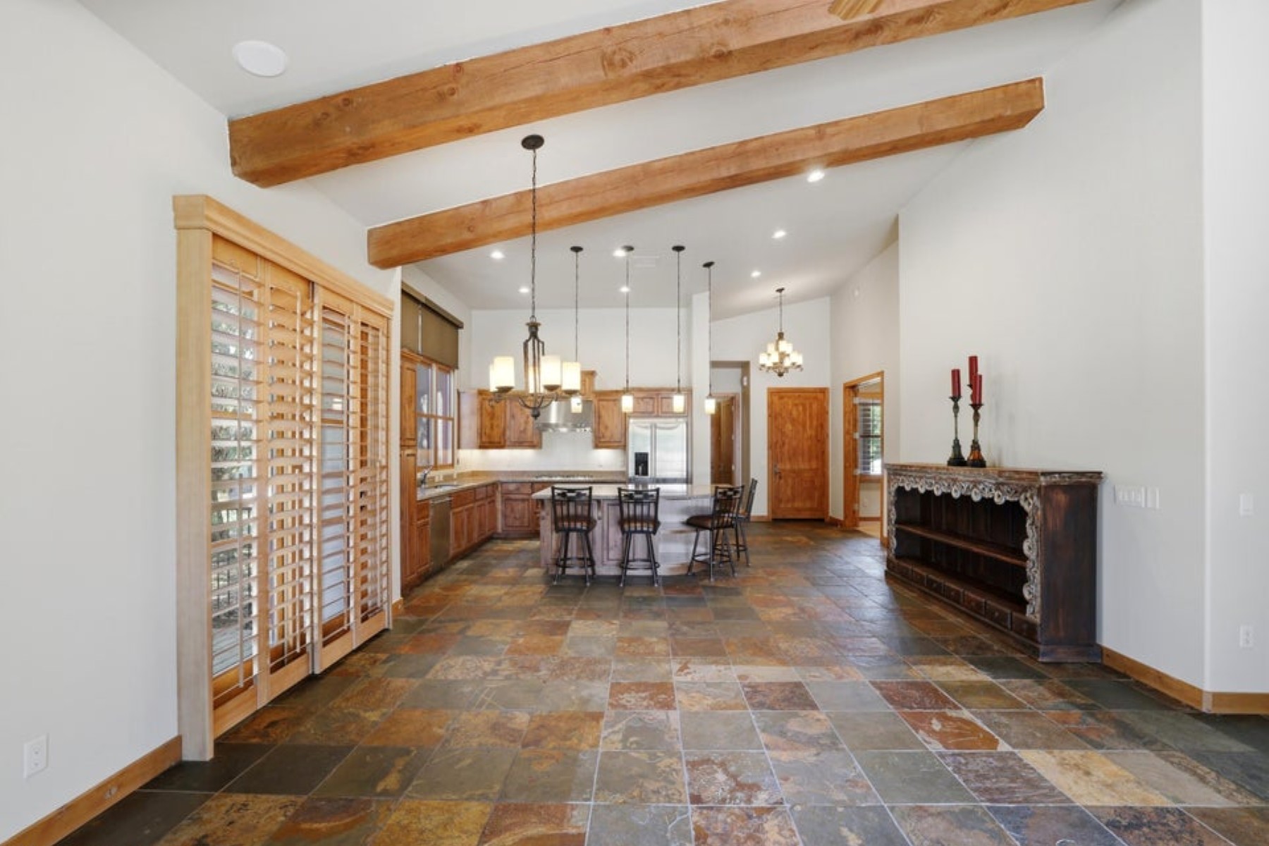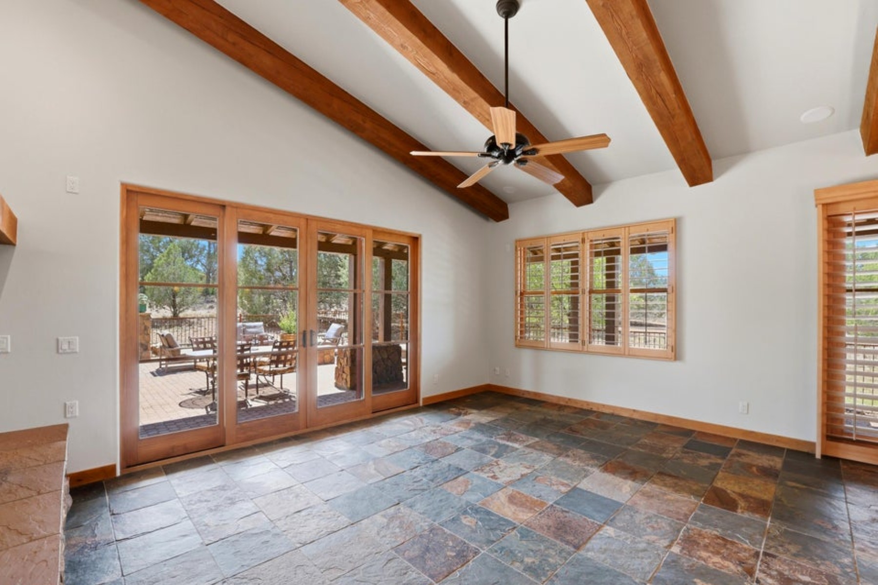 Refined ranch cottage with soaring wood-beamed ceilings, a dramatic stone fireplace, and an expansive great room designed for elevated living and entertaining. Light-filled, freshly painted interiors feature slate tile flooring and rich knotty alder cabinetry.The extended rear patio offers a private outdoor retreat--fenced yard, firepit, built-in BBQ, and low-maintenance turf--backing to HOA common area for added seclusion. Granite countertops and built-in garage cabinetry complete this beautifully appointed home.Located in the exclusive Talking Rock golf community, where members and guests enjoy exceptional hospitality and premier amenities, including an award-winning Jay Morrish-designed course, fitness center, dining, coffee house, racquet courts, dog park, community garden, and 14+ miles of scenic trails.