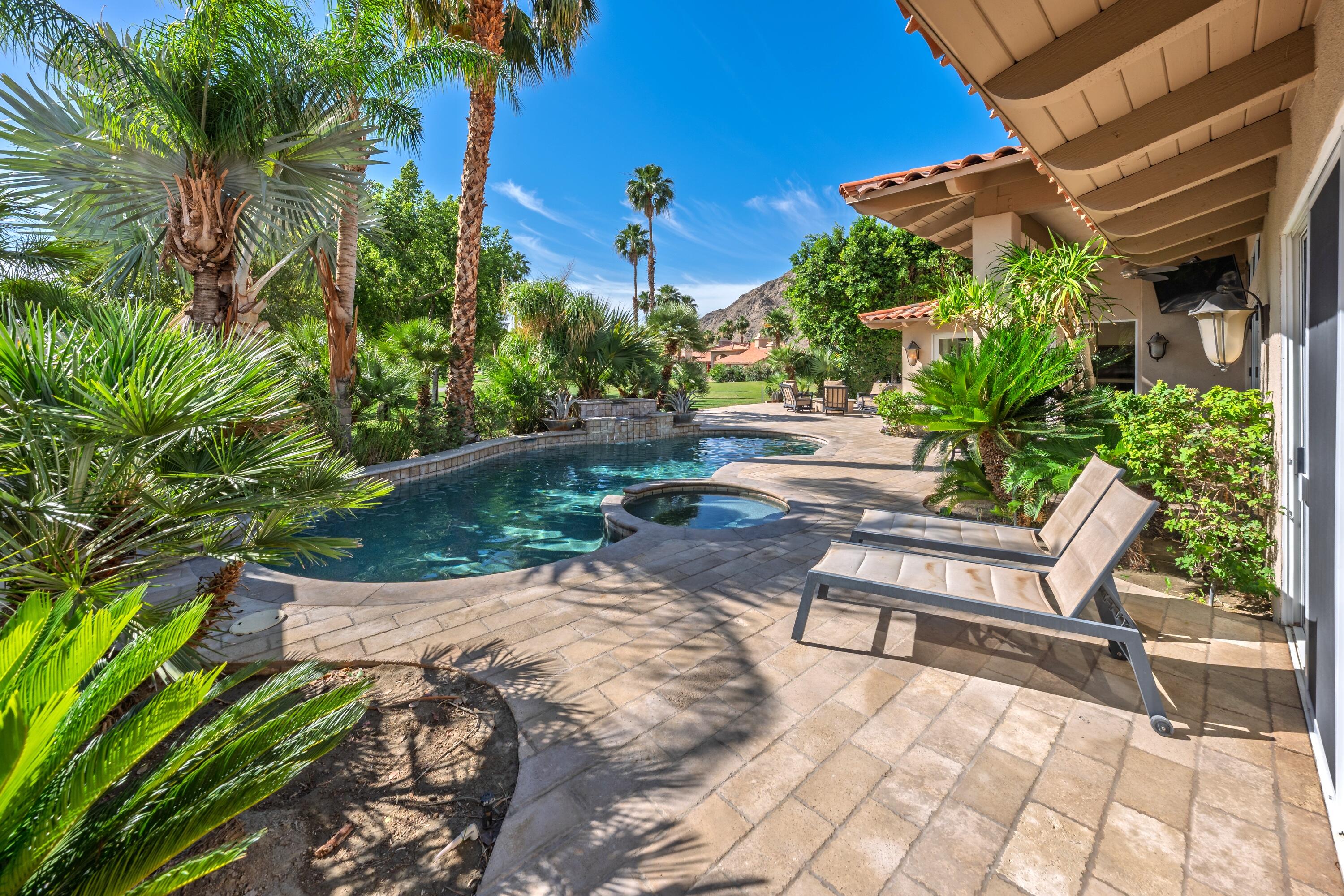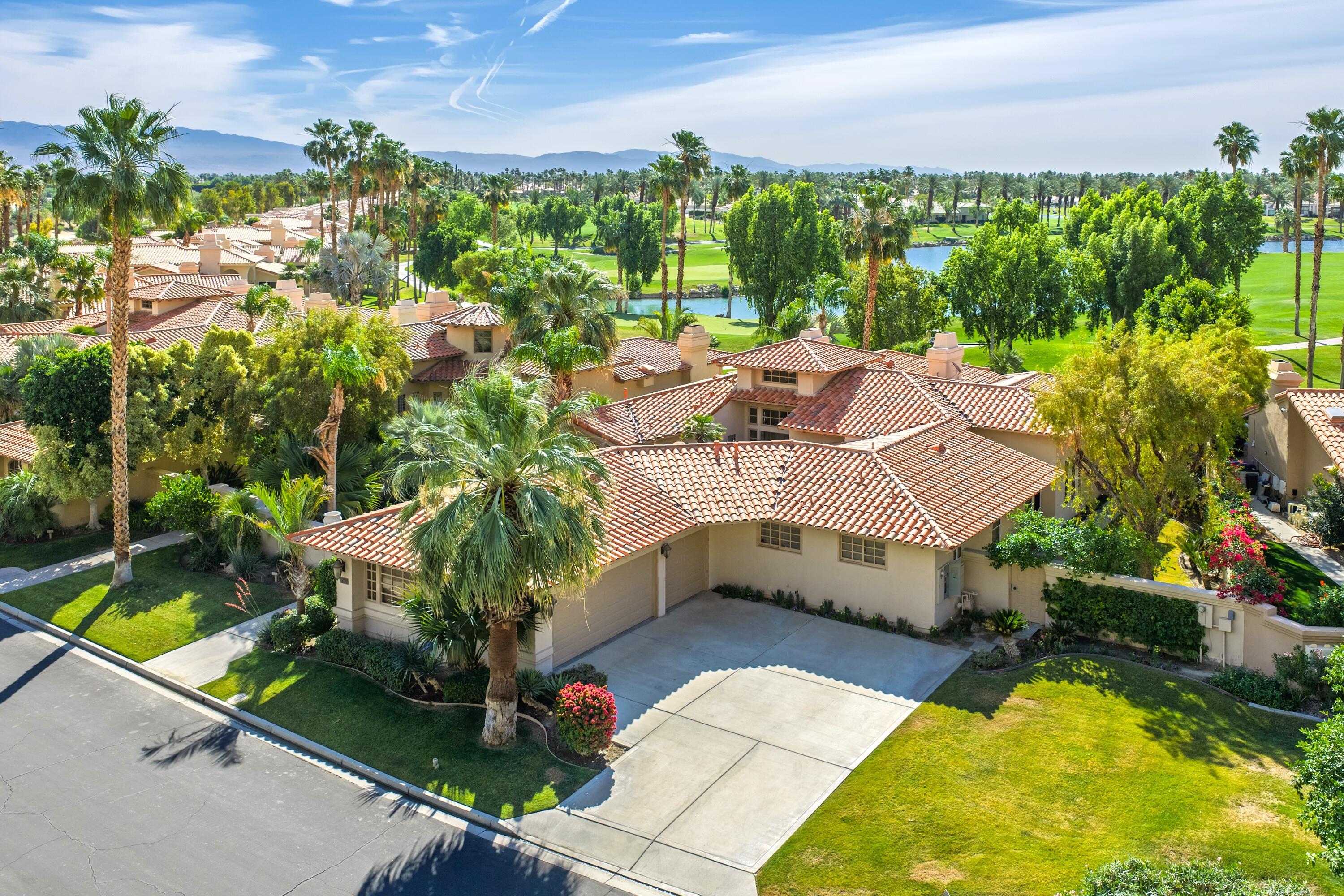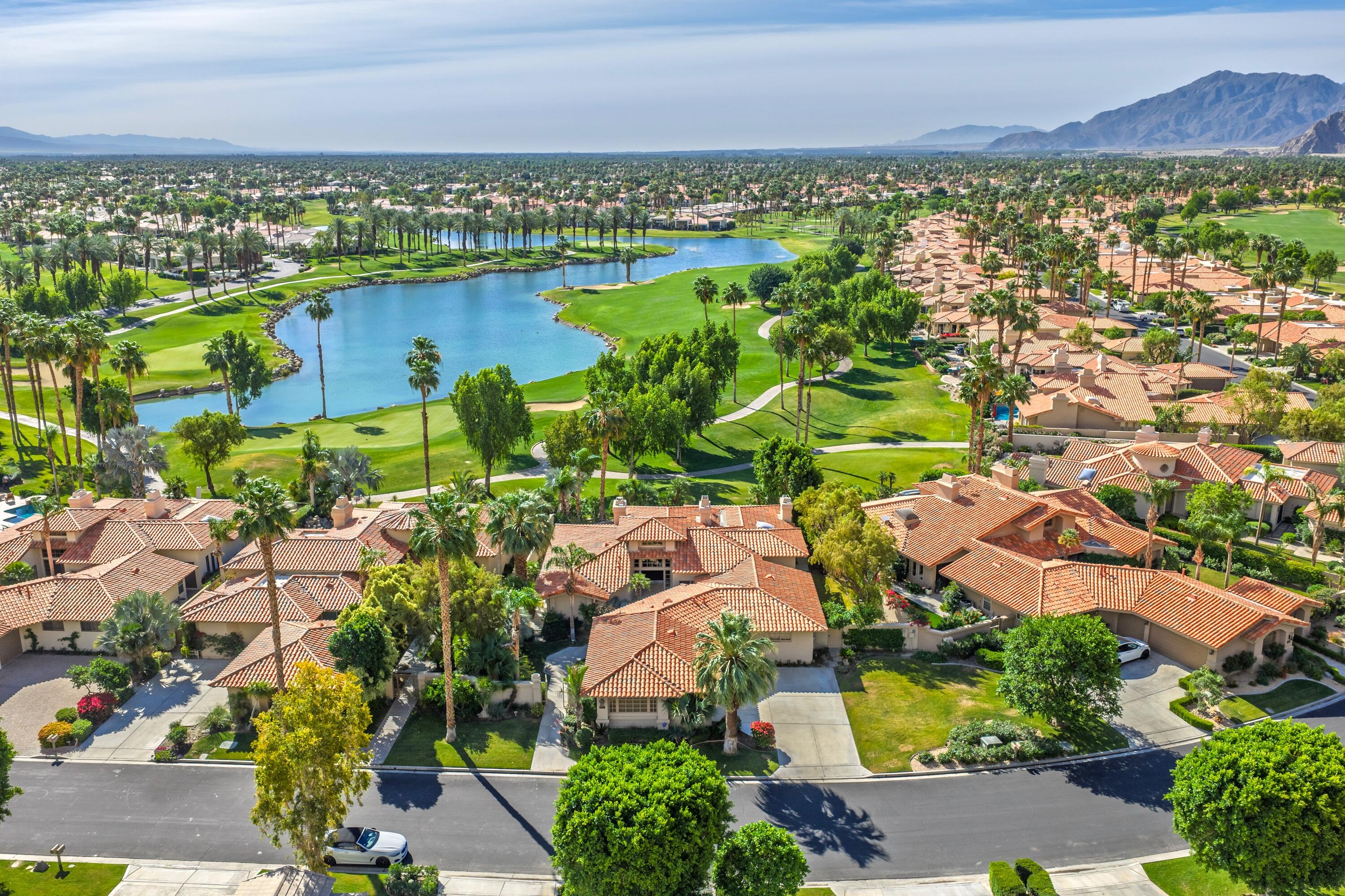 Enjoy some of the most expansive and dramatic views of the mountains and lake from both inside and outside this well-appointed home on the 13th green of the Palmer Private course at PGA West. Large windows and a thoughtfully re-designed floor plan allow you to immerse yourself in the beauty of the surrounding landscape, whether you are relaxing indoors or entertaining guests on the patio. Four ensuite bedrooms along with an additional guest bath offer privacy and comfort, making this home ideal for both families and those who like to host. In addition to its stunning location and architectural characteristics, the home features a gourmet kitchen equipped with high-end appliances, ample storage space, and opens to multiple living and entertaining areas including a breakfast nook, family room, cozy wet bar and formal dining space. The primary suite includes a fireplace, sitting area, and a spacious bathroom with dual vanities, an oversized shower, and ample storage. Outdoor living and entertaining is designed for year-round enjoyment, with a private pool, spa and waterfall, built-in barbecue and seating areas centered around a fire feature -- all overlooking the golf course and surrounding landscape. This residence combines luxury, comfort, and breathtaking scenery for an unparalleled living experience.