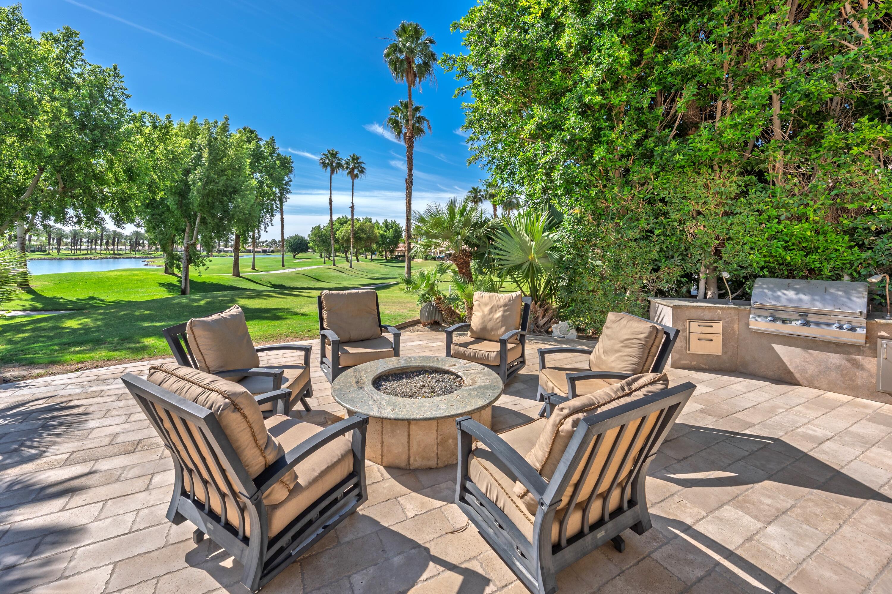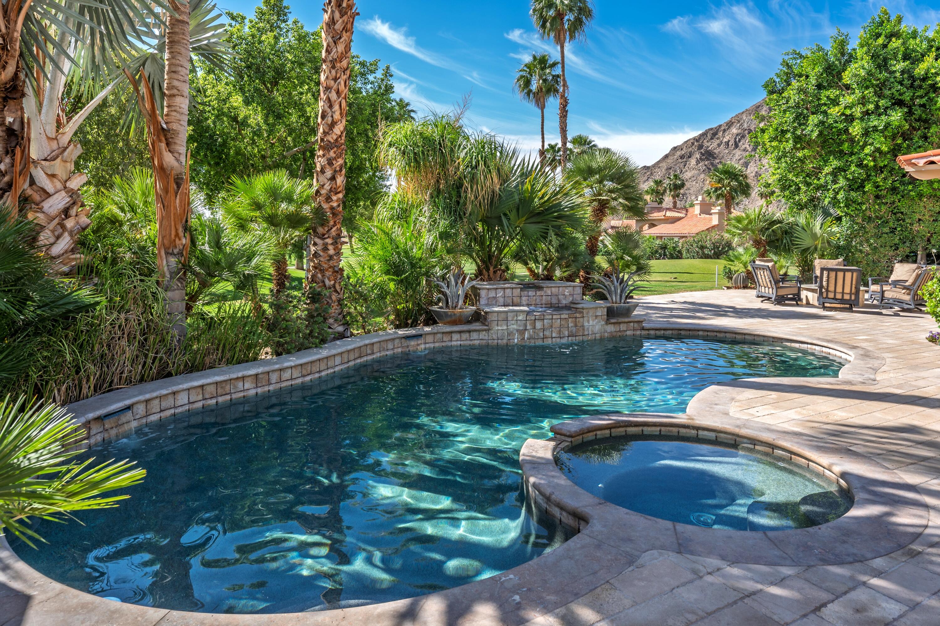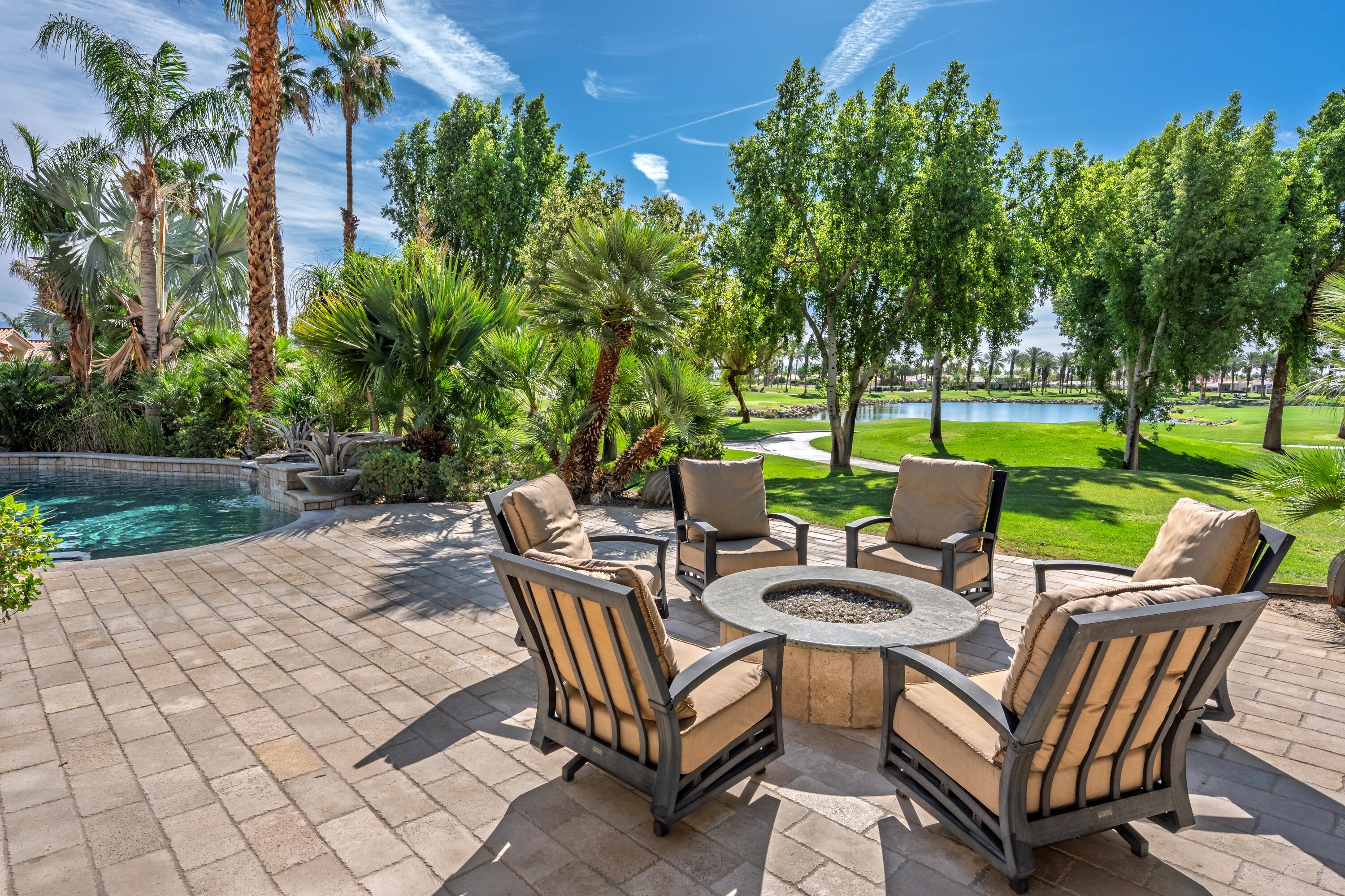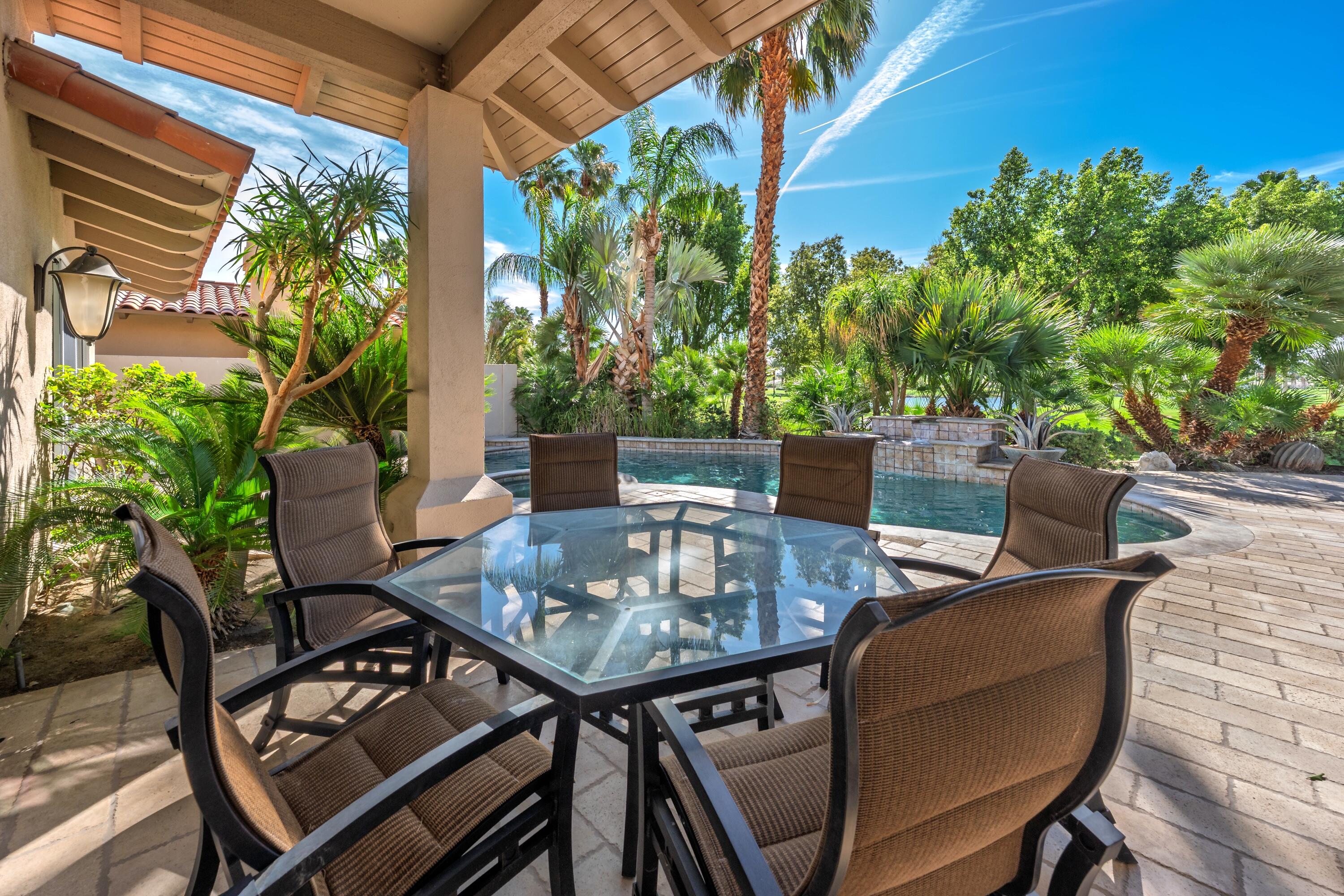 Enjoy some of the most expansive and dramatic views of the mountains and lake from both inside and outside this well-appointed home on the 13th green of the Palmer Private course at PGA West. Large windows and a thoughtfully re-designed floor plan allow you to immerse yourself in the beauty of the surrounding landscape, whether you are relaxing indoors or entertaining guests on the patio. Four ensuite bedrooms along with an additional guest bath offer privacy and comfort, making this home ideal for both families and those who like to host. In addition to its stunning location and architectural characteristics, the home features a gourmet kitchen equipped with high-end appliances, ample storage space, and opens to multiple living and entertaining areas including a breakfast nook, family room, cozy wet bar and formal dining space. The primary suite includes a fireplace, sitting area, and a spacious bathroom with dual vanities, an oversized shower, and ample storage. Outdoor living and entertaining is designed for year-round enjoyment, with a private pool, spa and waterfall, built-in barbecue and seating areas centered around a fire feature -- all overlooking the golf course and surrounding landscape. This residence combines luxury, comfort, and breathtaking scenery for an unparalleled living experience.