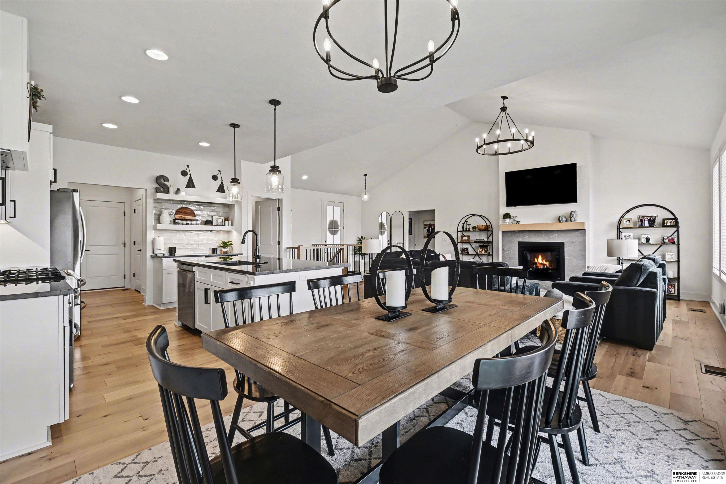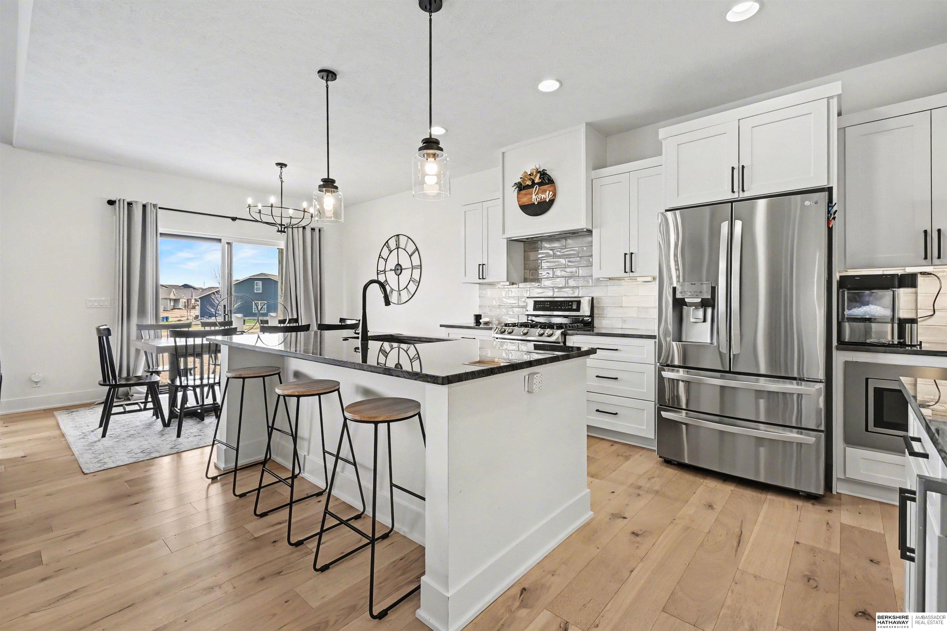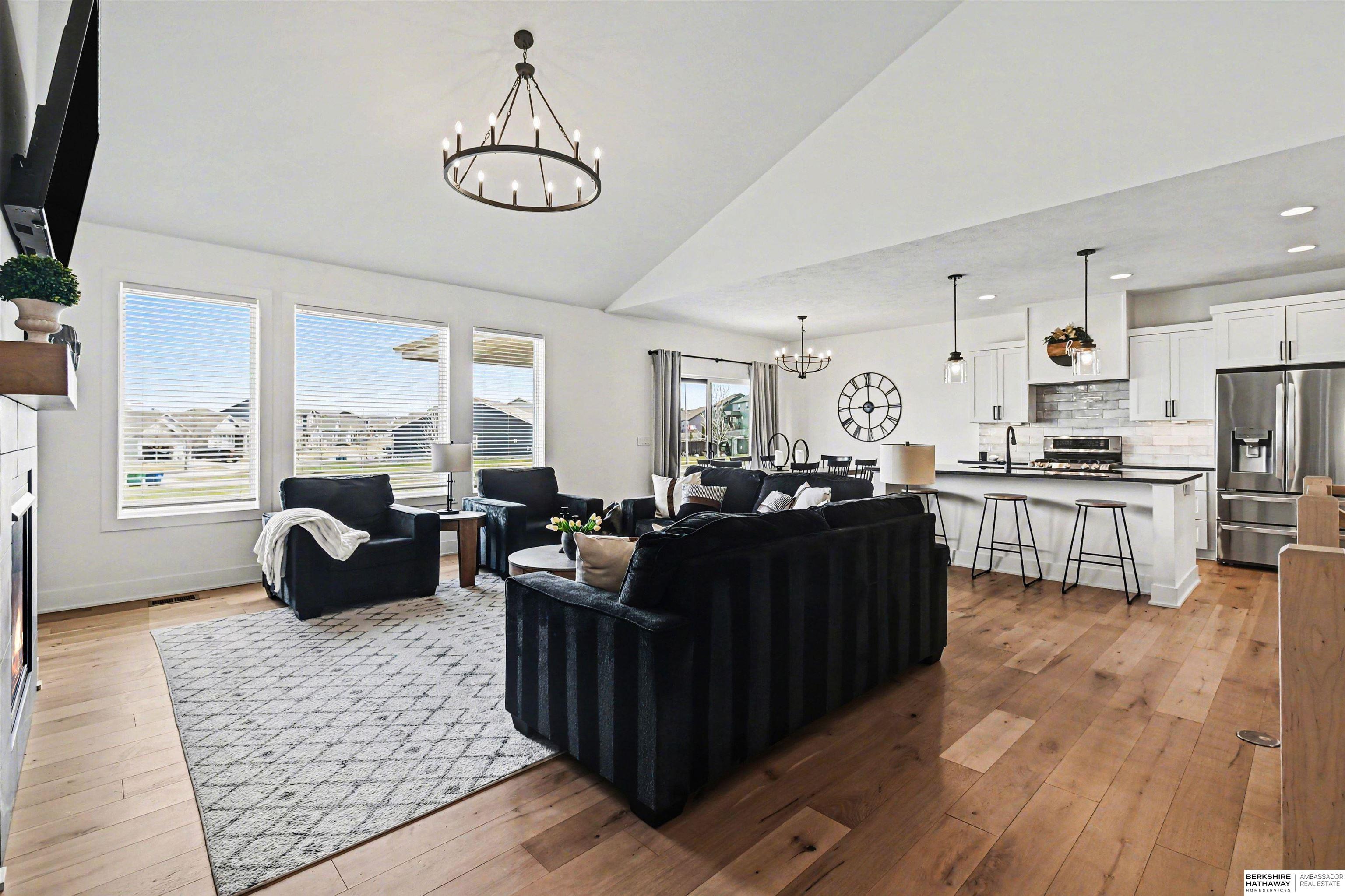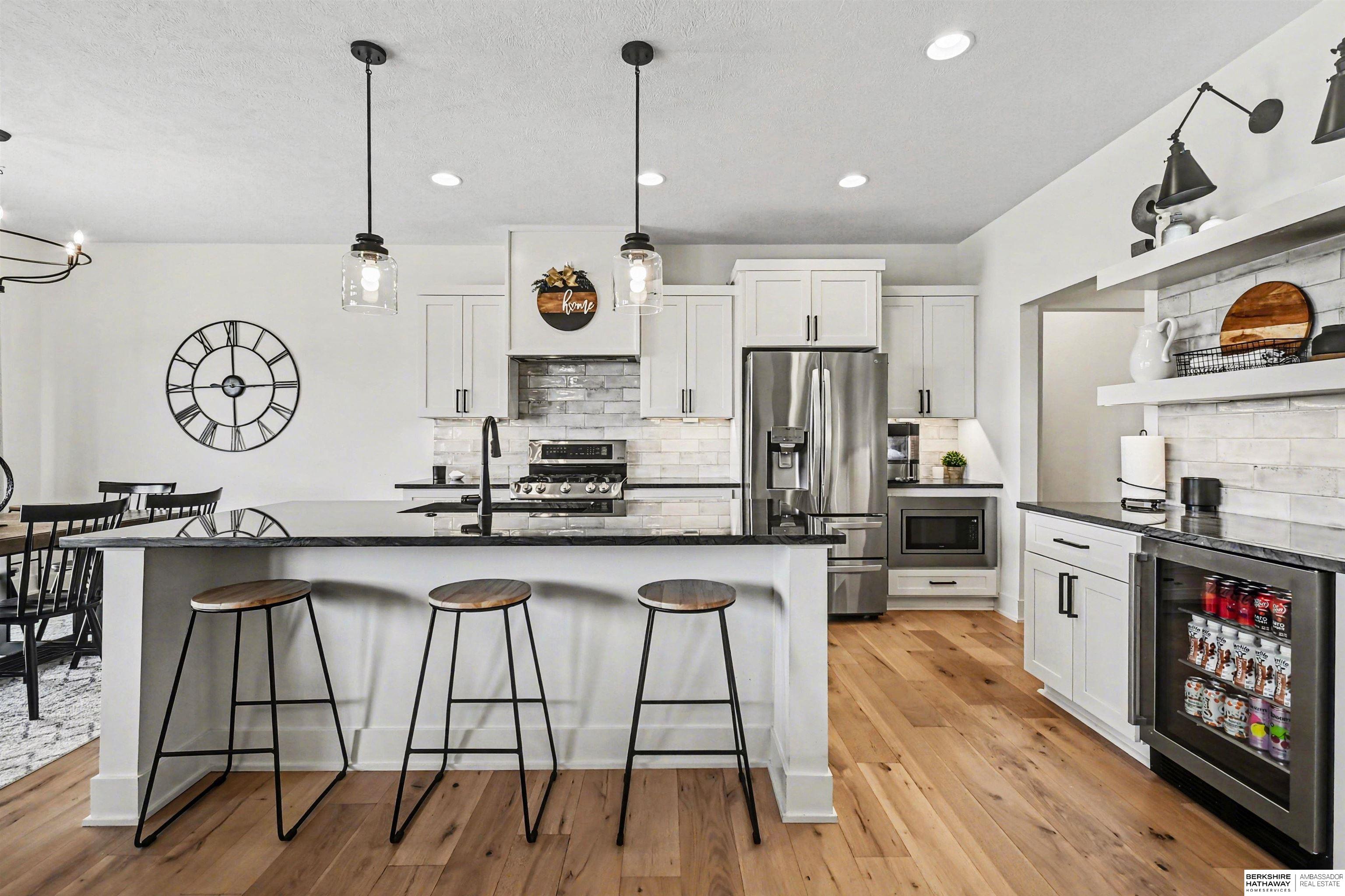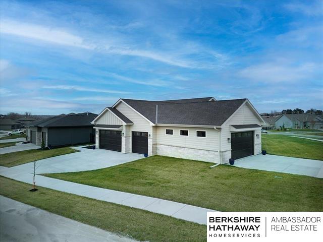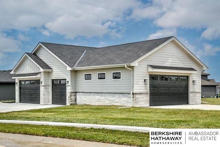 This stunning 6-bed ranch in Grandview Ridge Estates, within Elkhorn South School District, sits on almost half an acre corner lot and features a rare 5-car garage. A separate 2-car bay with its own entry offers endless possibilities - perfect for a workshop, extra storage, or even a sports court. Bright, open-concept main level showcases vaulted ceilings, hardwood floors, and modern farmhouse feel. Chef's kitchen shines with quartz countertops, gas range, double ovens, and a "dry bar" with built-in beverage fridge. Private primary suite includes vaulted ceilings, 2 walk-in closets, spa-like shower, and direct laundry access. 2 additional bedrooms complete the main level. Finished basement is ideal for entertaining with a spacious rec room, full wet bar, 3 bedrooms, and bath. Back yard lays out perfectly for an in-ground pool! Relax on the covered patio and enjoy it all.. Just steps from Blue Sage Lake. Forever home? I think so!