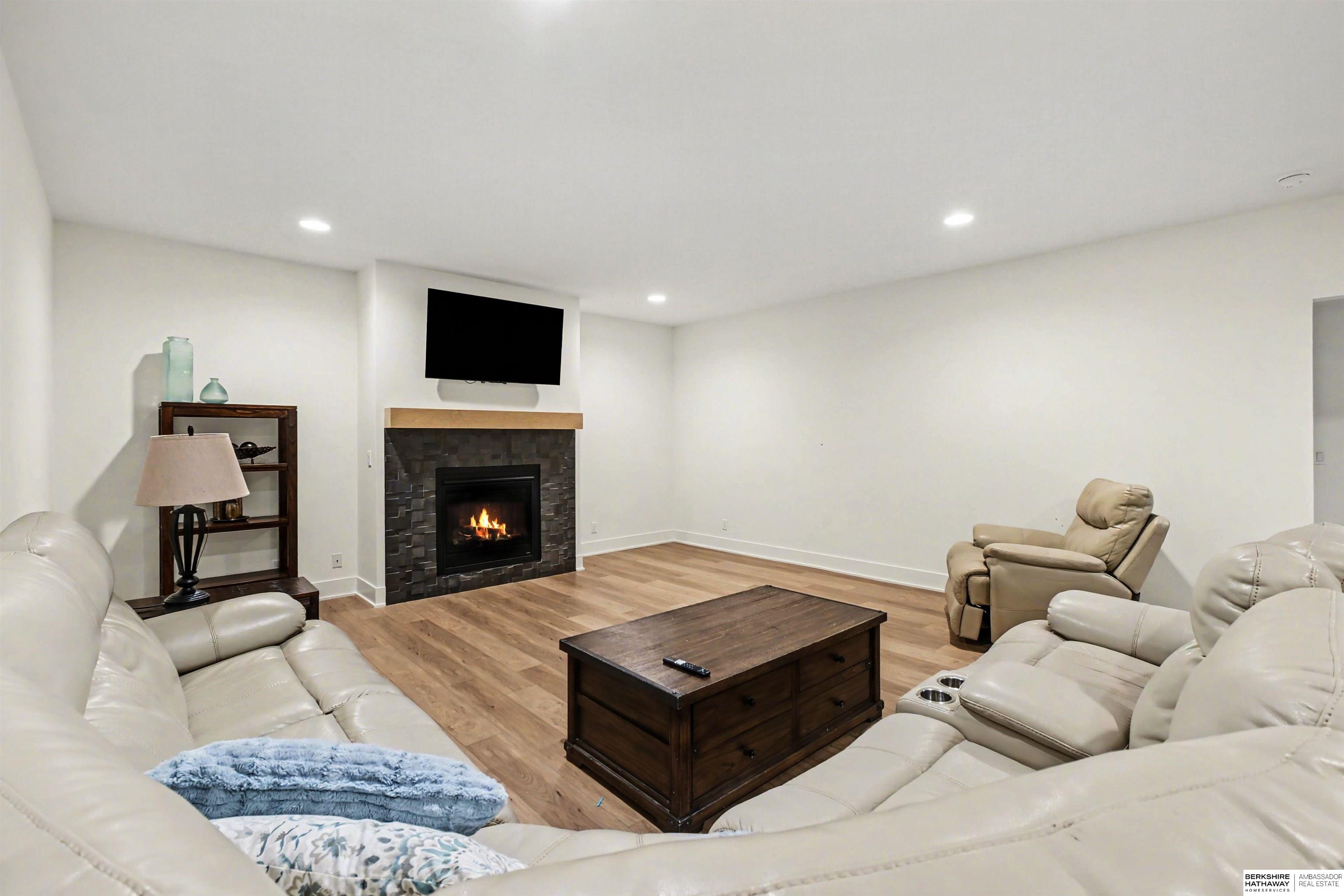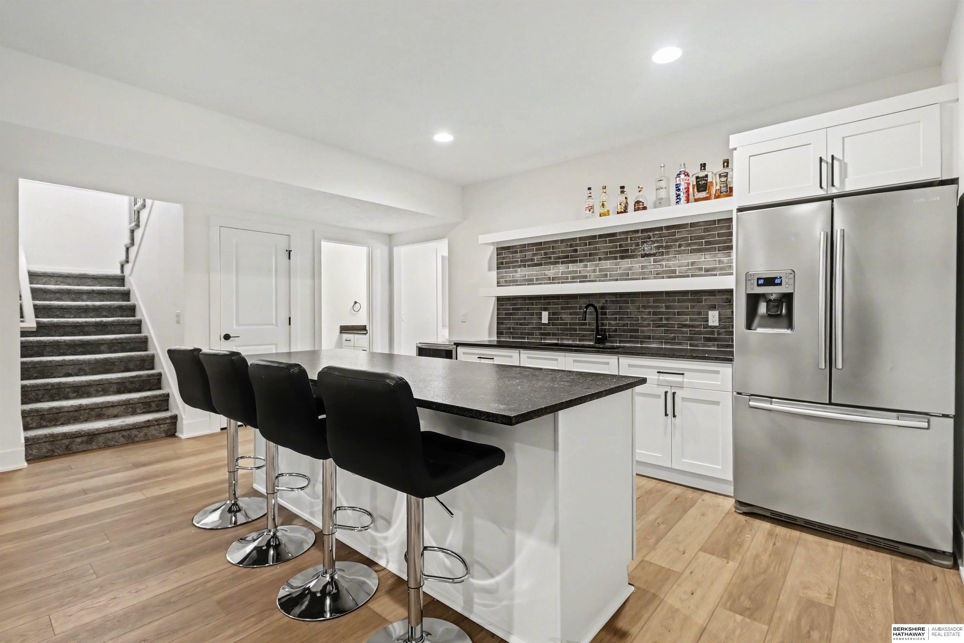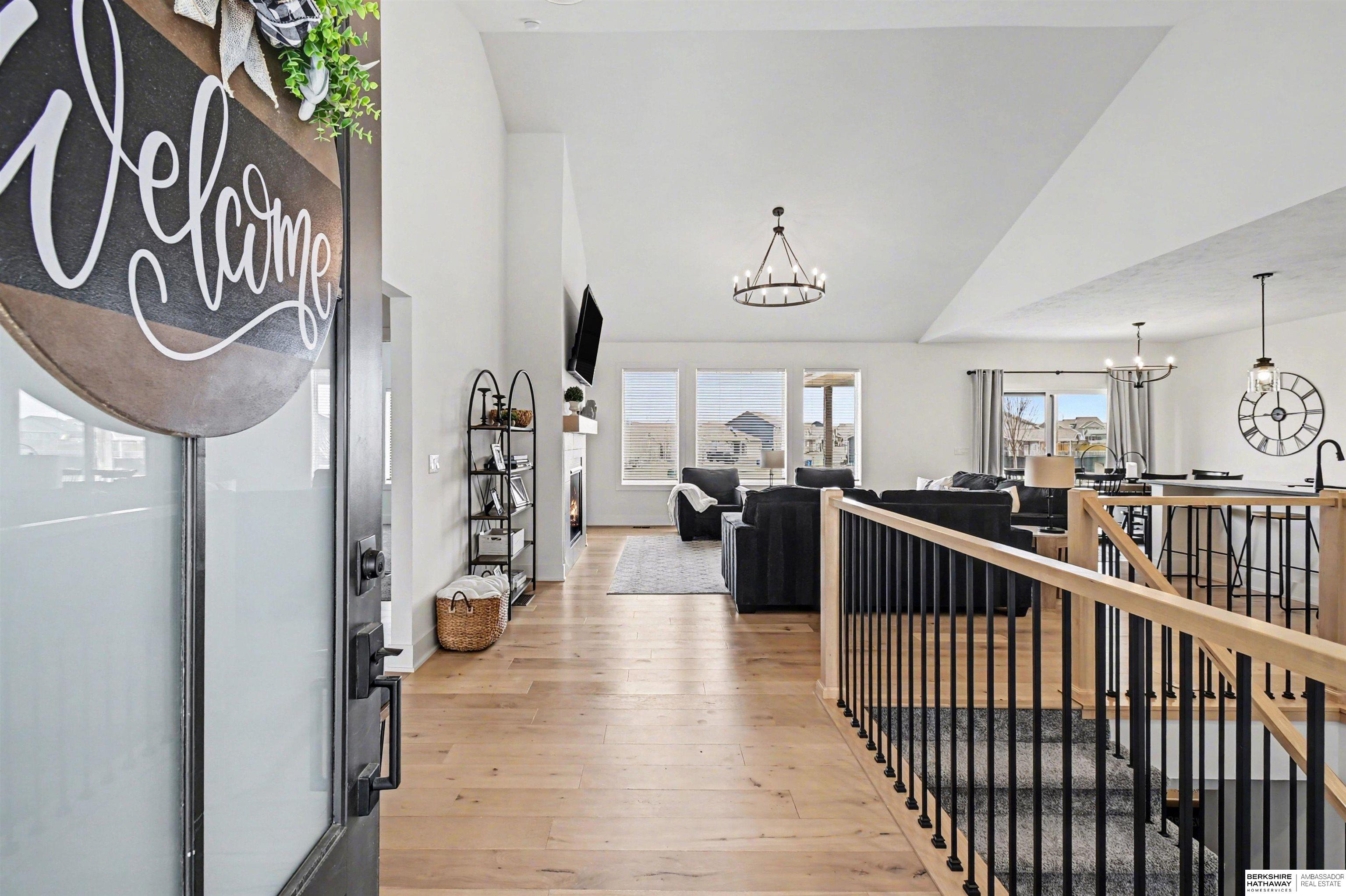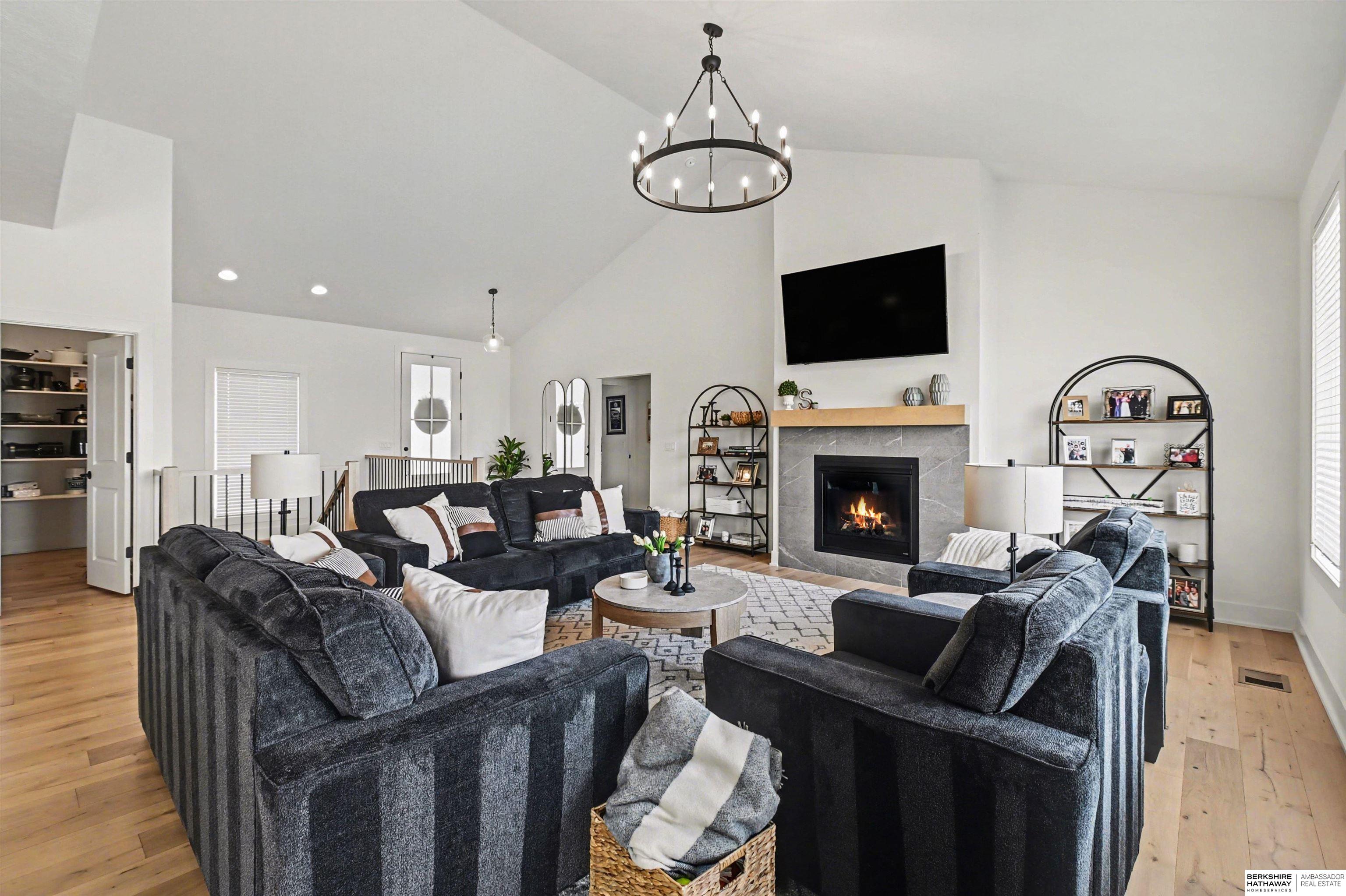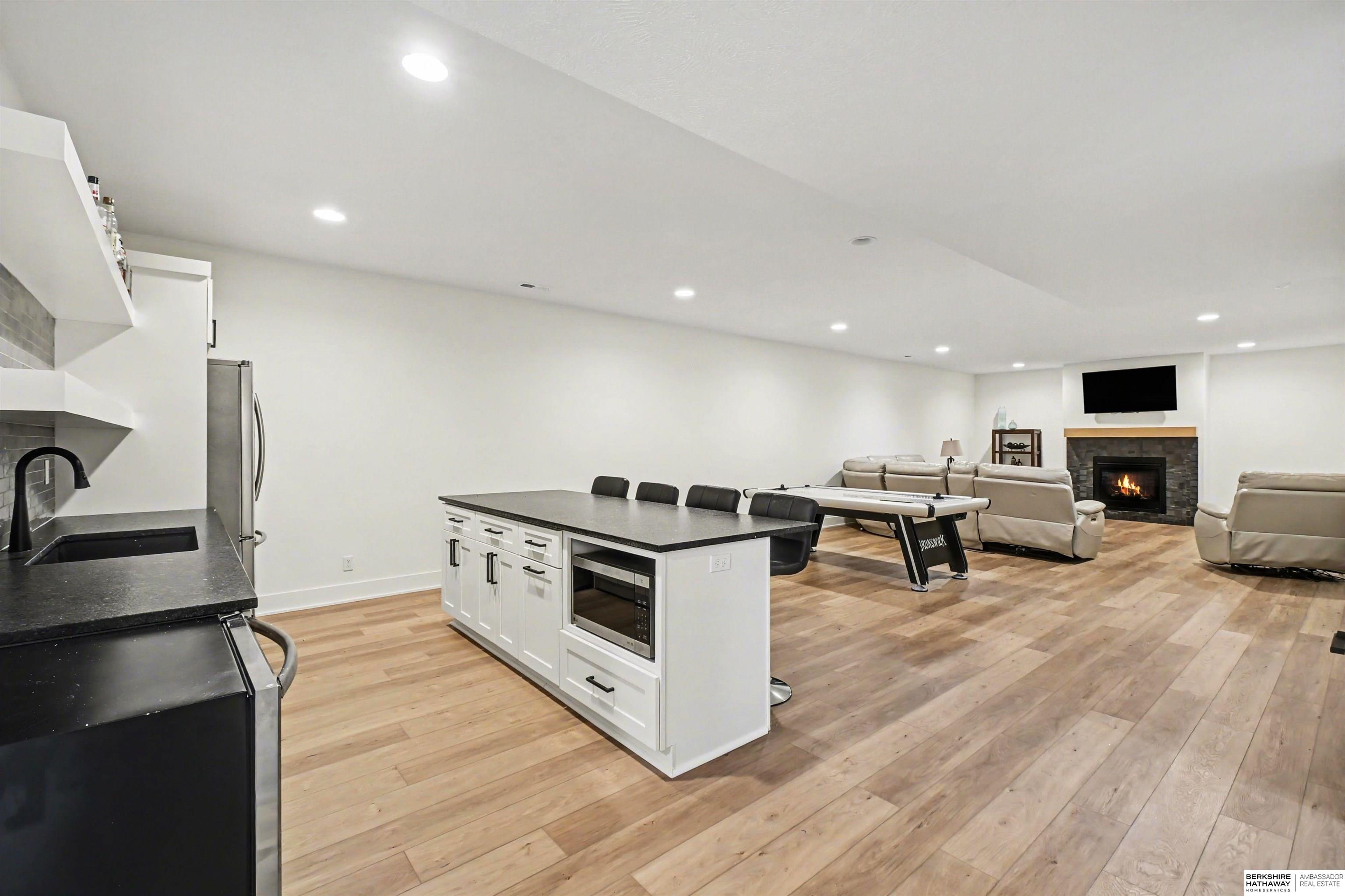 This stunning 6-bed ranch in Grandview Ridge Estates, within Elkhorn South School District, sits on almost half an acre corner lot and features a rare 5-car garage. A separate 2-car bay with its own entry offers endless possibilities - perfect for a workshop, extra storage, or even a sports court. Bright, open-concept main level showcases vaulted ceilings, hardwood floors, and modern farmhouse feel. Chef's kitchen shines with quartz countertops, gas range, double ovens, and a "dry bar" with built-in beverage fridge. Private primary suite includes vaulted ceilings, 2 walk-in closets, spa-like shower, and direct laundry access. 2 additional bedrooms complete the main level. Finished basement is ideal for entertaining with a spacious rec room, full wet bar, 3 bedrooms, and bath. Back yard lays out perfectly for an in-ground pool! Relax on the covered patio and enjoy it all.. Just steps from Blue Sage Lake. Forever home? I think so!