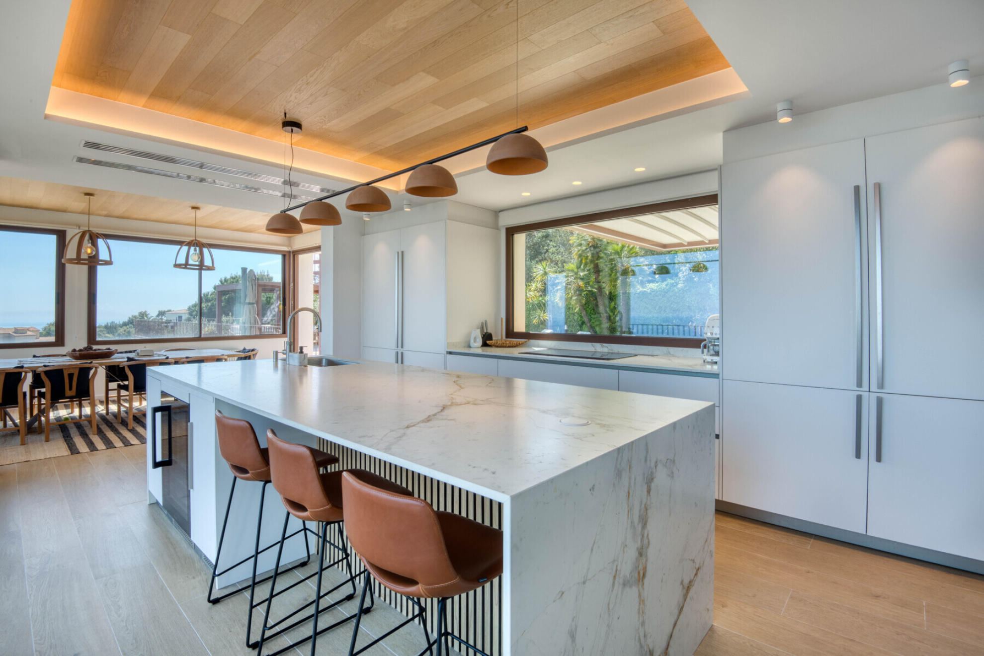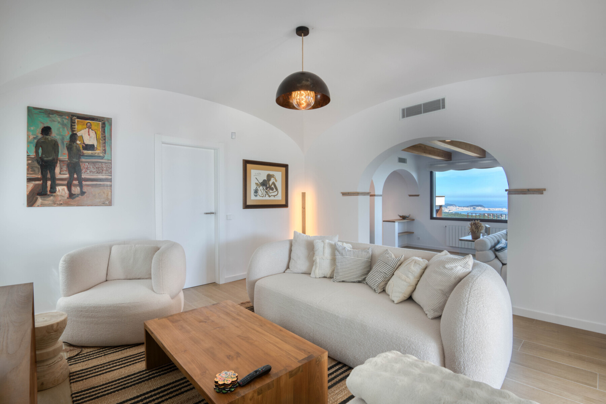 Upstairs is the impressive day area, centered around a spacious living room with fireplace that extends into a cozy sitting area. This level also includes a full bathroom, a multipurpose room with pantry and laundry area, and a guest toilet. The highlight is the impressive master suite, which features a walk-in closet, private bath and magnificent ocean views. A contemporary kitchen and dining room complete the space, fully open to the outside and with direct access to a beautiful flat garden.