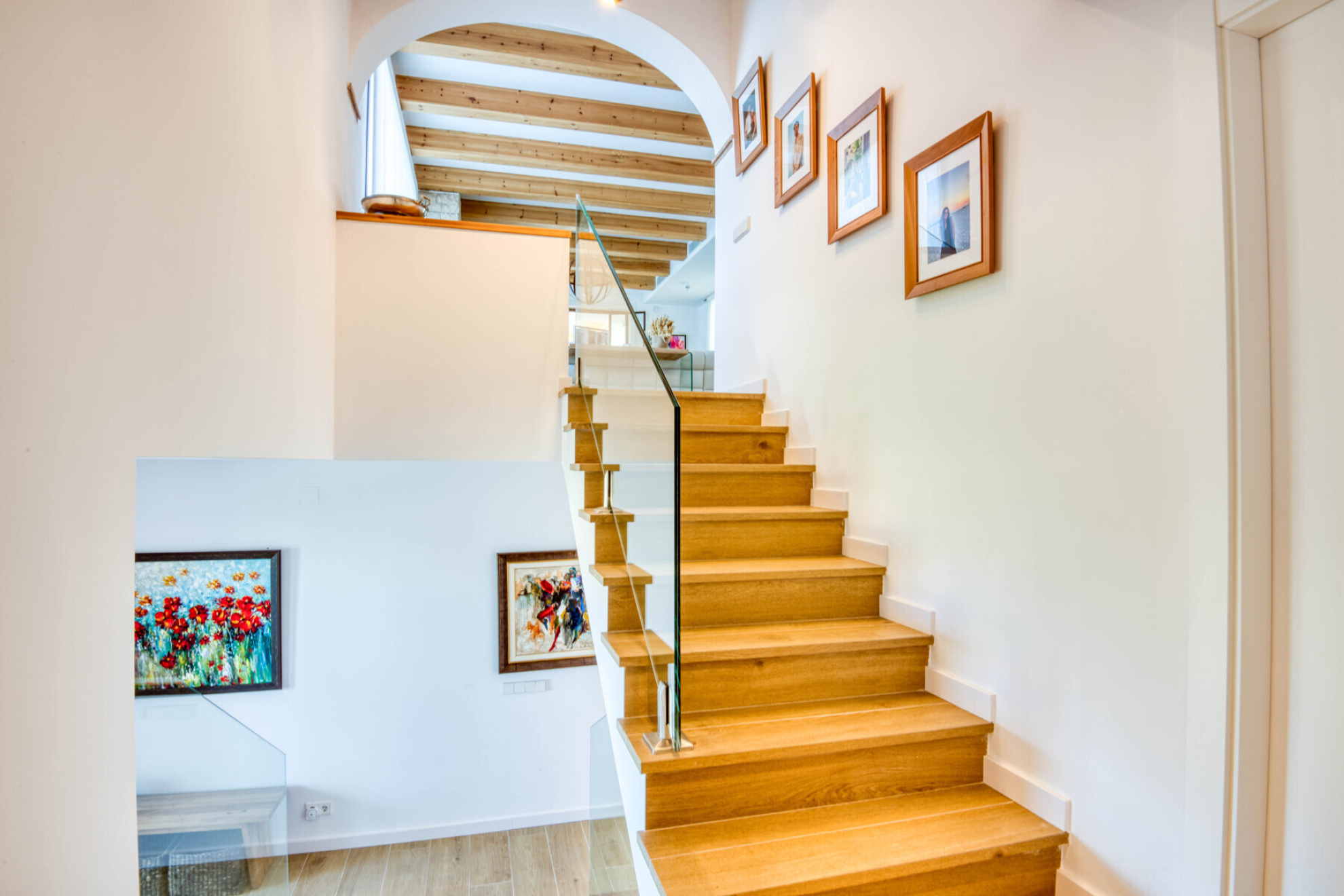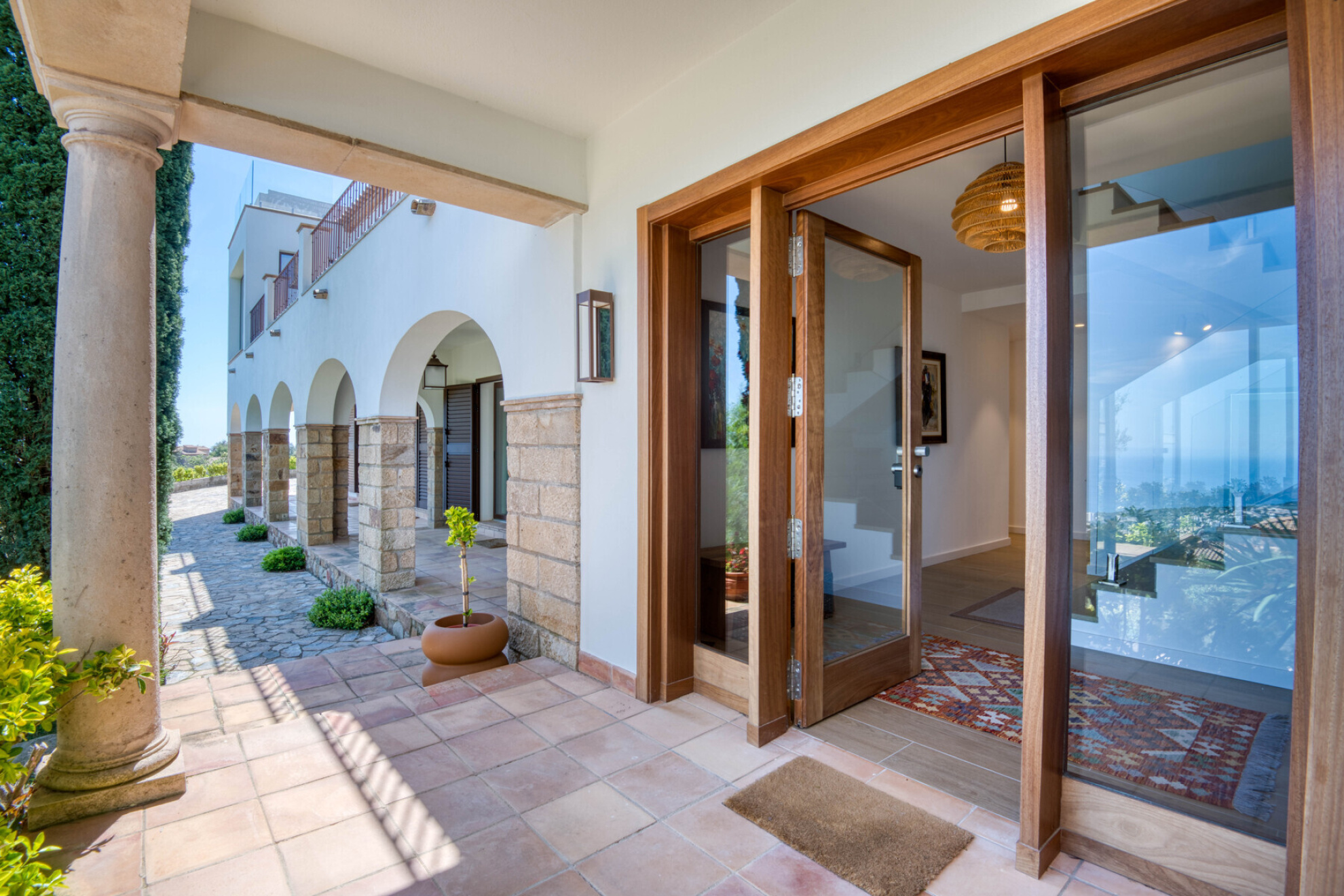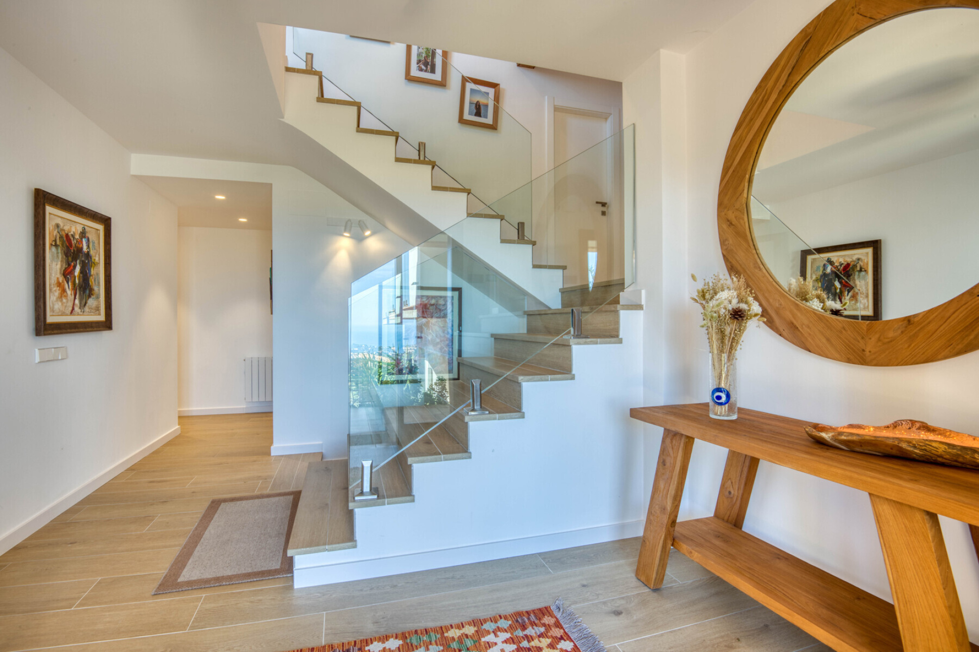 The villa is distributed over two floors. Upon arrival, a ramp leads to the parking area and garage. The main entrance, with an elegant glass door, opens into a bright hallway leading to the sleeping area. This level offers four double bedrooms, two of them with en-suite bathrooms, plus a third full bathroom. All rooms have direct access to a lovely covered porch that surrounds the floor plan, providing beautiful sea views in a quiet and private setting.