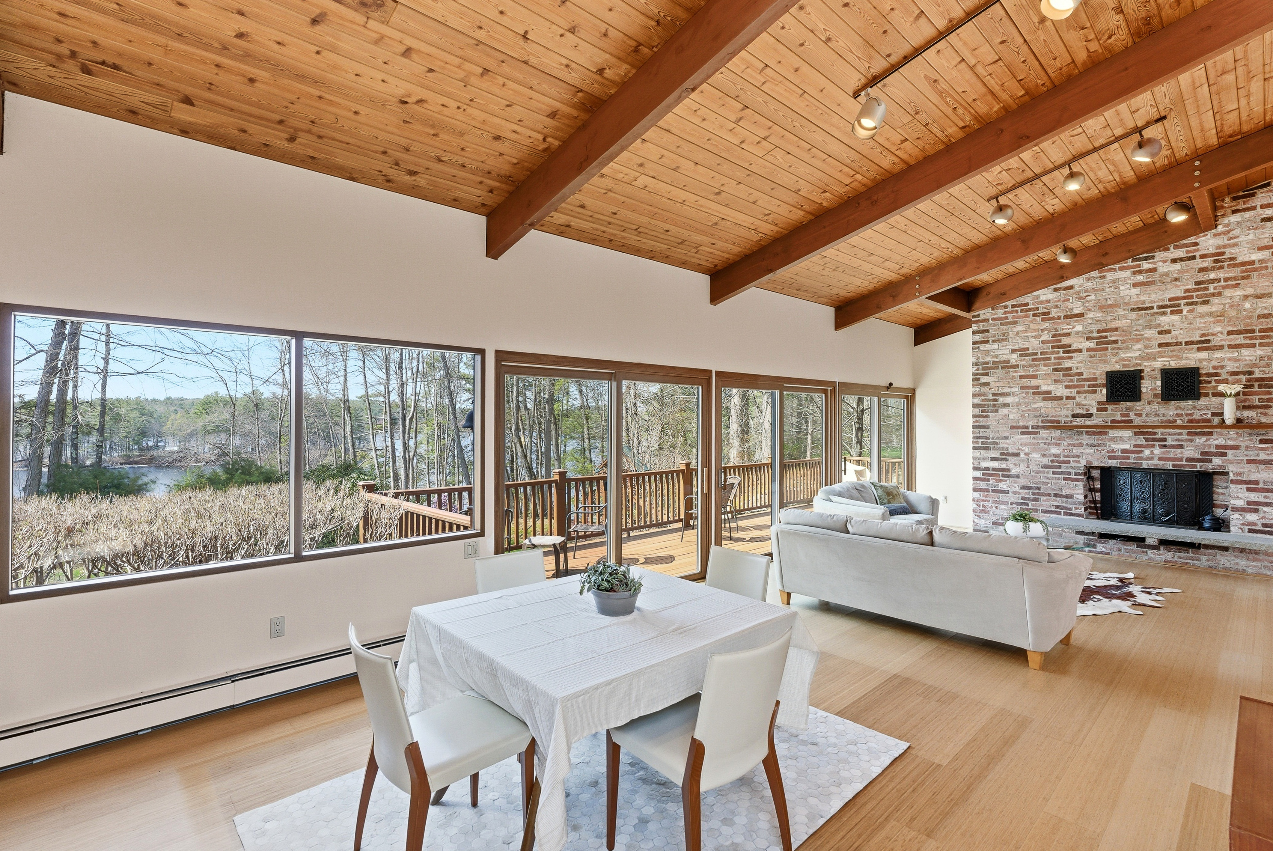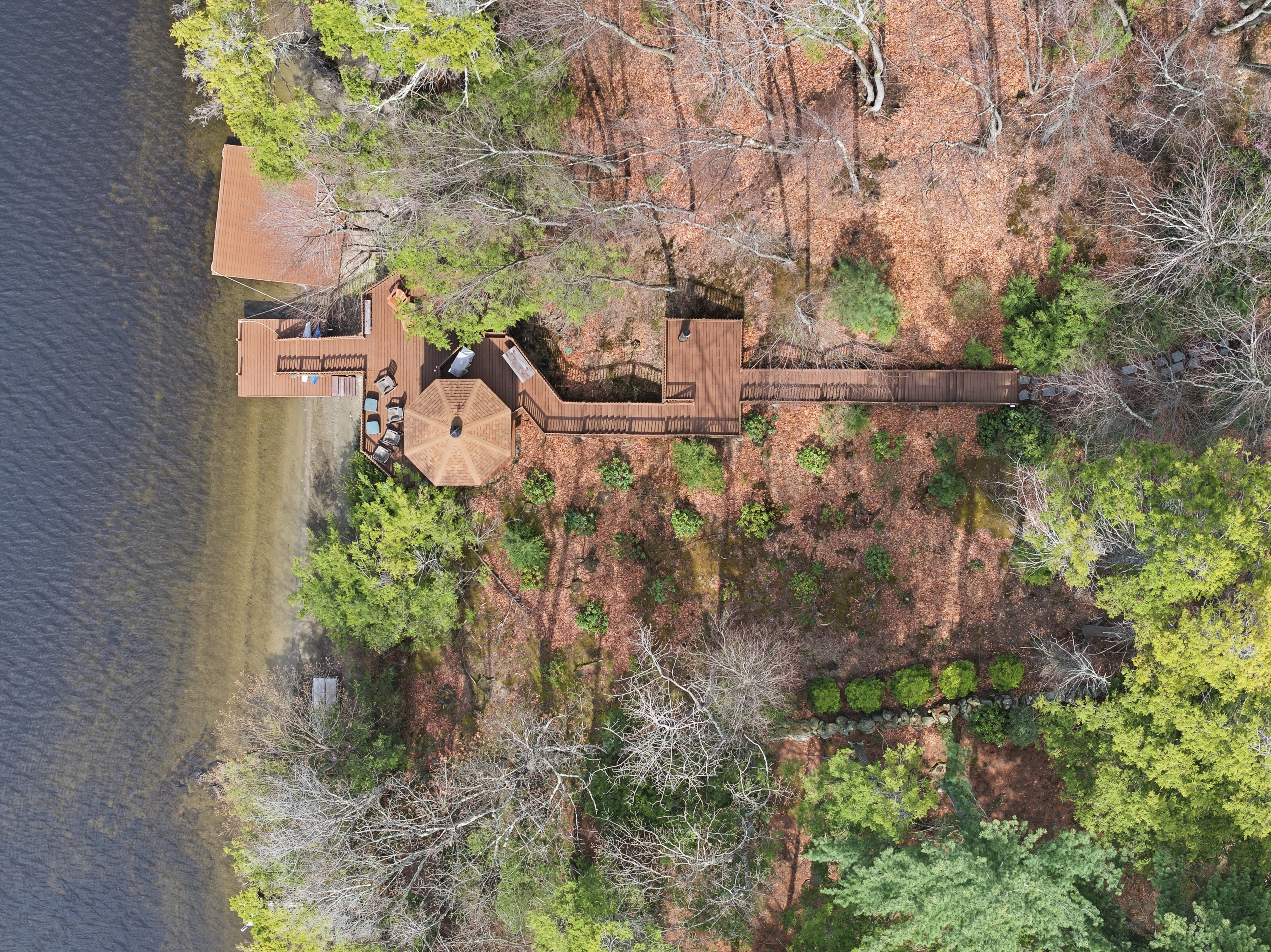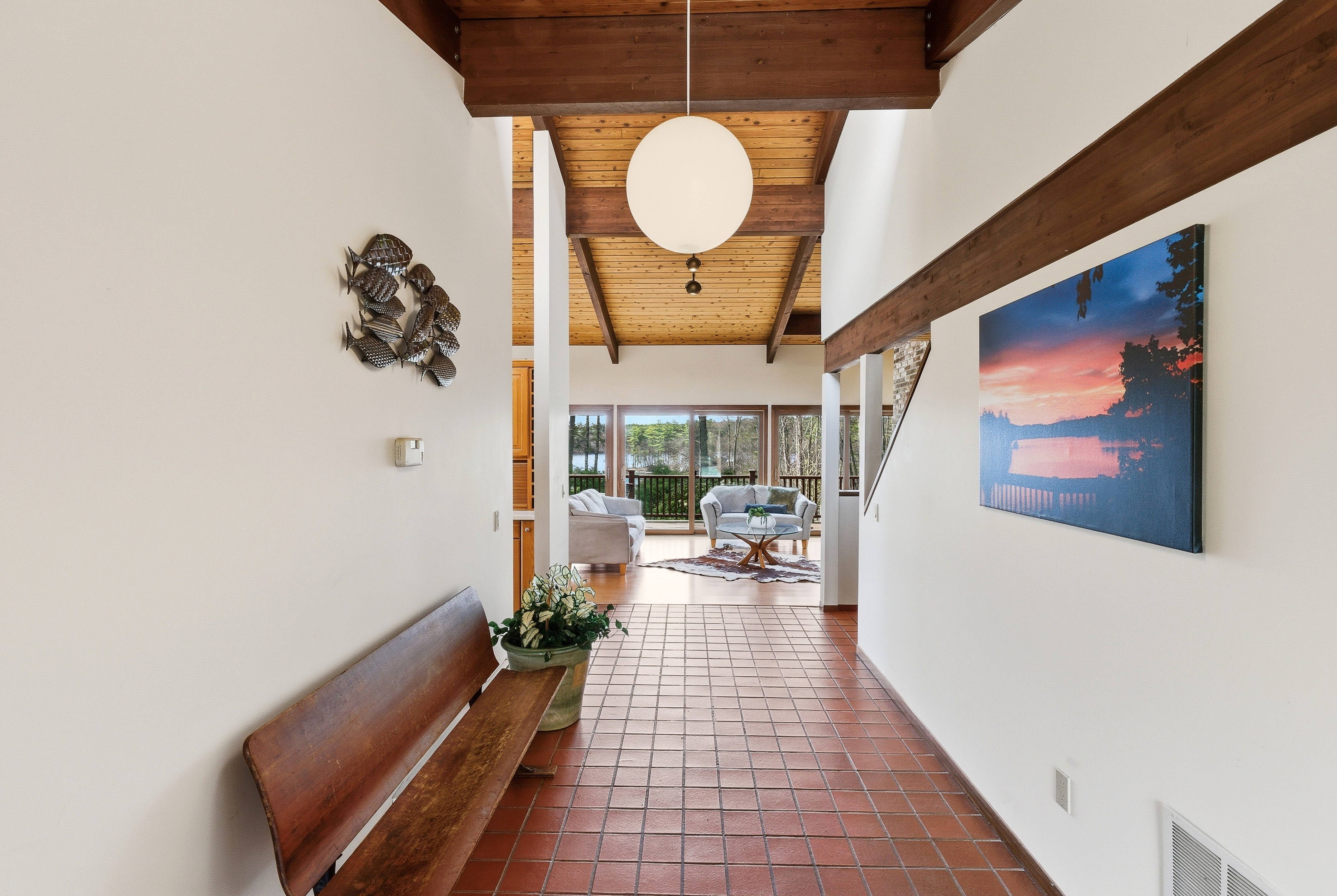Imagine panoramic westerly views over the pond as a part of everyday life. Oversized windows bring in both distant views and property's flora giving a feeling of being wrapped in nature. With meticulous care, the present owners have created inviting spaces for indoor living and entertainment. Cozy places to retreat, quiet spots for in-home offices,plus myriad outdoor play spaces to make this both a vacation and year-around home. The gazebo, tiered steps, pondside storage, "drive thru window" and floating dock (enough for a 20 ft boat) all make this a watersport enthusiast's dream. This stunning property offers versatile, accommodating living owners/guests of varying interests and abilities with options for single-level accessible living. Thoughtful use of high-quality materials and automated systems provides ease of maintenance. The barn is perfect for boat and extra storage.This pondside location cannot be beat with its private glacial silt beach and town/schools a short distance.