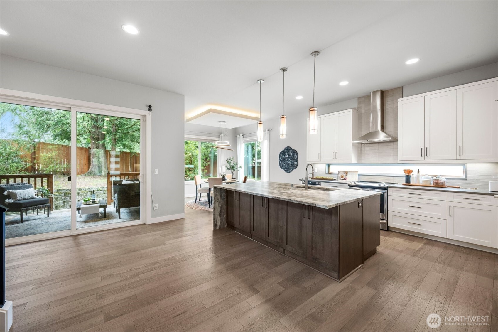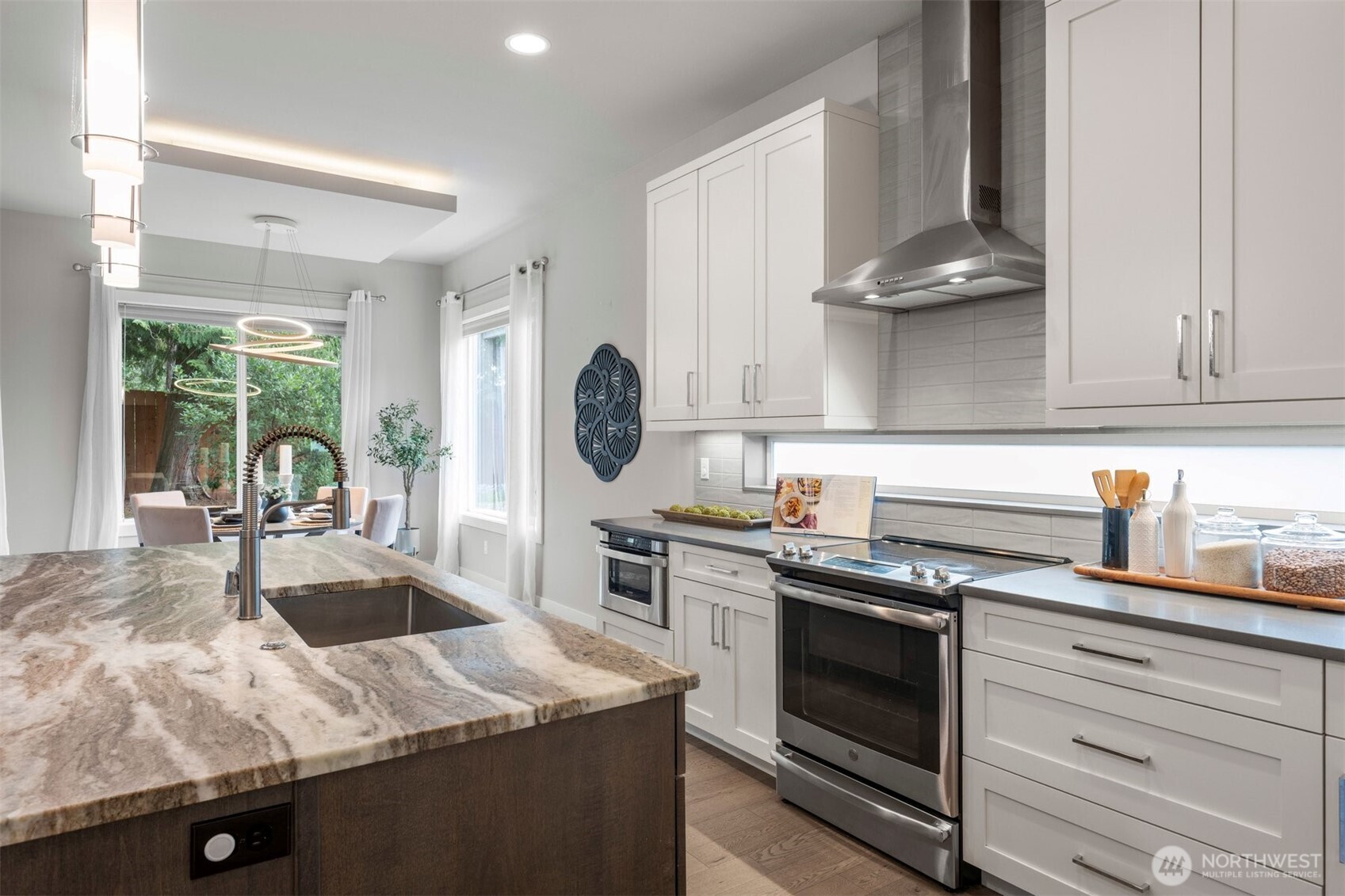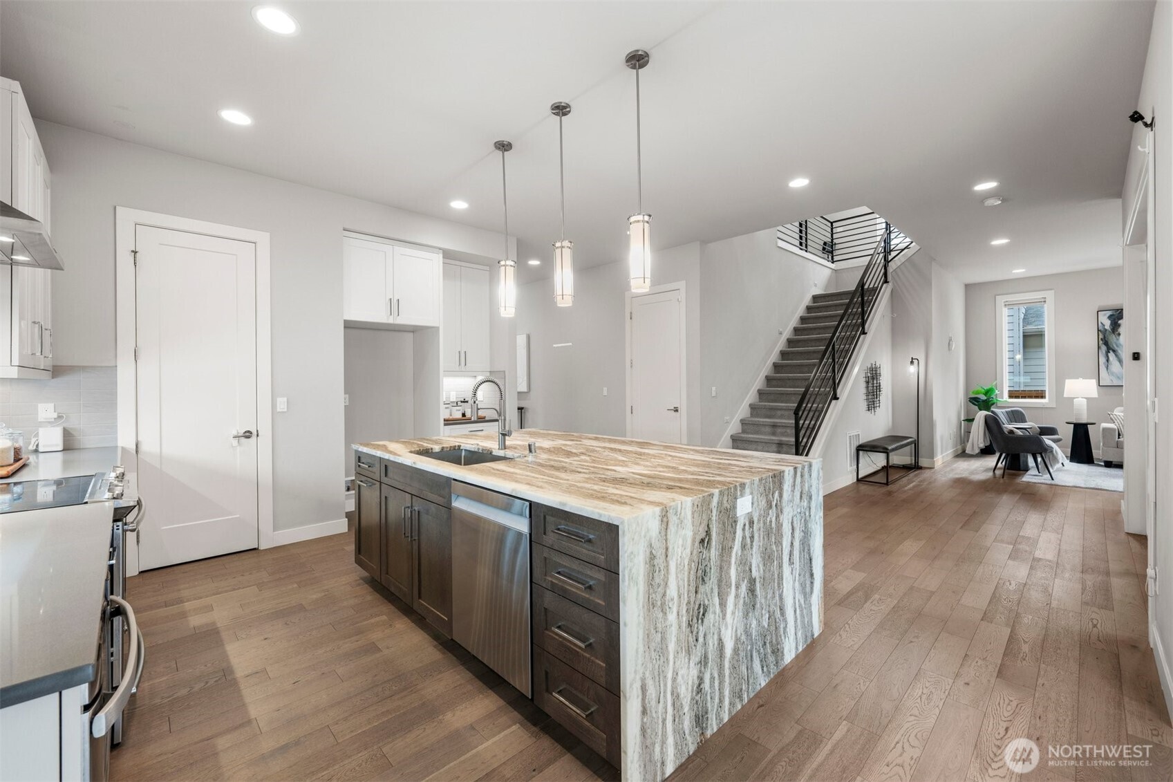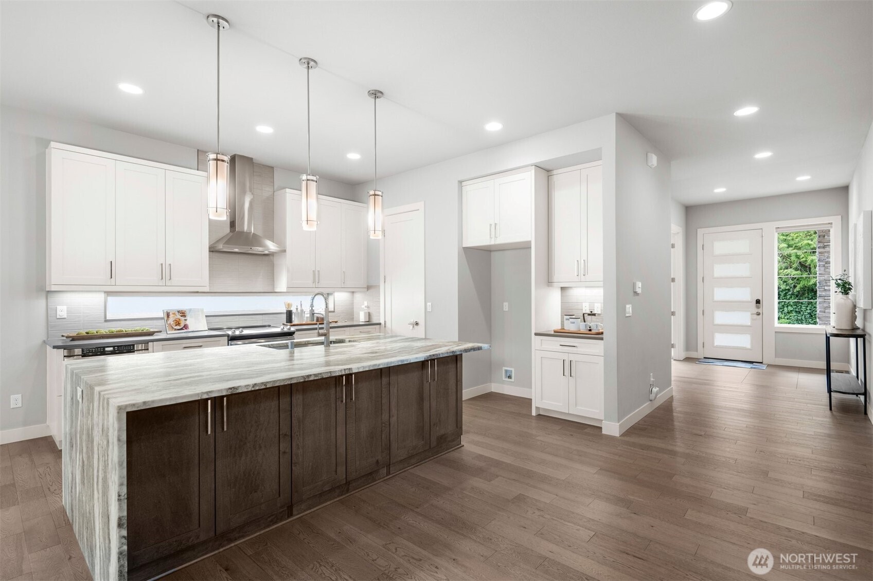 Welcome to this stunning 2017 home in Shoreline's sought after Briarcrest community, offering modern style, soaring ceilings, oversized windows, and an open-concept design filled with natural light. The chef's kitchen is the heart of the home, featuring a huge marble island, custom cabinetry, and beautiful finishes throughout. The extra-large primary suite is a true retreat with a spa-inspired bath, complete with a waterfall shower and separate soaking tub. Central A/C adds year-round comfort. Custom lighting throughout, a downstairs office, and a spacious bonus/media room with high-end projector and surround sound system provide exceptional flexibility. Enjoy effortless entertaining on the patio with a two-sided fireplace and a mounted TV that stays. Complete with a 2-car garage, extra storage, and an easy commute with quick access to I-5 and the new light rail station. This exceptional home blends comfort, function, and style in a prime location.
