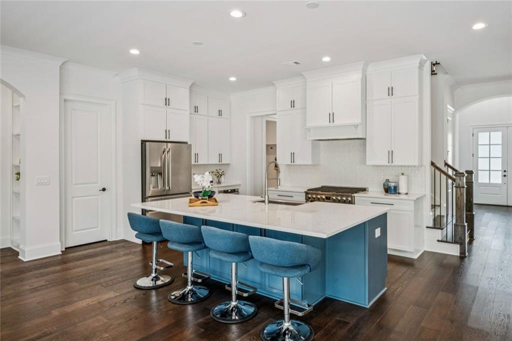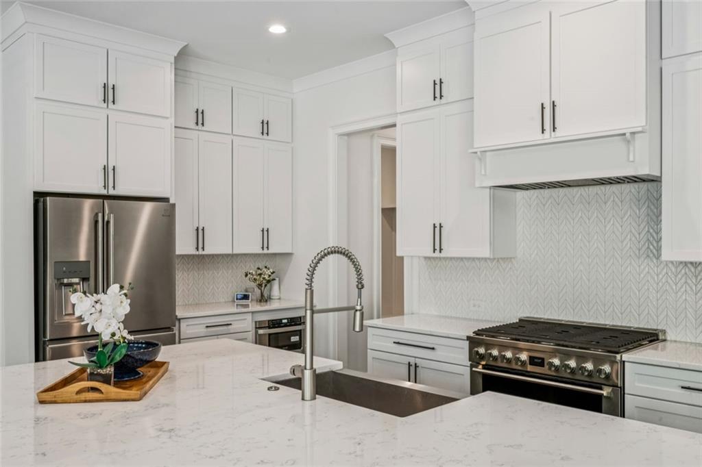 First public resale opportunity in The Enclave on Lavista - Tucker's newest gated community - offering the rare chance to skip the build process without settling for standard builder finishes. Built in 2025 by JW Collection, this Darlington plan offers 4,560 square feet of well-executed living space, including a main-level primary suite, 3-car garage, dual laundry rooms, and an upstairs 17x17 bonus loft. The kitchen is both functional and refined, anchored by an oversized island expanded beyond builder standard with seating for six, a Kohler apron-front sink, and Carrara Lumos quartz countertops. A full Electrolux appliance suite includes a 36 dual-fuel range, counter-depth French door refrigerator, microwave drawer, and dishwasher, complemented by a floor-to-ceiling herringbone backsplash. A butler's pantry under the stairs adds a built-in wine cooler and additional prep space. Wide-plank 6.5 French white oak hardwoods run throughout the main level. The great room features a custom cedar boxed-beam mantel, shiplap fireplace surround, and floating shelves stained to match. A private study with French doors offers a dedicated work-from-home space, while matte black hardware is carried consistently throughout for a cohesive finish. The primary suite on the main level includes a fully upgraded bath with dual showerheads including a rain feature, frameless glass enclosure, a custom vanity layout with added cabinetry, and floor-to-ceiling Statuario marble-look tile with a mosaic shower floor. Upstairs, four bedrooms each include a private bath, along with a guest suite featuring a sitting area and walk-in closet. A spacious bonus/loft offers flexible use, and a full second laundry room serves the upper level. Each bath features its own curated tile selection. The backyard has been thoughtfully completed beyond builder delivery, with a paver patio, stone retaining wall, tiered yard, and private fire pit - fenced and backed by mature trees. The Enclave on Lavista is a gated community in Tucker, GA with a playground, covered pavilion, community fire pit, and dog park, with access to Midvale Elementary. Convenient to I-285, I-85, Emory University, Children's Healthcare of Atlanta, CDC, and downtown Tucker and Decatur.