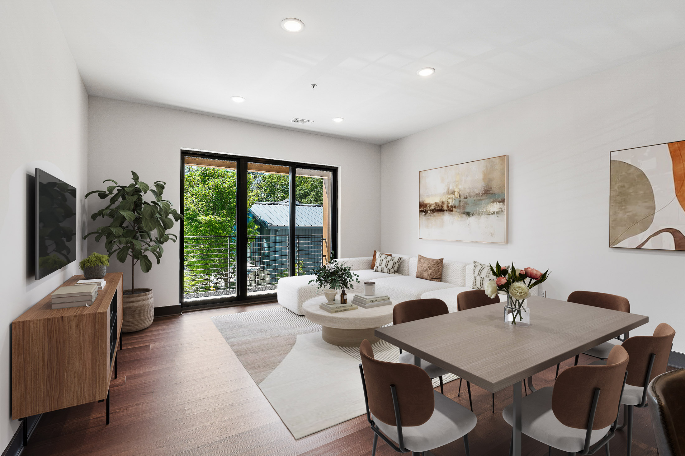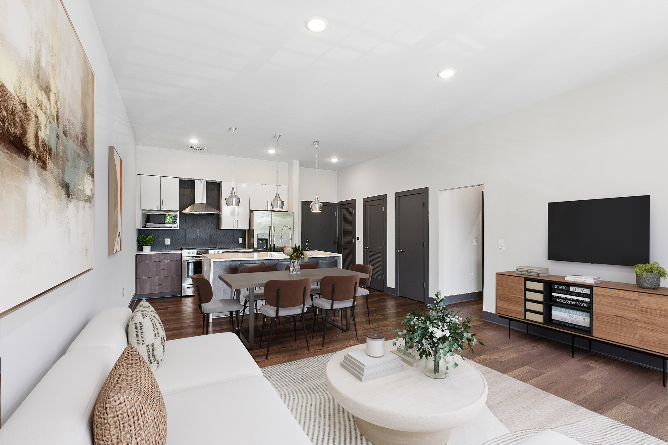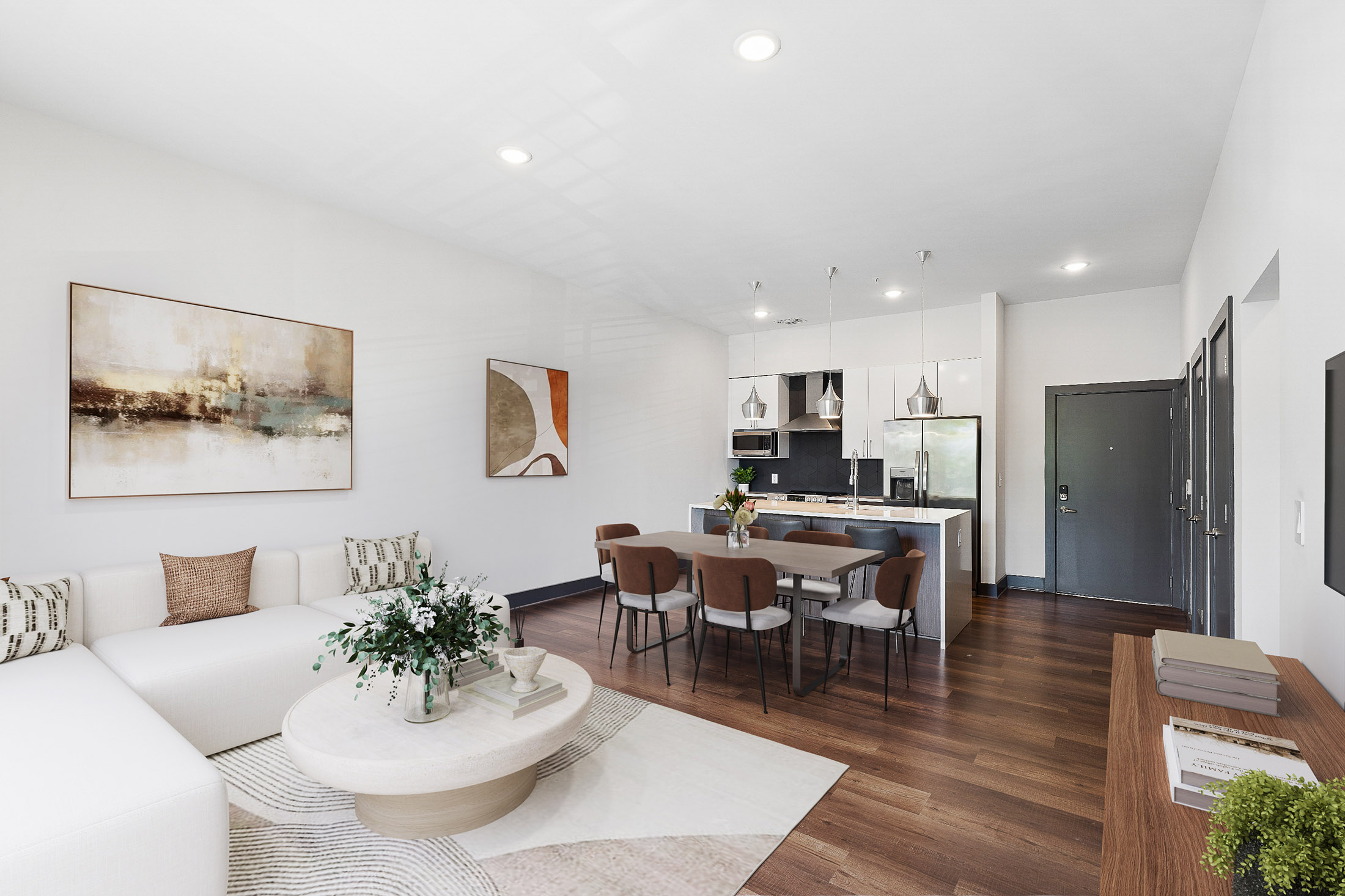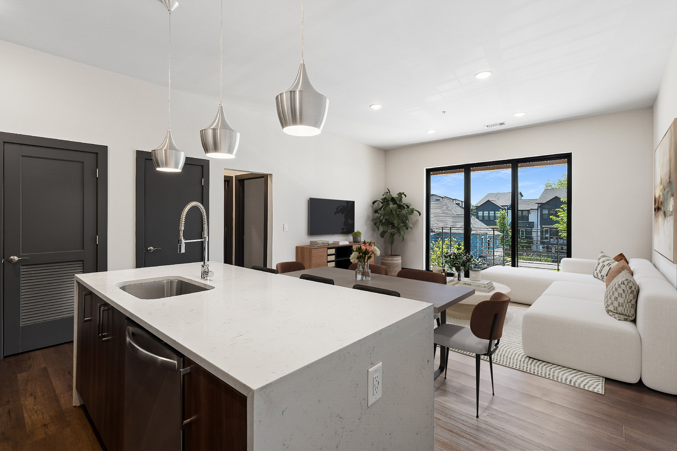 Experience elevated living in this beautifully designed residence at Pullman Flats, ideally positioned in the heart of Kirkwood directly across from Pullman Yards, a 27-acre destination known for its rotating art exhibits, live events, concerts, dining, and outdoor gathering spaces. Built in 2022, this home features 10-foot ceilings and a bright open layout that feels both modern and inviting. The kitchen stands out with quartz countertops, sleek cabinetry, stainless steel appliances, and a generous island that flows naturally into the living and dining areas, creating a comfortable space for everyday living and entertaining.