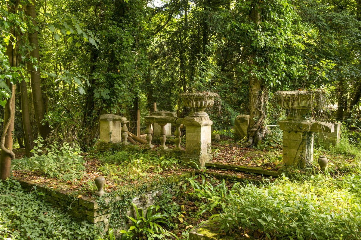 To the north of the house lies a range of dilapidated stone outbuildings, substantial in size and once forming stables with groom's accommodation over, a squash court, dairy with former living accommodation above and various storerooms. Further north, close to the former orchard, is a swimming pool (disused). To the south and below the house is an 'Ice House'. A steel frame for a large agricultural storage building has been erected in the woodland to the north.