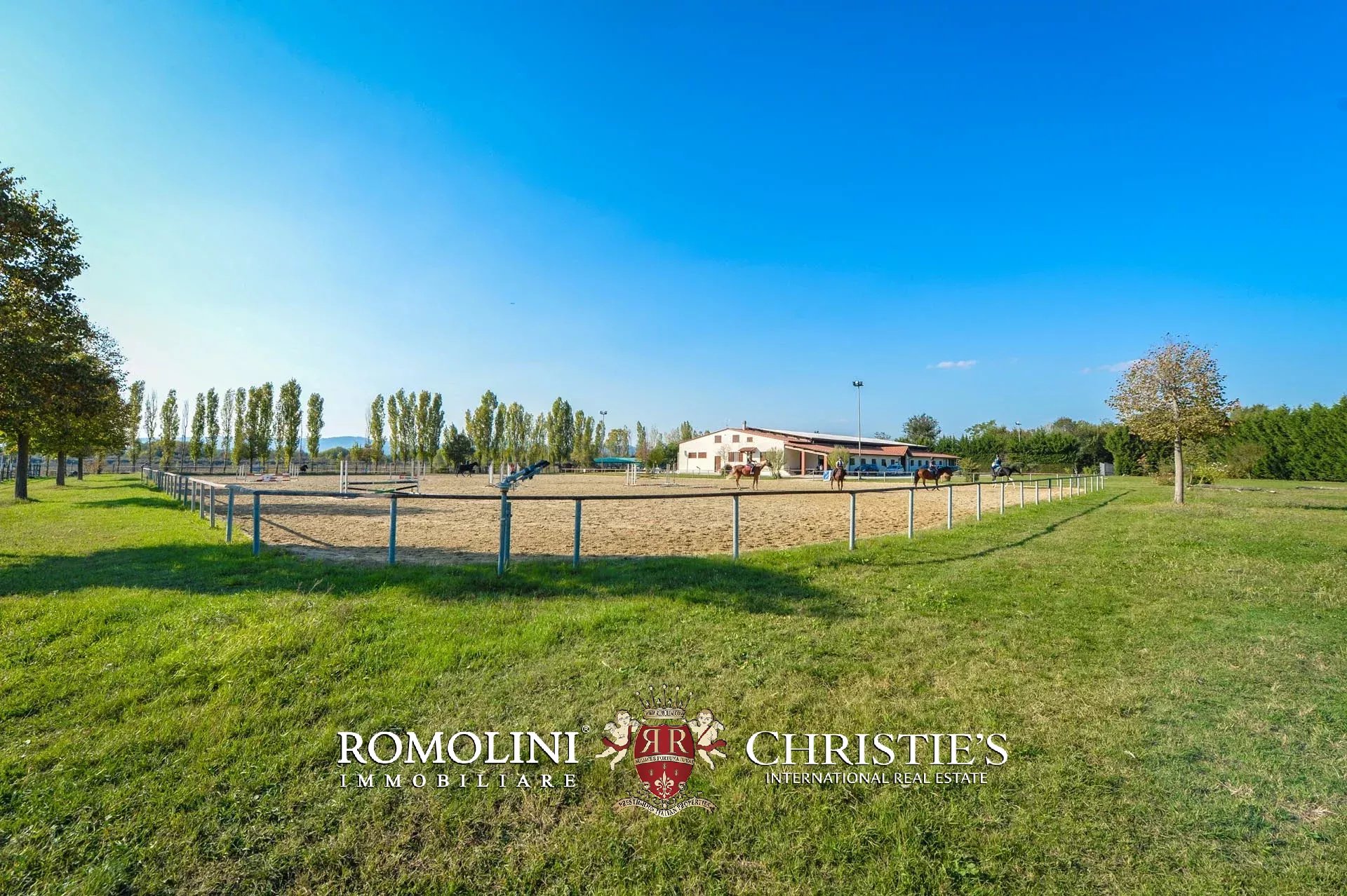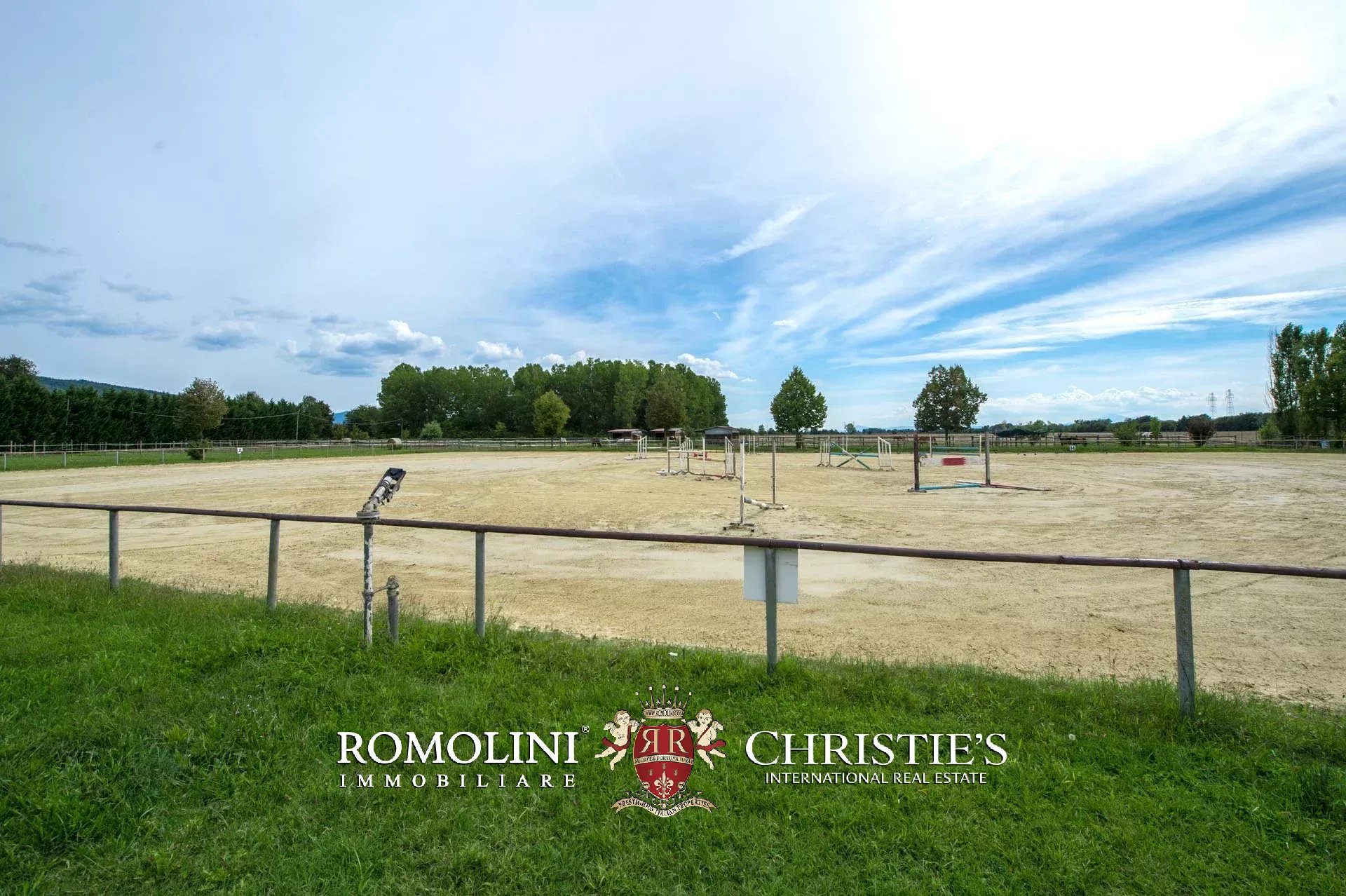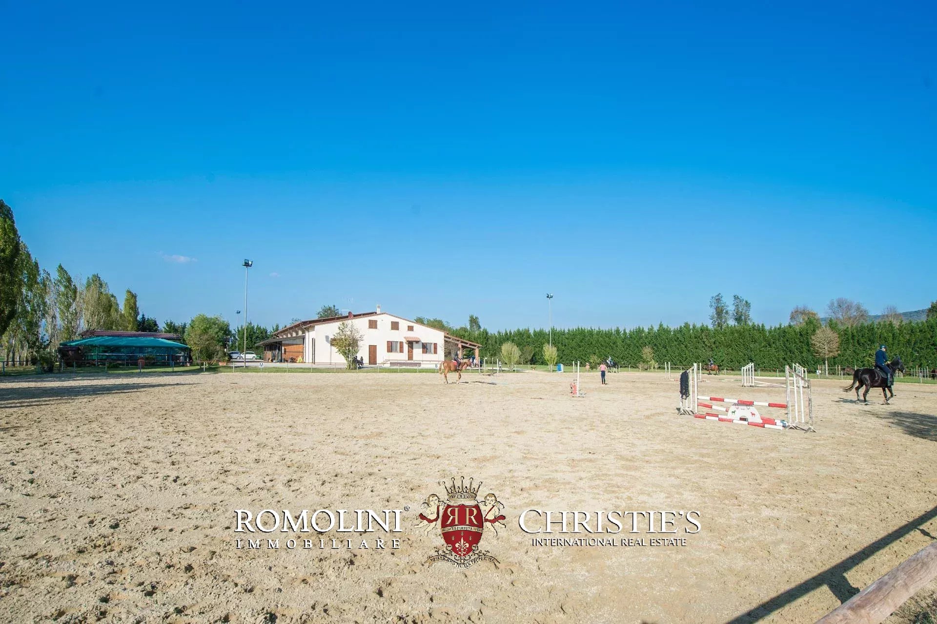 Not far from Arezzo, in Tuscany, equestrian estate for sale. The main building of the property is a modern stable (1,900 m² – 20,444 ft²) with an ample covered training arena (20 × 46 m). 21 horse stalls are located on the longer sides of the building. On one of the short sides are located the offices, a club house for meetings, a refectory, a barn and a storage room.