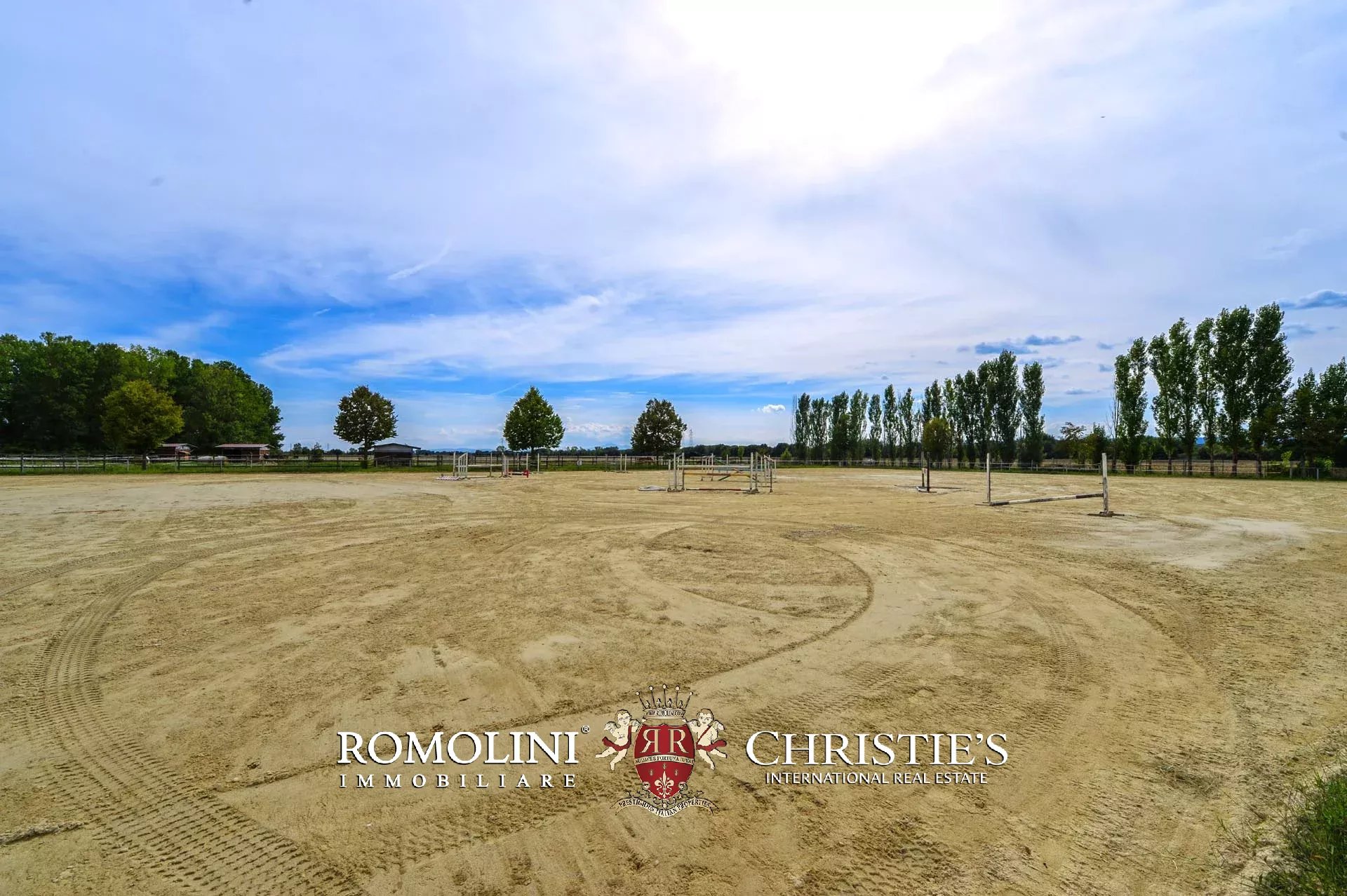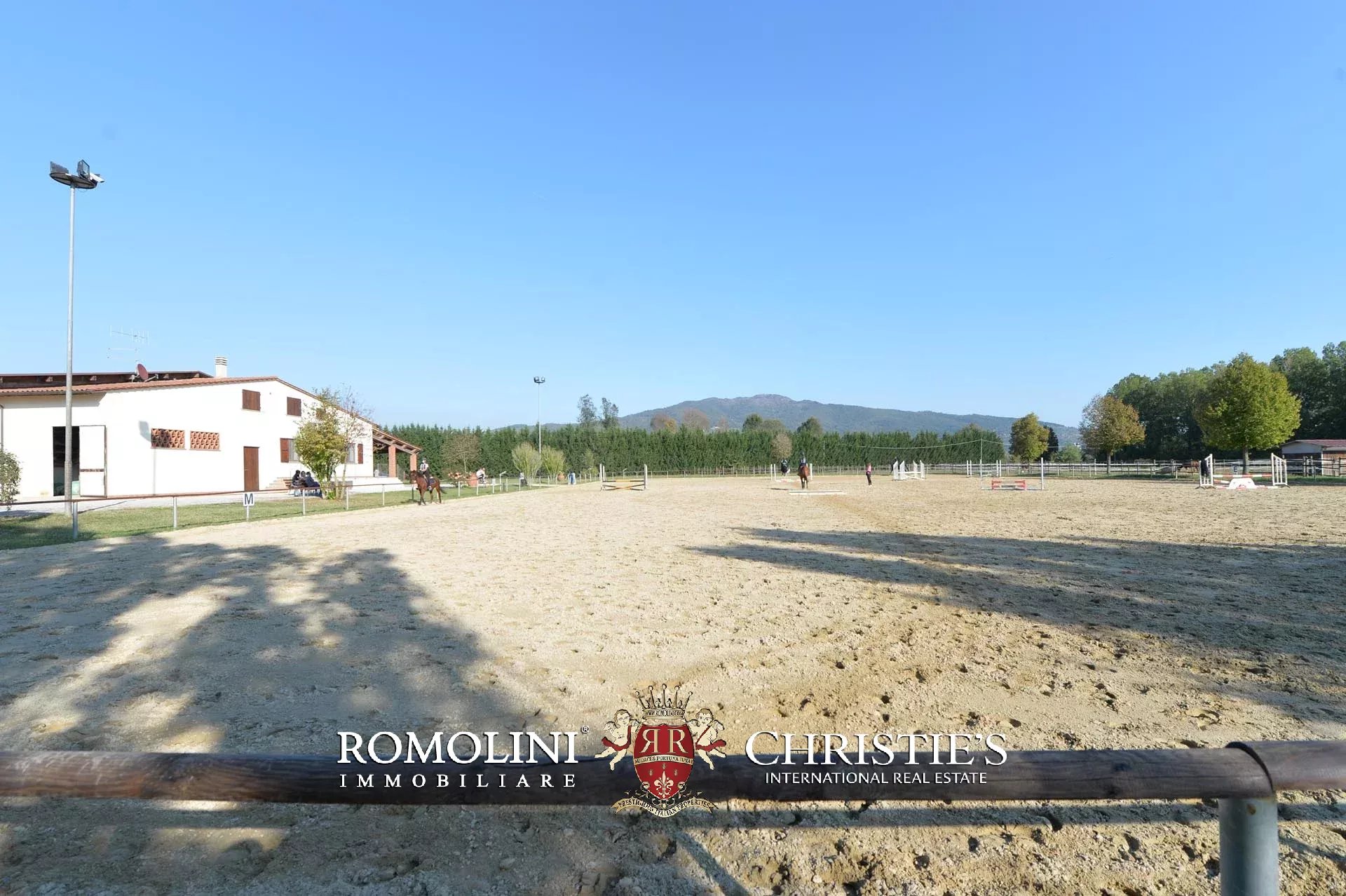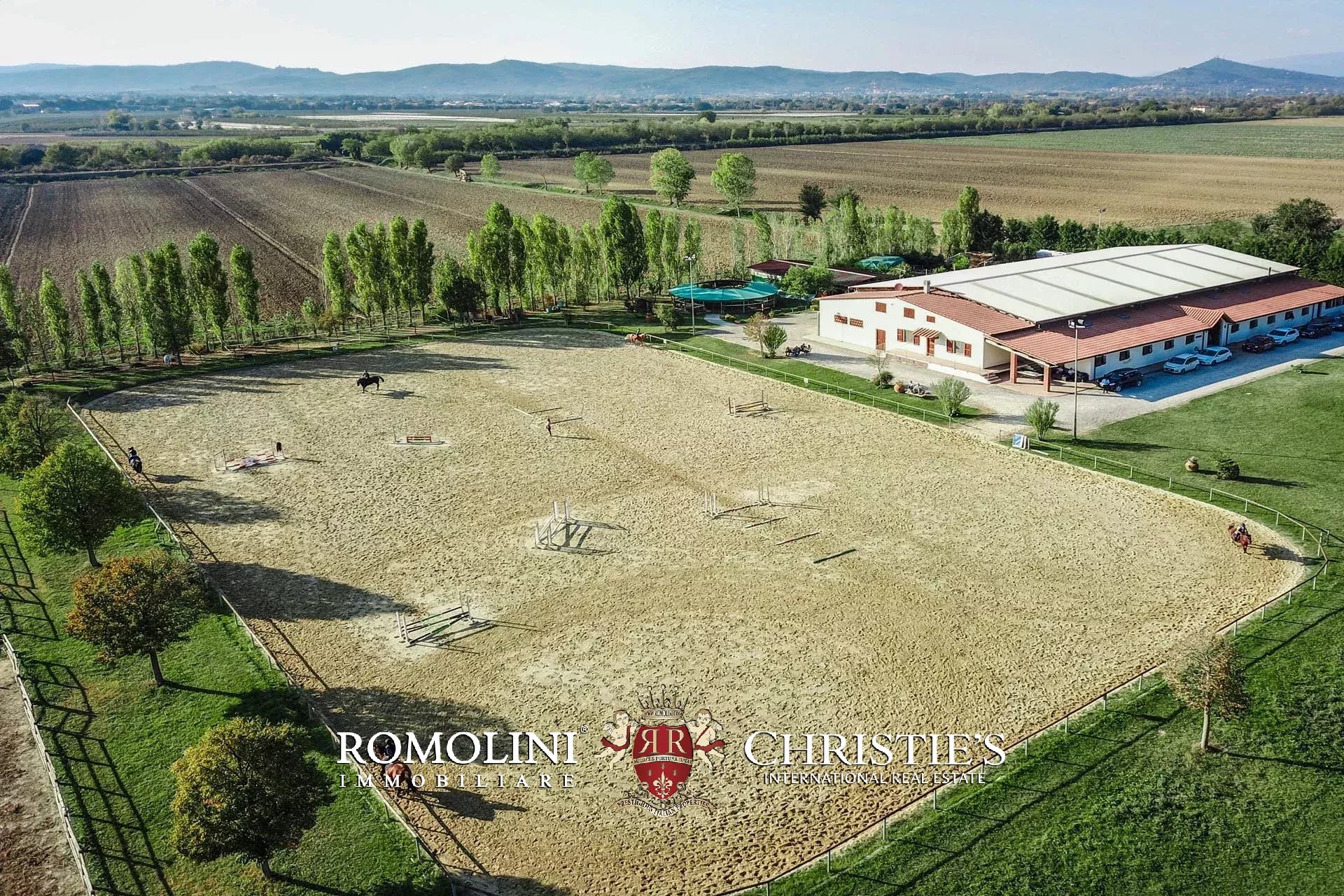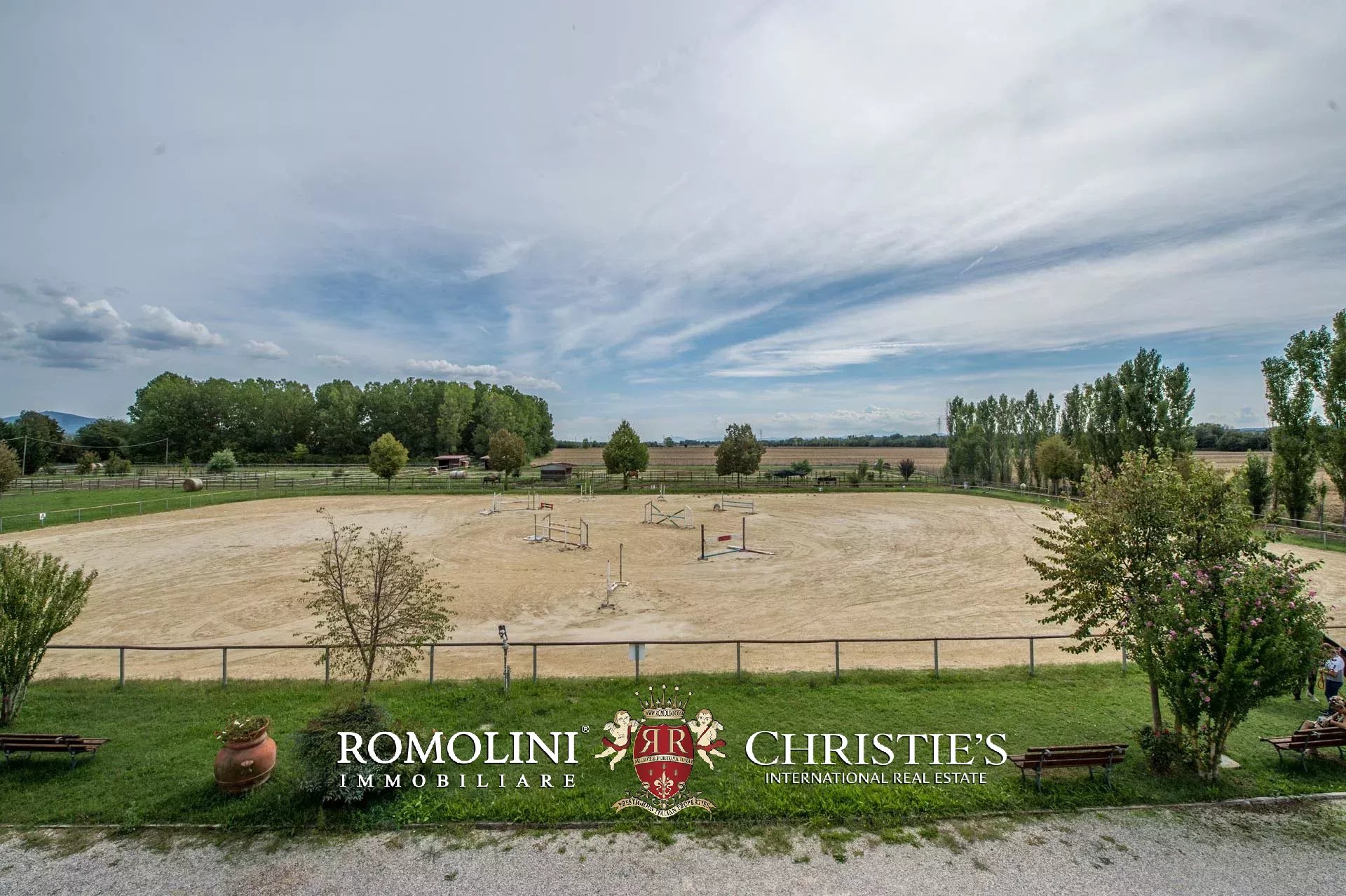 Not far from Arezzo, in Tuscany, equestrian estate for sale. The main building of the property is a modern stable (1,900 m² – 20,444 ft²) with an ample covered training arena (20 × 46 m). 21 horse stalls are located on the longer sides of the building. On one of the short sides are located the offices, a club house for meetings, a refectory, a barn and a storage room.