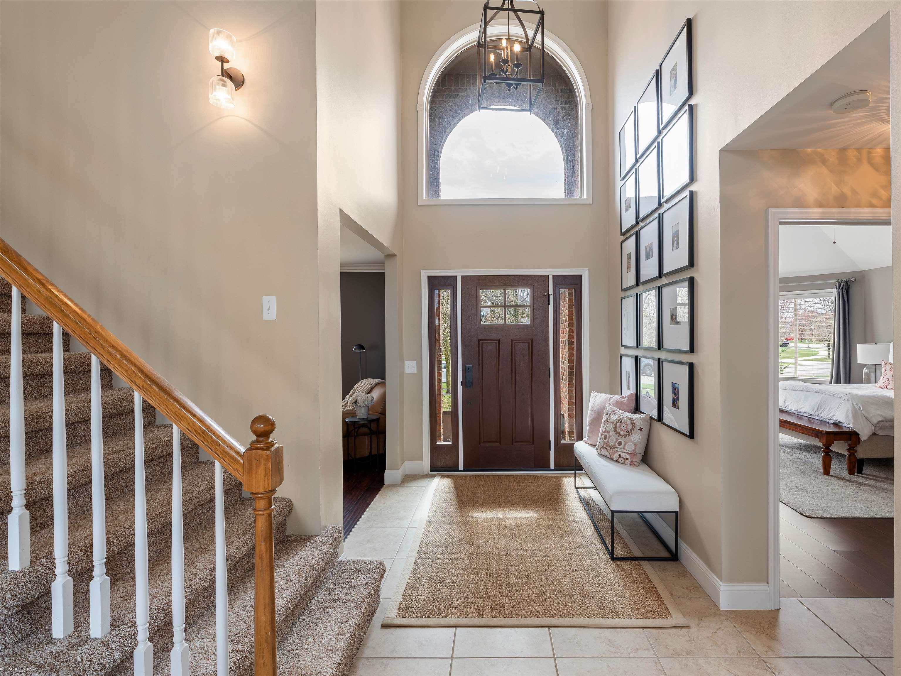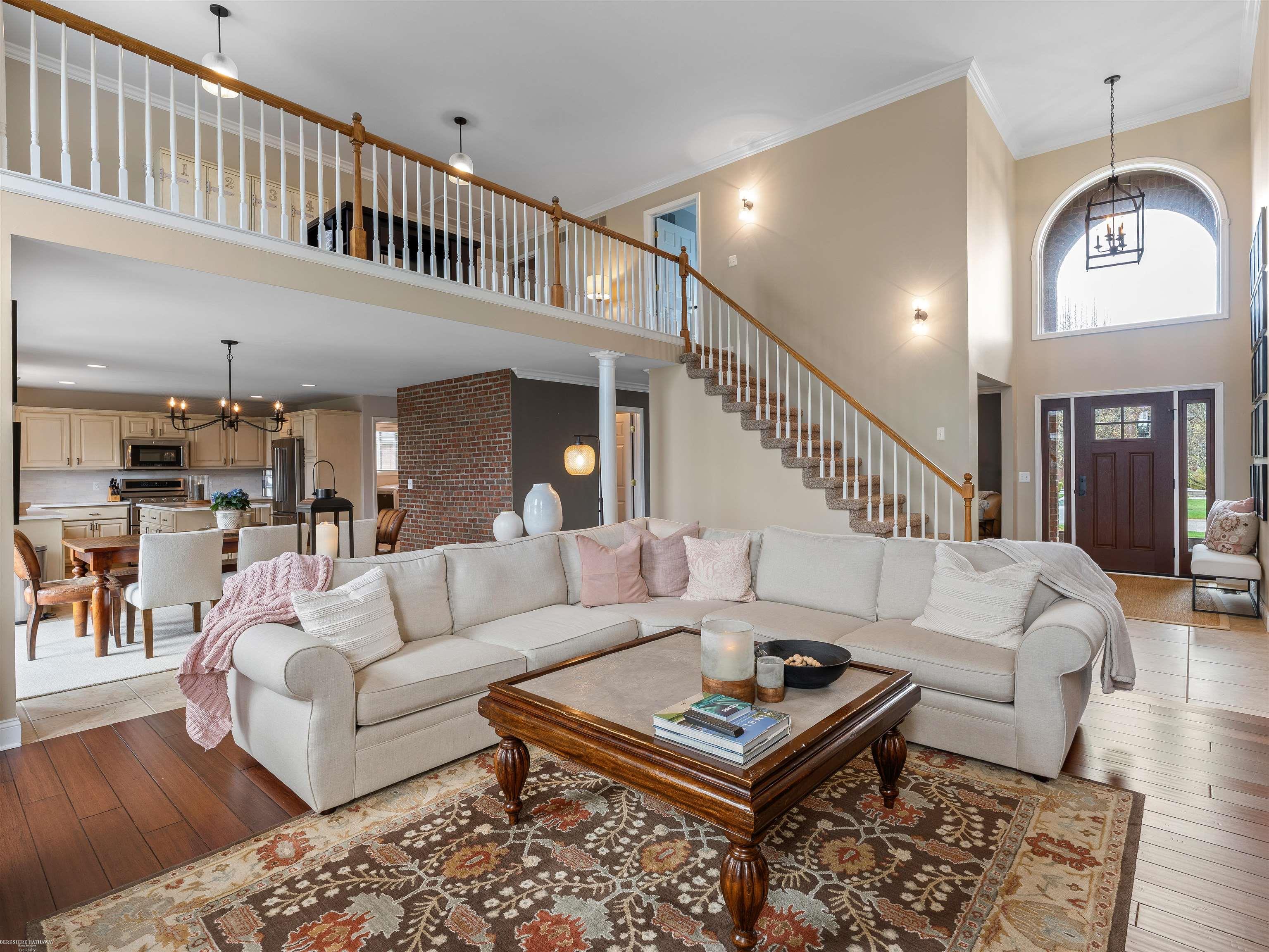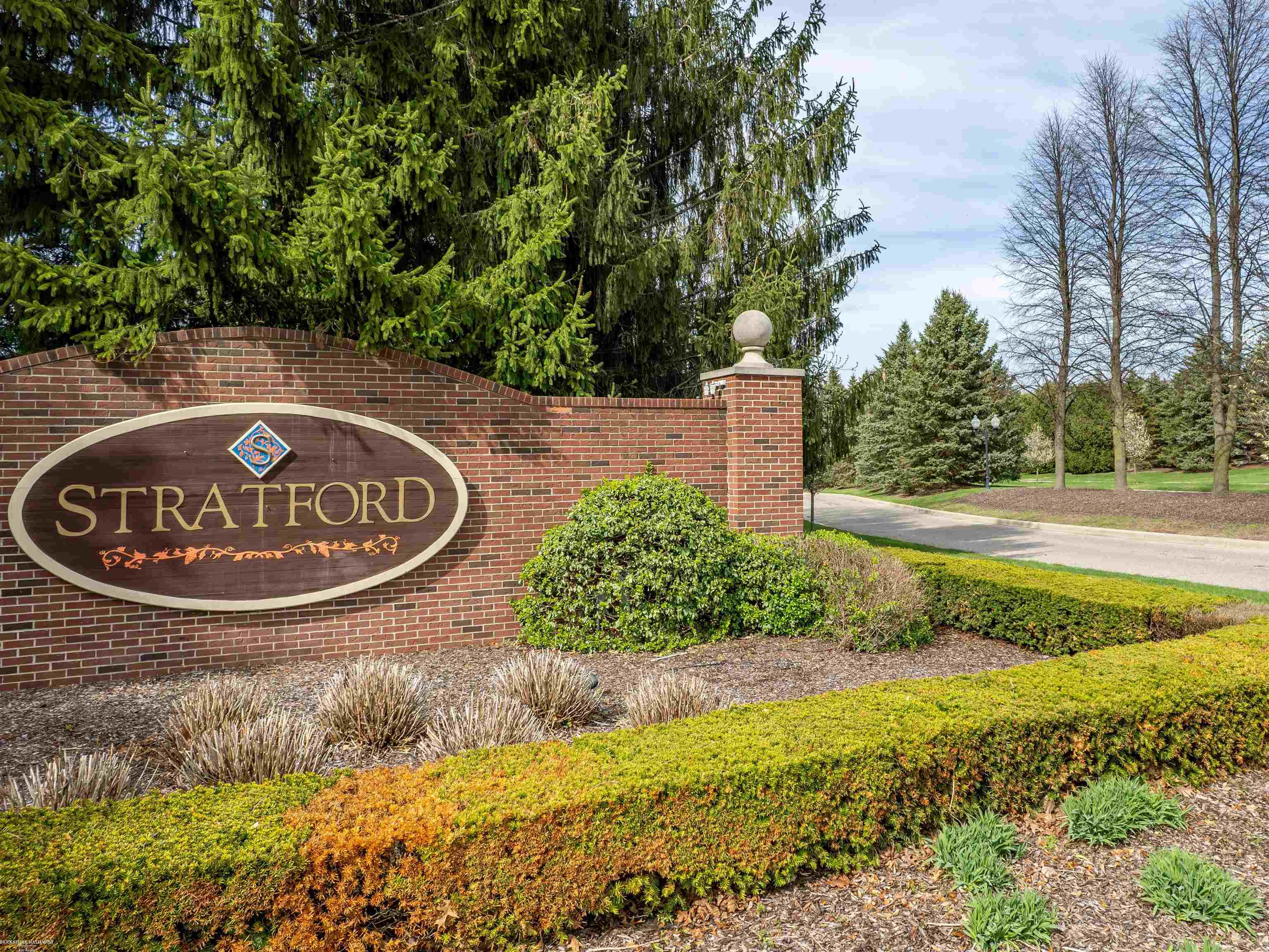 Welcome to this beautifully maintained 5 bedroom home in the highly sought-after Stratford Subdivision offering comfort, style, and functionality. The newly added front door leads to dramatic 2-story entry and the expansive Great Room is designed to impress. Rich Brazilian cherry engineered wood flooring enhances the library/den, 1st floor Primary Suite and spacious large Upper Bedroom that features a charming Cape Cod window & walk-in closet. Quartz and granite counters throughout. Soaring ceilings, crown moldings, recessed lighting and a grand staircase with a huge open loft. The kitchen showcases Lafata cabinetry, island, 2 lazy Susan's and a pantry. Eating area has doorwall access to stamped concrete patio. 1st floor laundry with upper cabinetry 2020. The 1st floor Primary Suite has large bay window, updaed bath in 2023 with dual sinks & rain shower & hand held sprayer. Main bath updated with slate and tile in 2023. Finished basement expands the living space with a 5th Bedroom, full Bath, Family Room, Office, Workout Area and storage. Enjoy 2 ponds with fountains in sub with paved paths leading to public park.