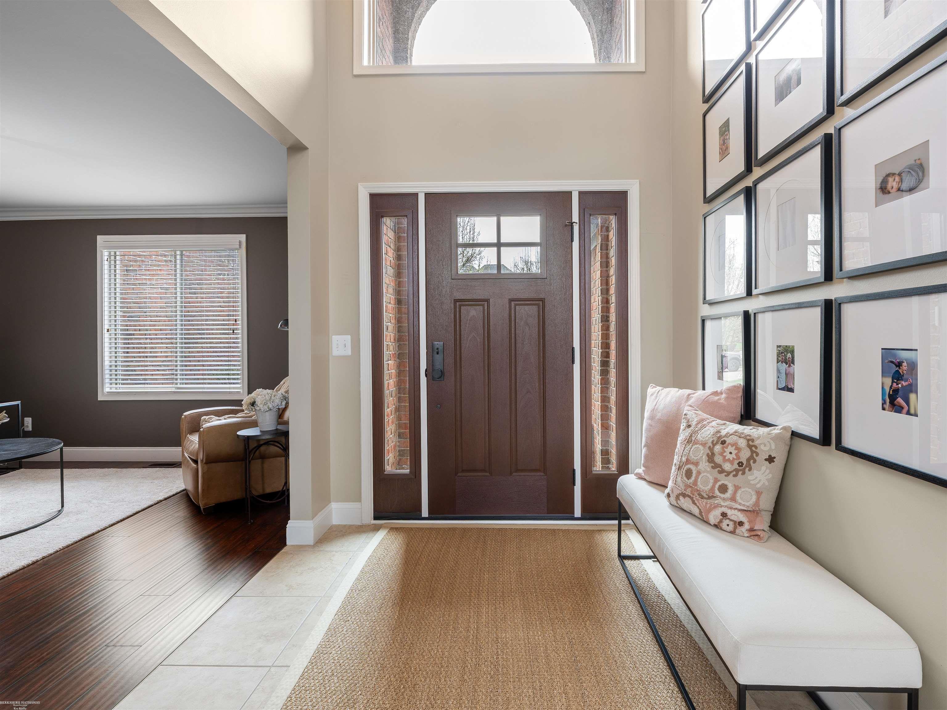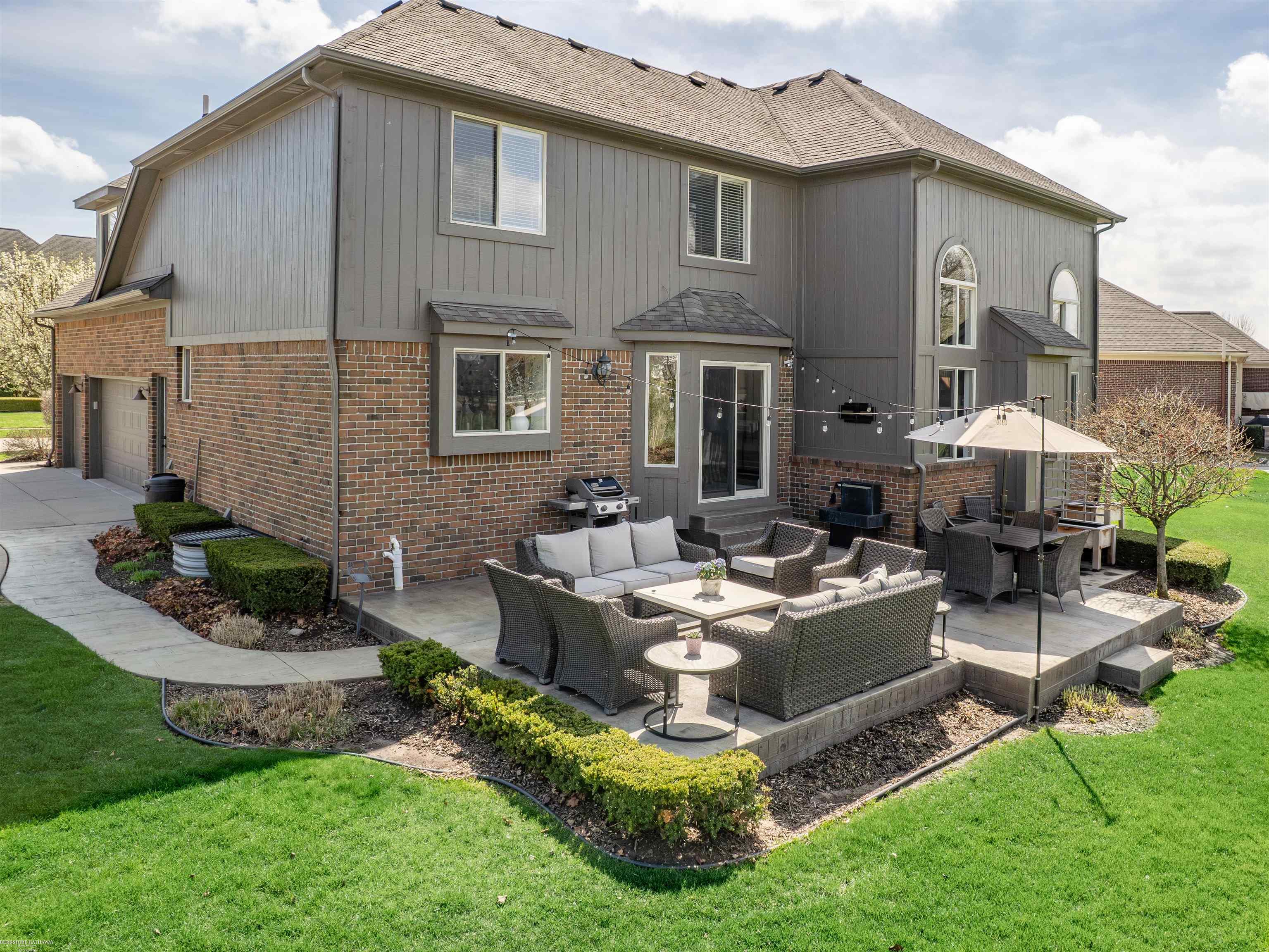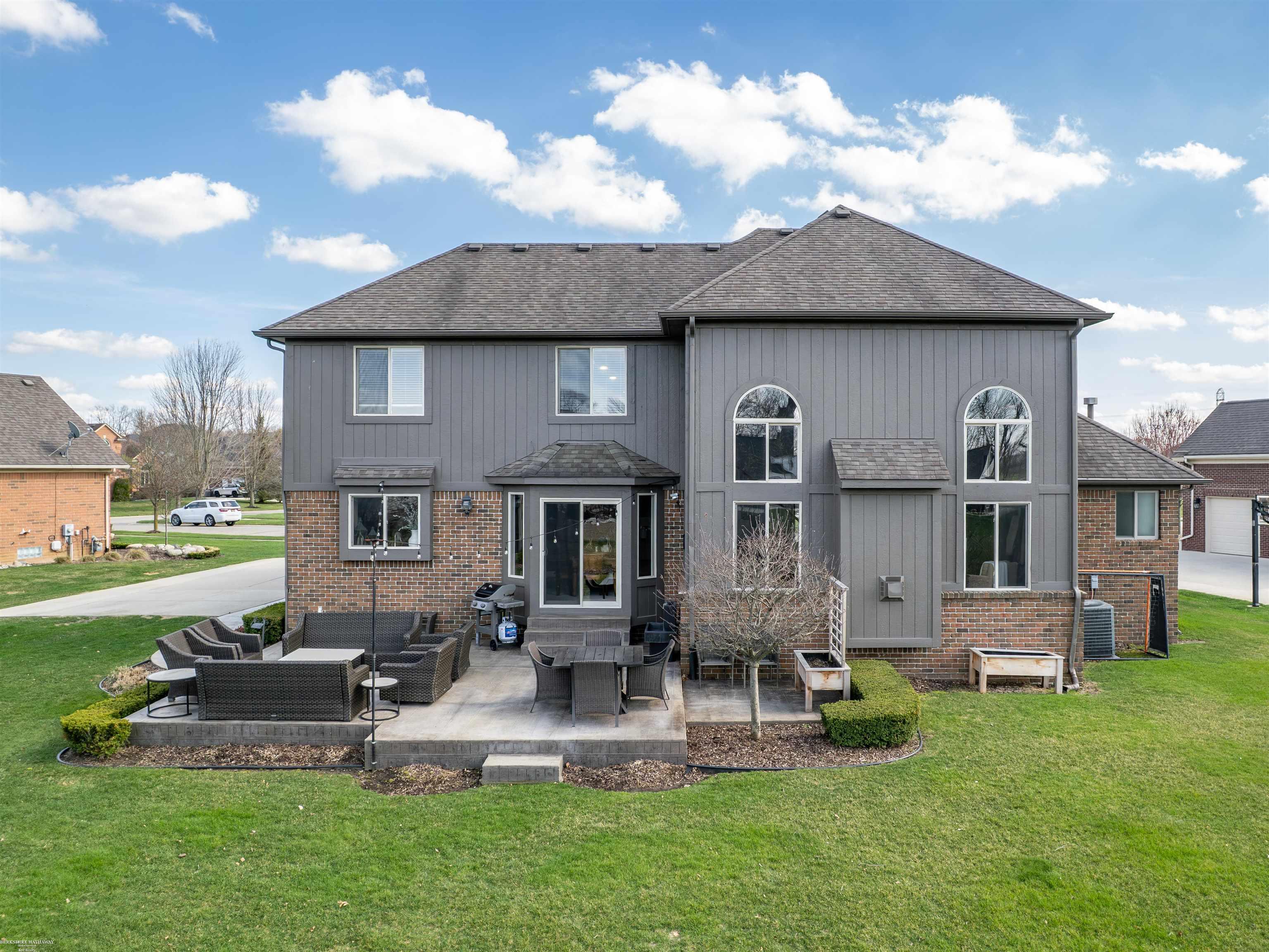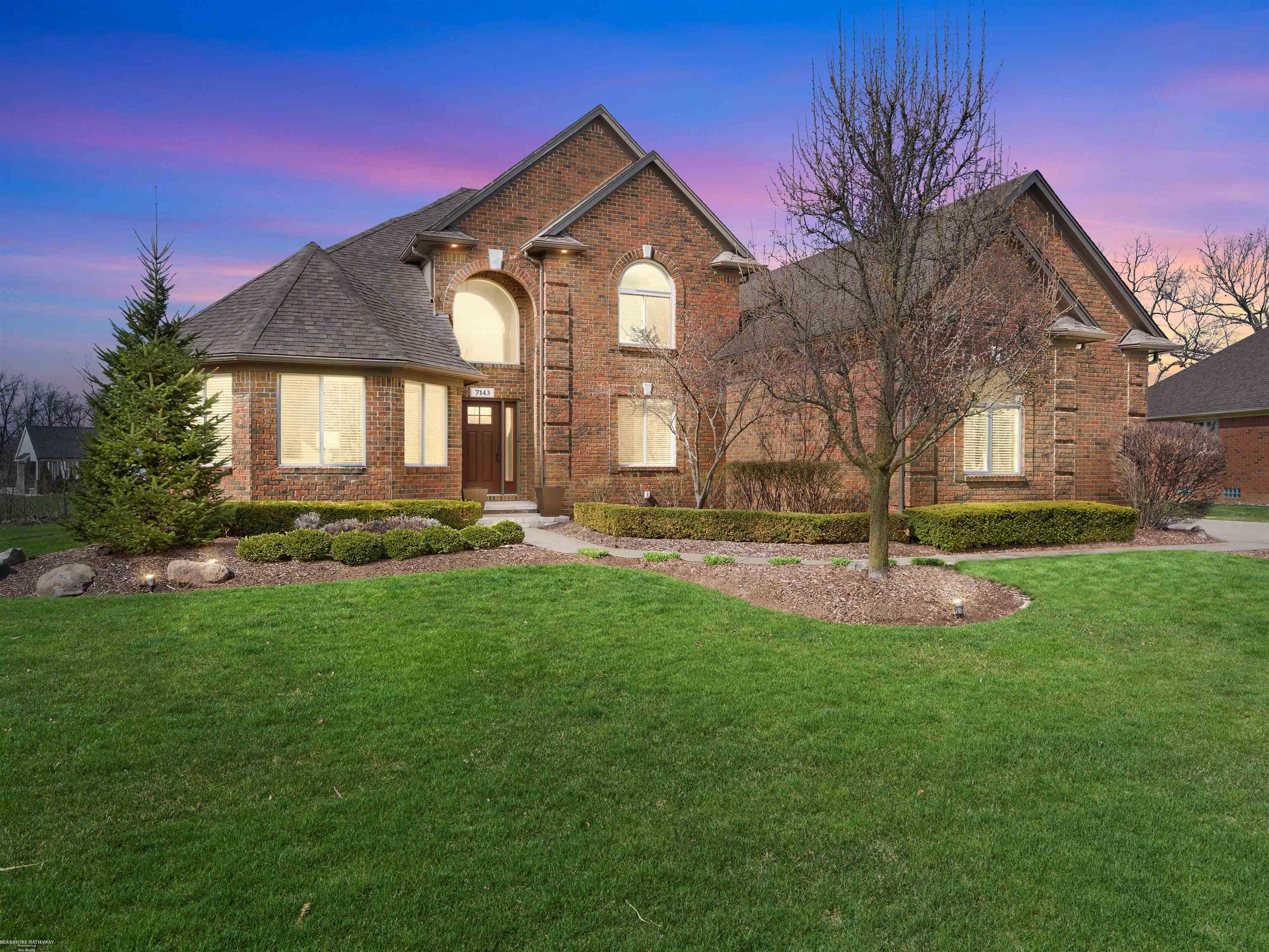 Welcome to this beautifully maintained 5 bedroom home in the highly sought-after Stratford Subdivision offering comfort, style, and functionality. The newly added front door leads to dramatic 2-story entry and the expansive Great Room is designed to impress. Rich Brazilian cherry engineered wood flooring enhances the library/den, 1st floor Primary Suite and spacious large Upper Bedroom that features a charming Cape Cod window & walk-in closet. Quartz and granite counters throughout. Soaring ceilings, crown moldings, recessed lighting and a grand staircase with a huge open loft. The kitchen showcases Lafata cabinetry, island, 2 lazy Susan's and a pantry. Eating area has doorwall access to stamped concrete patio. 1st floor laundry with upper cabinetry 2020. The 1st floor Primary Suite has large bay window, updaed bath in 2023 with dual sinks & rain shower & hand held sprayer. Main bath updated with slate and tile in 2023. Finished basement expands the living space with a 5th Bedroom, full Bath, Family Room, Office, Workout Area and storage. Enjoy 2 ponds with fountains in sub with paved paths leading to public park.