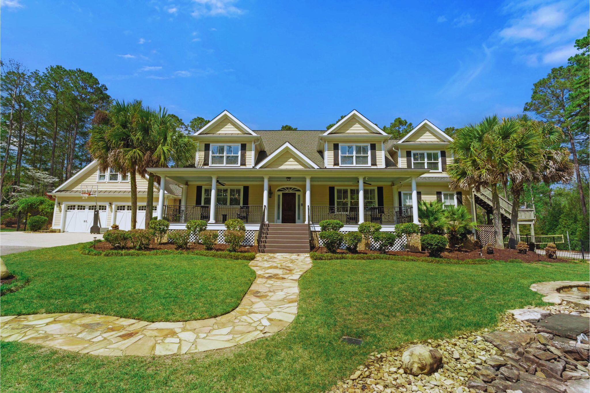 Discover this luxury farmhouse estate in Grovetown offering 3.2 private acres with no HOA, a rare multigenerational layout, and resort-style outdoor living in sought-after Columbia County. This one-of-a-kind home features three separate living spaces, a pool, hot tub, outdoor kitchen, five garage spaces, owner's suite with a private balcony, and potential for a 2.25% VA assumable loan for qualified buyers. With over 6,000 square feet, six bedrooms, and eight baths, this home provides exceptional flexibility for growing households, guests, or work-from-home needs. Begin your day on the rocking-chair front porch overlooking the tranquil koi pond, then step inside to a home where timeless craftsmanship meets everyday comfort. Hardwood floors, custom stonework, and built-in shelving create a warm, elevated feel throughout. At the center of the home, the chef's kitchen is built to bring people together featuring an oversized butcher block island perfect for casual mornings, family meals, and hosting on a grand scale. The natural flow into multiple living and entertaining spaces is enhanced by whole-home audio, a custom bar, and an area for a golf simulator, creating an environment where connection and relaxation come easily. A sunroom, screened porch extend the living experience and invite year-round enjoyment. The owner's suite offers a peaceful retreat with dual walk-in closets, a private balcony perfect for quiet evenings or a moment to recharge and a luxury primary bath with cathedral ceilings, wood beams, and a spacious walk-in shower. Outdoors, your private backyard transforms into a true destination complete with a pool, fully equipped outdoor kitchen, volleyball court, firepit, and beautifully landscaped surroundings with no neighbors in sight. Multigenerational living is seamlessly supported with a detached pool house and a remodeled one-bedroom apartment above the three-car garage. The apartment, with wide entryways and chair lift, is ideal for extended family, guests, or private quarters. Space to gather. Room to grow. A place to truly live. Schedule your private showing today.