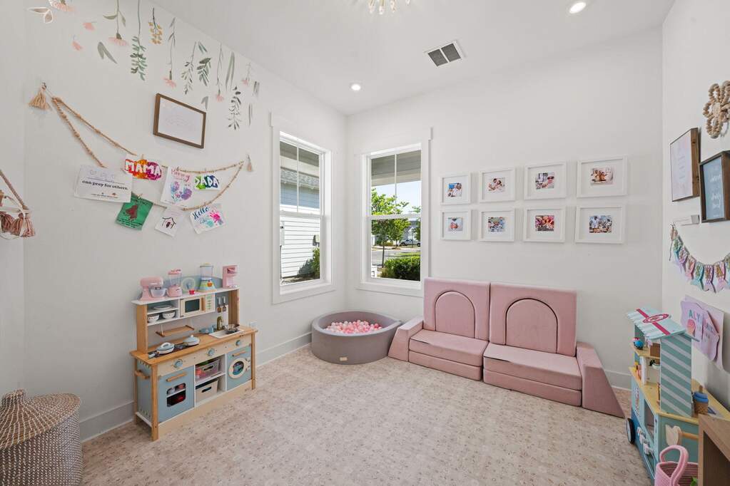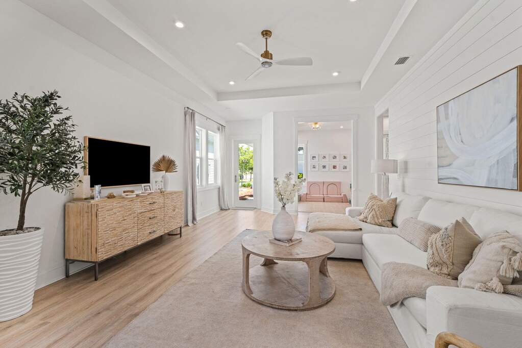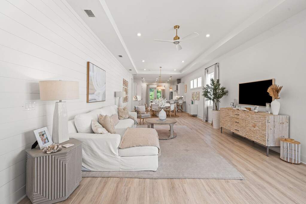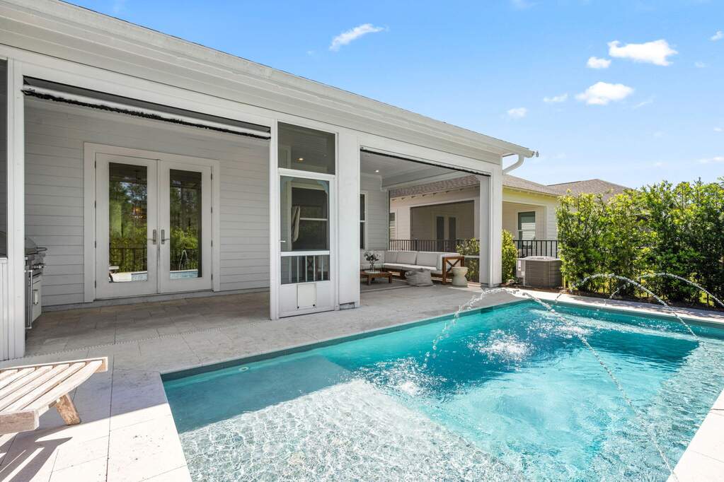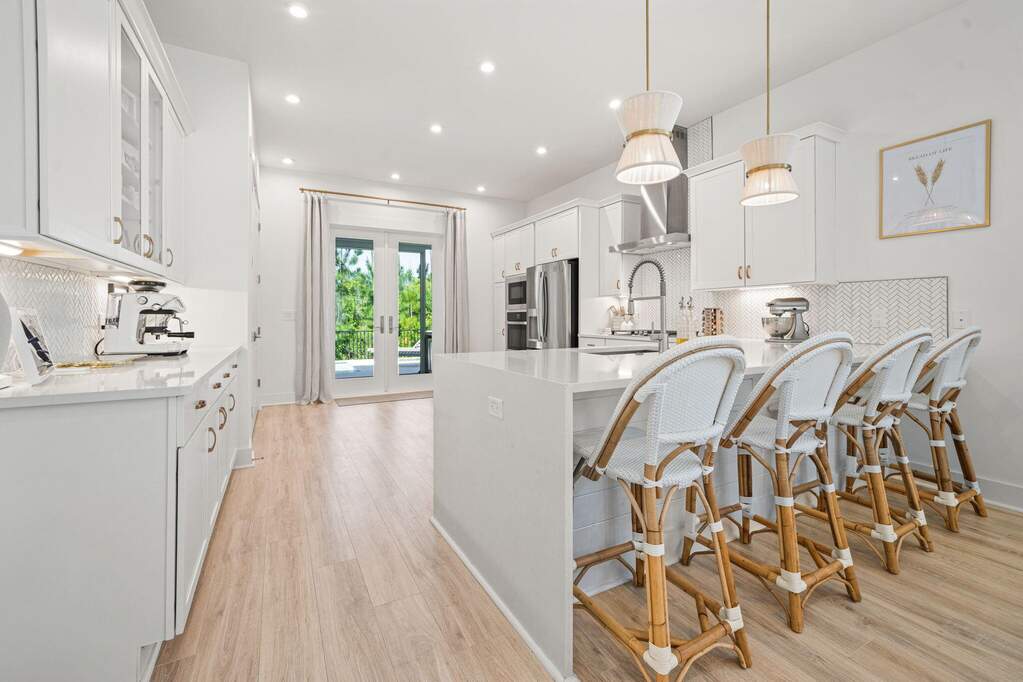 Nestled within the coveted NatureWalk at Watersound Origins, this impeccably designed 2022-built Clearwater floor plan blends coastal sophistication with everyday luxury. An open-concept great room and dining area features soaring tray ceilings, shiplap accent walls, and wide-plank hardwood floors. The chef's kitchen shines with white shaker cabinetry, brushed gold hardware, herringbone tile backsplash, stainless appliances, gas range, and a generous island with breakfast bar. The primary suite overlooks the covered lanai and offers dual vanities, a glass-enclosed shower, and a custom walk-in closet. A private second bedroom wing plus additional flex spaces serve as a home office, playroom, or guest retreat. Step outside to a private pool with travertine decking, outdoor kitchen, and serene pine-tree backdrop. Residents enjoy resort-style amenities including a community pool, clubhouse, fitness center, playground, and golf - all minutes from the sugar-white sands of 30A.