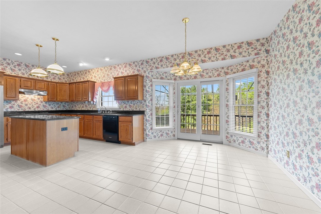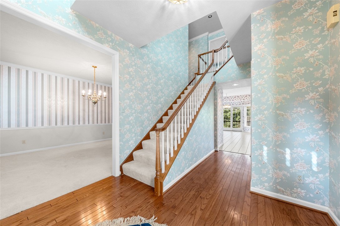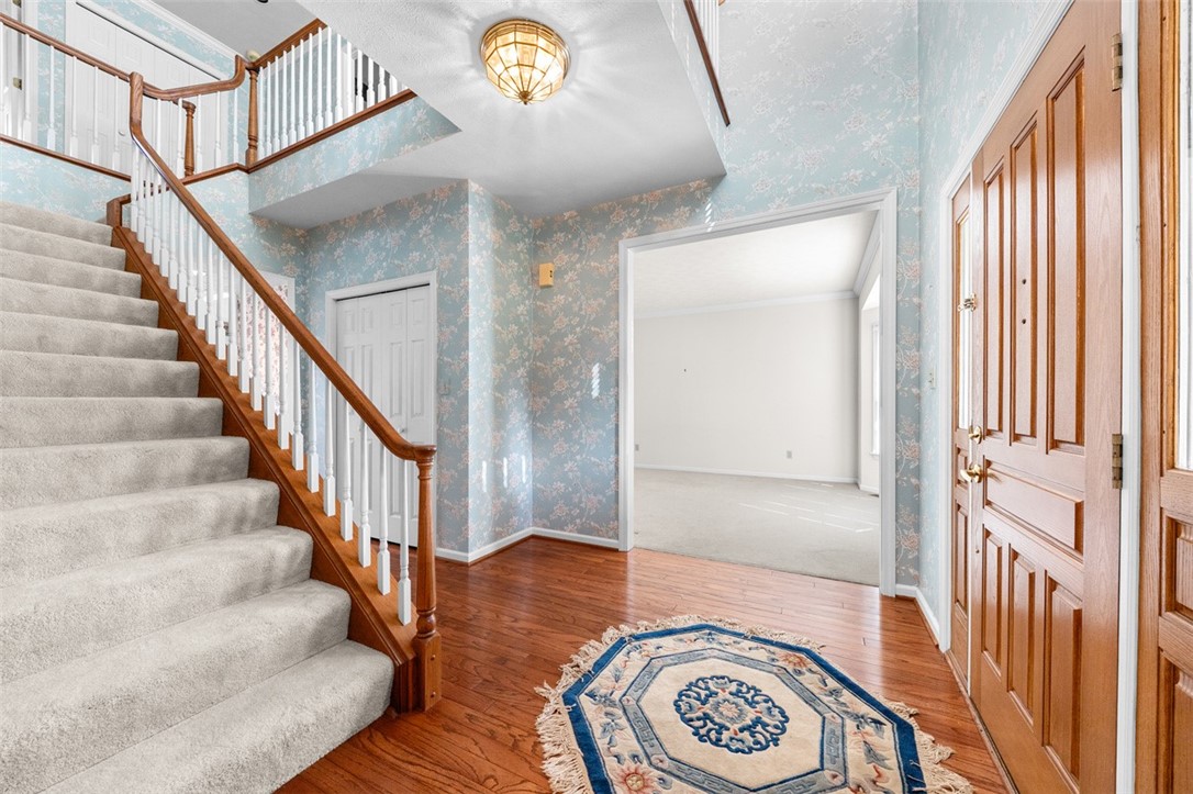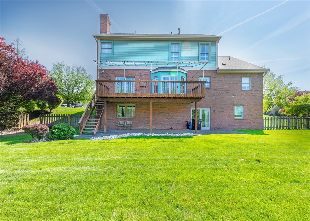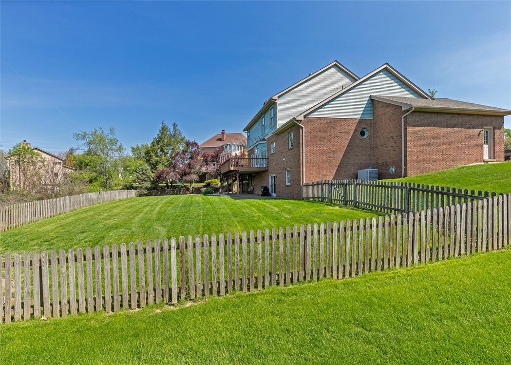 Tucked away on a quiet cul-de-sac in one of the area's most sought-after neighborhoods, this striking 4-bedroom, 3.5 bath brick and vinyl two-story blends timeless style with standout spaces designed to impress. From the moment you step into the open foyer, you're greeted by soaring 9-foot ceilings, gleaming hardwood floors, and an effortless sense of flow that makes this home as functional as it is beautiful. The living room makes a statement with its dramatic walk-in bay window, elegant chair rail and crown molding - perfect for hosting or simply enjoying a quiet moment in style. Just beyond, the heart of the home unfolds: a spacious, light-filled kitchen featuring granite countertops, a center island and an abundance of warm oak cabinetry. The adjoining breakfast area, wrapped in natural light, offers glass sliders that lead to a private rear deck with awning - your own outdoor haven overlooking a fenced, level, wooded backyard. The family room invites you to relax by the fireplace, while the finished lower-level game room takes entertaining to the next level with a second fireplace, wet bar, and walk out access. A private den, full bath, and an enormous storage room add even more versatility to this level. Upstairs, generously sized bedrooms provide comfort for everyone, with the rare bonus of two separate staircases offering both convenience and character. The primary suite is a true retreat - complete with a walk-in closet, two additional closets, and a spacious ensuite bath designed for unwinding at the end of the day. With a large first floor laundry room, exceptional storage throughout, and a layout that balances openness with defined spaces, this home truly has it all. Add in the unbeatable location, and you've found a home that doesn't just check boxes - it elevates everyday living! Must see to fully appreciate!