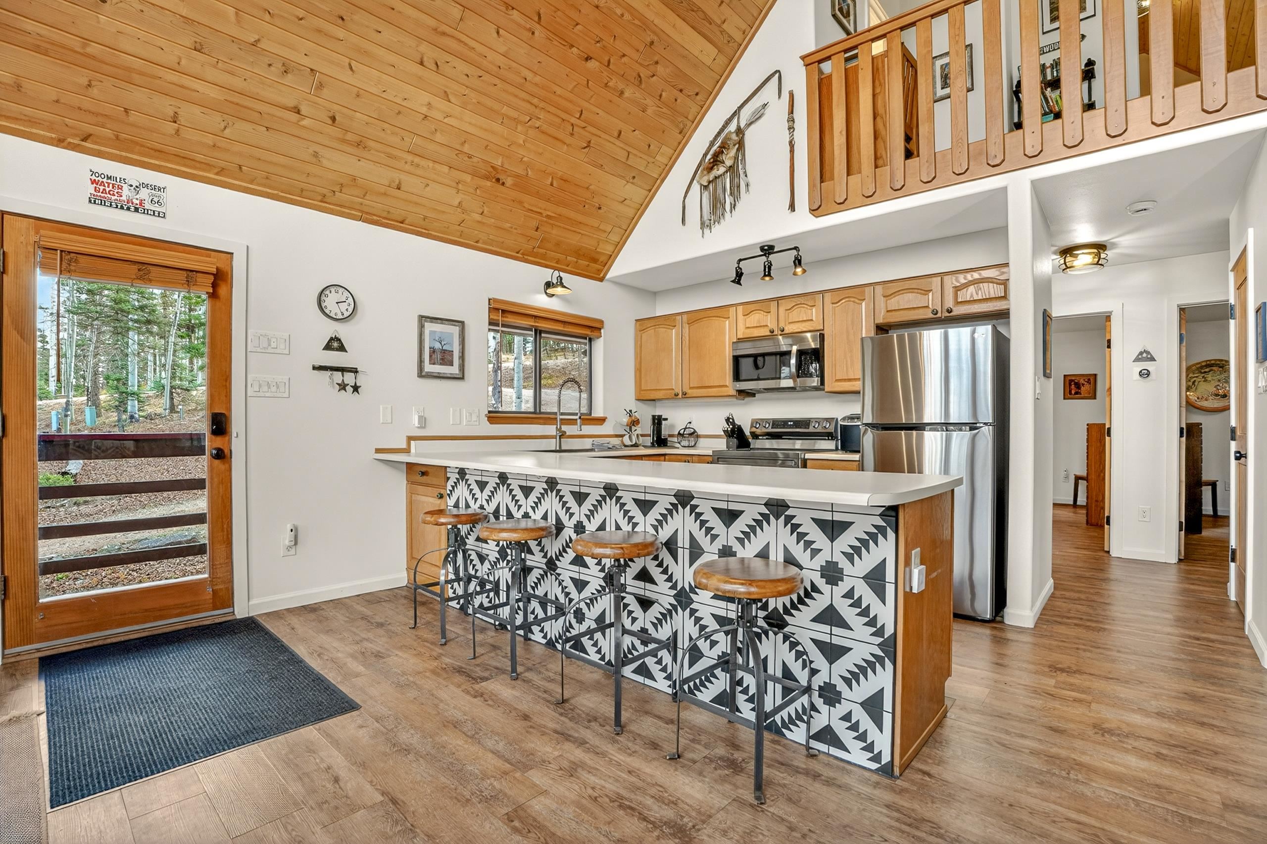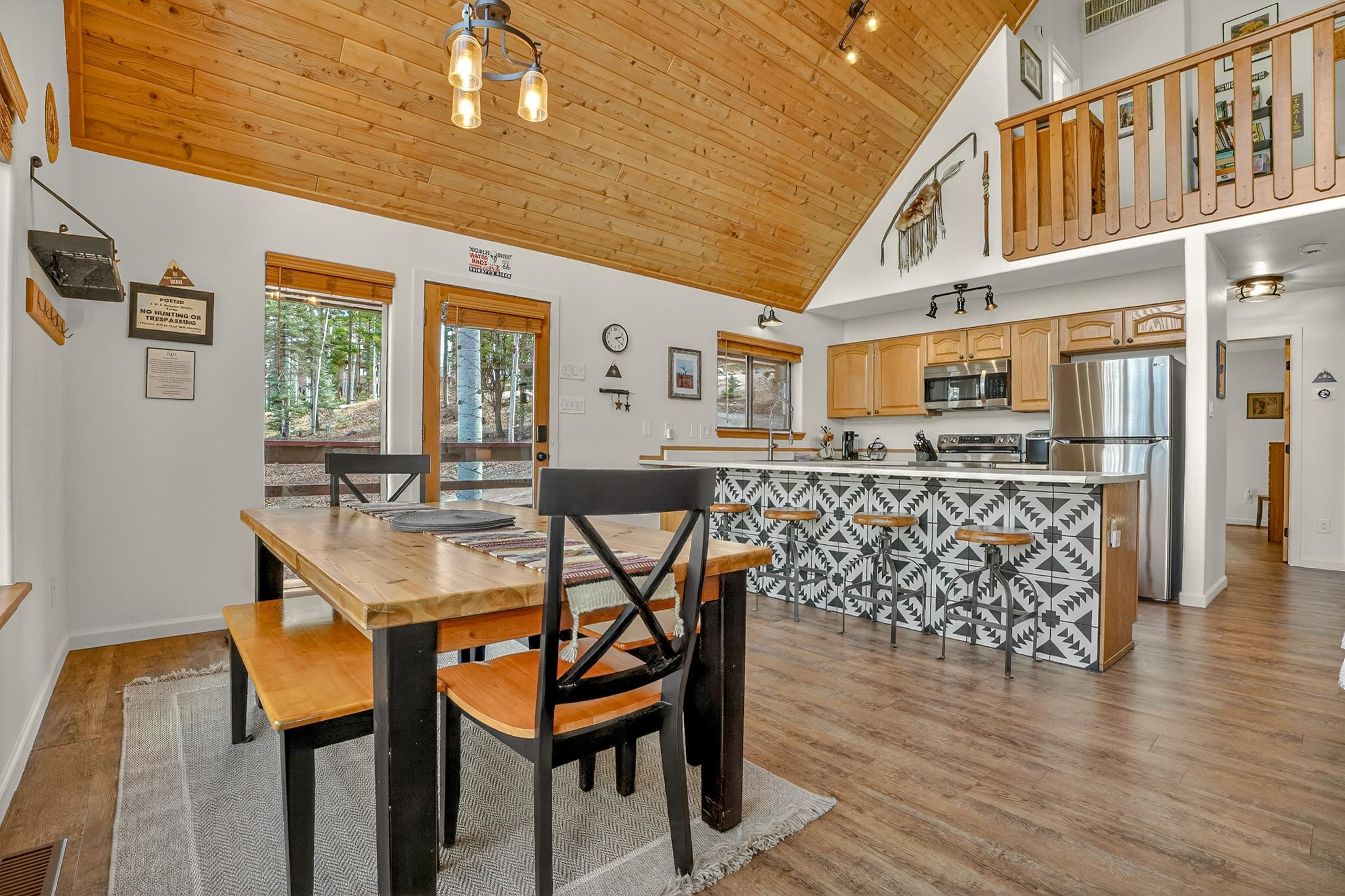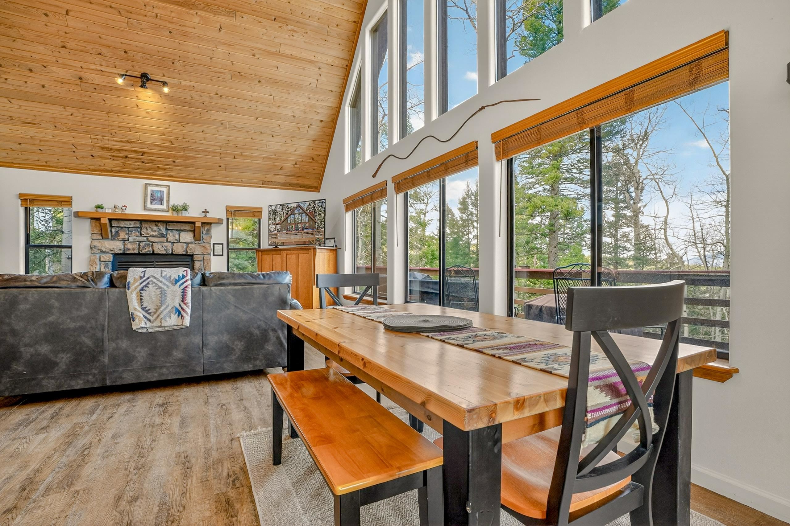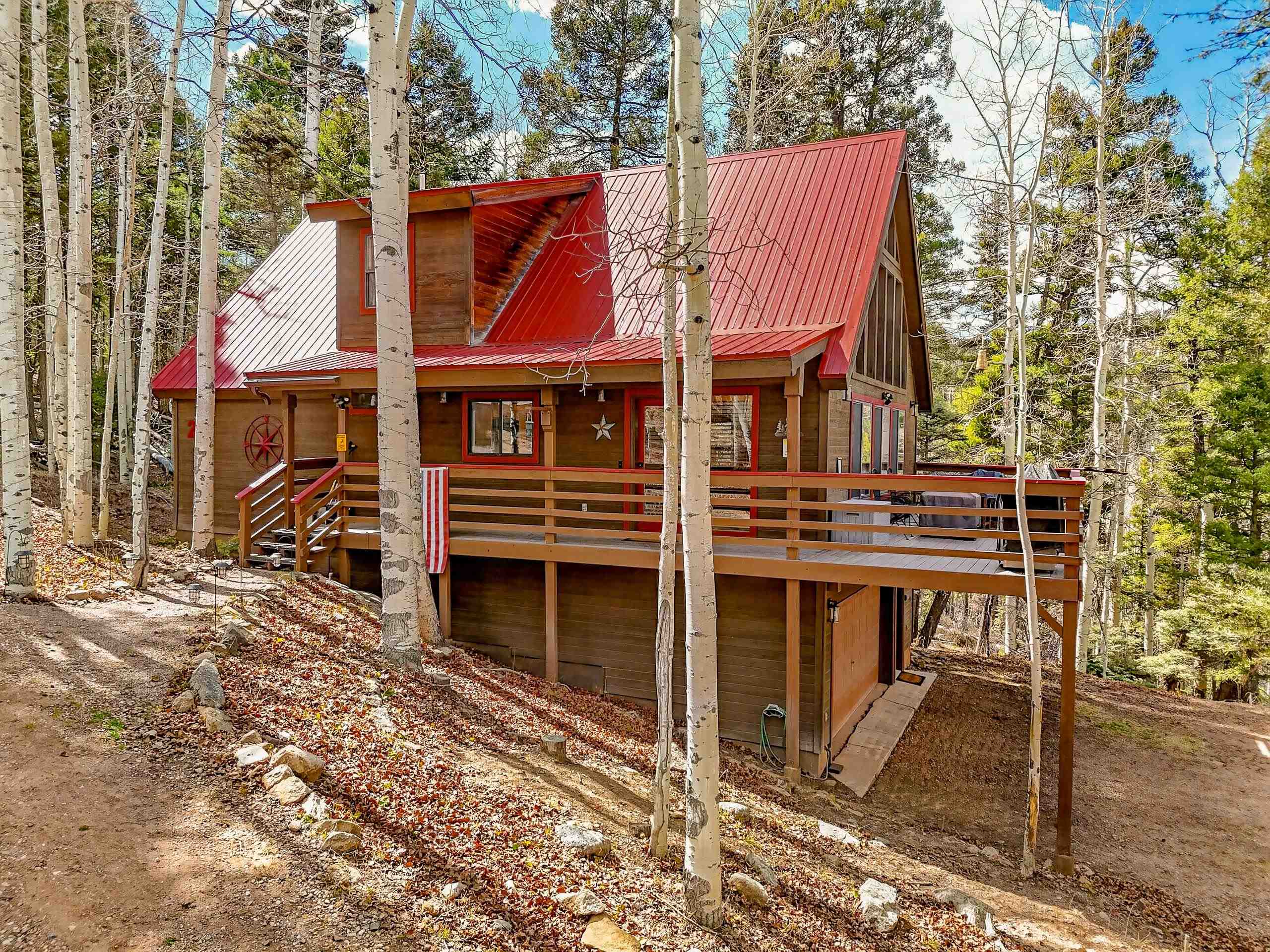Tucked among mature aspen trees, 20 Sierra Blanca Trail offers a quiet mountain retreat with room to relax and recharge. This 3-bedroom, 2-bath fully remodeled home features an inviting open-concept living space filled with natural light from the big window wall. Vaulted ceilings and a wood-burning fireplace create a warm, welcoming atmosphere. The kitchen is designed for both function and connection, with generous counter space, bar seating, and an adjoining dining area. Two guest bedrooms are thoughtfully positioned for privacy and share a full hall bath. Upstairs, a versatile loft provides the ideal setting for a home office or cozy reading space, while the primary suite offers a private escape complete with its own deck and full bathroom. Step outside to a wraparound deck and take in the peaceful setting, surrounded by the gentle rustle of aspen leaves. The attached two-car garage, located beneath the home, includes a dedicated workshop and laundry area for added convenience. Just a short five-minute drive brings you to the amenities of Angel Fire Resort and the Village of Angel Fire, making this property a perfect blend of seclusion and accessibility.