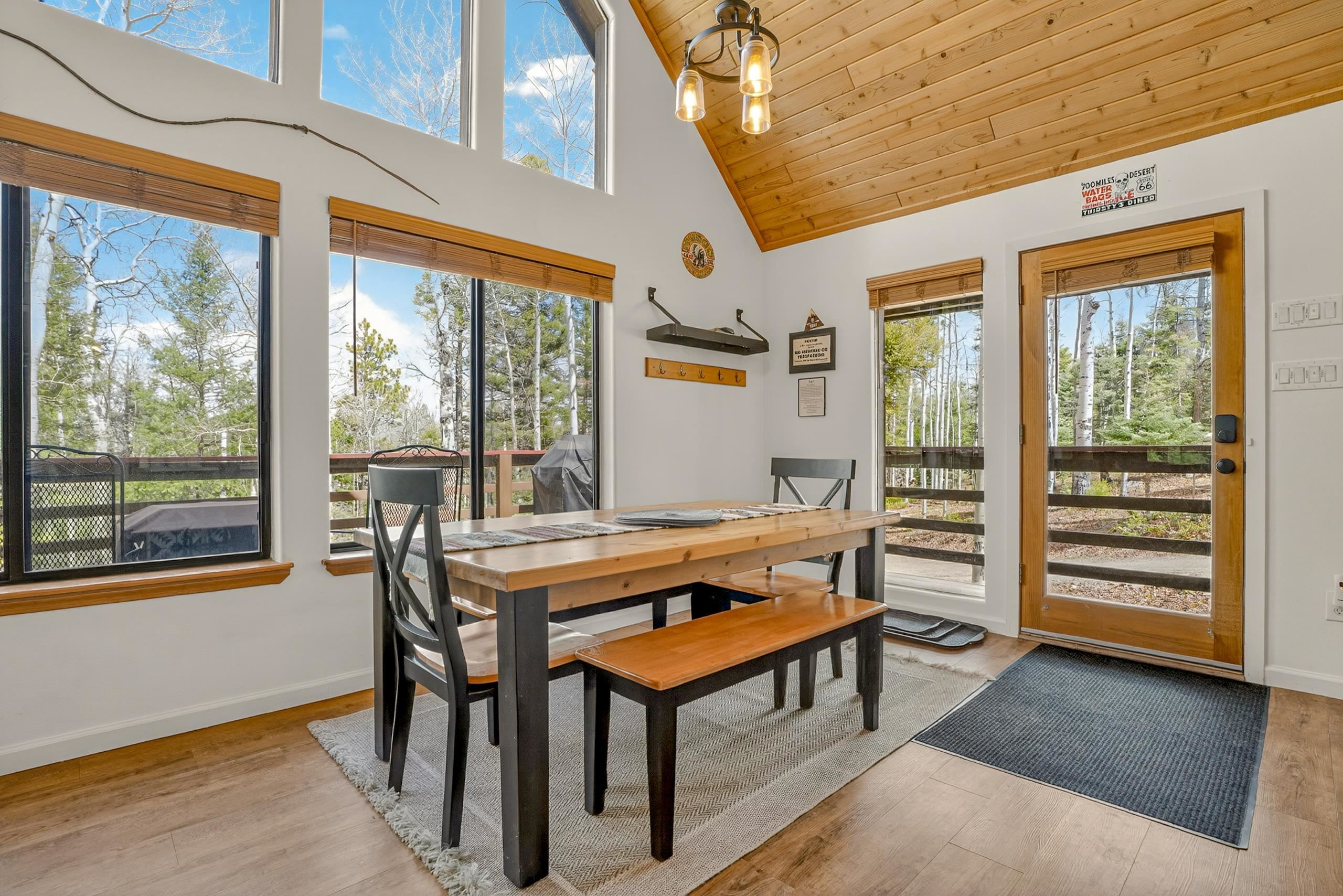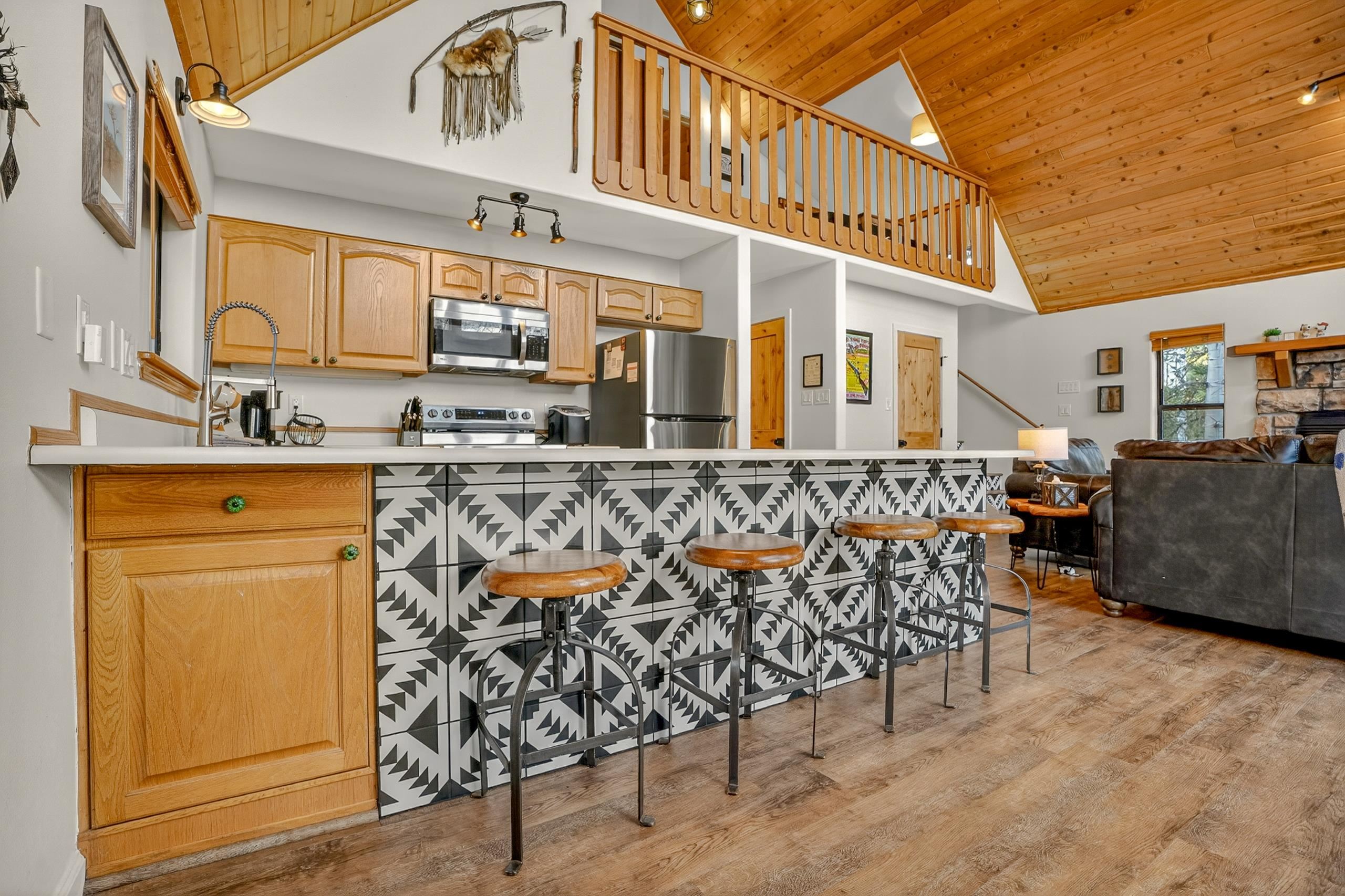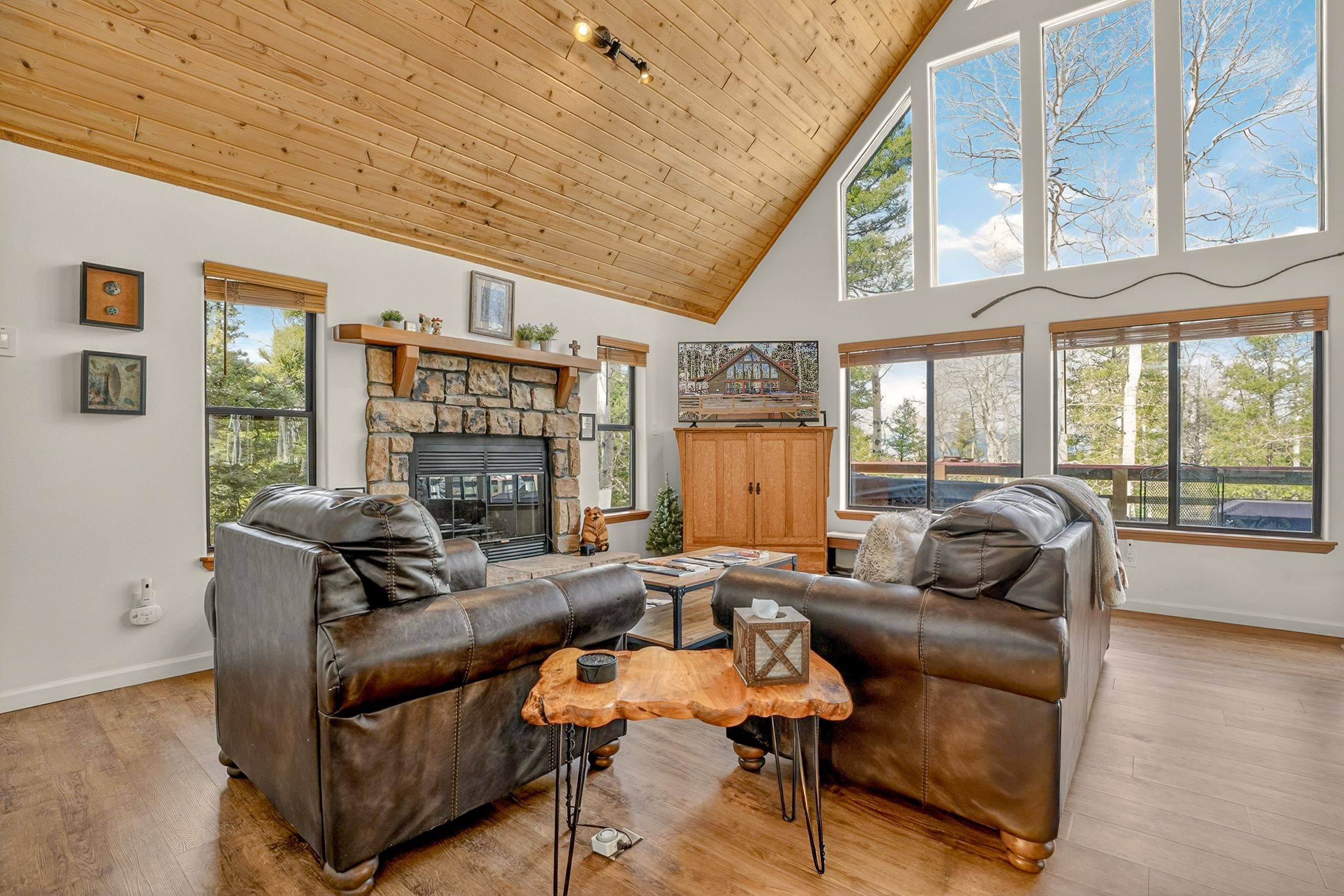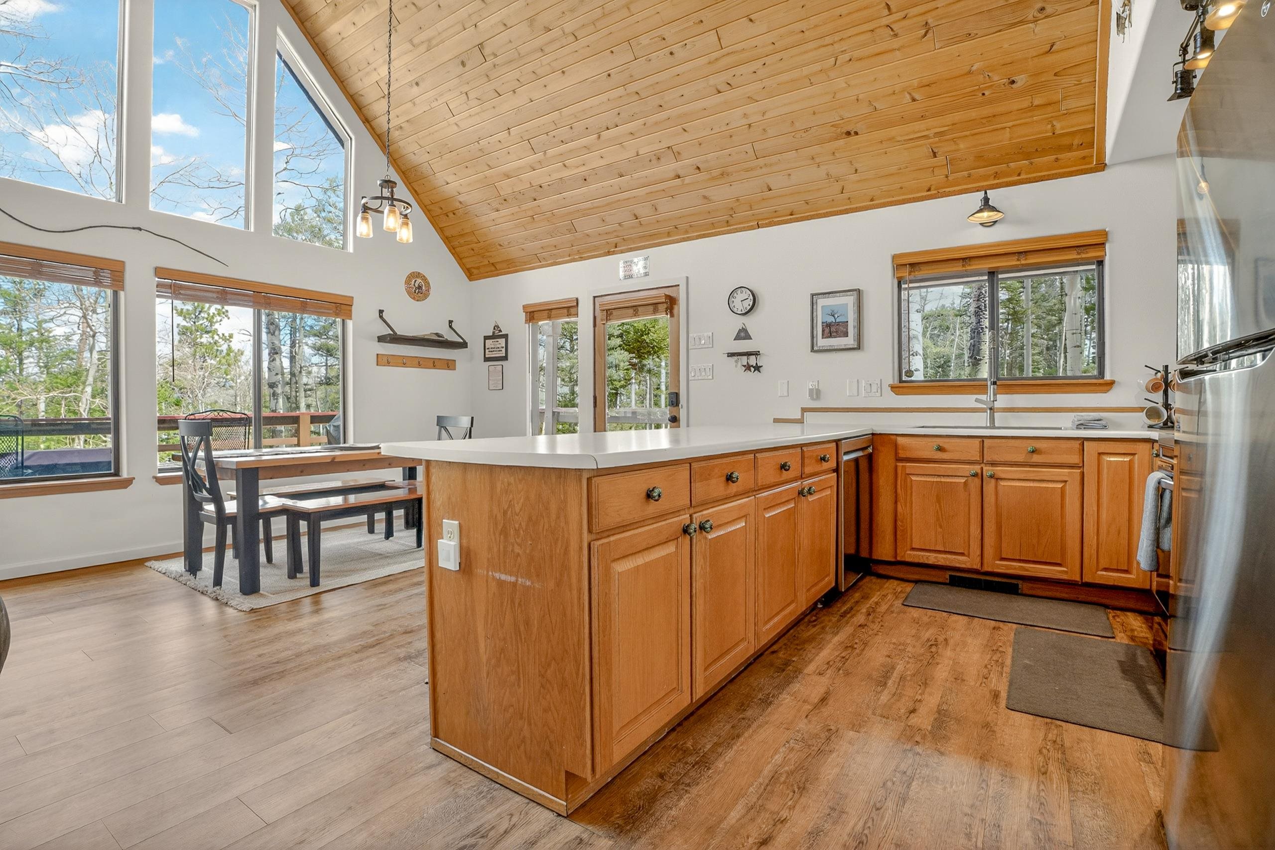 Tucked among mature aspen trees, 20 Sierra Blanca Trail offers a quiet mountain retreat with room to relax and recharge. This 3-bedroom, 2-bath fully remodeled home features an inviting open-concept living space filled with natural light from the big window wall. Vaulted ceilings and a wood-burning fireplace create a warm, welcoming atmosphere. The kitchen is designed for both function and connection, with generous counter space, bar seating, and an adjoining dining area. Two guest bedrooms are thoughtfully positioned for privacy and share a full hall bath. Upstairs, a versatile loft provides the ideal setting for a home office or cozy reading space, while the primary suite offers a private escape complete with its own deck and full bathroom. Step outside to a wraparound deck and take in the peaceful setting, surrounded by the gentle rustle of aspen leaves. The attached two-car garage, located beneath the home, includes a dedicated workshop and laundry area for added convenience. Just a short five-minute drive brings you to the amenities of Angel Fire Resort and the Village of Angel Fire, making this property a perfect blend of seclusion and accessibility.