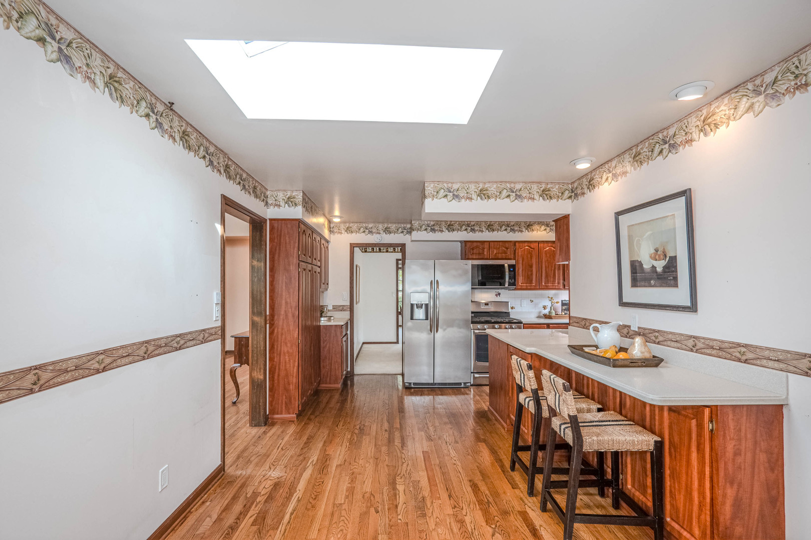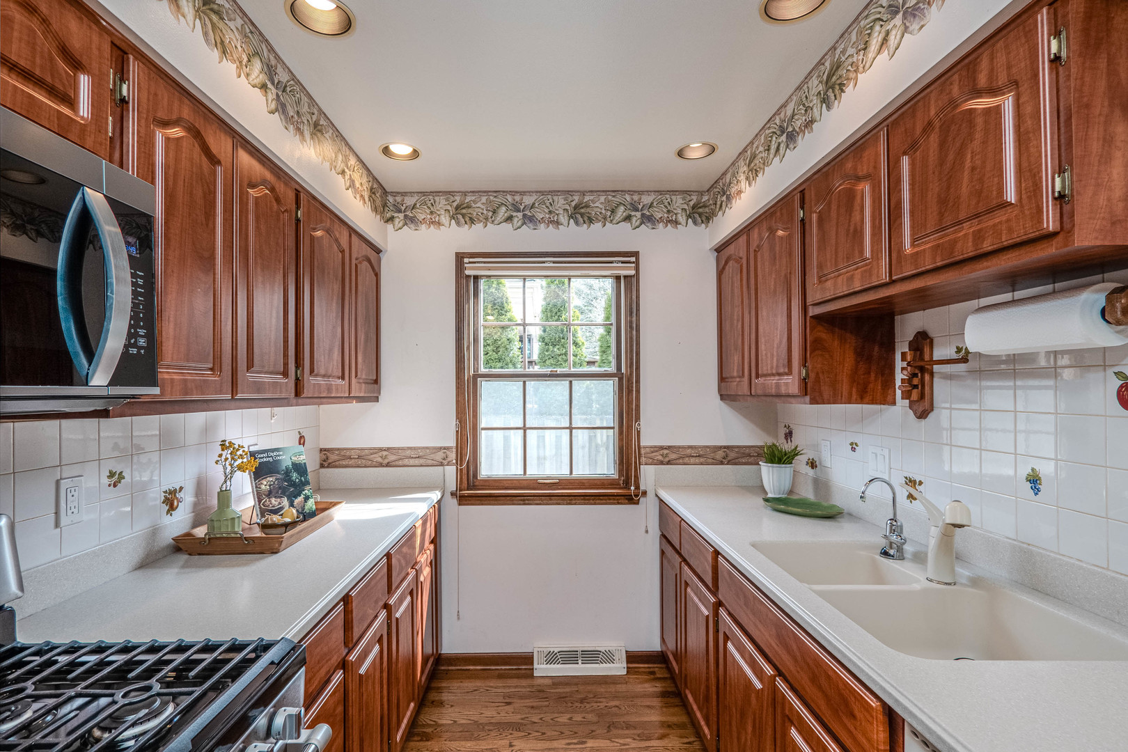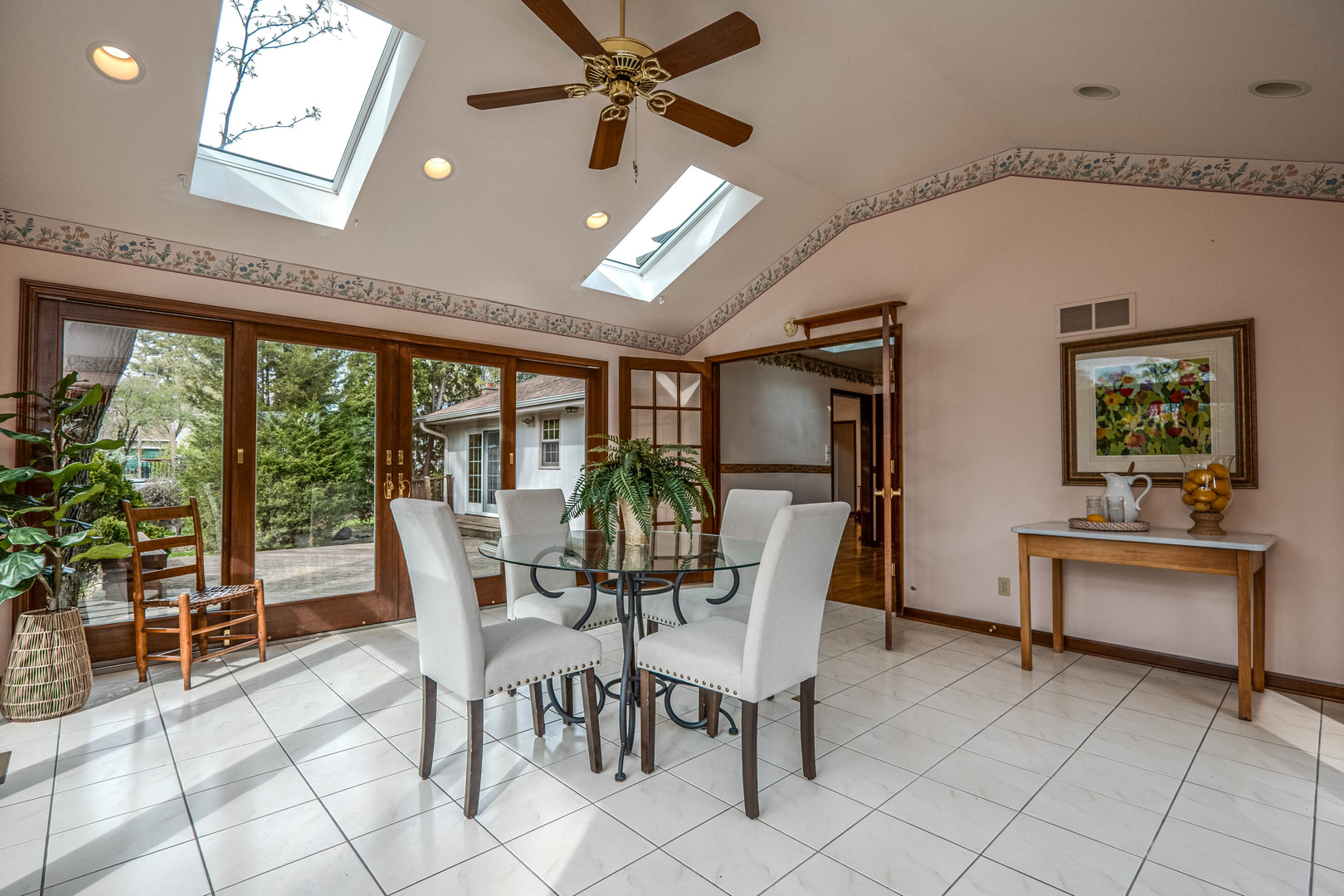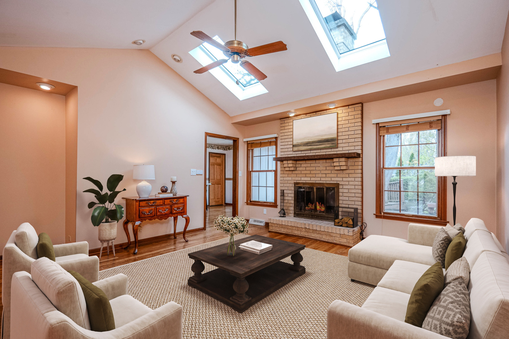 FIRST FLOOR LIVING is effortless in this spacious ranch set in a desirable neighborhood. A welcoming covered front porch leads you inside, where you'll find a generous living room and formal dining area - perfect for everyday living and entertaining alike. The remodeled kitchen features solid surface countertops, abundant workspace, stainless appliances and hardwood floors, along with a large main-level laundry room for added convenience. Just beyond, the kitchen opens to a bright four-season sunroom - a space you will absolutely enjoy year-round. The impressive two-story vaulted family room is filled with natural light from skylights and anchored by a masonry wood-burning fireplace, offering plenty of space to relax or gather. There is a spacious master suite with a large walk-in closet and attached bath, while two additional bedrooms share a hall bath. A partially finished basement provides additional living space along with plenty of storage. The backyard including deck, gazebo and storage shed offer a spacious setting, and while it needs some TLC, it was once a standout yard/garden featured on the Batavia Garden Walk. With some attention, it presents an incredible opportunity to create an outdoor retreat. There is a new roof (2025) with gutters and guards, high-efficiency furnace, new electric and solar powered skylights. Opportunity is knocking!