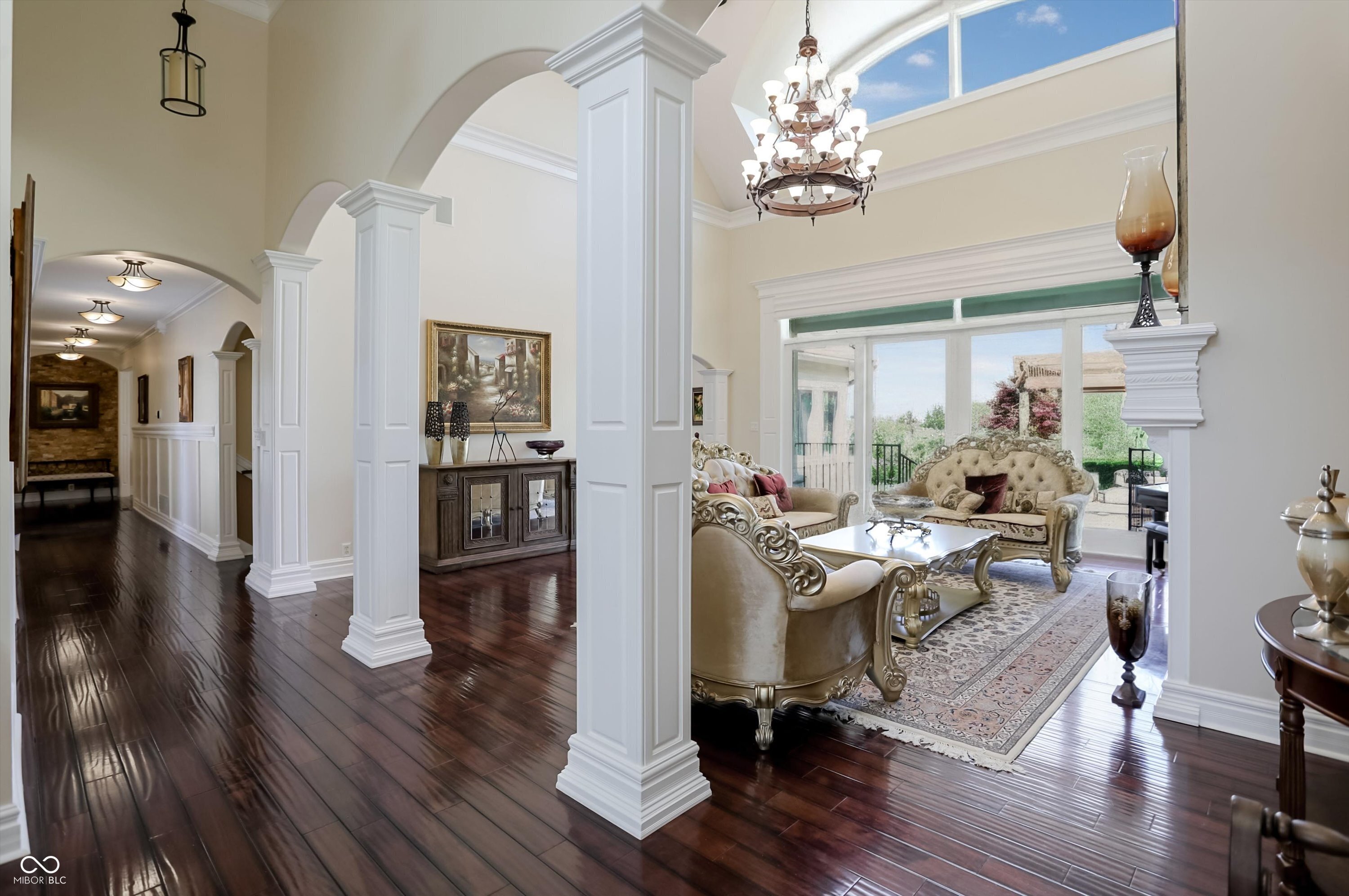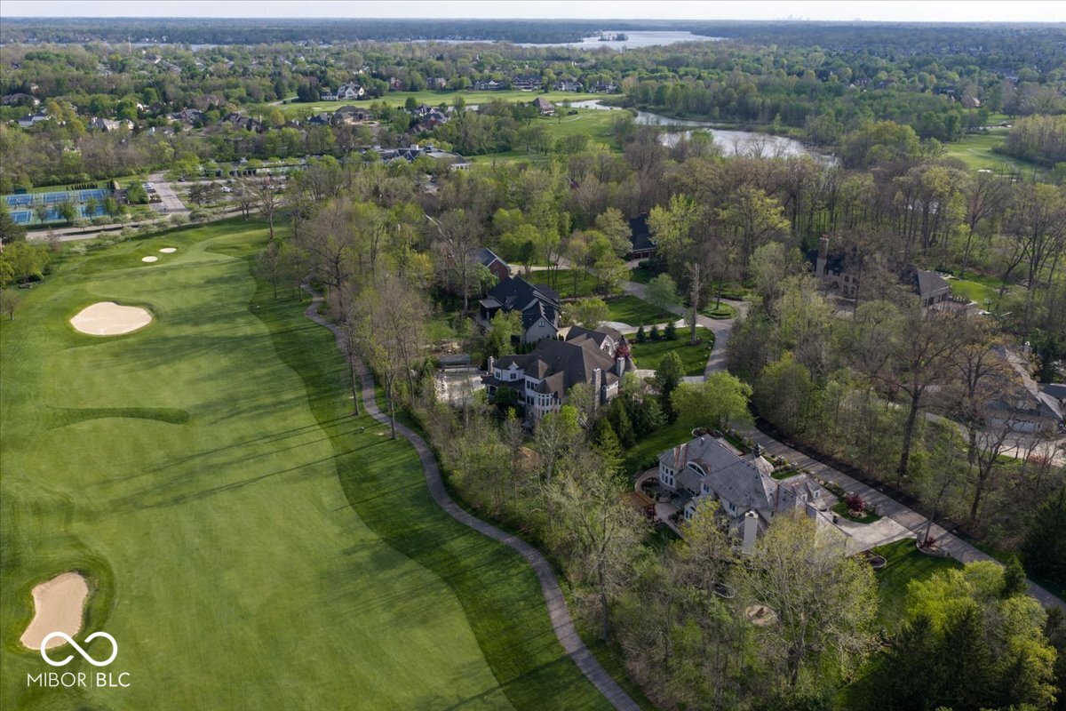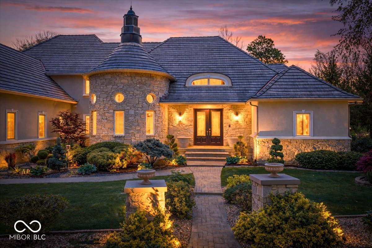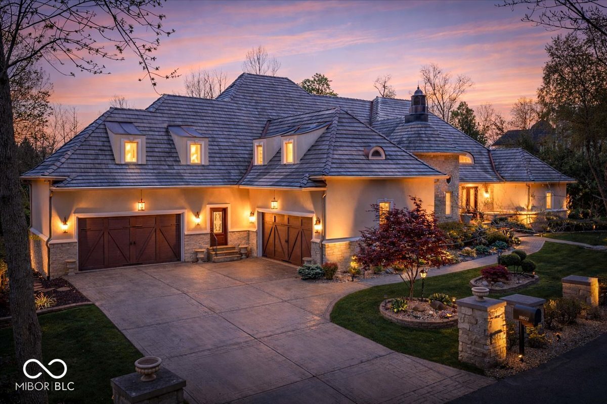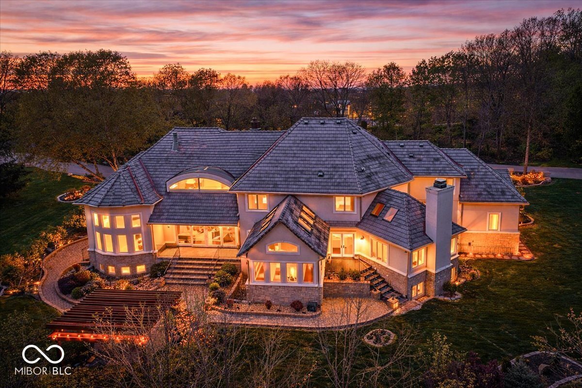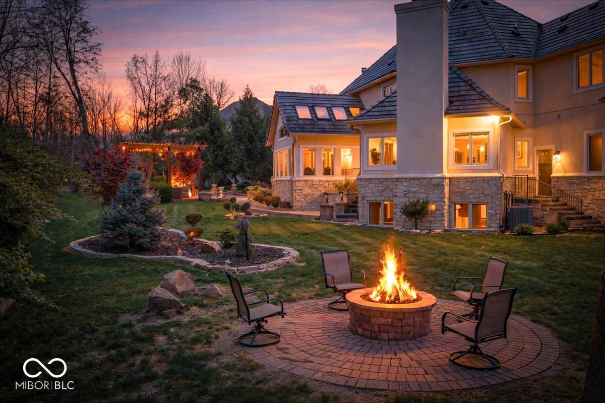 Rarely do properties become available in The Woods, home to one of Fishers most charming and exclusive streets. Comprised of just 12 custom estates, residents enjoy a distinctive boulder-lined streetscape, mature trees, and a picturesque stone bridge. The setting feels worlds away, yet sits just steps from the Hawthorns Golf and Country Club within the prestigious Hamilton Proper community. Positioned along the 9th fairway, this 10,000+ square foot estate offers a rare combination of scale, presence & privacy on nearly an acre. Featuring 6 bedrooms, 6 full baths, 2 half baths & a 4-car garage, the home is thoughtfully designed for both everyday living & elevated entertaining. From the moment you enter, soaring 20' ceilings & a grand foyer create an unforgettable first impression, opening to elegant living & dining spaces. A stately corridor leads to a richly appointed oval office with custom built-ins, while four fireplaces add warmth and character throughout. The fully reimagined chef's kitchen (2024) serves as the heart of the home, featuring high-end appliances, quartz surfaces, a dedicated prep area, beverage station, 10' walk-in pantry & seamless connection to gathering spaces. The main-level owner's suite offers a stone fireplace, private outdoor access & a spa-inspired bathroom with heated floors, steam shower & jetted tub. Upstairs, a loft anchors four generously sized bedrooms with walk-in closets & updated en-suite baths (2024) finished in marble & natural stone. The lower level is designed to be unforgettable, featuring a full-service bar (2024), wine cellar, home theater with fireplace, fitness space, sauna, guest suite & ensuite, multiple gathering areas & abundant storage. Outdoor living is equally compelling with a paver patio, firepit, spacious pergola & wooded backdrop creating a private setting for relaxing or entertaining. A rare opportunity to own a home that blends lifestyle, location, and architectural presence in a perfect location.