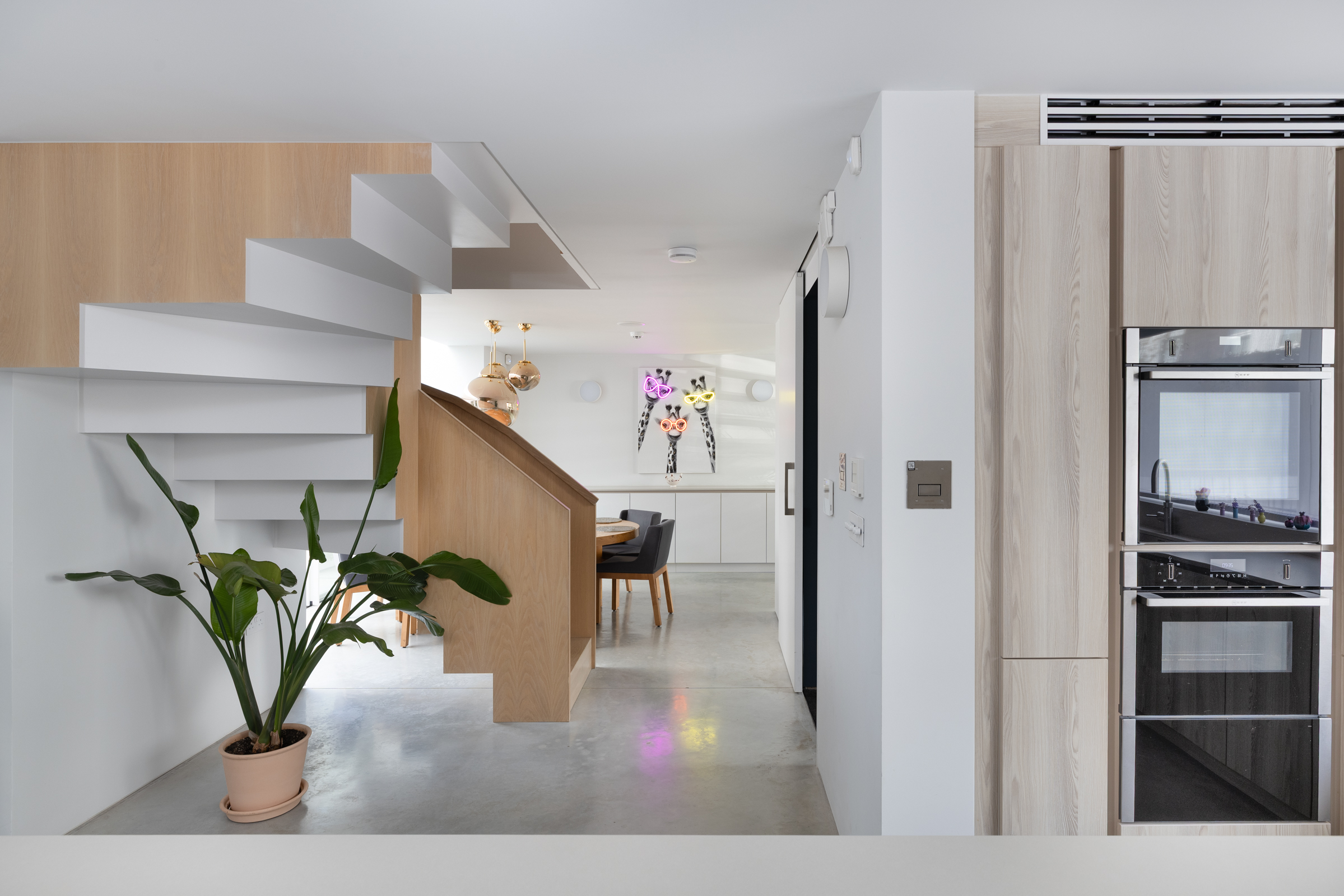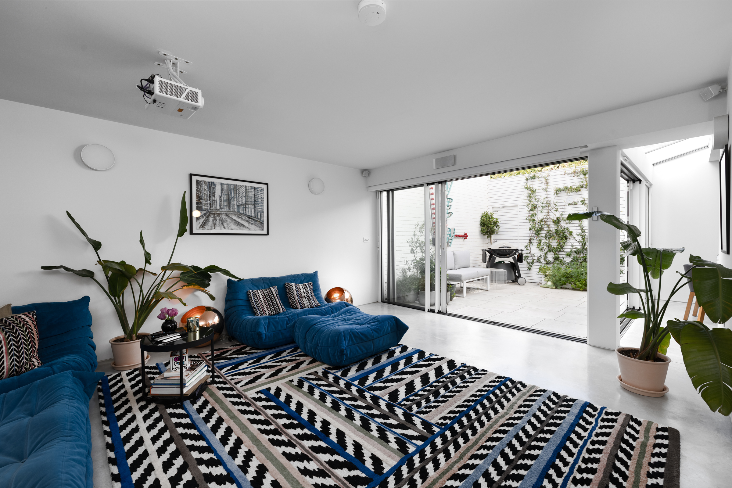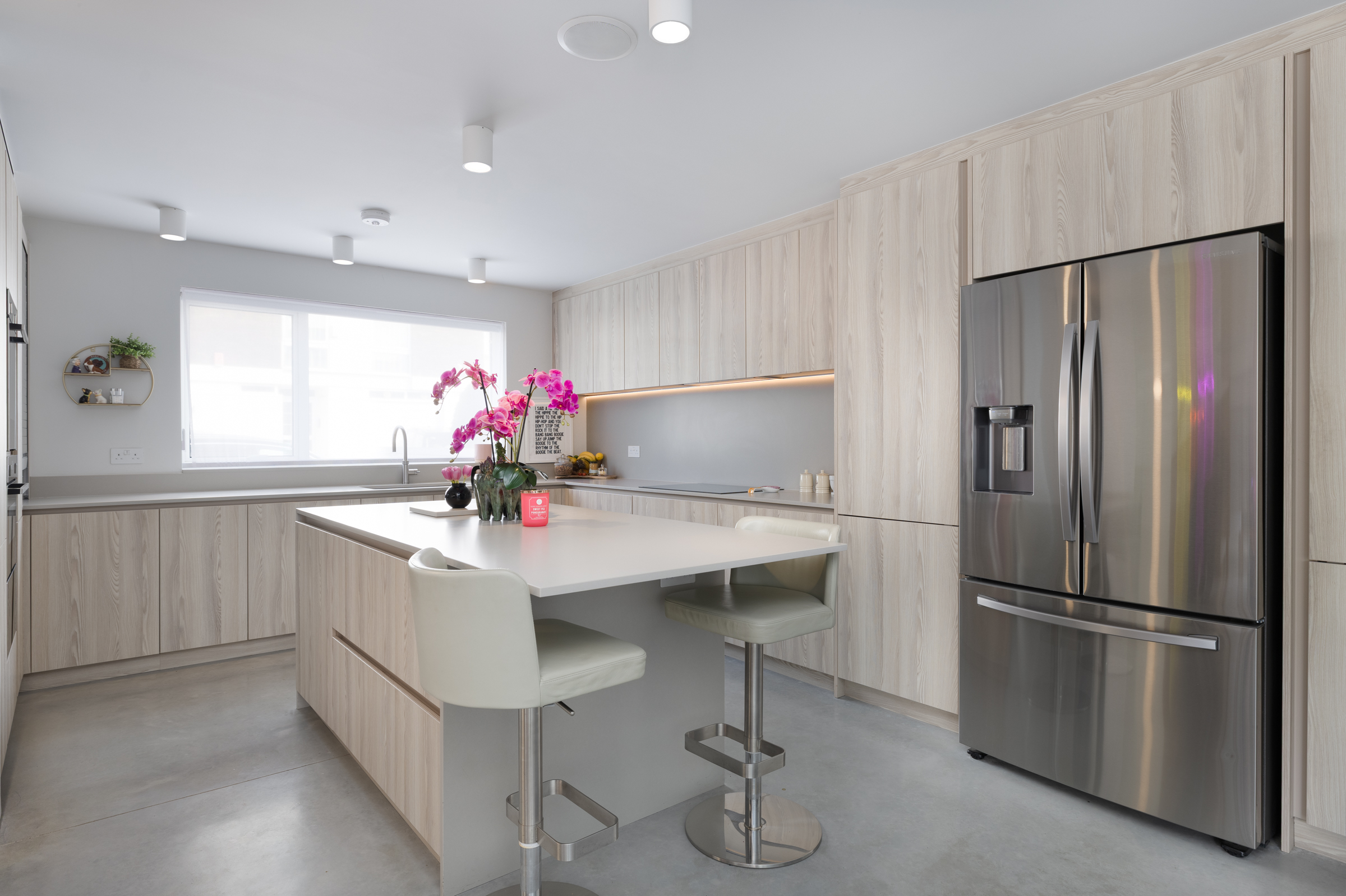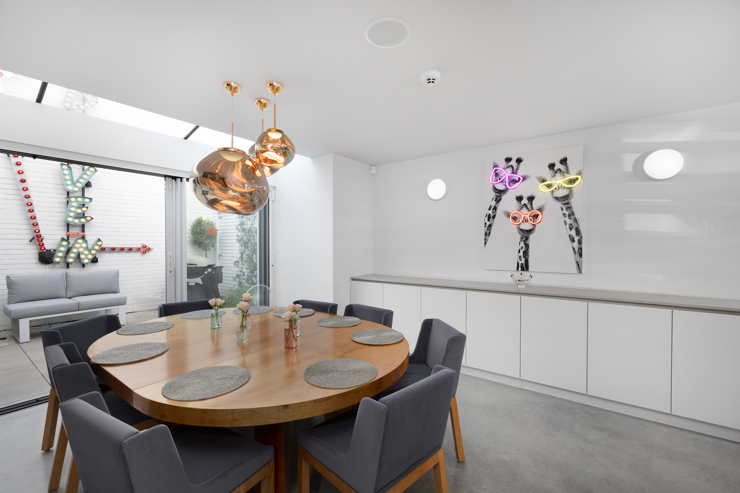 The ground floor is given over to a wide, open-plan kitchen, dining and living space that runs the full depth of the house. Polished concrete floors bring a sense of continuity, while large openings at the rear draw in light from the patio garden beyond. The arrangement is generous but controlled, with the kitchen anchored by a central island and the dining space positioned naturally between kitchen and garden. Doors open directly onto the terrace, allowing the space to expand easily in warmer months.