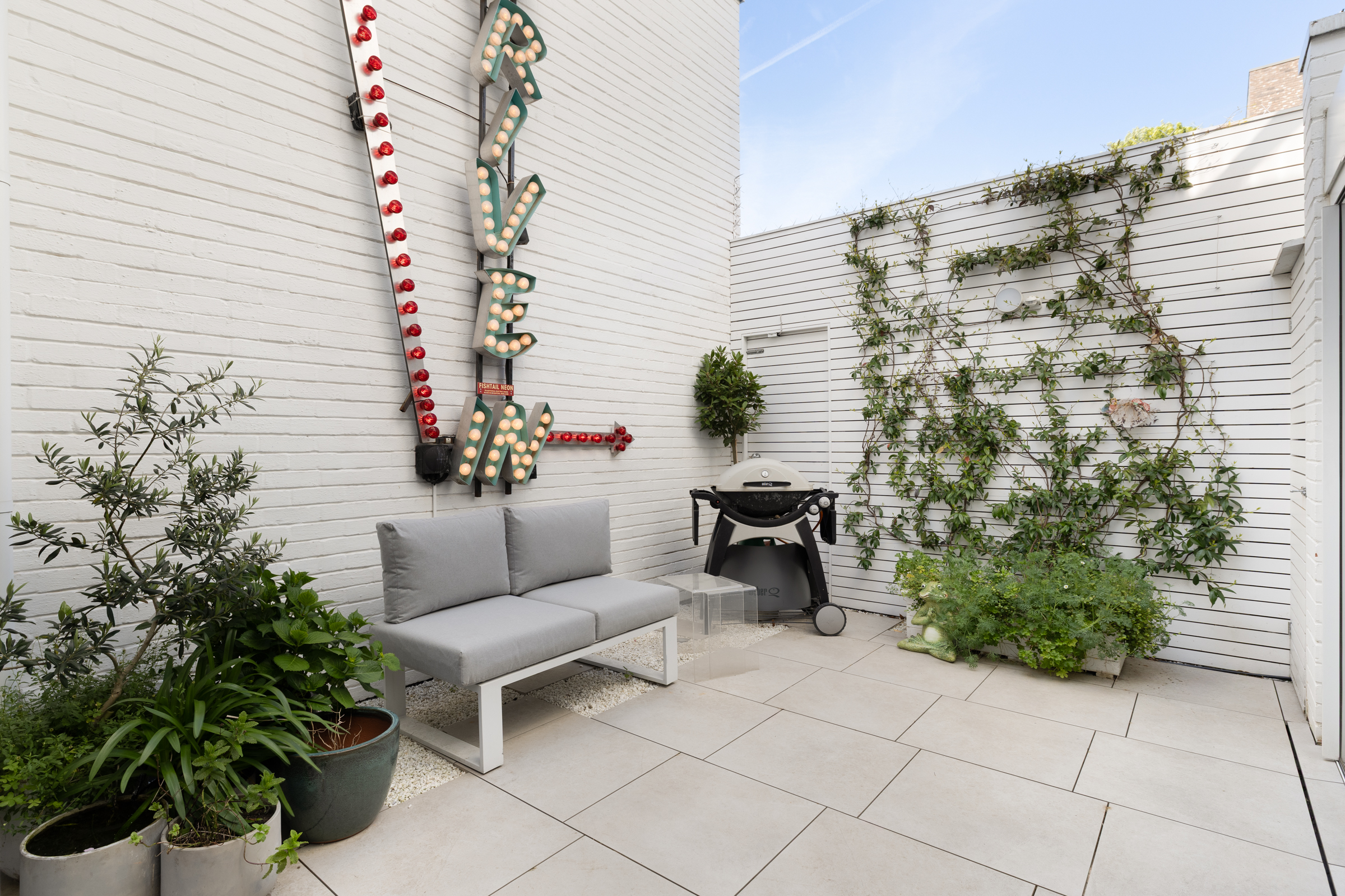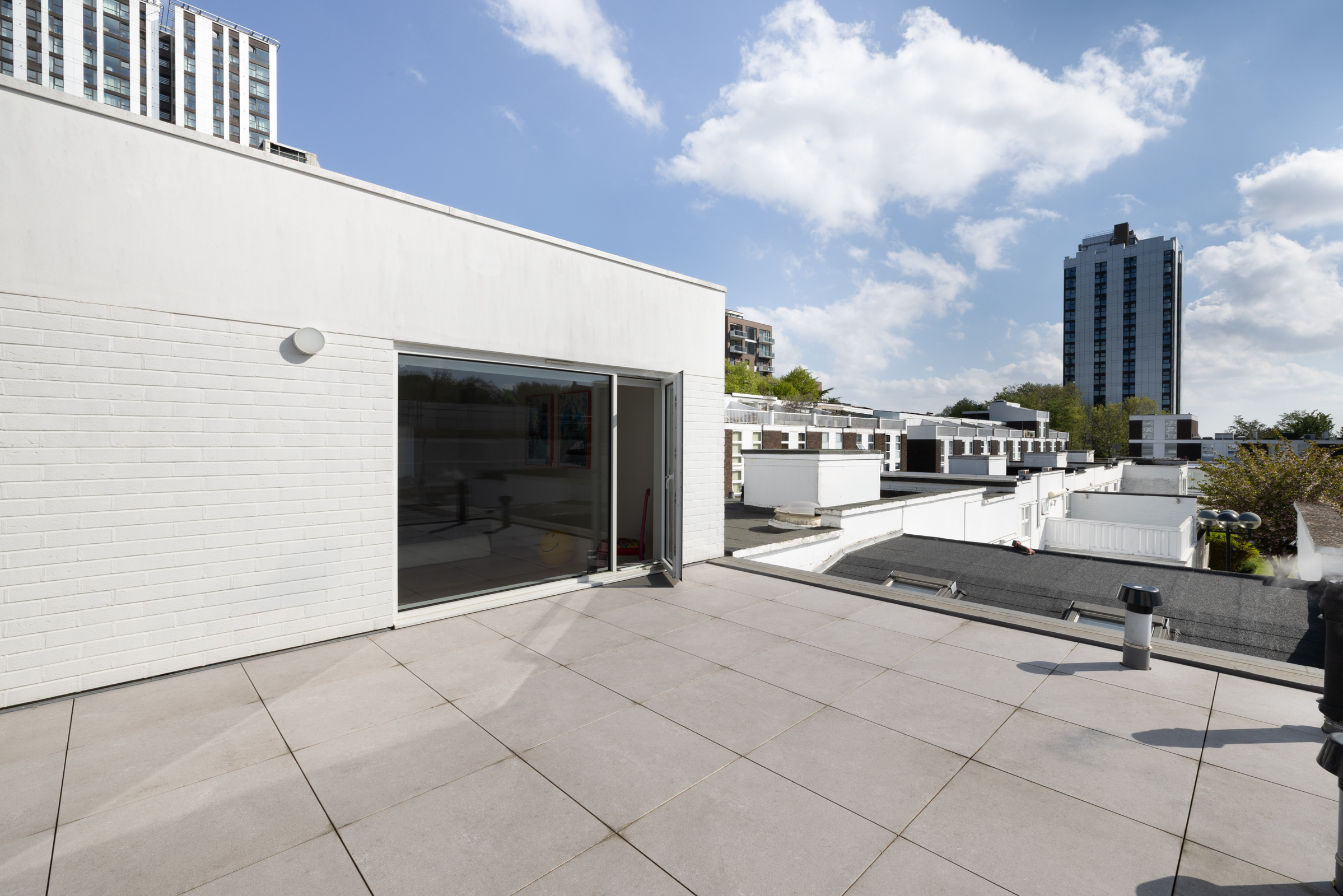 A roof terrace sits above, which is an elevated outdoor space with open views across the surrounding area. At ground level, the rear patio garden offers a more enclosed setting, while residents also have access to well-maintained communal gardens.