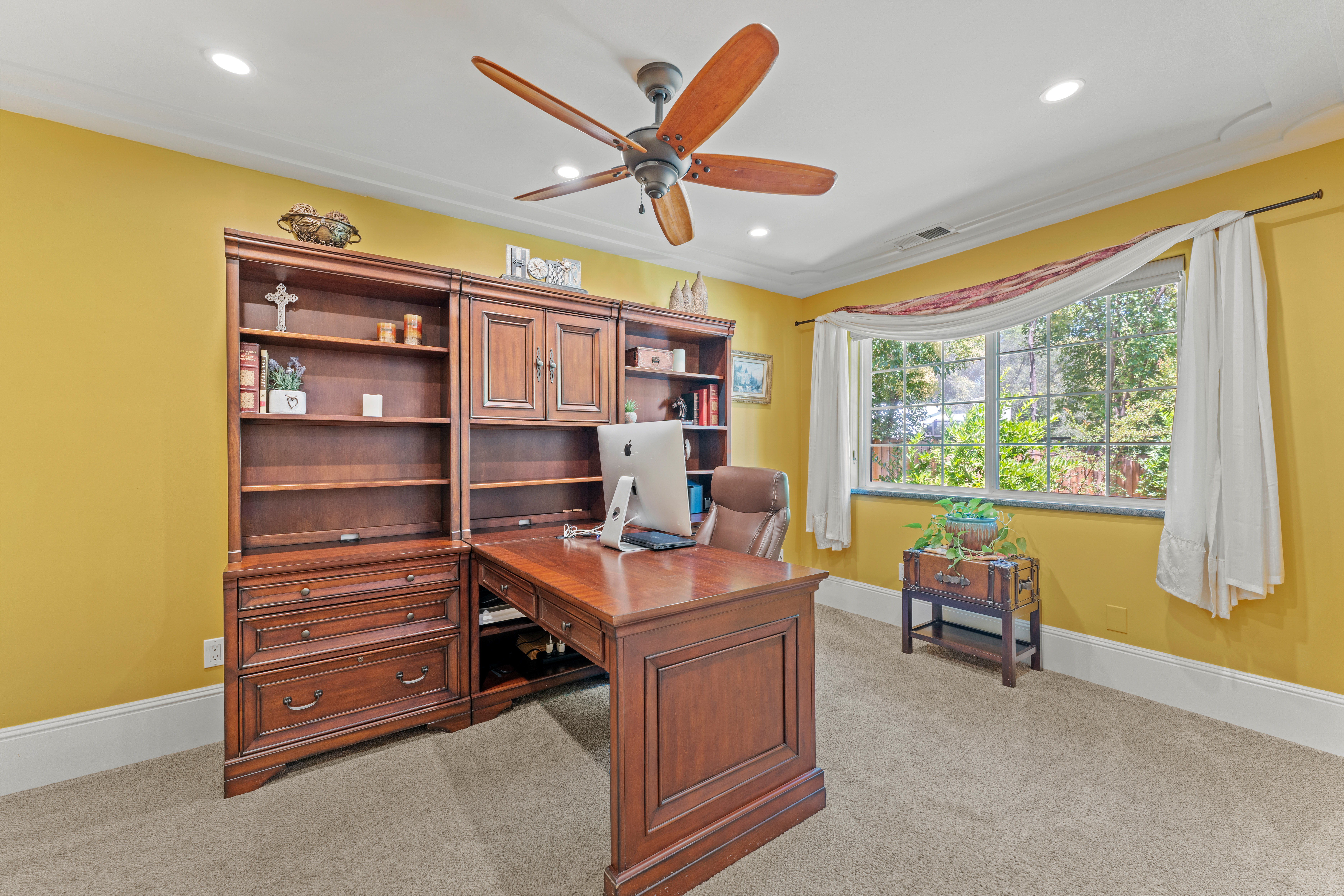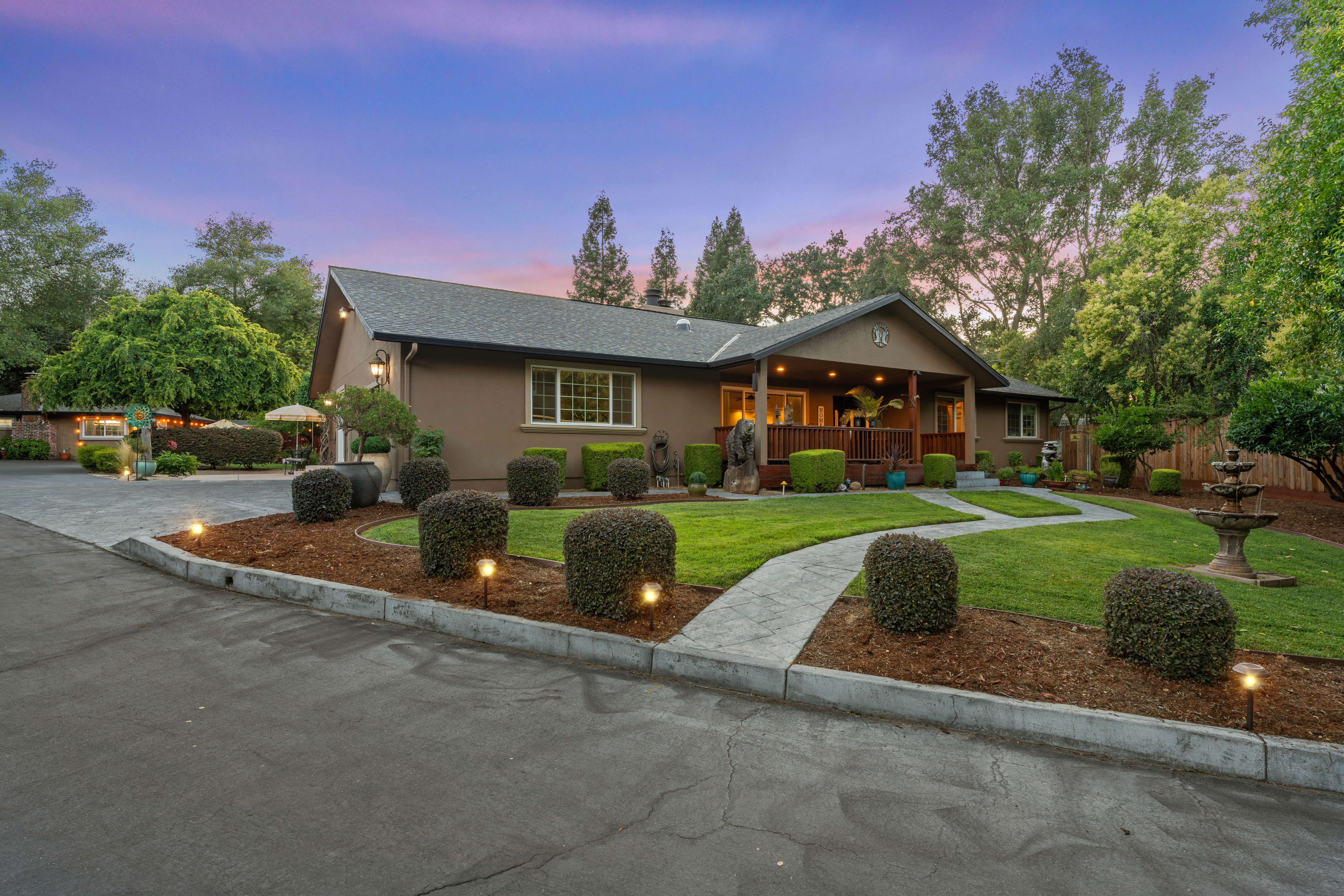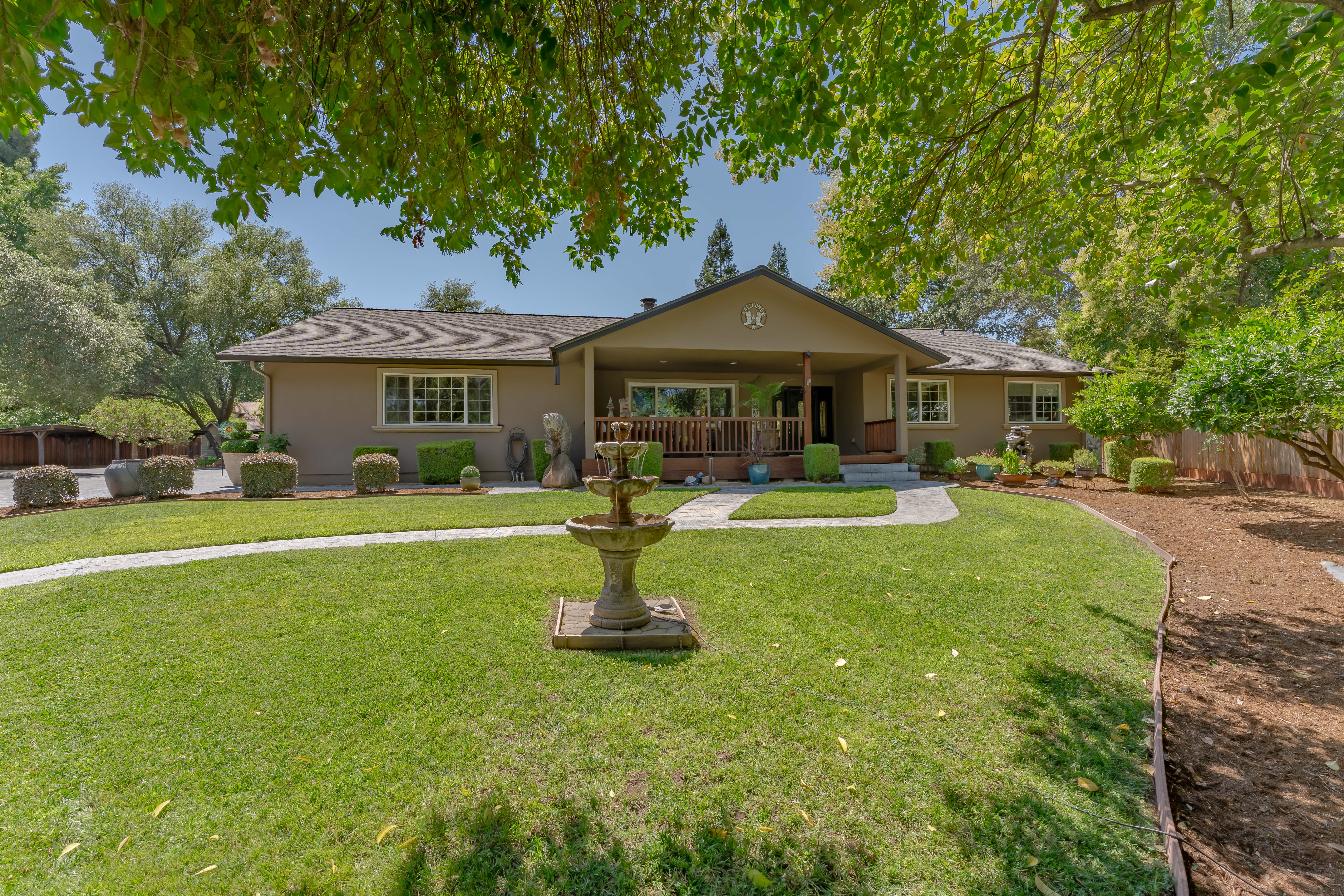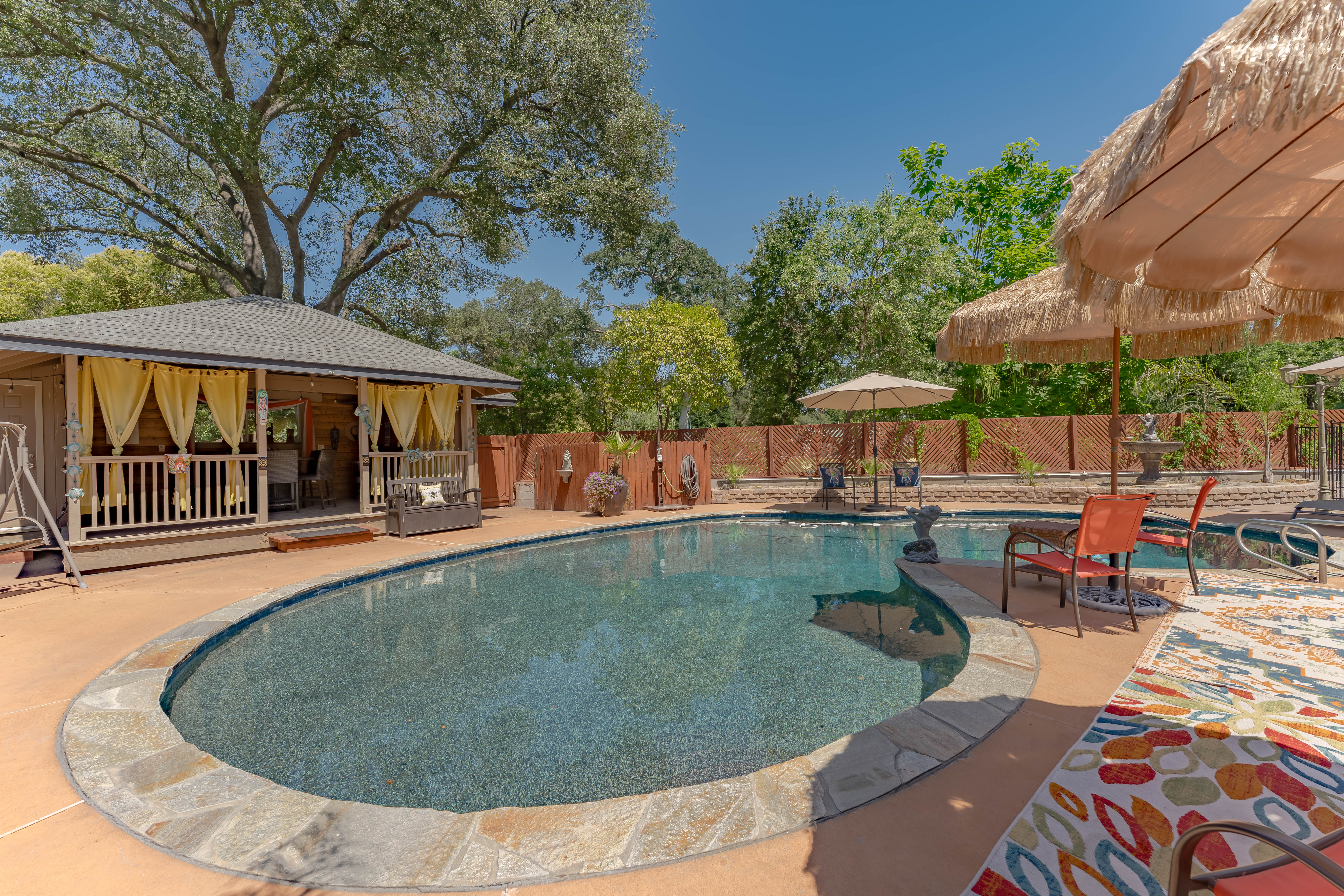 Discover privacy and luxury at this exceptional estate in Fair Oaks, built in 2004. The spacious 3,050 sq ft primary residence features 3 bedrooms, a dedicated office, and 3 bathrooms, all set on a picturesque 1.26 acre lot. The property is fully fenced and includes a private driveway with secure gated entry. Inside, an inviting open-concept layout is highlighted by vaulted ceilings and beautiful hardwood floors. The primary suite serves as a private retreat, complete with a fireplace and direct access to the backyard. Designed for entertaining, the backyard showcases stamped concrete, a fenced pool, a vibrant tiki lounge, an outdoor shower, and two storage closets. This property is further enhanced by its impressive additional structures, including a 650 sq ft ADU, a 12x30 shop ideal for a boat or RV, and a small chicken coop. Additional features include two covered carports, multiple Tuff Sheds, and a newly installed HVAC system for year-round comfort. Meticulously maintained and thoughtfully upgraded, this property offers a rare combination of comfort, functionality, and privacy, an exceptional opportunity to own a standout estate.
