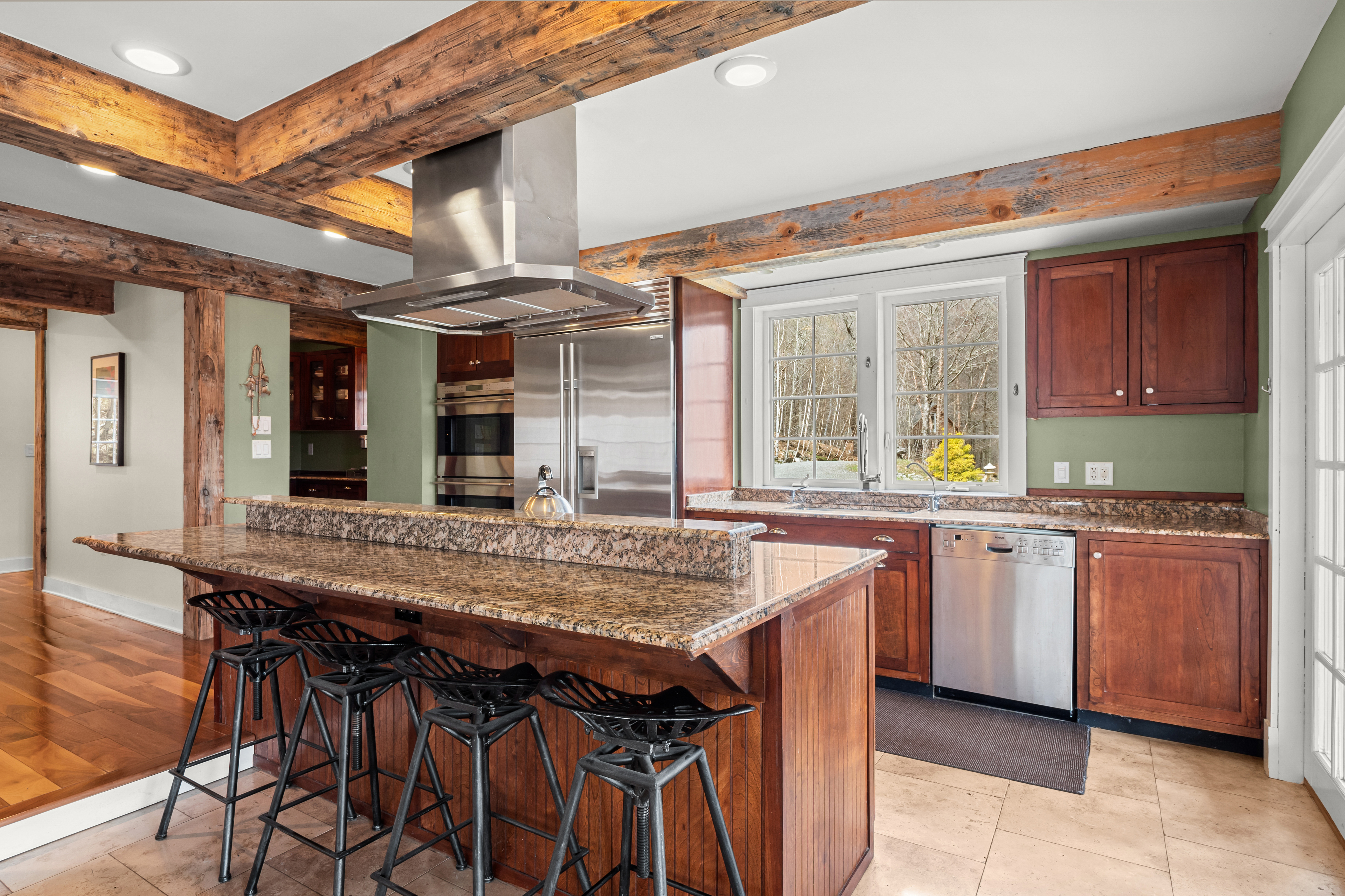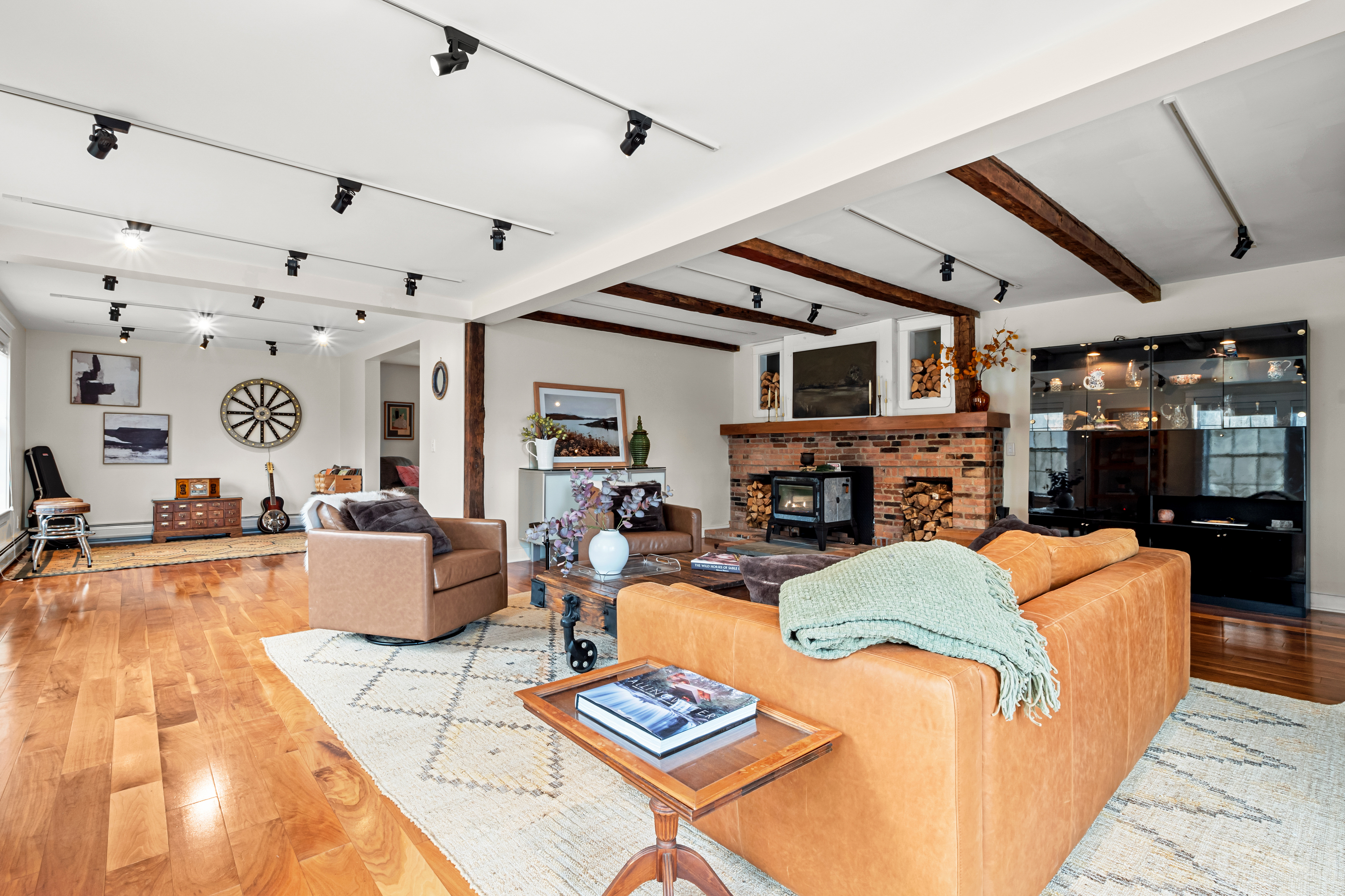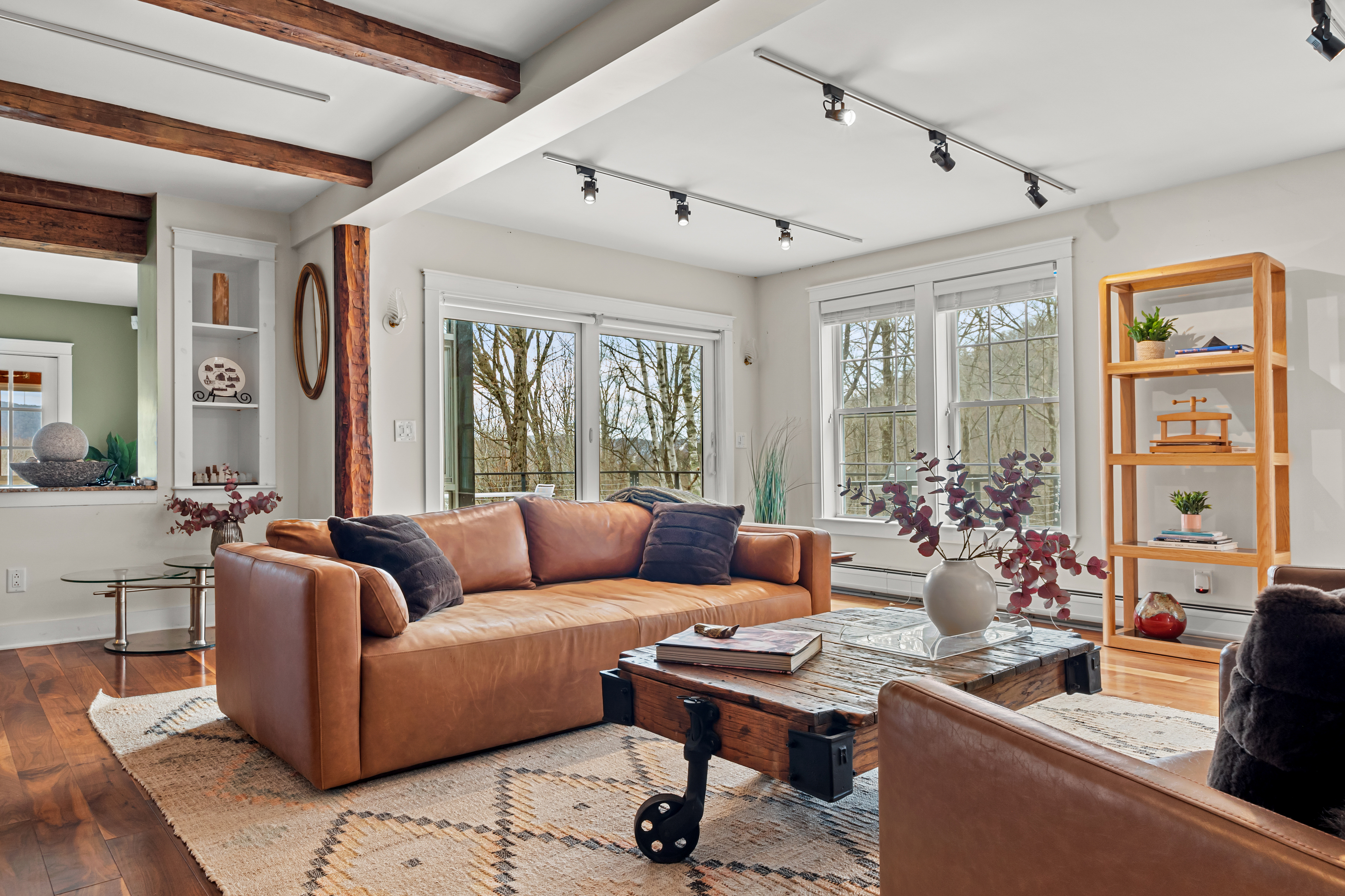 The home's interior unfolds across three expansive levels defined by windows, views, soaring ceilings, and rich hardwood flooring. The main living areas include a cozy living room with a Mansfield model wood-burning stove, media/music areas, and a 3-season sunroom that flows seamlessly onto a spacious ipe-wood deck. The chef's kitchen is a masterpiece of function and style, complete with a walk-in pantry and dining area.