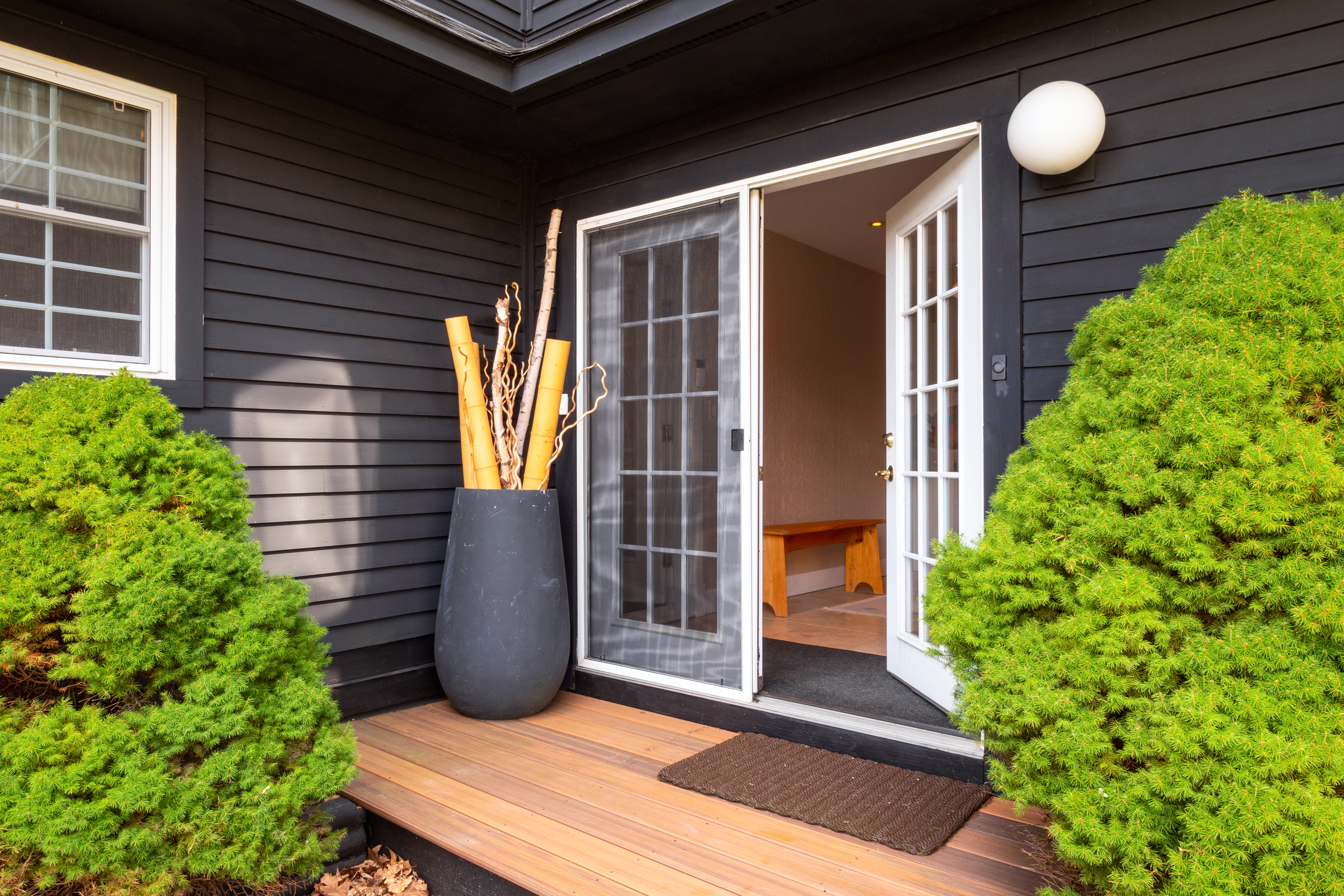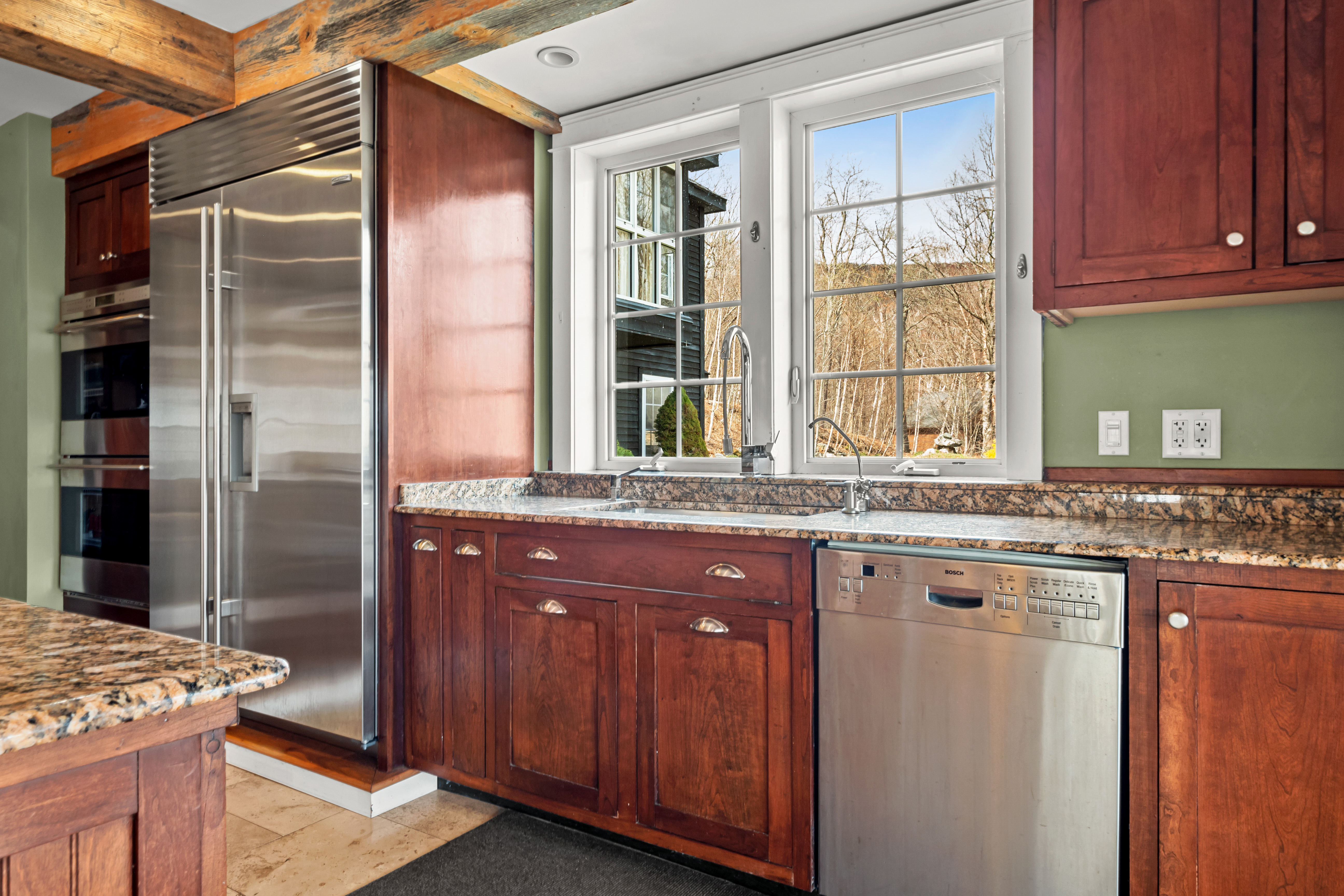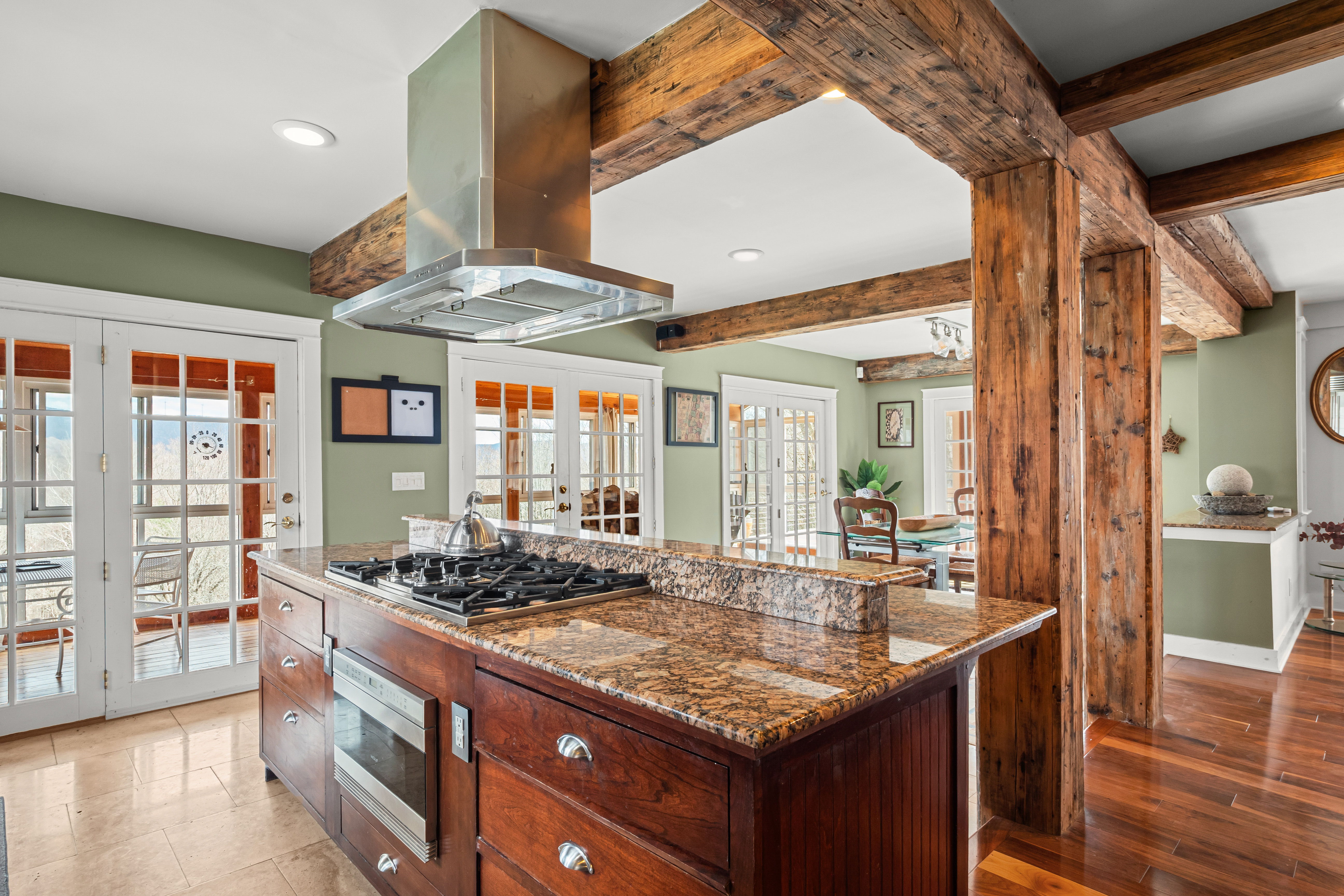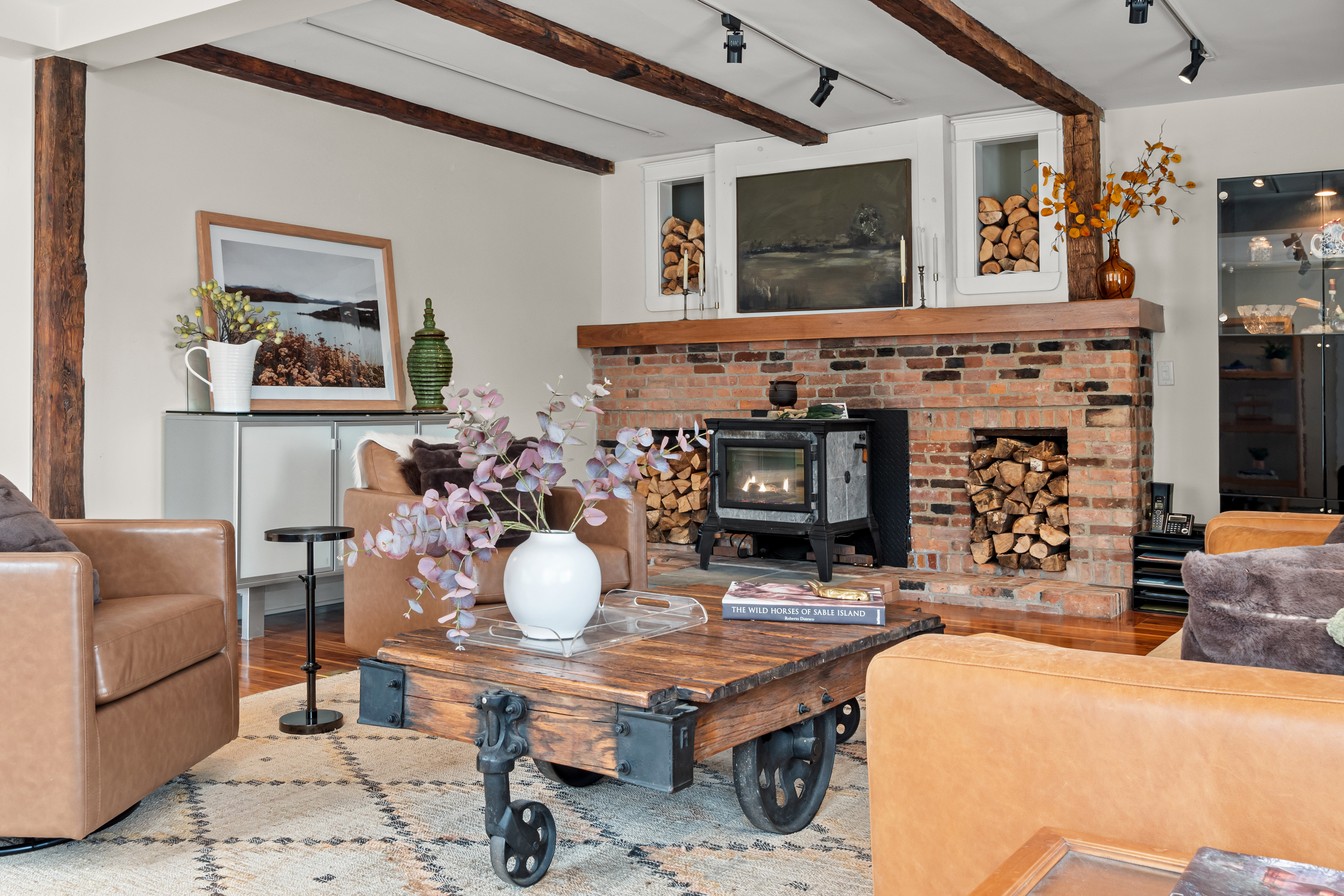 The home's interior unfolds across three expansive levels defined by windows, views, soaring ceilings, and rich hardwood flooring. The main living areas include a cozy living room with a Mansfield model wood-burning stove, media/music areas, and a 3-season sunroom that flows seamlessly onto a spacious ipe-wood deck. The chef's kitchen is a masterpiece of function and style, complete with a walk-in pantry and dining area.
