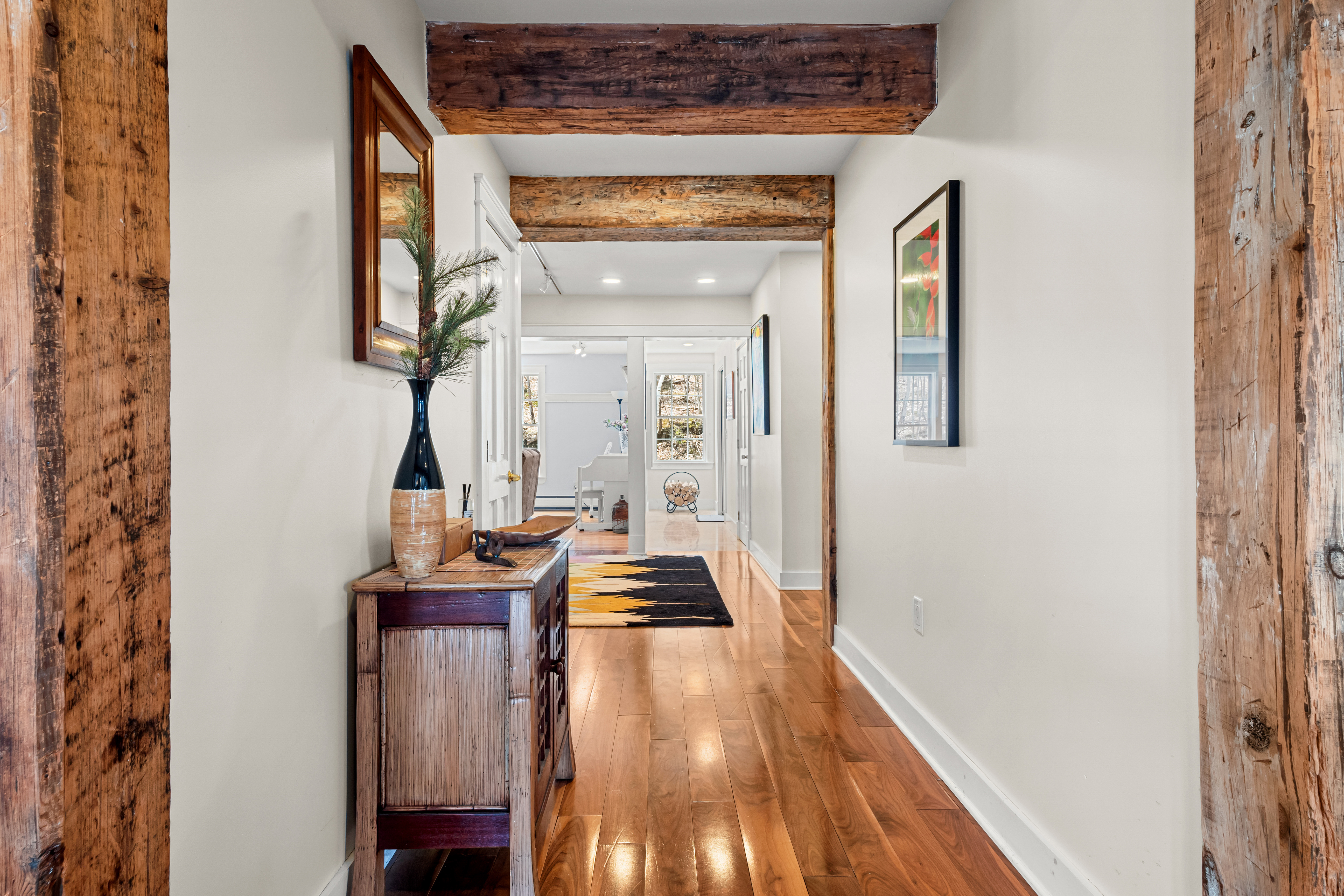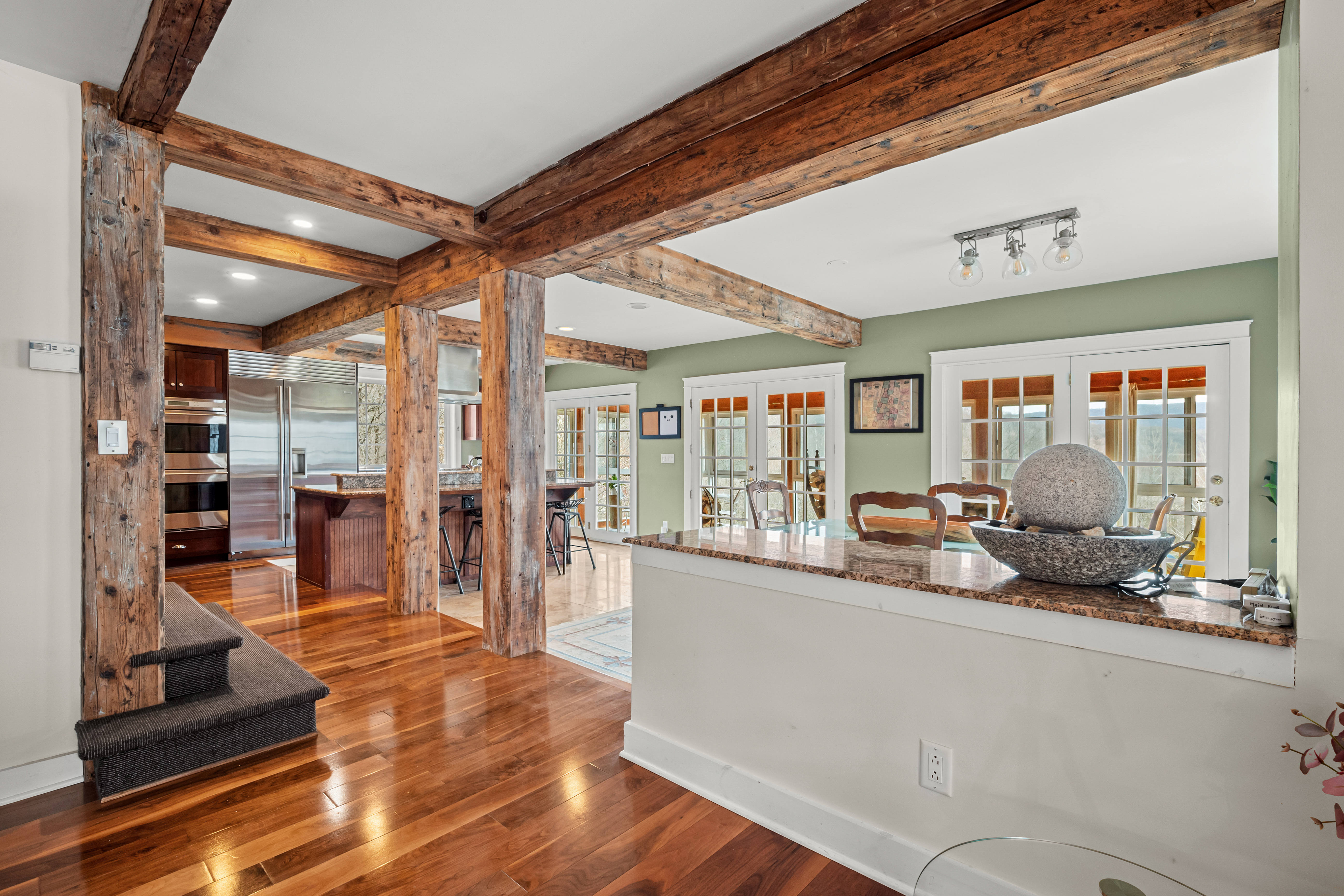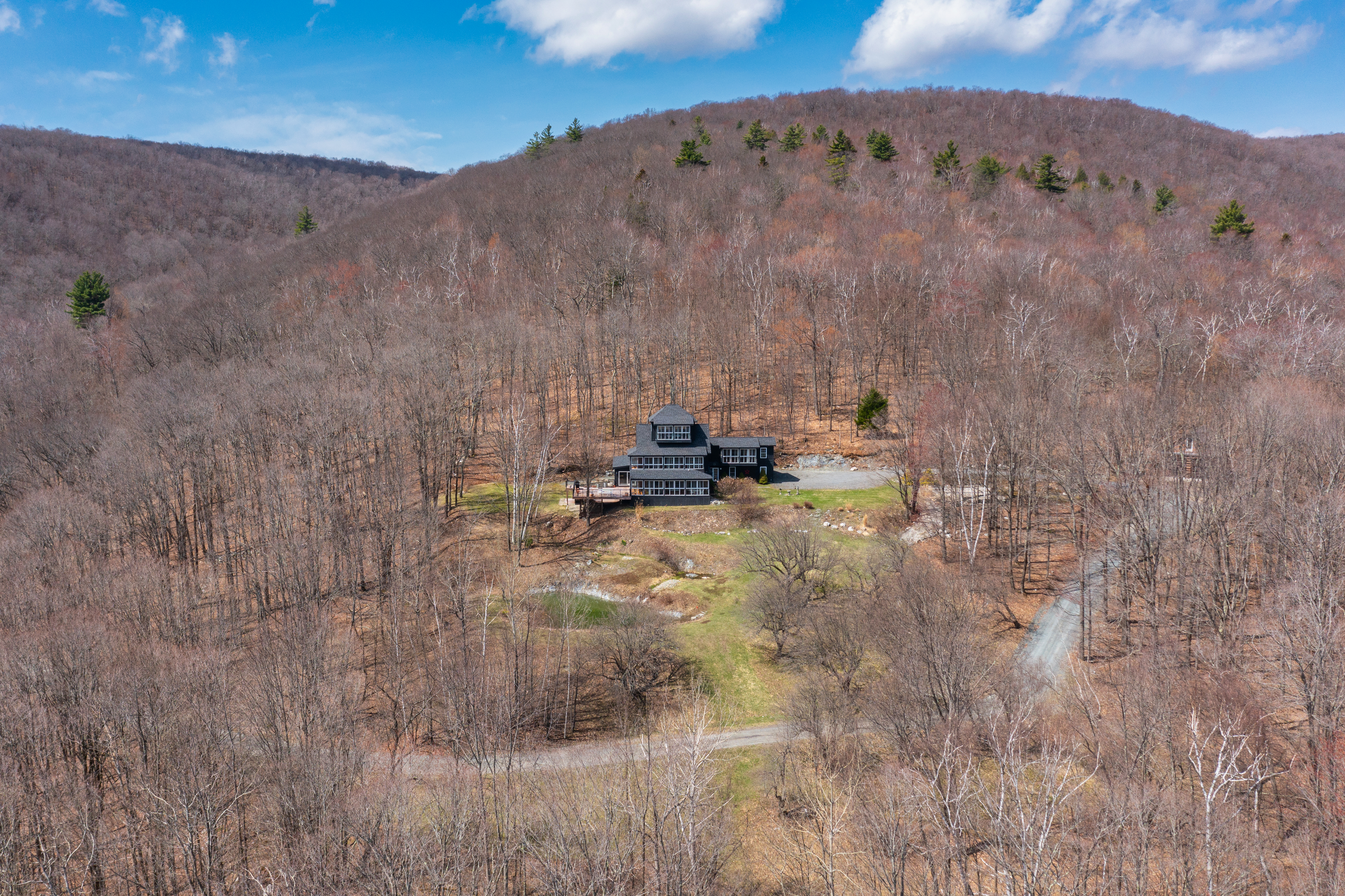 Perfectly positioned on the border of Hancock and Williamstown, this striking post-and-beam contemporary estate offers a rare blend of architectural sophistication and rustic elegance. Spanning approximately 27 acres of meadows and woodlands, this property serves as a secluded sanctuary with views of countryside, mountains, and it is 3.5 miles to Jiminy Peak Ski Resort.